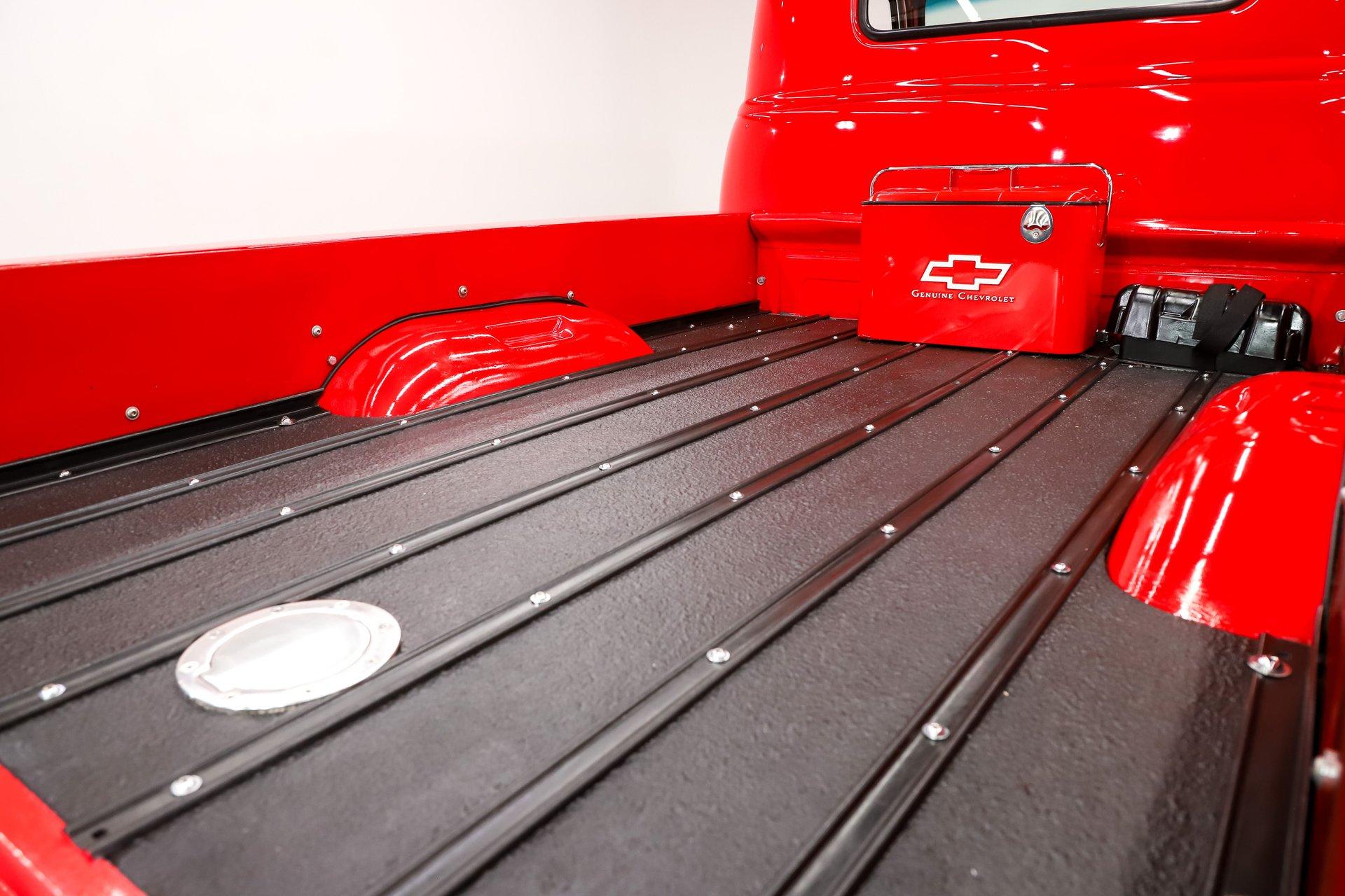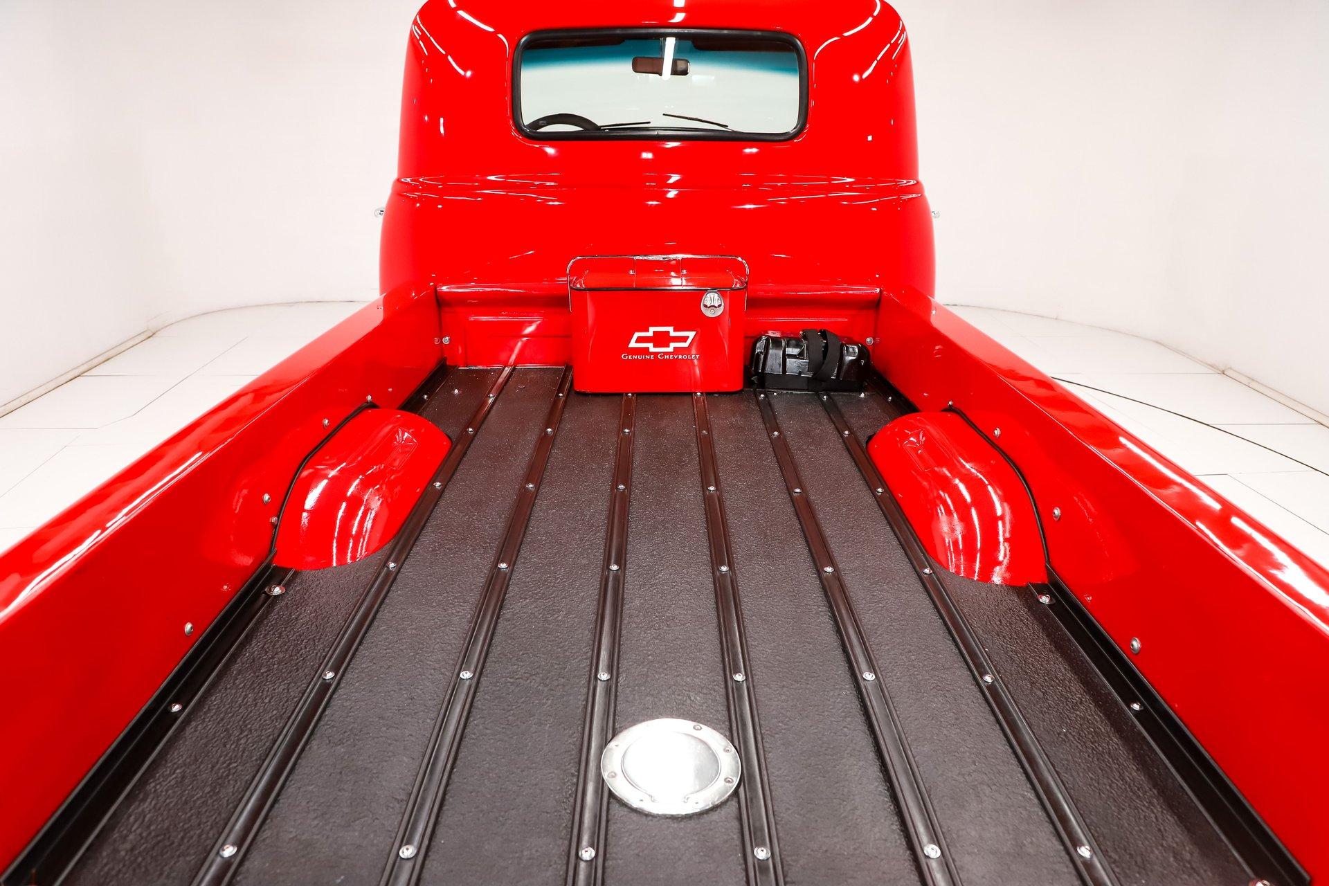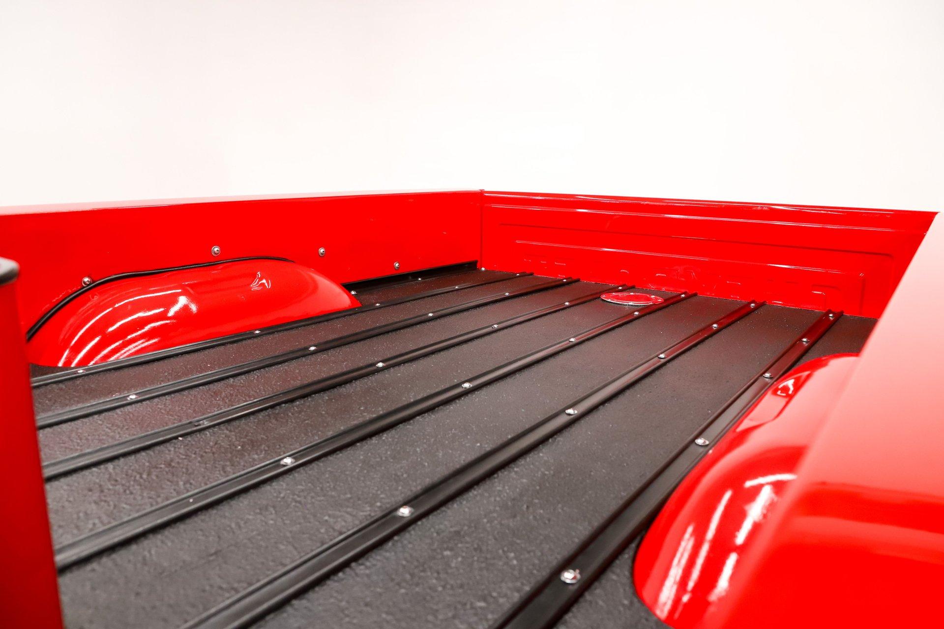 TRUNK COMPARTMENT: The bed floor was raised to accommodate the lowered suspension. It has refinished black boards, metal strips, and chrome hardware. The fuel filler is relocated to the floor. The battery is also relocated to the bed. There is a vintage cooler. The sidewalks are gloss red.
