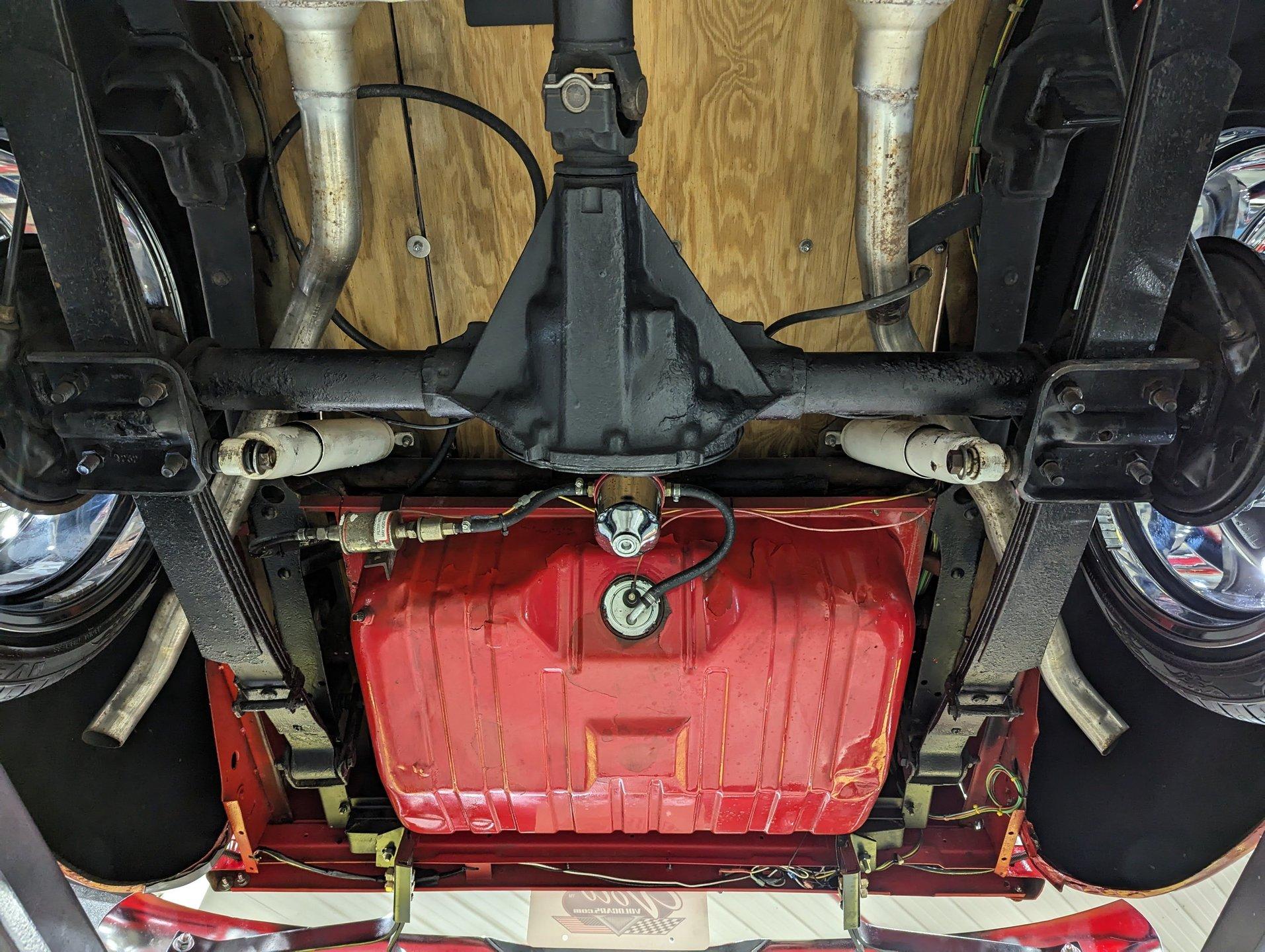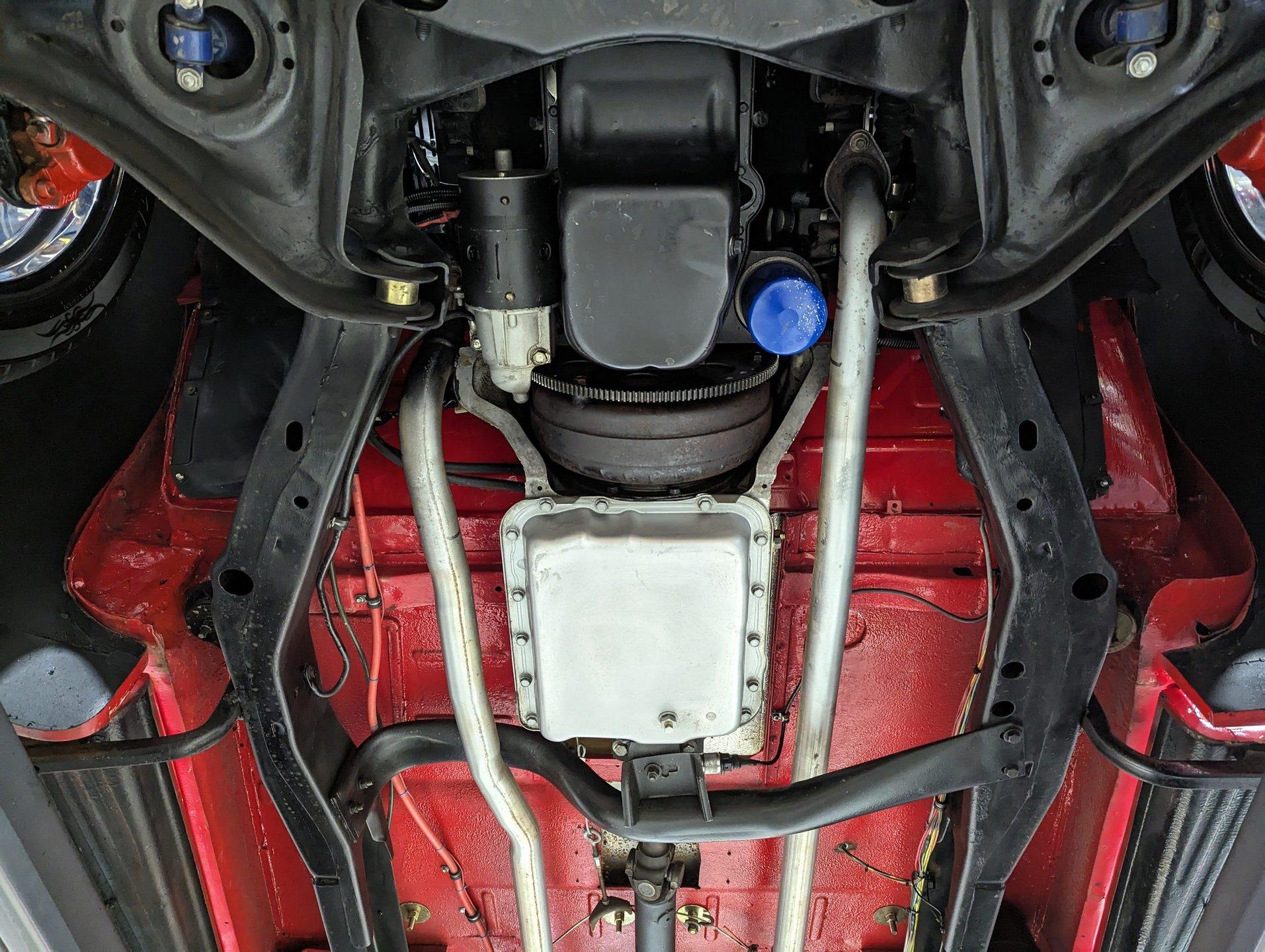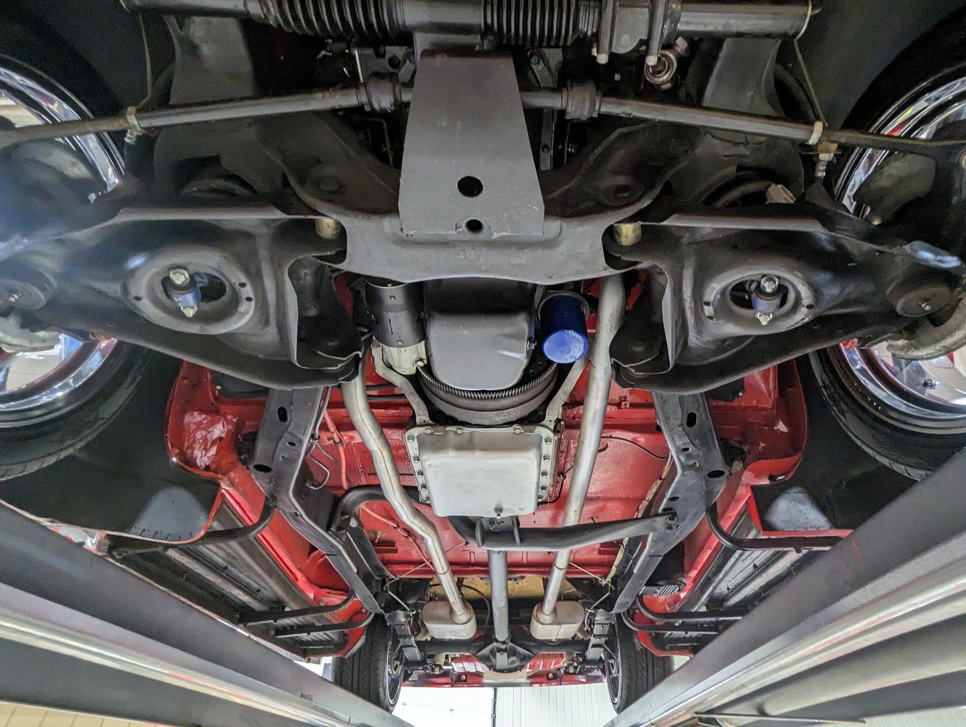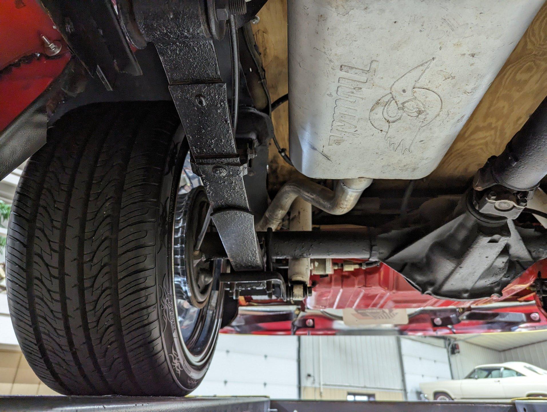 UNDERSIDE: The frame was removed and upgraded with an S10 frame. Rebuilt independent front suspension with Unisteer rack & pinion steering. It has disc brakes in front, drum in back and the e-brake assembly is hooked up. Relocated is 16 gallon fuel tank. Dual exhaust with Thrush mufflers. Looking up at the motor and starter they still look new. Upgraded 700R4 overdrive automatic trans with a TCI converter. 10 bolt rear end with 3.73 gears. Rust free floors were painted red chip guard.