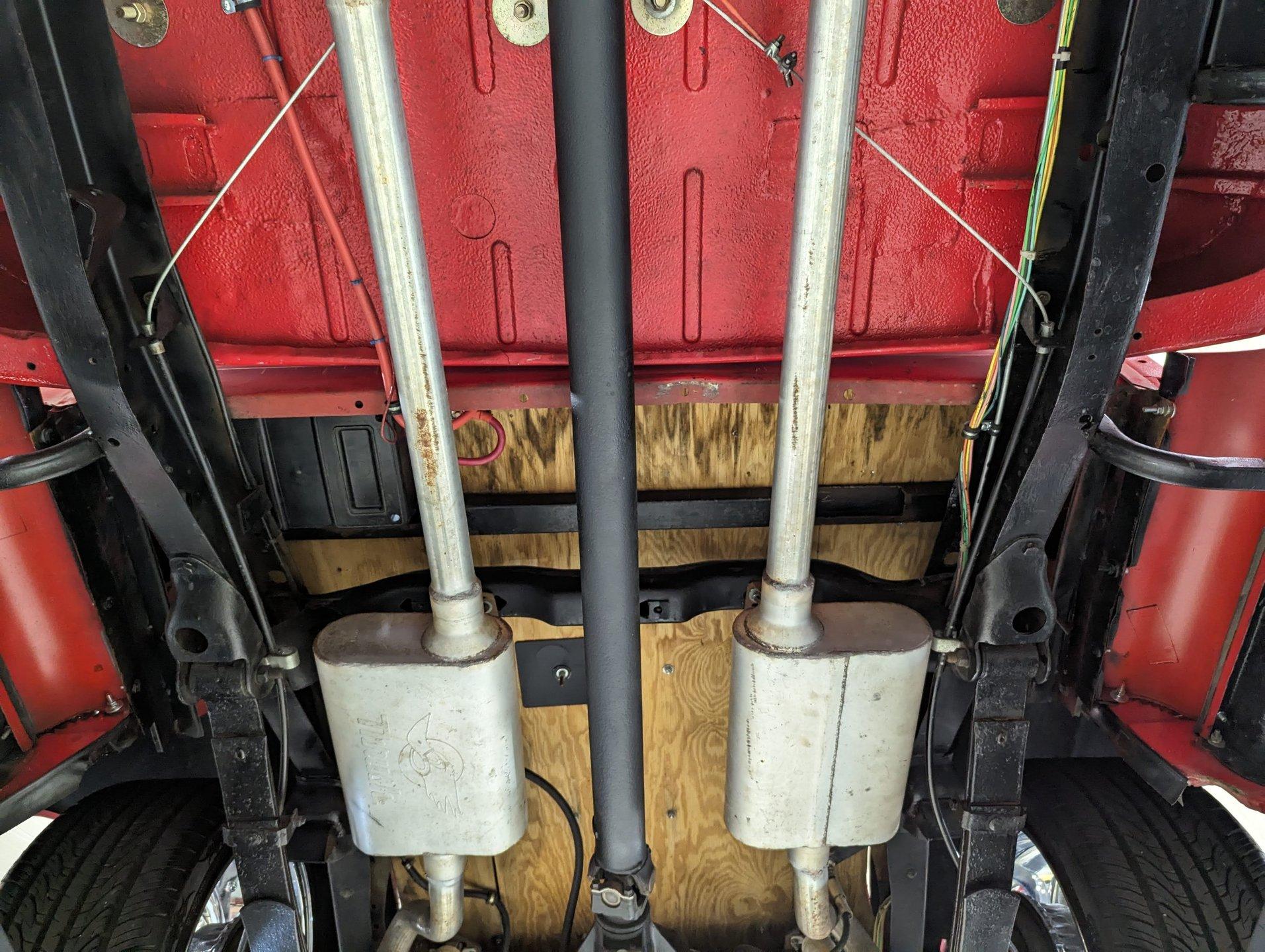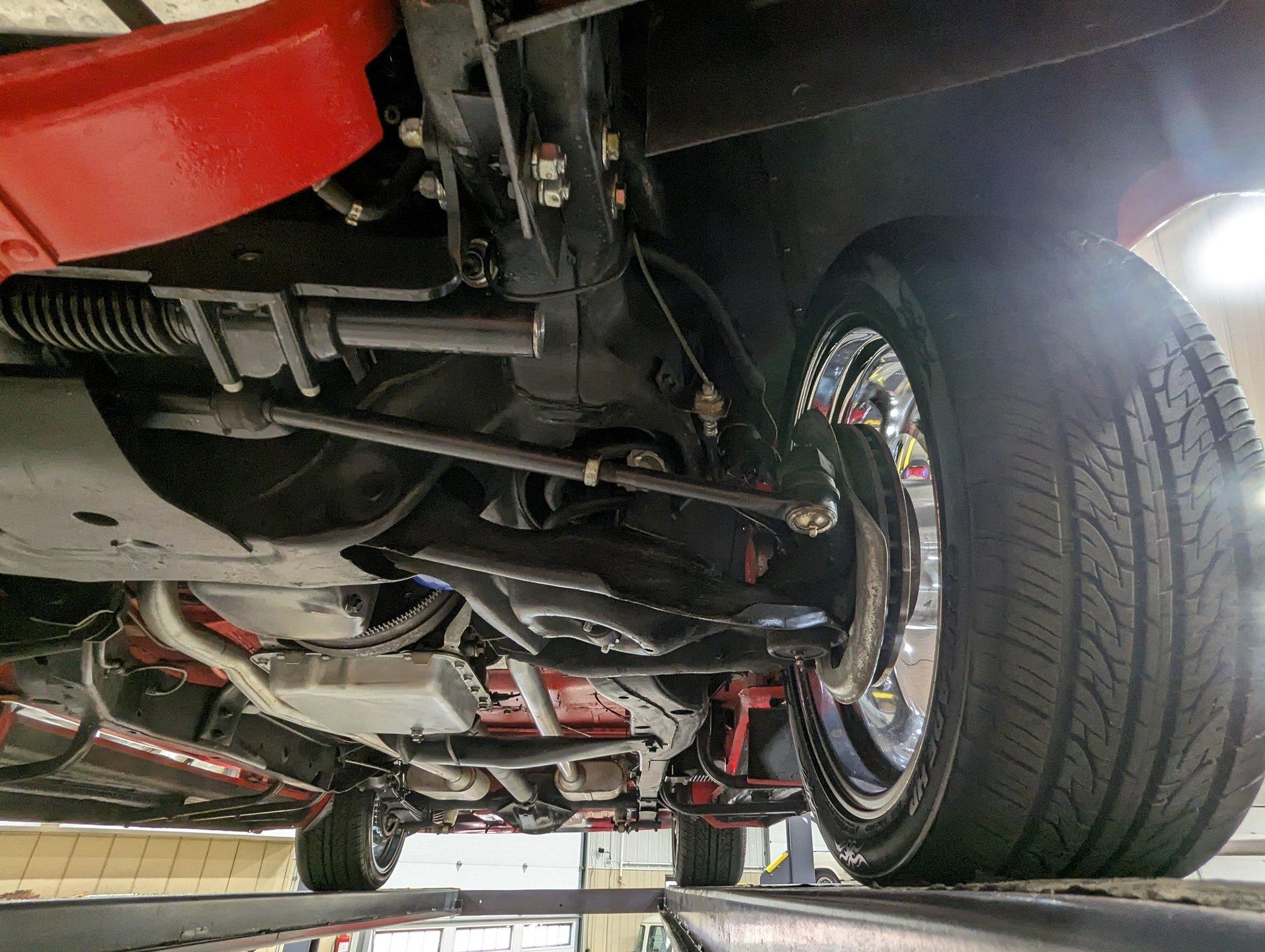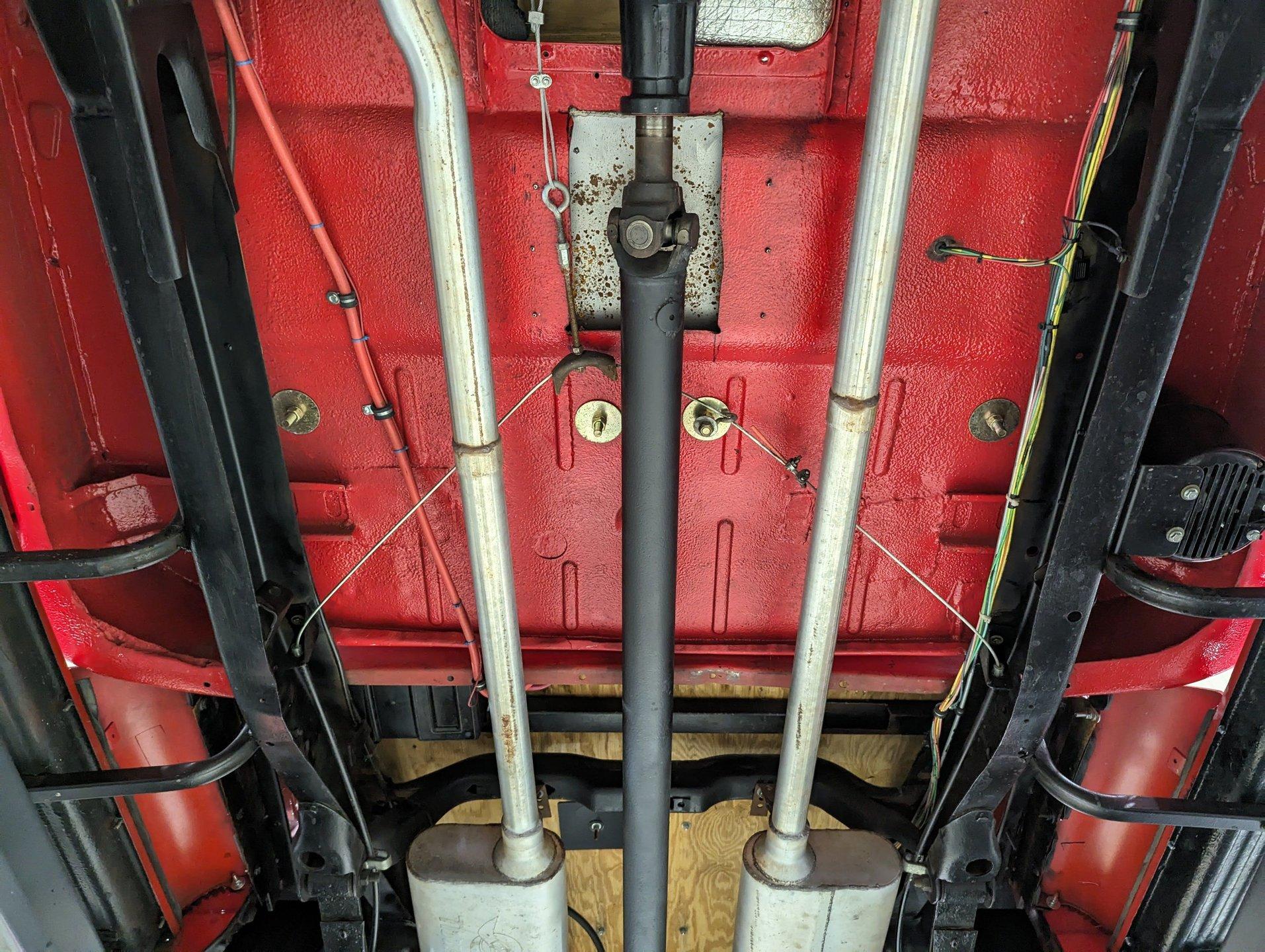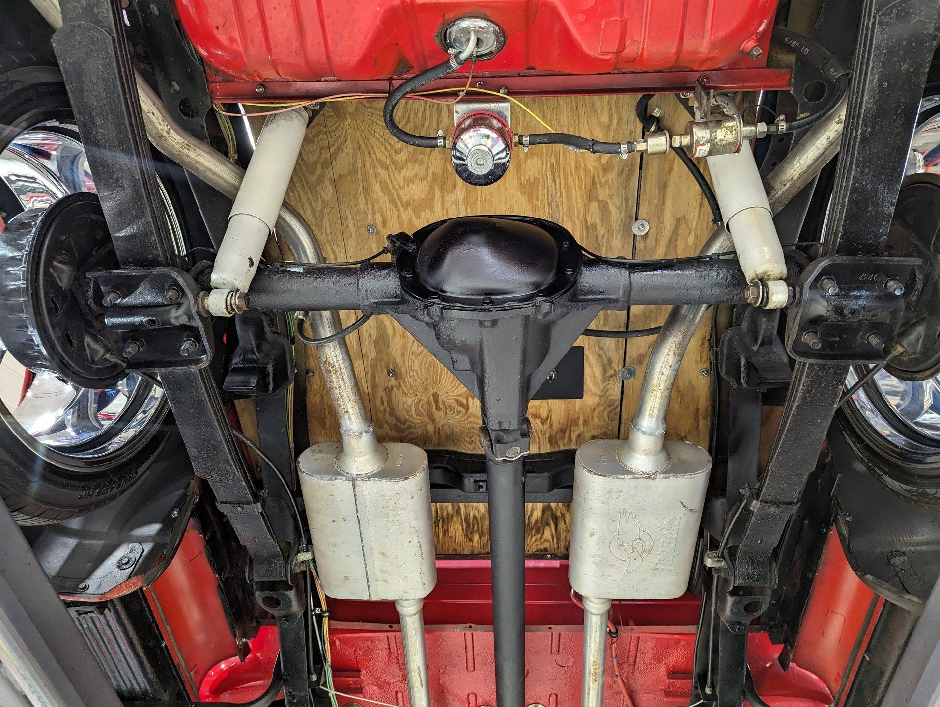 UNDERSIDE: The frame was removed and upgraded with an S10 frame. Rebuilt independent front suspension with Unisteer rack & pinion steering. It has disc brakes in front, drum in back and the e-brake assembly is hooked up. Relocated is 16 gallon fuel tank. Dual exhaust with Thrush mufflers. Looking up at the motor and starter they still look new. Upgraded 700R4 overdrive automatic trans with a TCI converter. 10 bolt rear end with 3.73 gears. Rust free floors were painted red chip guard.