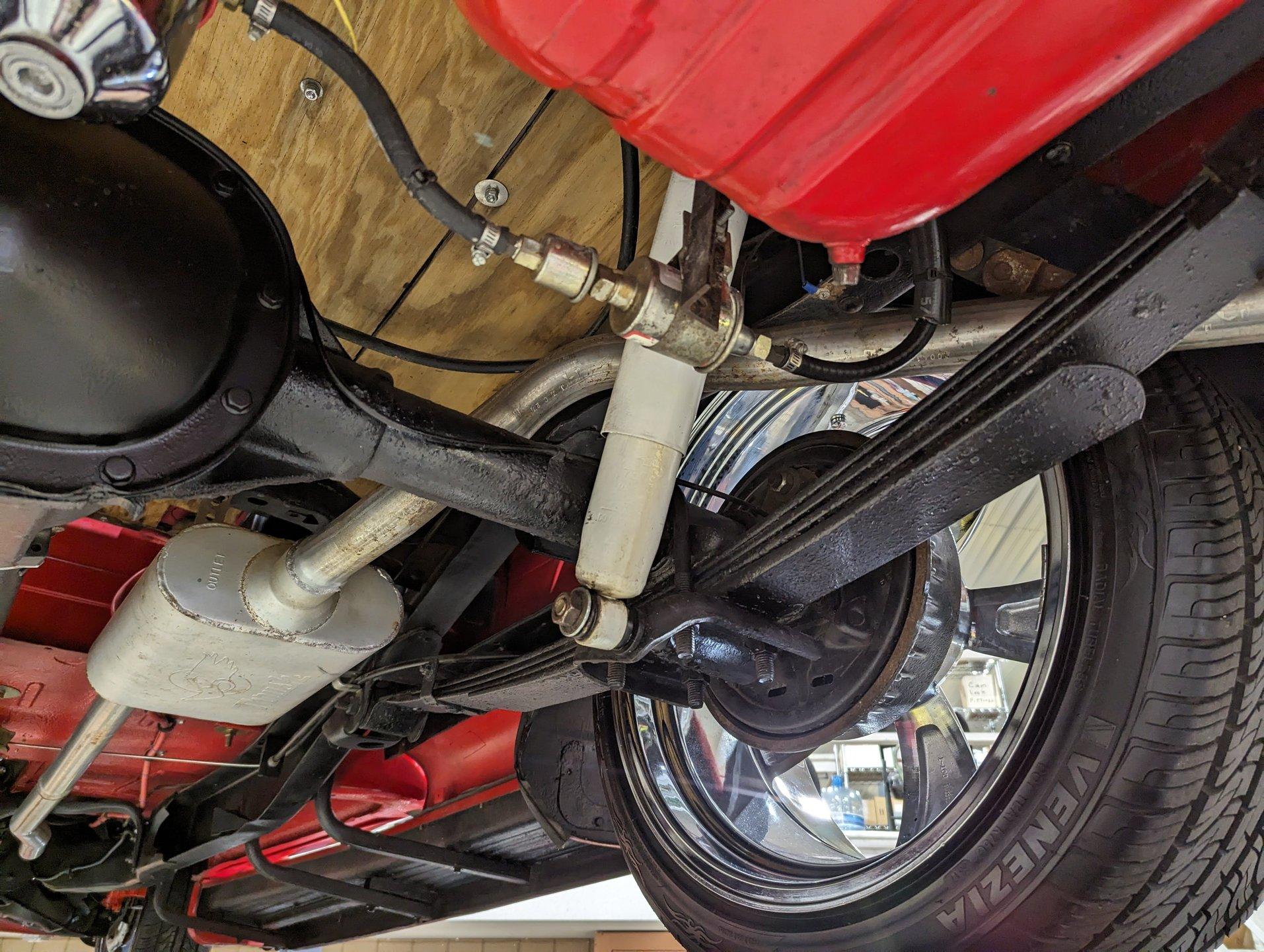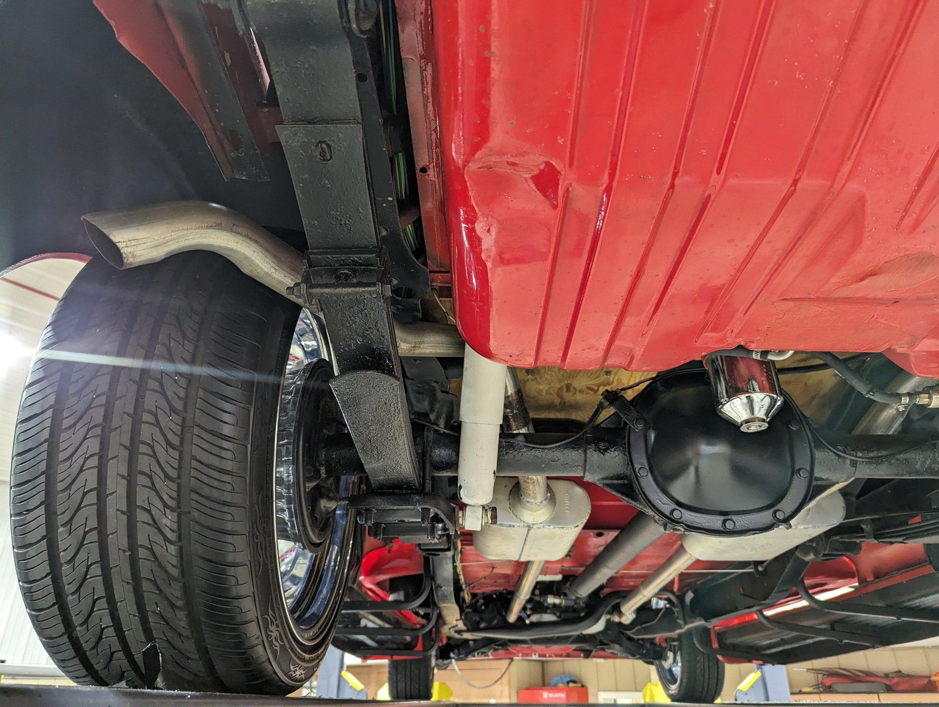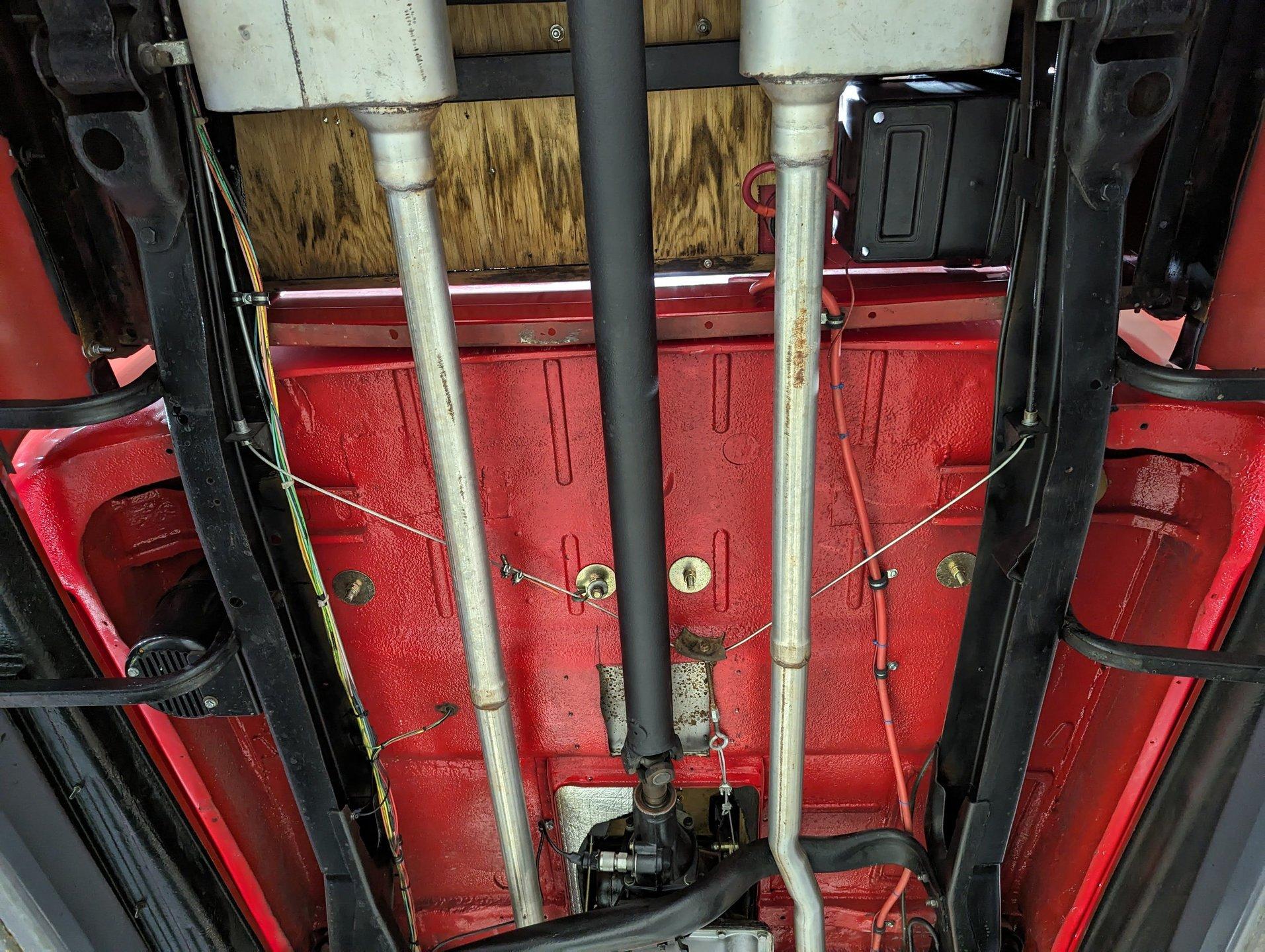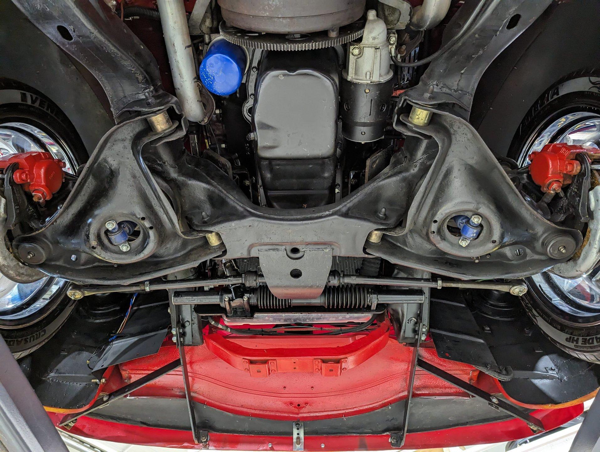 UNDERSIDE: The frame was removed and upgraded with an S10 frame. Rebuilt independent front suspension with Unisteer rack & pinion steering. It has disc brakes in front, drum in back and the e-brake assembly is hooked up. Relocated is 16 gallon fuel tank. Dual exhaust with Thrush mufflers. Looking up at the motor and starter they still look new. Upgraded 700R4 overdrive automatic trans with a TCI converter. 10 bolt rear end with 3.73 gears. Rust free floors were painted red chip guard.