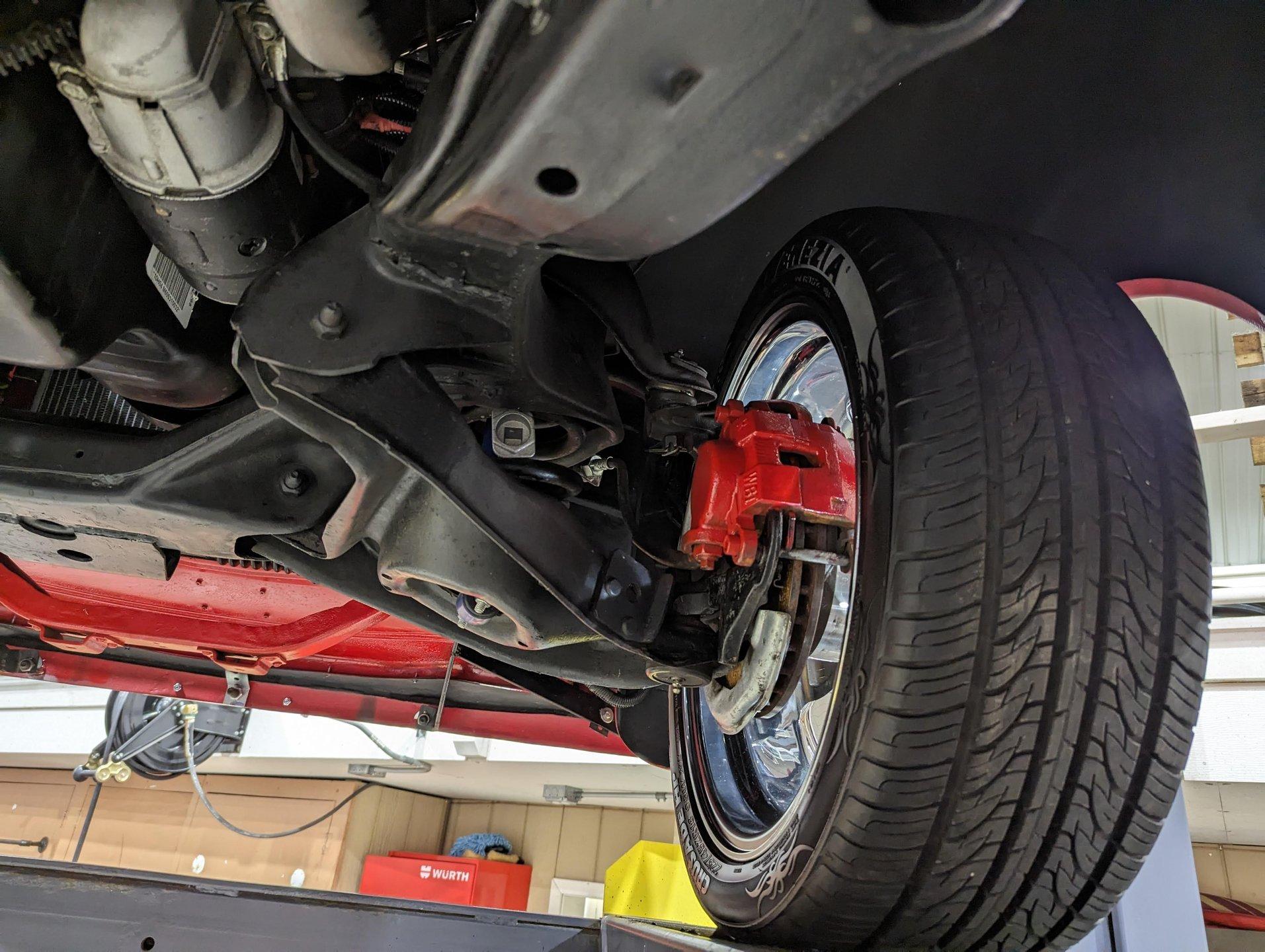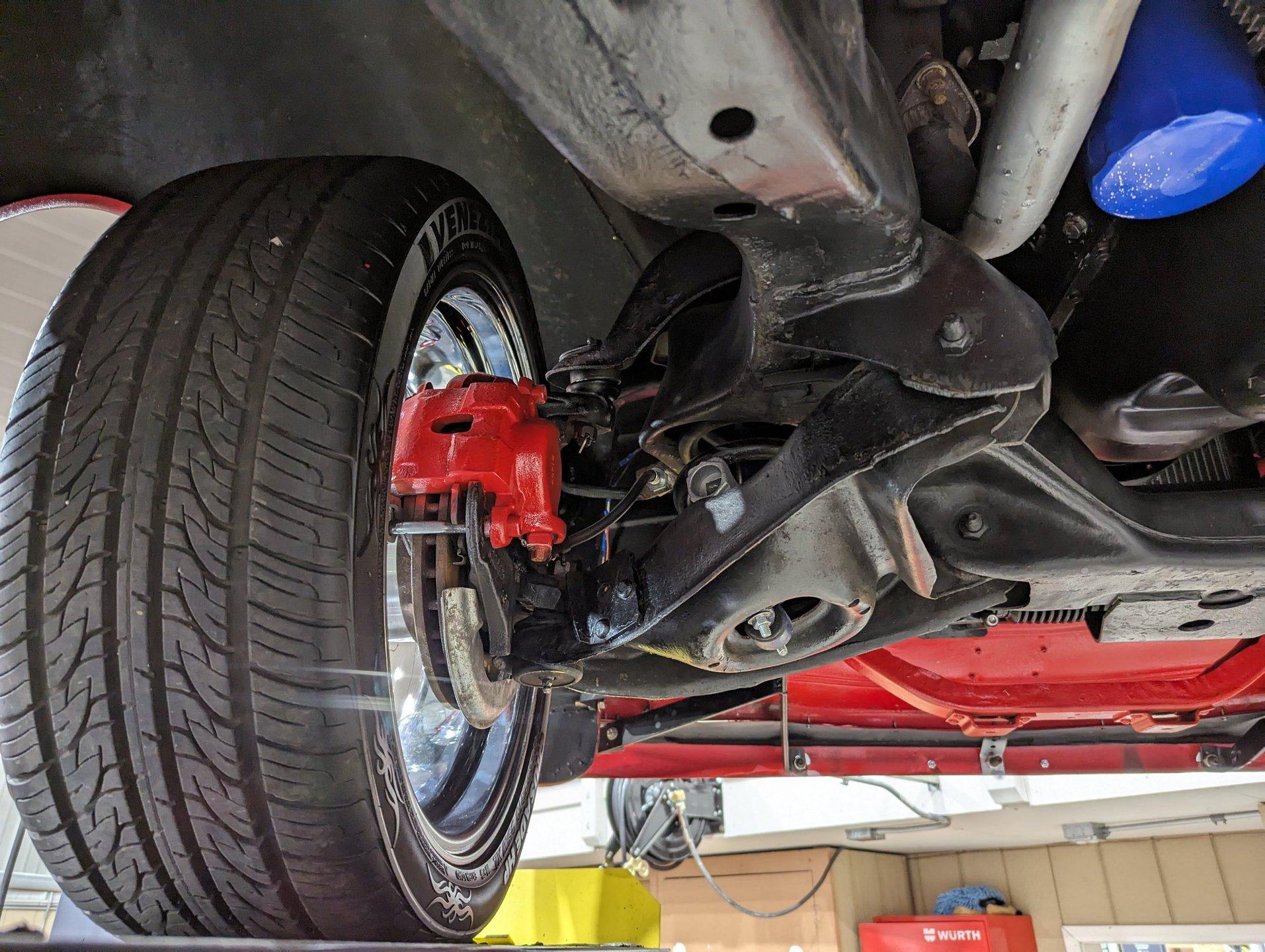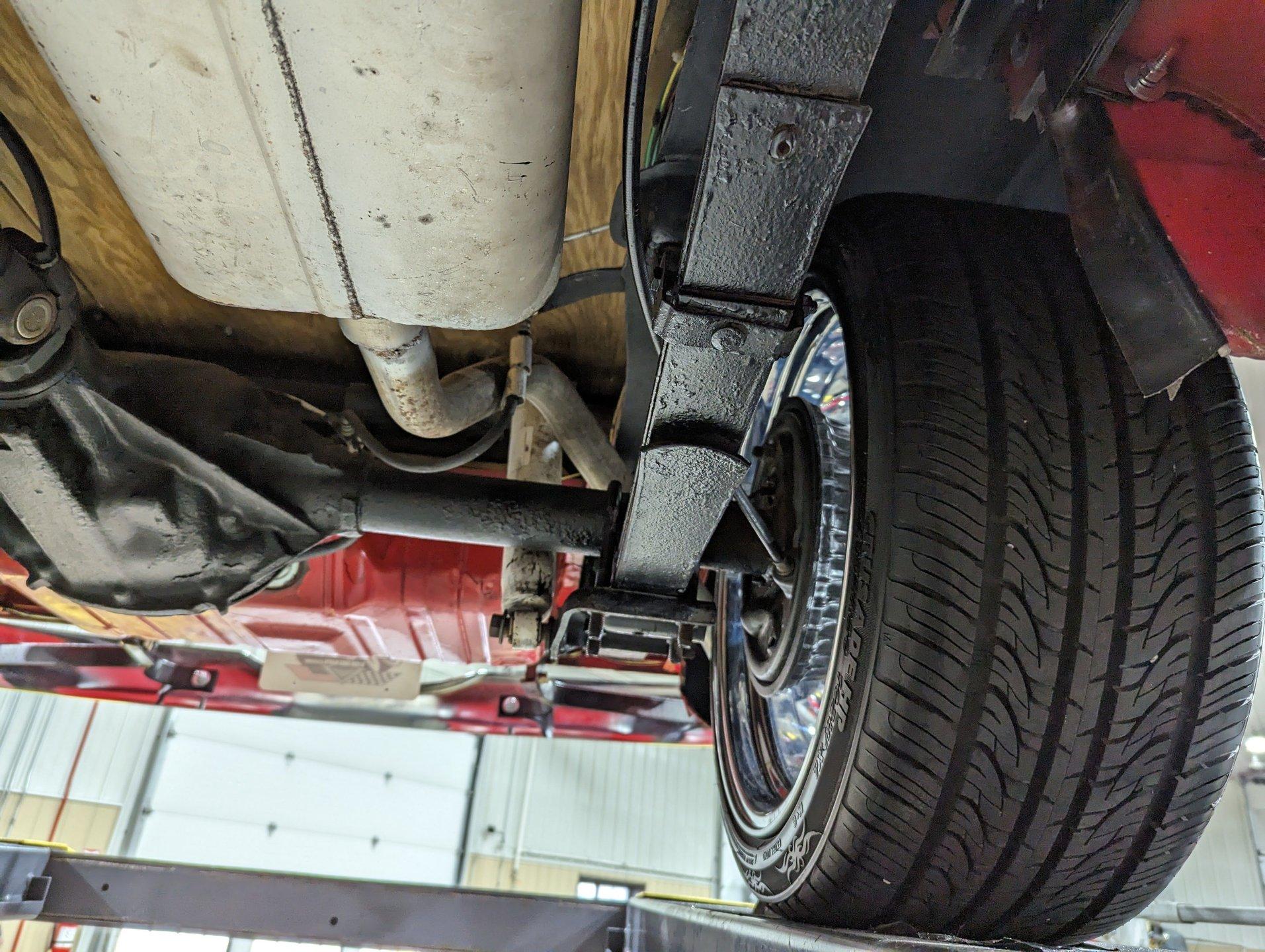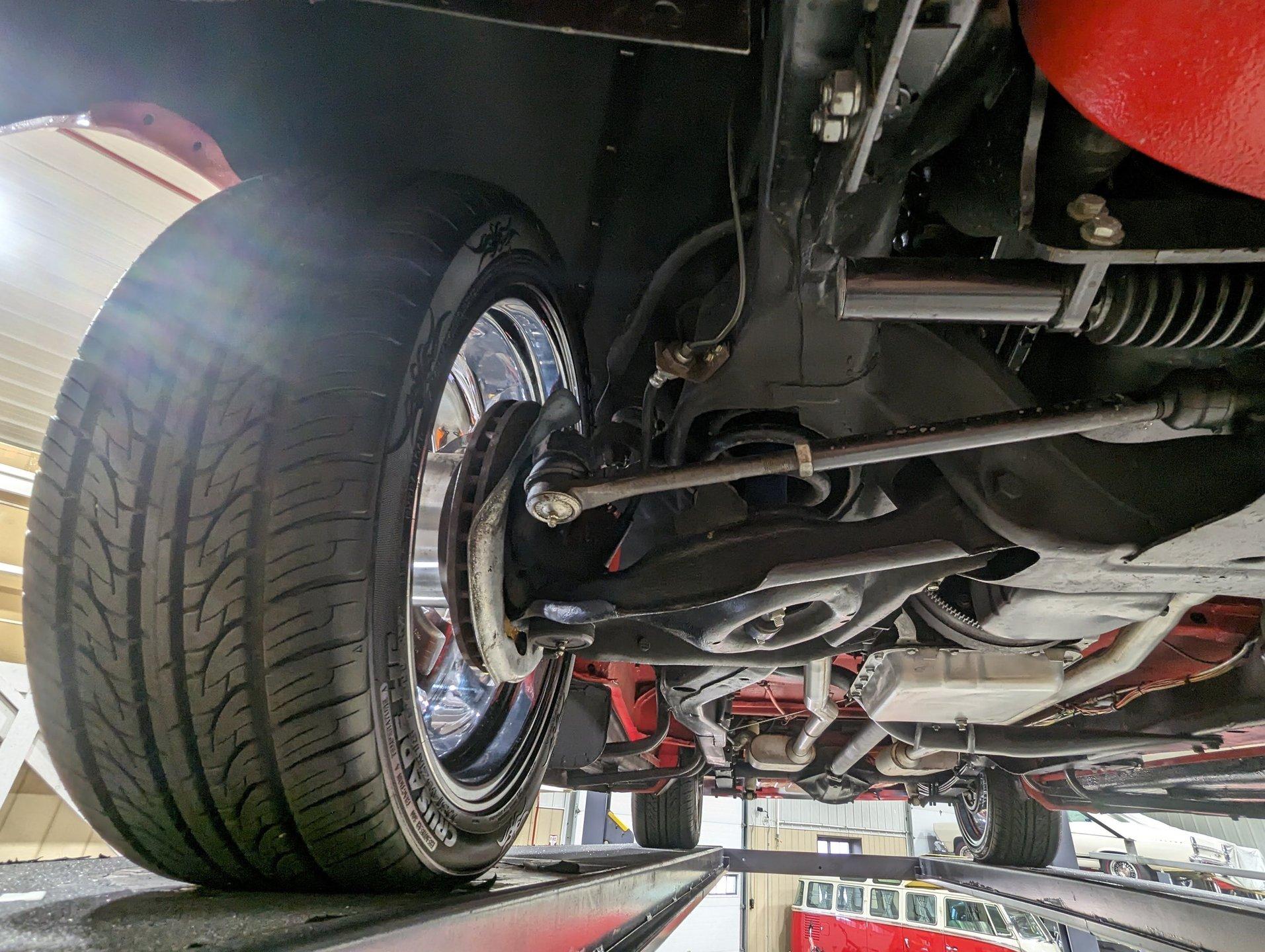 UNDERSIDE: The frame was removed and upgraded with an S10 frame. Rebuilt independent front suspension with Unisteer rack & pinion steering. It has disc brakes in front, drum in back and the e-brake assembly is hooked up. Relocated is 16 gallon fuel tank. Dual exhaust with Thrush mufflers. Looking up at the motor and starter they still look new. Upgraded 700R4 overdrive automatic trans with a TCI converter. 10 bolt rear end with 3.73 gears. Rust free floors were painted red chip guard.