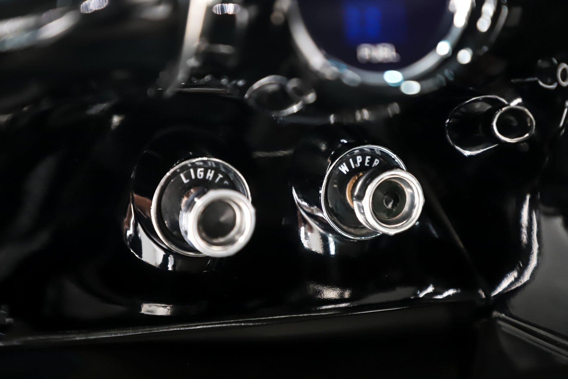 EXTERIOR: That black paint job's not going to lie, this car is laser beam straight. The panels line up beautifully, no rust or damage. You can read a newspaper in the reflection of the paint, it's like a mirror. There are some small imperfections. All of the chrome and trim was replaced. The vent windows were removed and custom smoked glass was installed. It's got a great stance sitting on 17 inch Boyd Coddington wheels. It's mini tubbed in back for the extra wide tires. Where's the rear license plate? There's a remote that flips it down below the bumper!