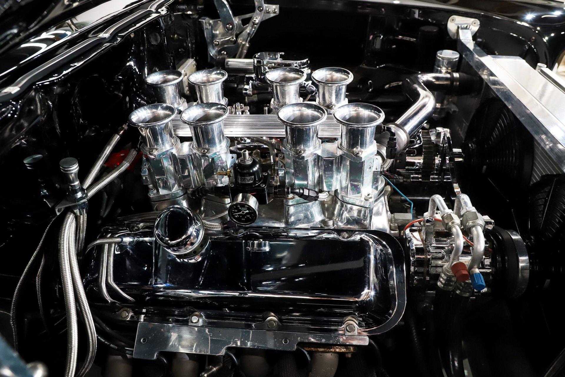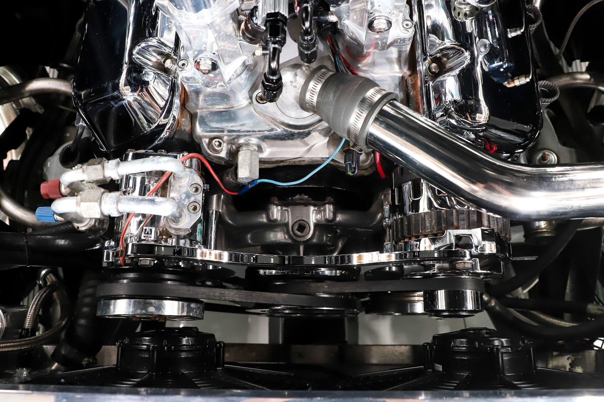 ENGINE COMPARTMENT: Oh baby look at what we have here! It's a 454 big block engine with a $7,600 Hillborn injection on top. Those stacks are old school cool! The front of the motor has billet brackets and pulleys, mini polished A/C compressor and polished alternator. It uses a hydro boost power steering and brake system. A big aluminum radiator with dual electric fans, a polished overflow tank, and a hard polished radiator hose keep it cool. I love those billet hinges; it also has an aluminum radiator support. The engine bay is painted high gloss black. There is certainly a wow factor when you open the hood.
