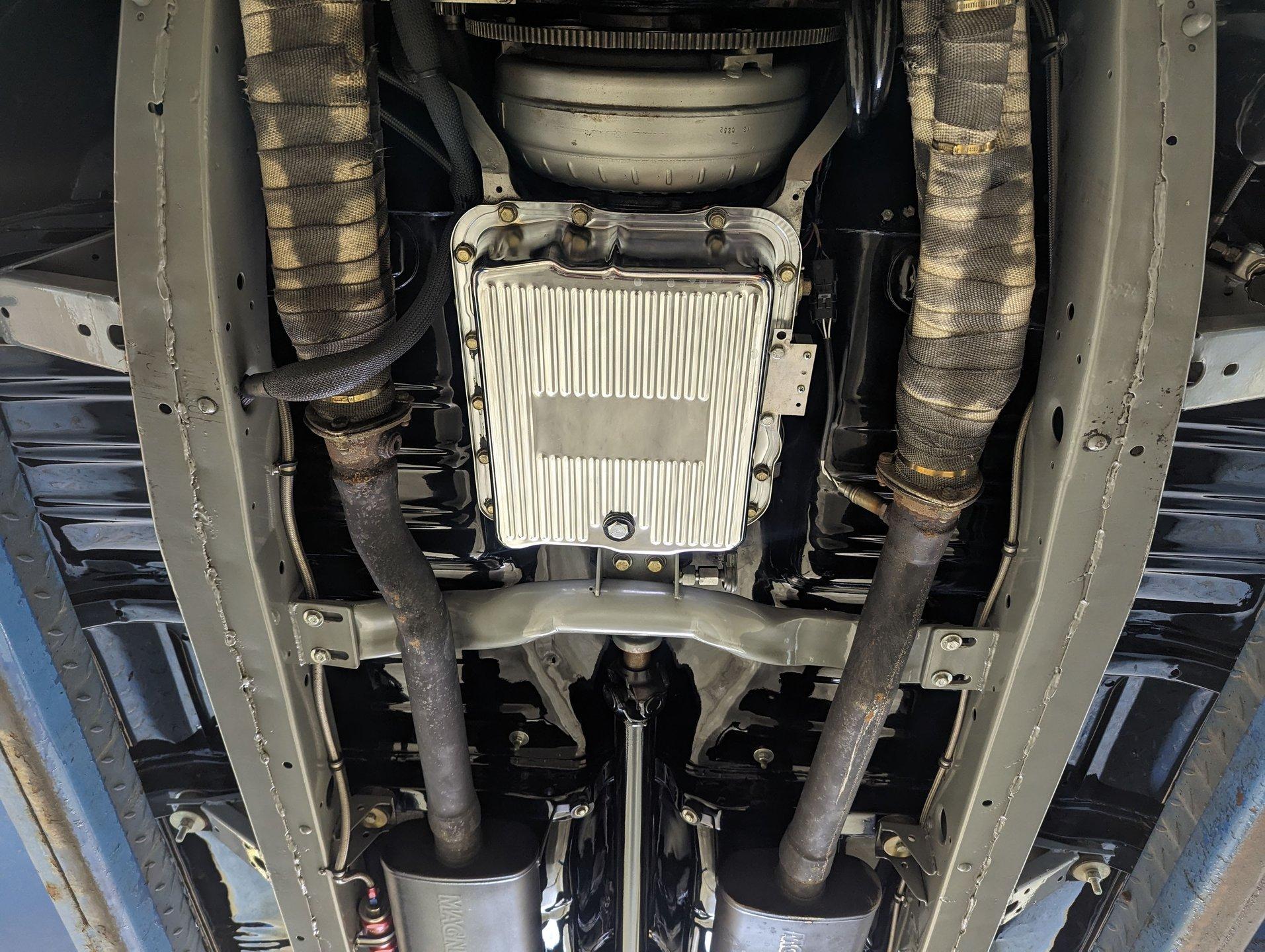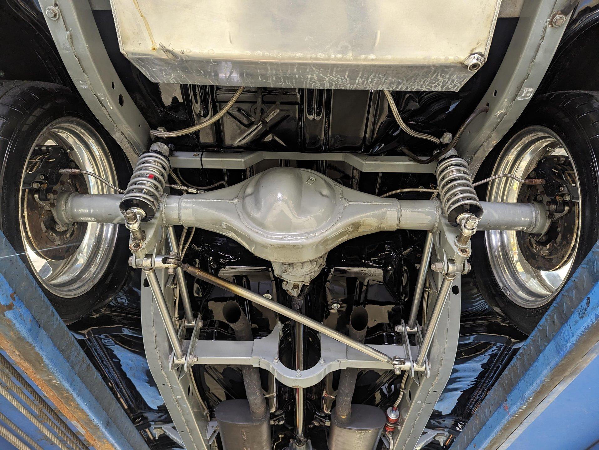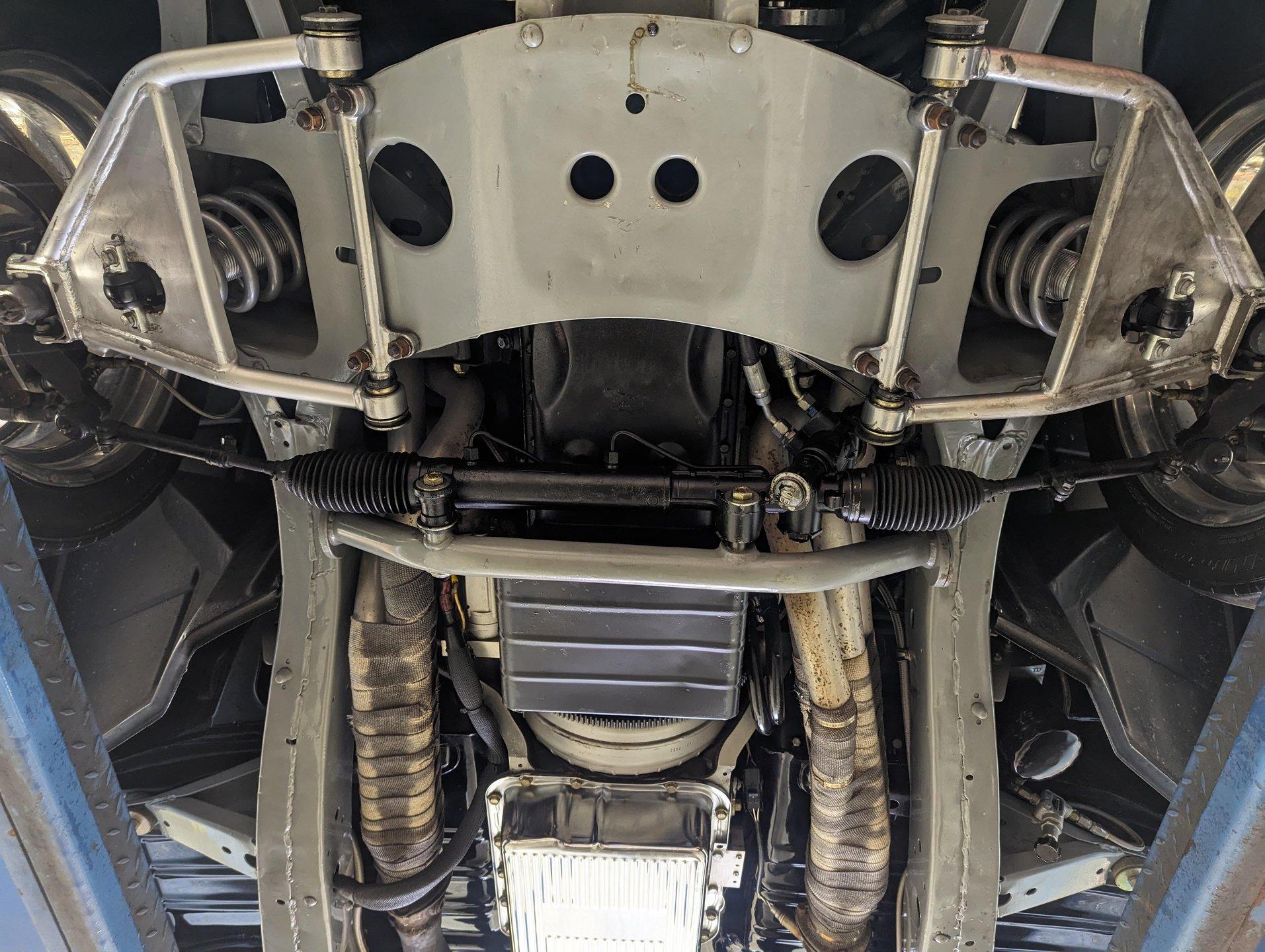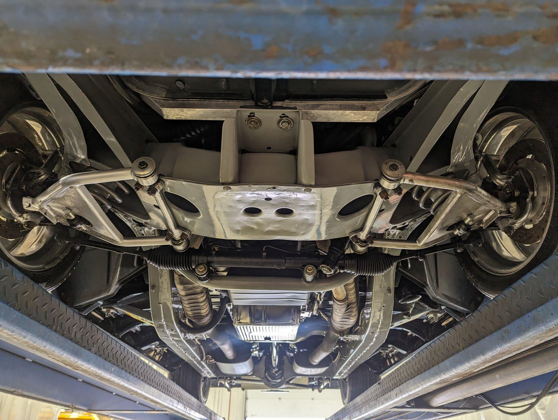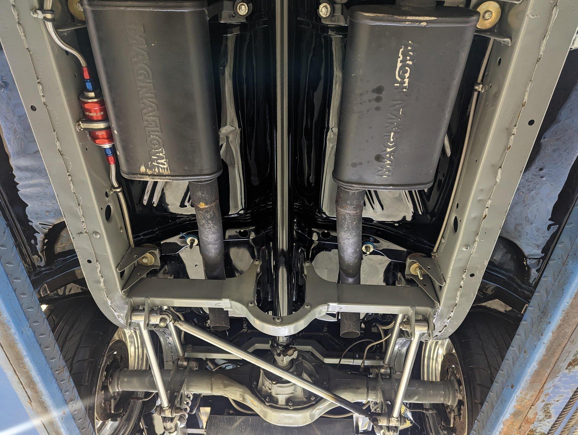 UNDERSIDE: The body was off the frame and the entire chassis was prepped and powder coated silver. The front end is upgraded with tubular control arms, coilover shocks, rack & pinion steering. In back it has a four link system with tubular control arms, a pan hard bar and coilover adjustable gas shocks. Custom stainless steel fuel tank and stainless braided hoses. Dual exhaust with Magnaflow mufflers. It has Wilwood drilled and slotted disc brakes at all four wheels. Looking up at the motor it has an extra capacity oil pan and a high torque starter. The transmission is upgraded to a 700R4 overdrive automatic. A custom drive shaft has a safety loop. In back is a Ford 9 inch posi rear end with 31 spline axles. The floors and braces look pristine and they're painted a high gloss black.