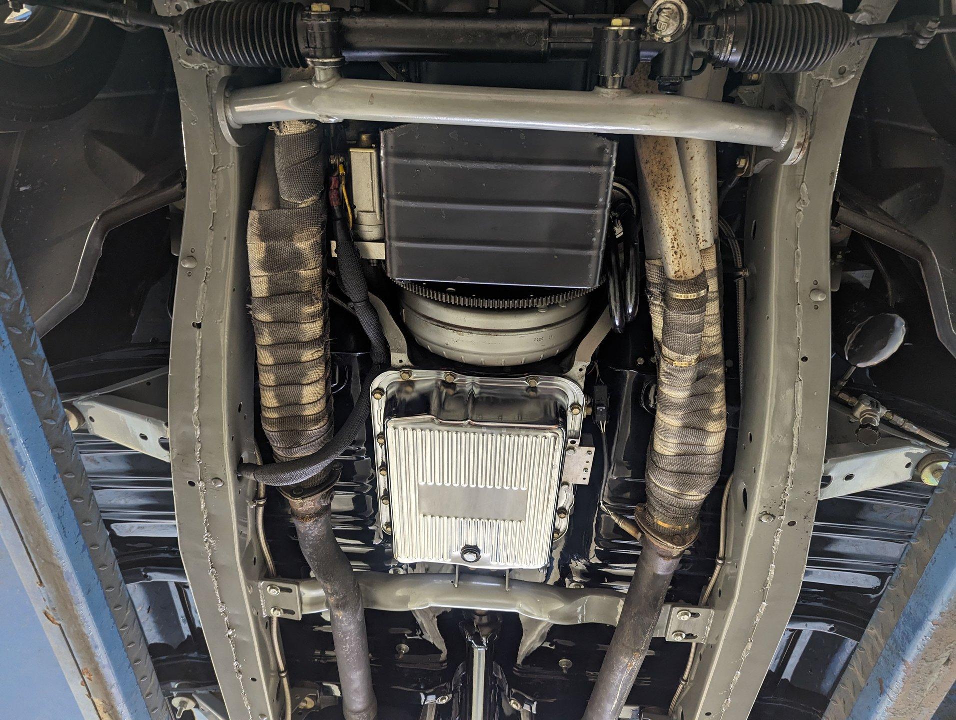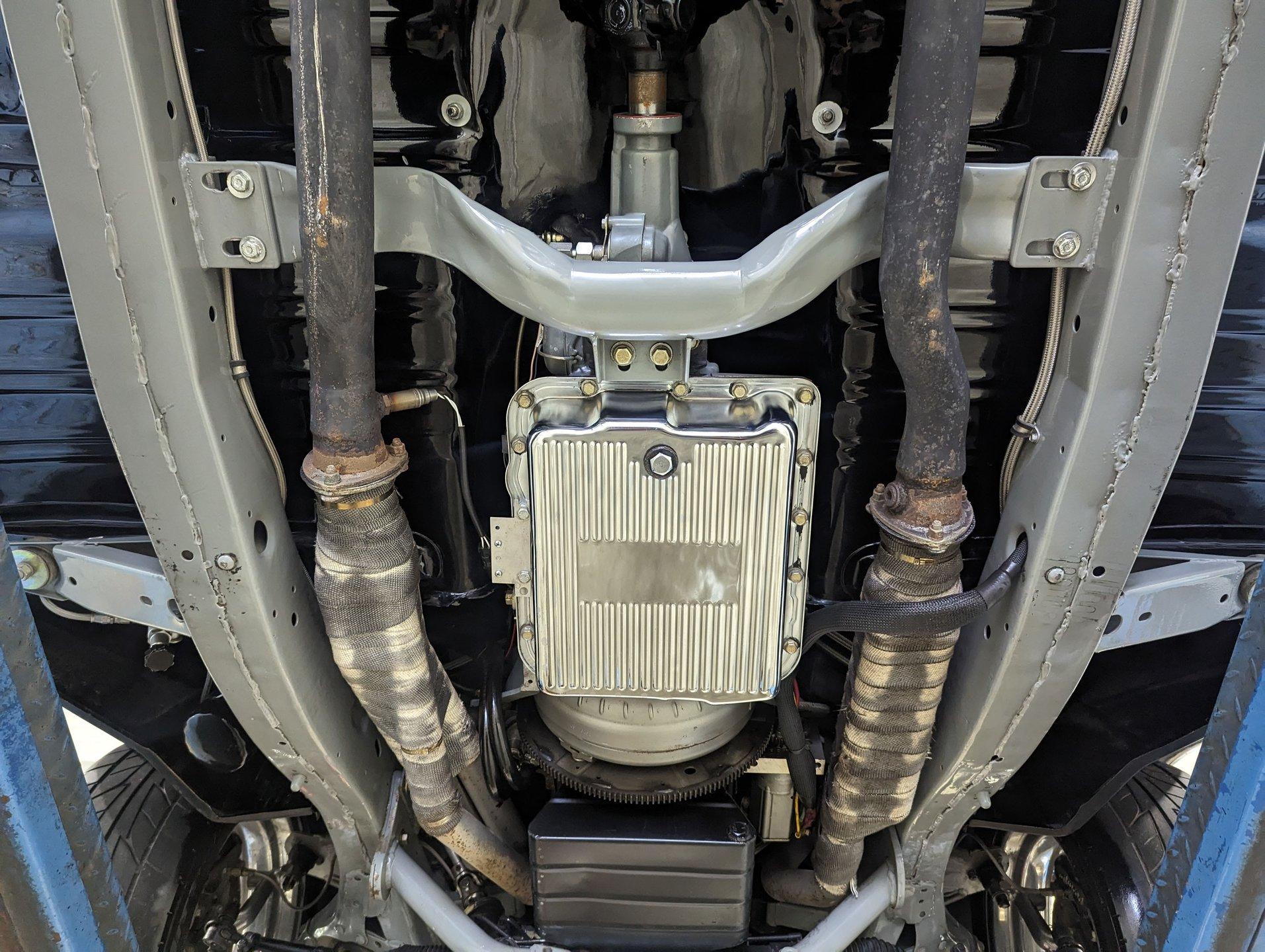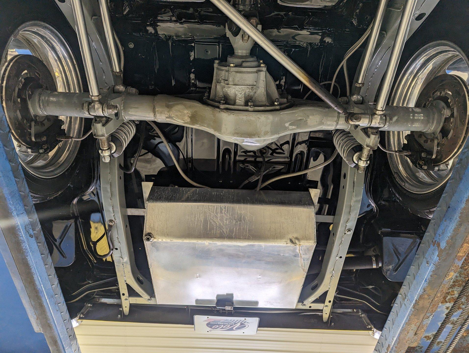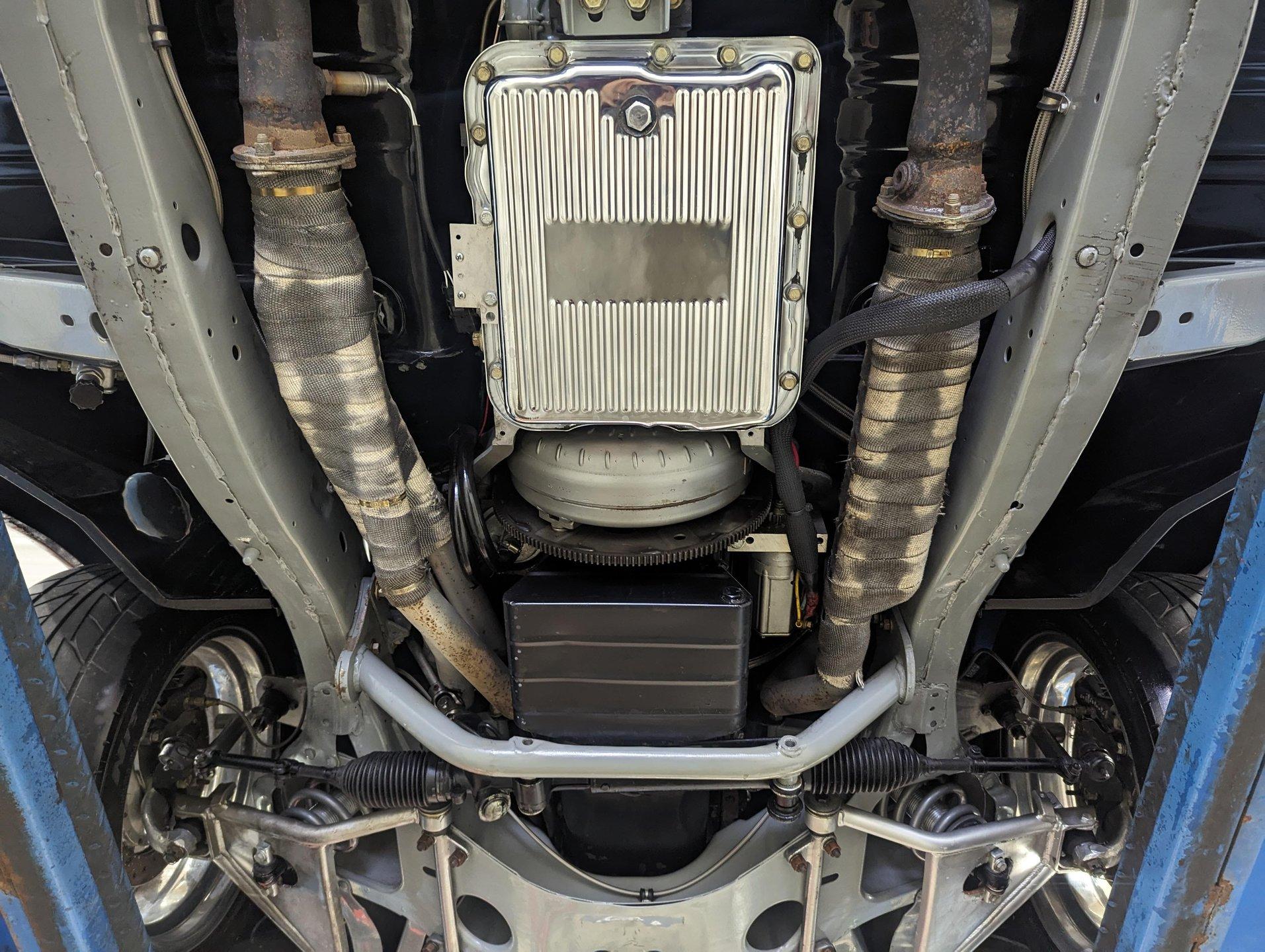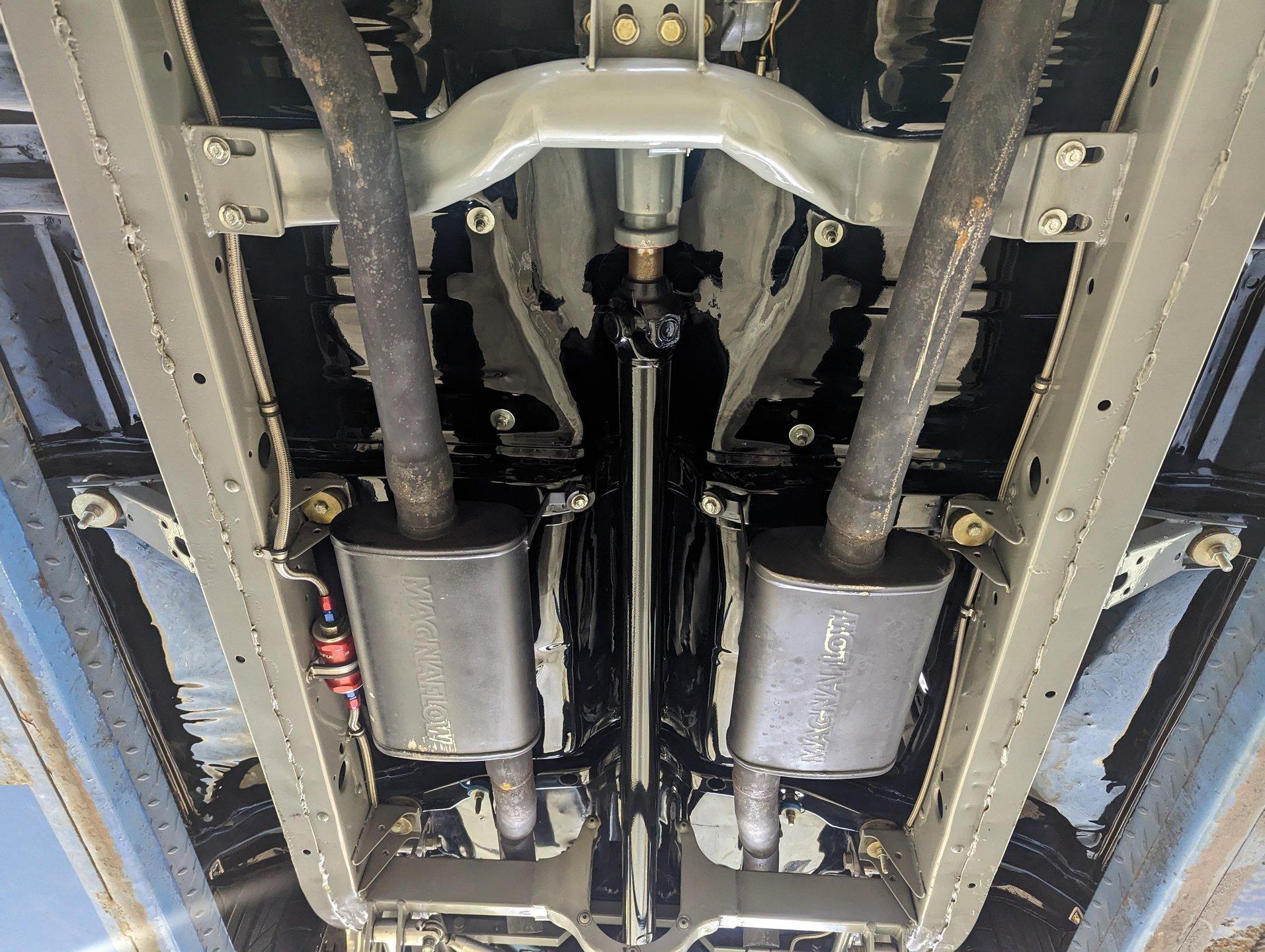 UNDERSIDE: The body was off the frame and the entire chassis was prepped and powder coated silver. The front end is upgraded with tubular control arms, coilover shocks, rack & pinion steering. In back it has a four link system with tubular control arms, a pan hard bar and coilover adjustable gas shocks. Custom stainless steel fuel tank and stainless braided hoses. Dual exhaust with Magnaflow mufflers. It has Wilwood drilled and slotted disc brakes at all four wheels. Looking up at the motor it has an extra capacity oil pan and a high torque starter. The transmission is upgraded to a 700R4 overdrive automatic. A custom drive shaft has a safety loop. In back is a Ford 9 inch posi rear end with 31 spline axles. The floors and braces look pristine and they're painted a high gloss black.