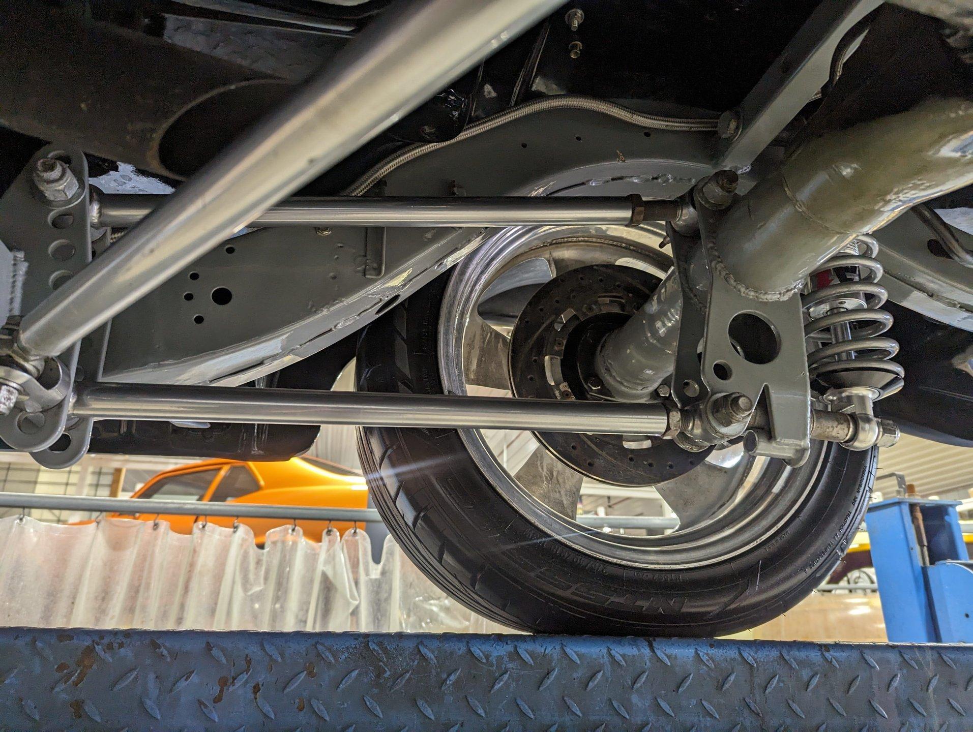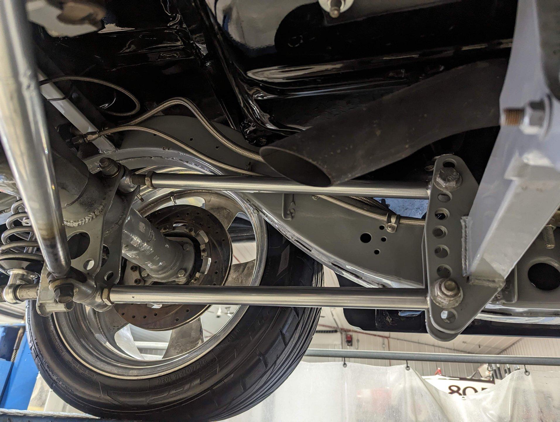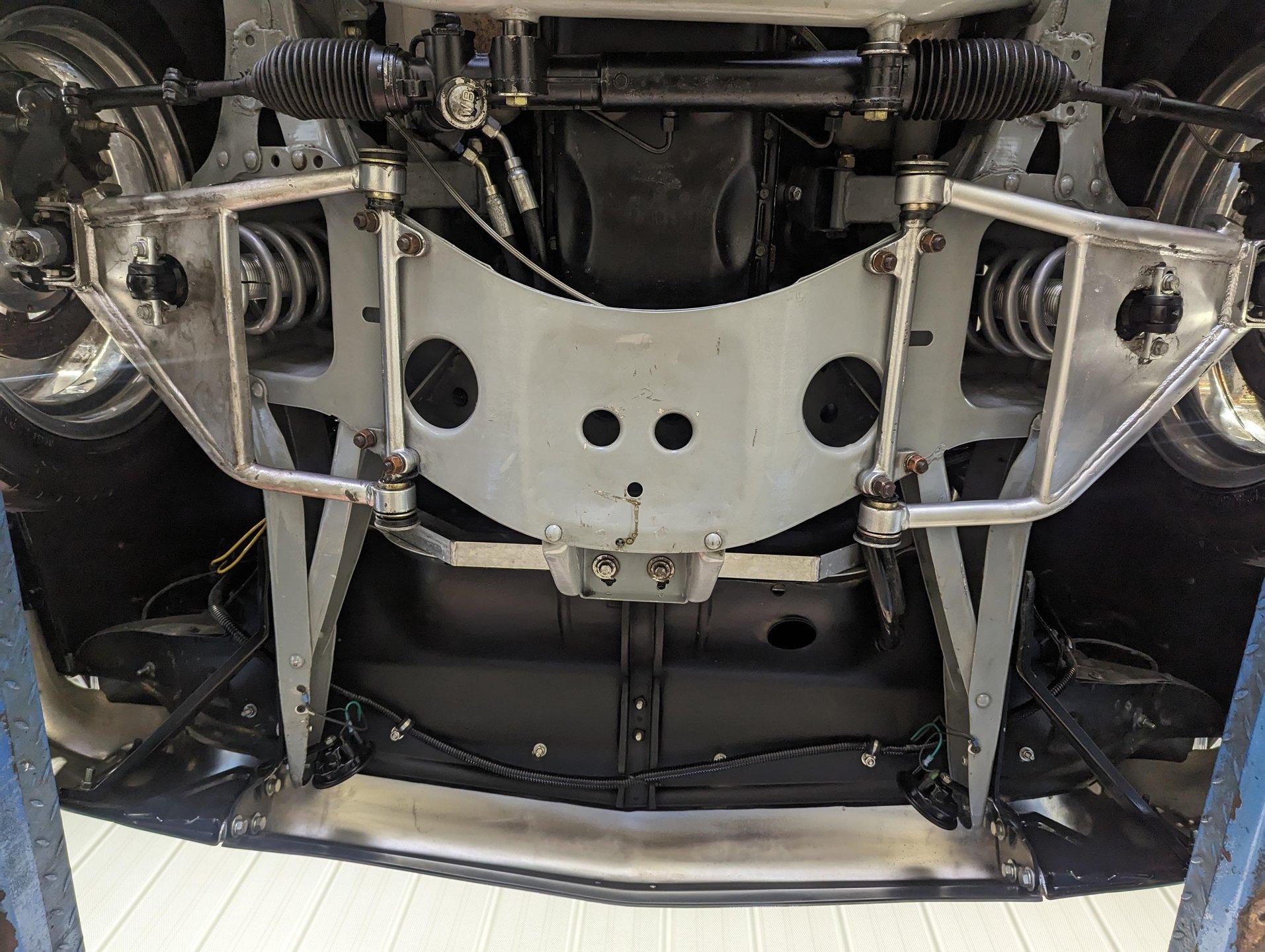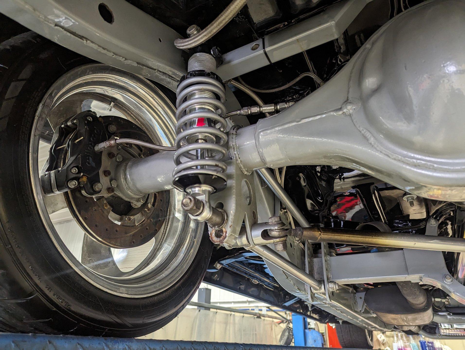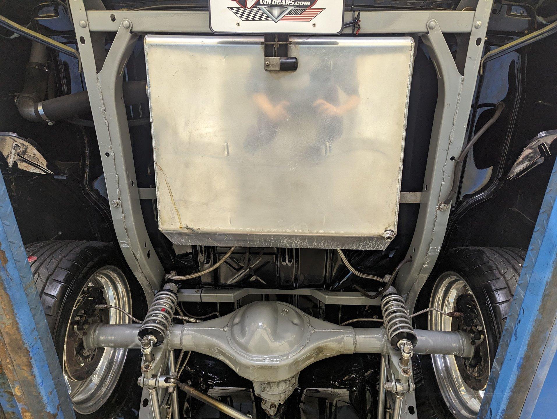 UNDERSIDE: The body was off the frame and the entire chassis was prepped and powder coated silver. The front end is upgraded with tubular control arms, coilover shocks, rack & pinion steering. In back it has a four link system with tubular control arms, a pan hard bar and coilover adjustable gas shocks. Custom stainless steel fuel tank and stainless braided hoses. Dual exhaust with Magnaflow mufflers. It has Wilwood drilled and slotted disc brakes at all four wheels. Looking up at the motor it has an extra capacity oil pan and a high torque starter. The transmission is upgraded to a 700R4 overdrive automatic. A custom drive shaft has a safety loop. In back is a Ford 9 inch posi rear end with 31 spline axles. The floors and braces look pristine and they're painted a high gloss black.