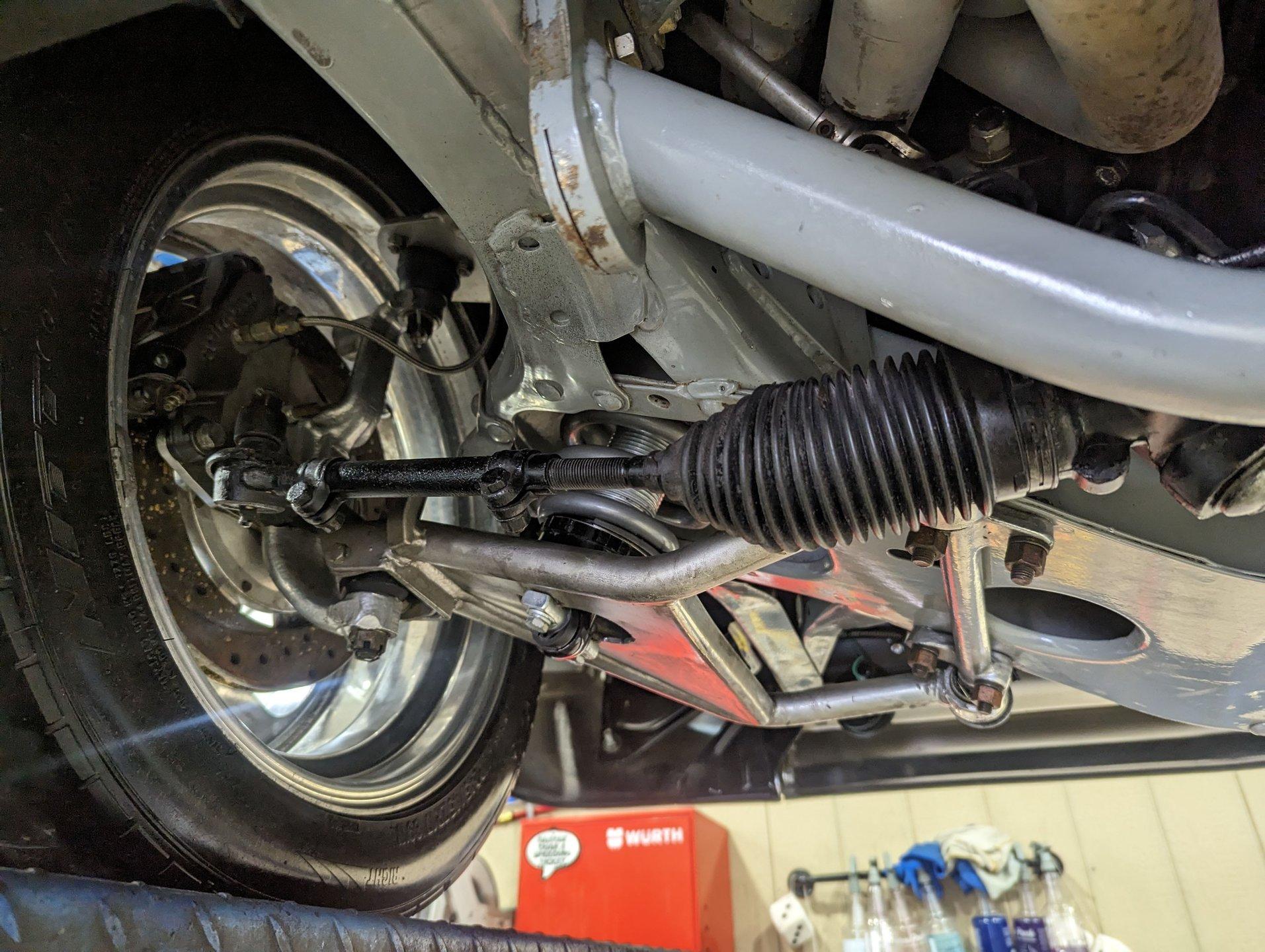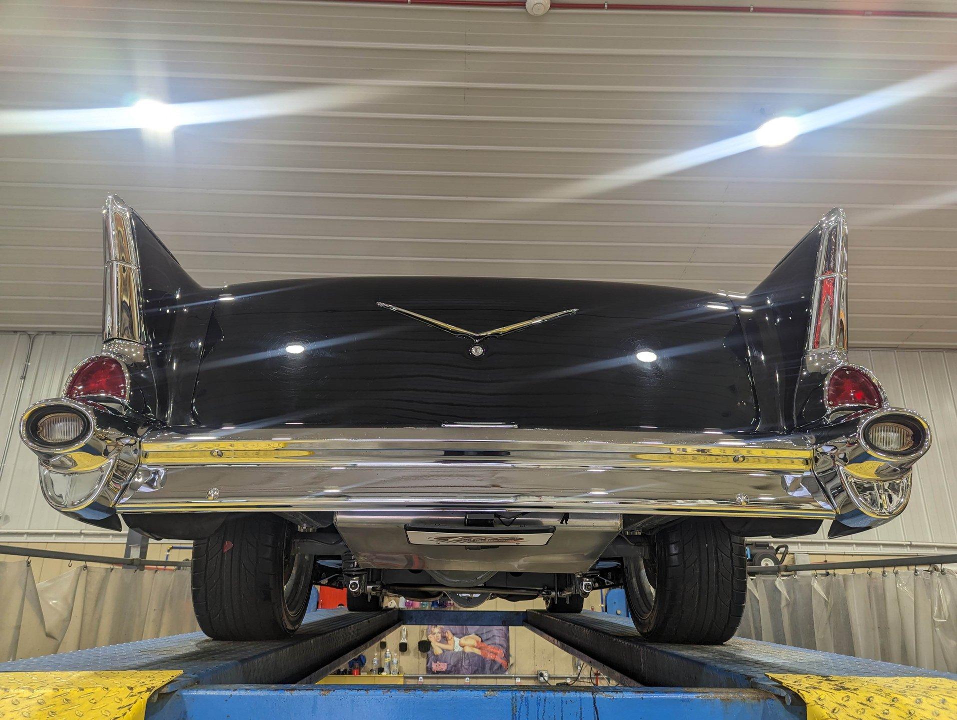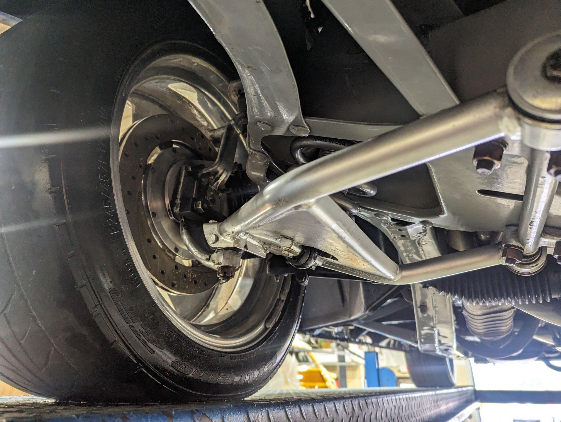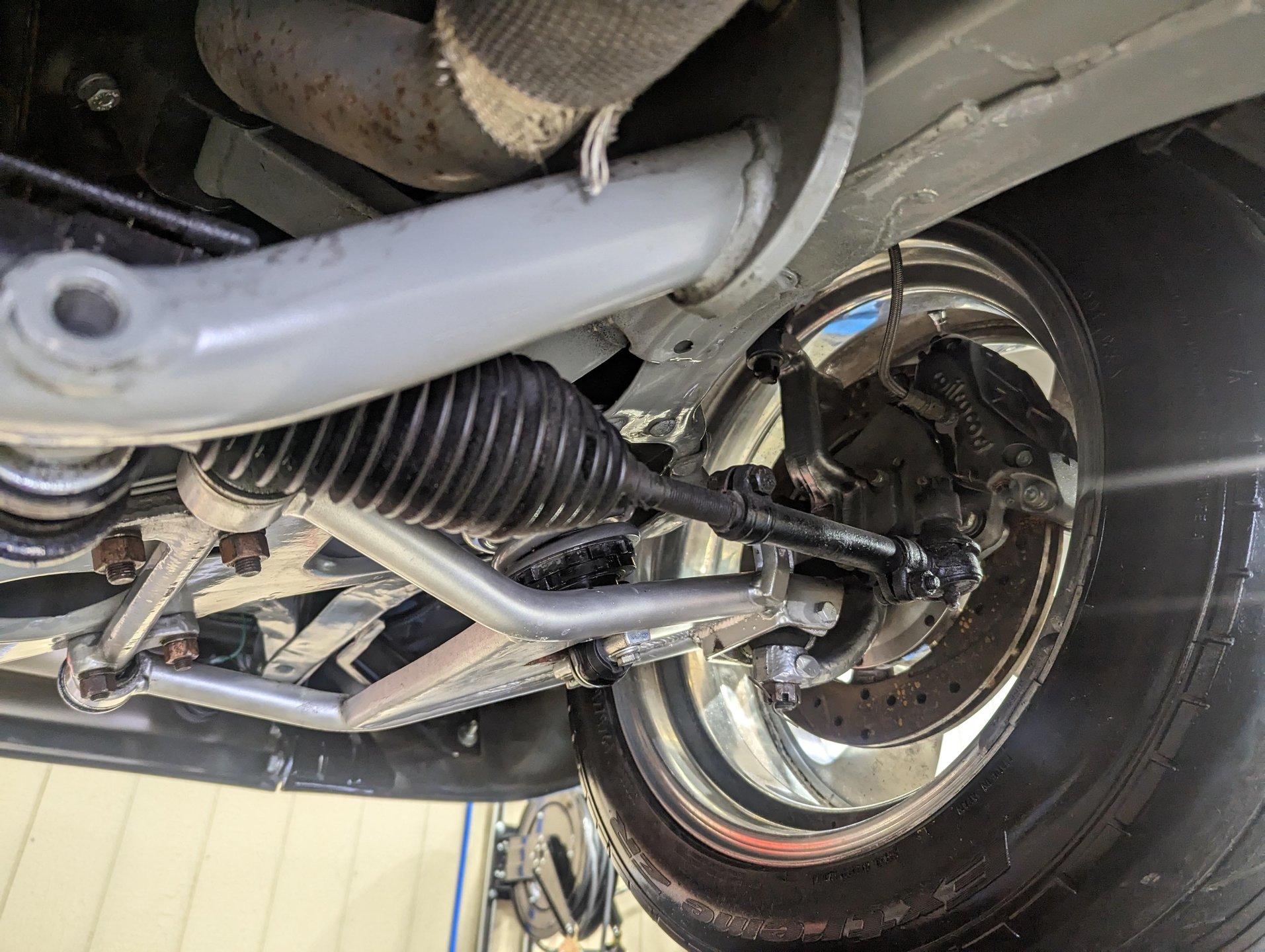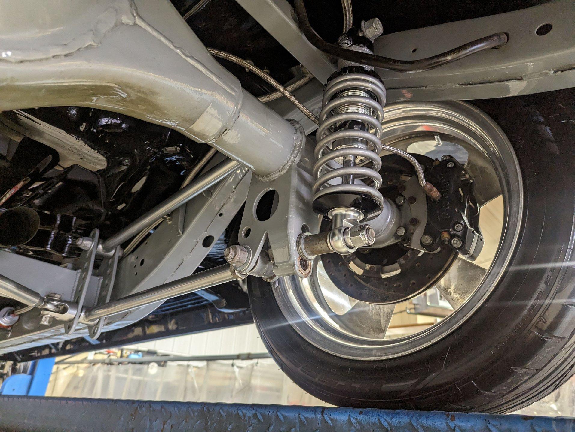 UNDERSIDE: The body was off the frame and the entire chassis was prepped and powder coated silver. The front end is upgraded with tubular control arms, coilover shocks, rack & pinion steering. In back it has a four link system with tubular control arms, a pan hard bar and coilover adjustable gas shocks. Custom stainless steel fuel tank and stainless braided hoses. Dual exhaust with Magnaflow mufflers. It has Wilwood drilled and slotted disc brakes at all four wheels. Looking up at the motor it has an extra capacity oil pan and a high torque starter. The transmission is upgraded to a 700R4 overdrive automatic. A custom drive shaft has a safety loop. In back is a Ford 9 inch posi rear end with 31 spline axles. The floors and braces look pristine and they're painted a high gloss black.