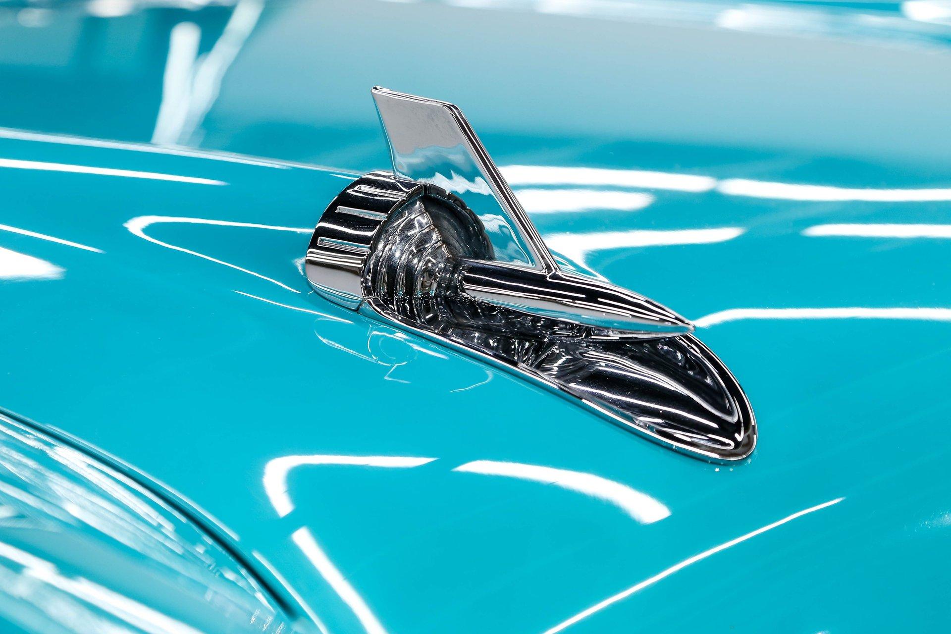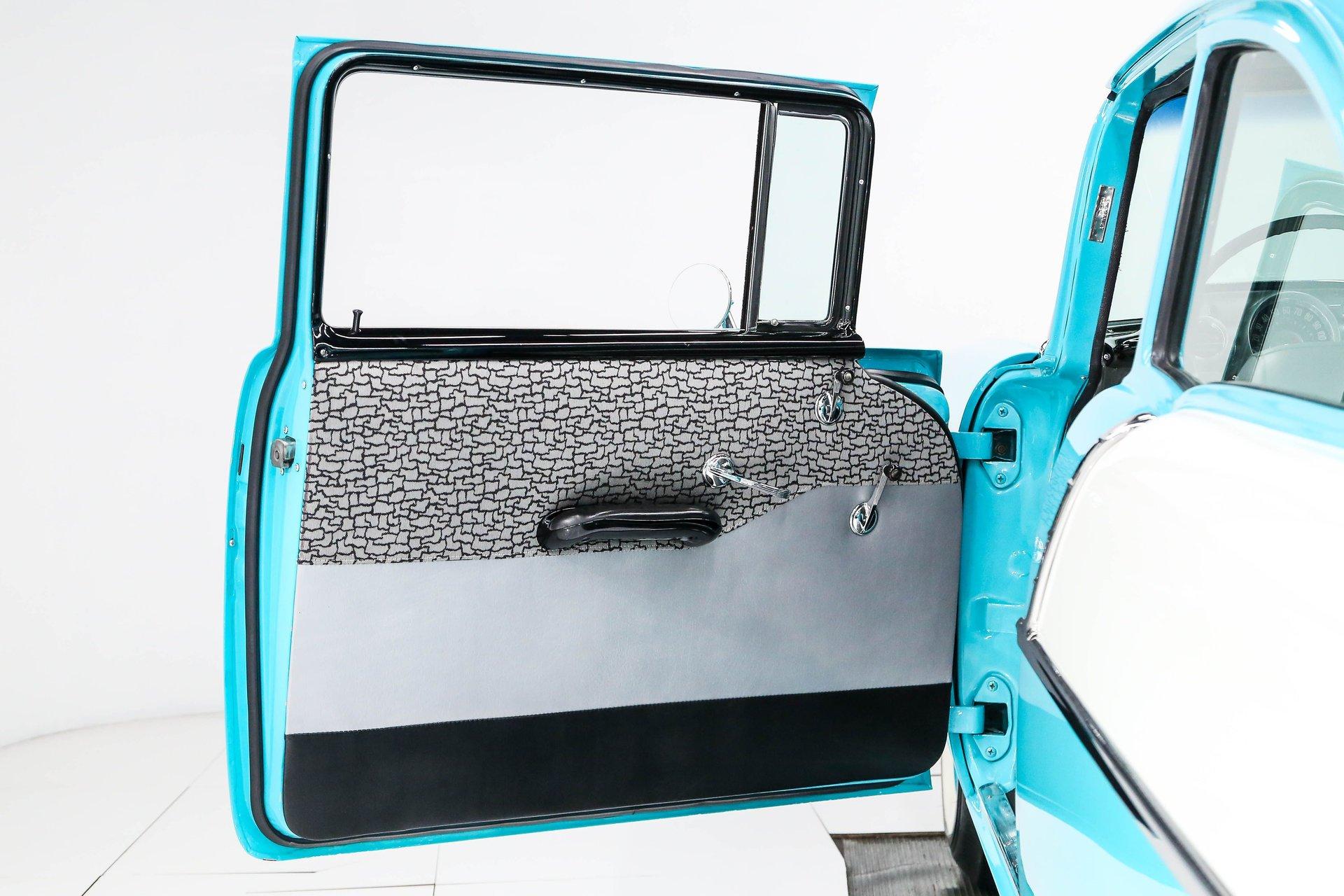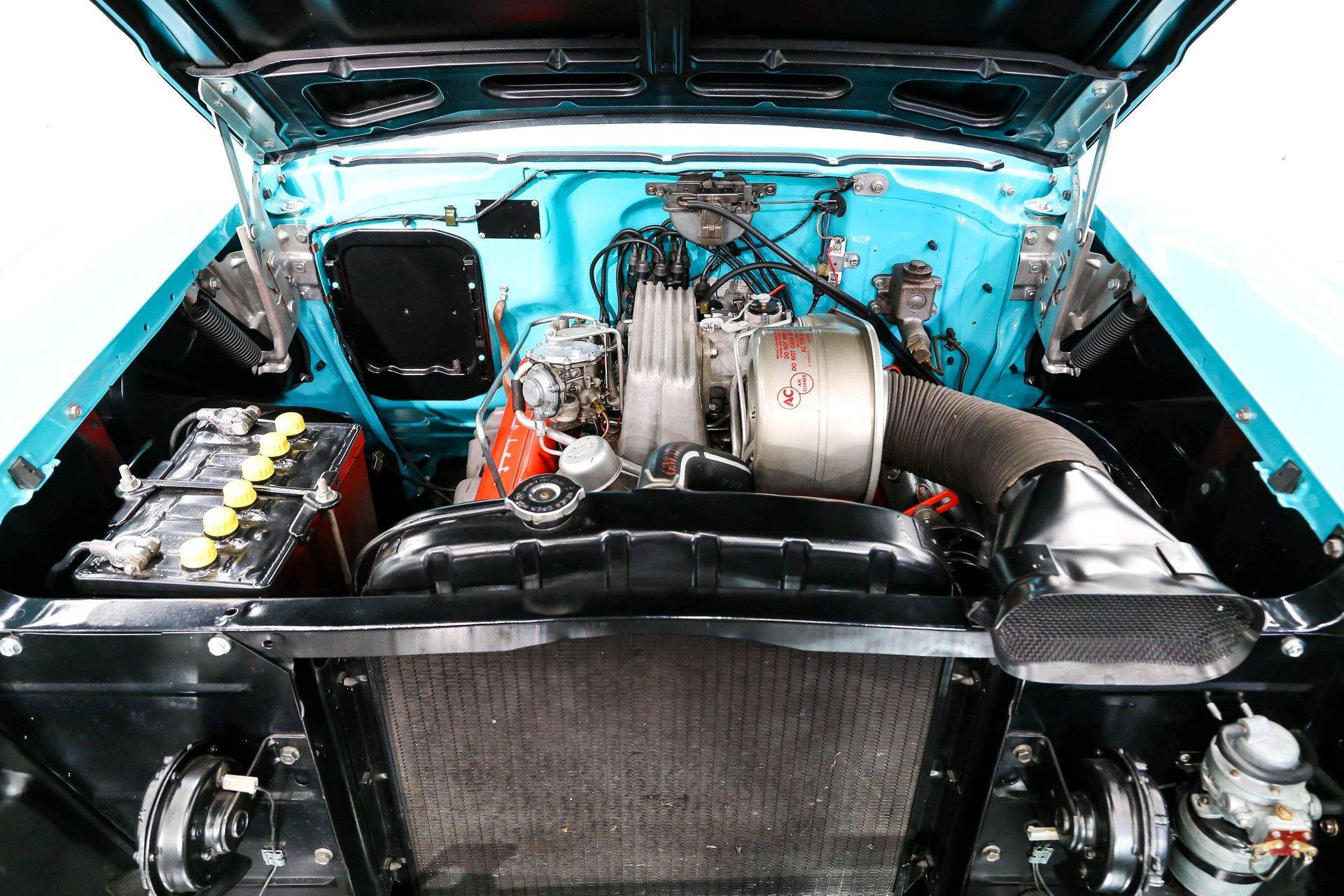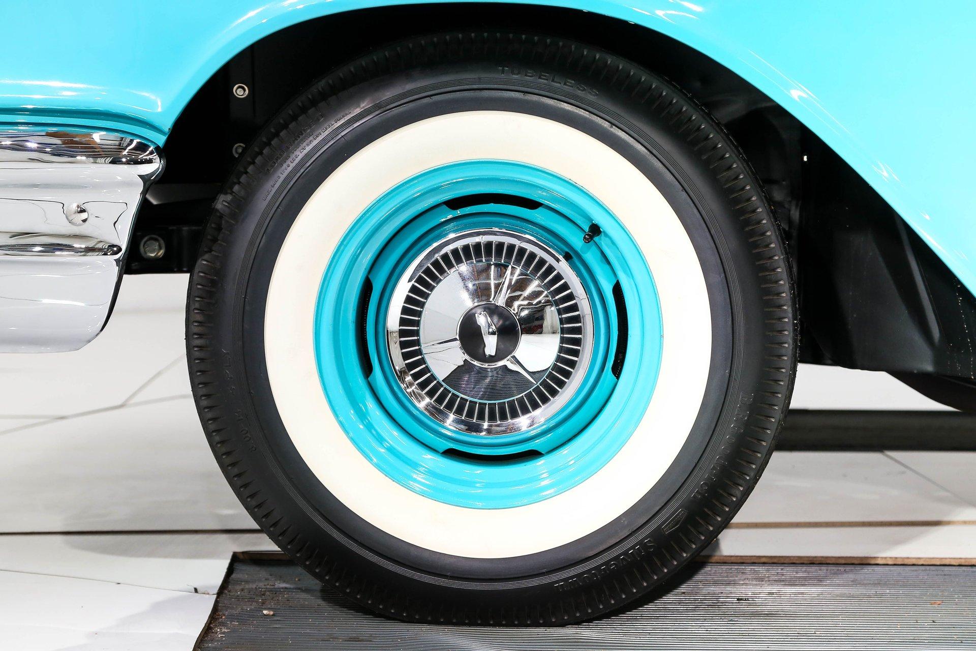 EXTERIOR: All the sheet metal is original to this car. It was stripped down to bare. The panels fit precisely. Repainted it's original Tropical Turquoise- India Ivory colors using PPG Deltron. It was sanded and buffed to a better than new finish. Painted 30 years ago and it still looks amazing, that's a real testament to it's quality. Original Fuel Injection emblems were on the 1/4 panels on the 150 only, all others were on the fenders. The holes look factory, not drilled. The chrome was redone by Royal Silver. It has original California 1 piece bumper. Buff it Bob restored the stainless trim. All new glass. The weatherstrips and seals were all replaced. Being the base model it has minimal trim, no rubber tips on the front bumpers, no reverse lights. It also has painted rims with poverty caps. They did splurge for a set of white walls.