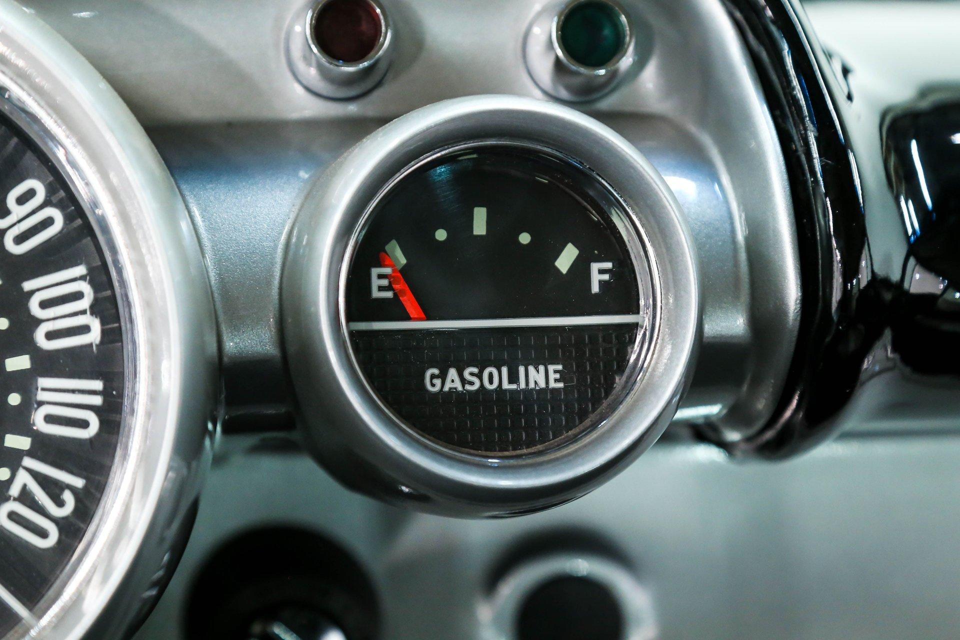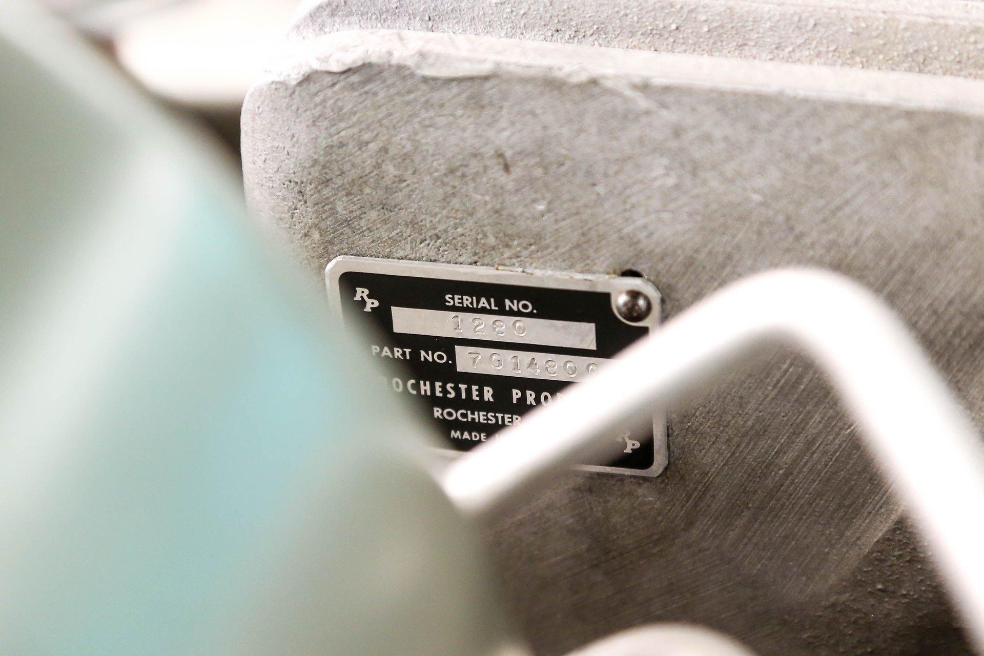ENGINE COMPARTMENT: 283-283 hp, 1 hp per cubic inch was a big deal back then. Correct engine with hi lift cam, 10.5:1 compression, 539 heads, Rochester injection. It is a complete 57 fuel injection unit, rebuilt and authenticated by Jack Podell. It has the factory hood brace notched for the cold air intake unique to a fuelie. All the components look factory correct. The fuel filter, manifolds, GM hoses and clamps. Rare NASCAR distributor with a gear drive to run the fuelie and one to run a tachometer. It has the rare vacuum pump unique to a fuelie. It is detailed beautifully.