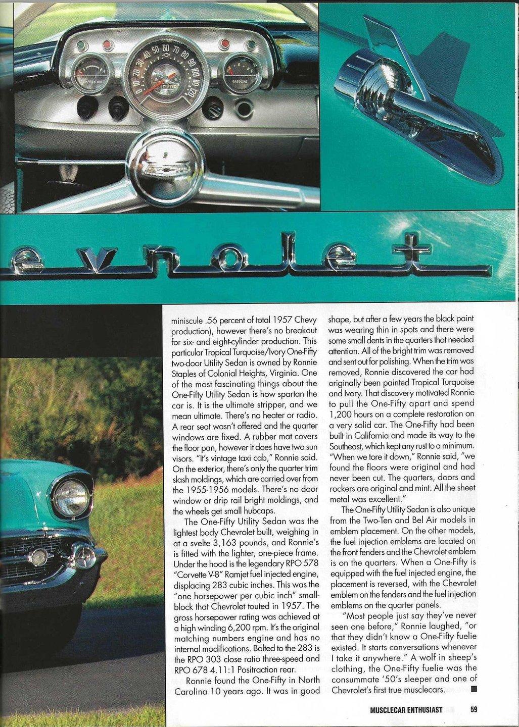 CONCLUSION: Typically a utility sedan was ordered by traveling salesmen so they had room for what ever it was they were selling. A salesman wouldn't want a fuelie and a 4.10 posi. In this case it was for a different purpose, to go faster! It wasn't to save money, it was to eliminate weight. This is one of the rarest and coolest 57s anywhere! It certainly is a conversation piece whether in your collection, at a show or parking lot of a Dairy Queen!