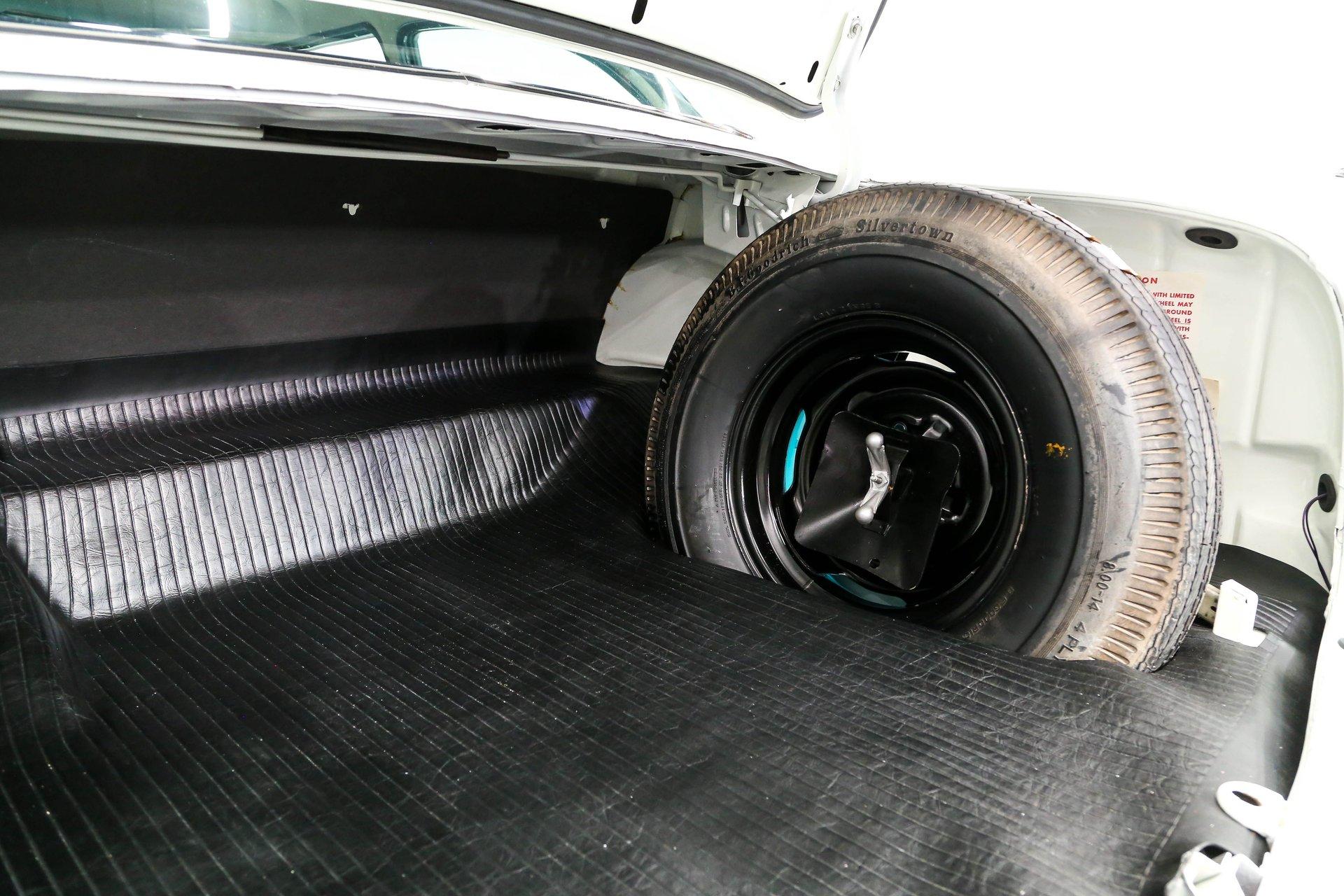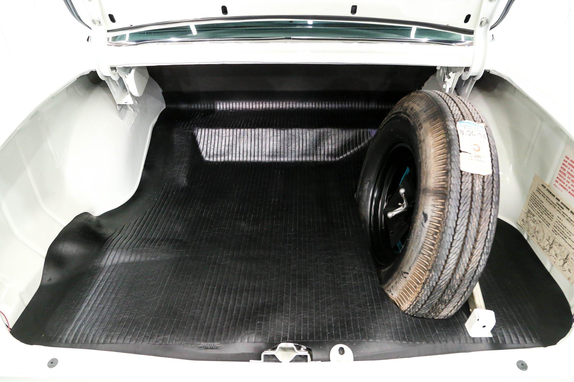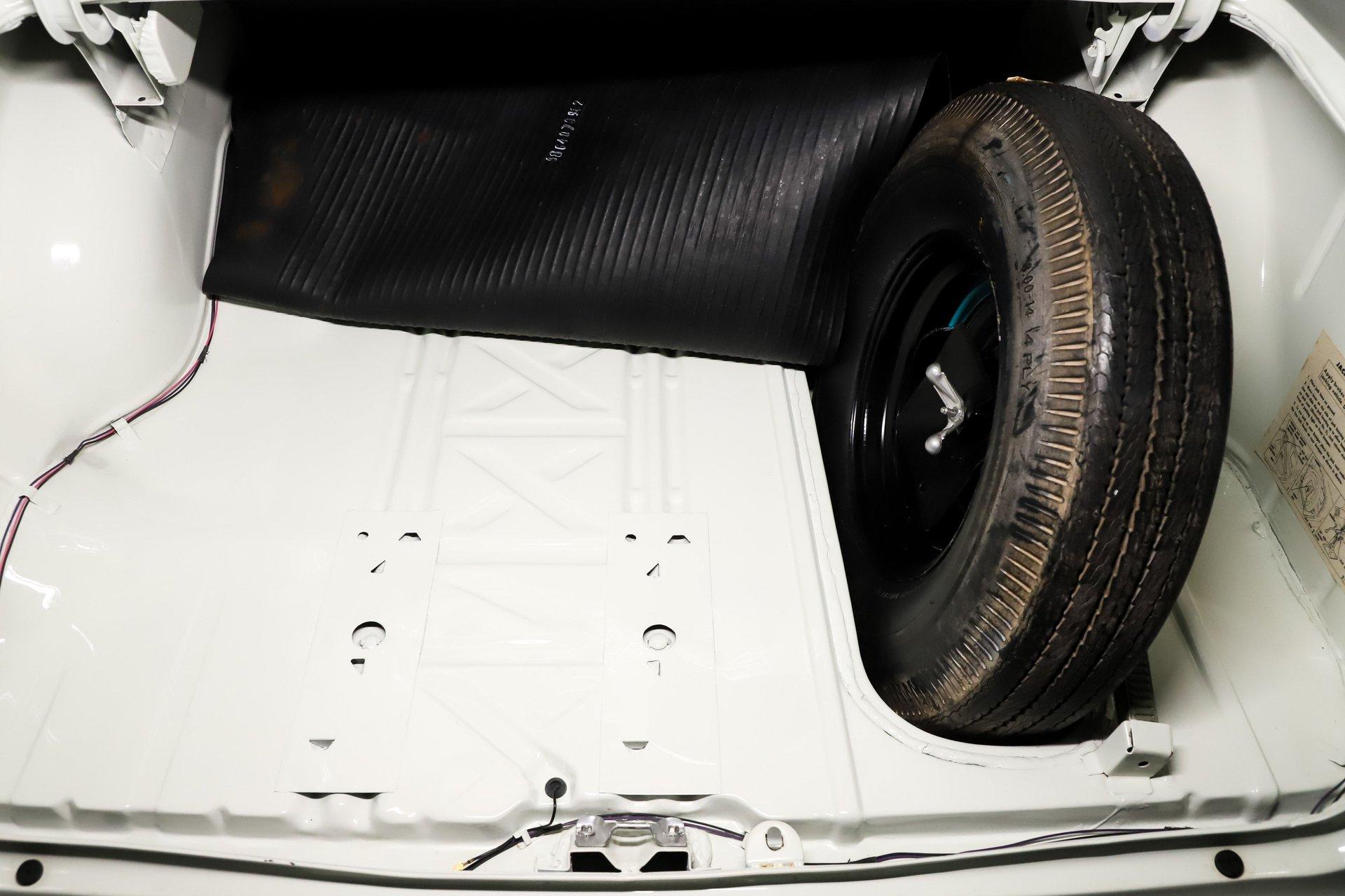 TRUNK COMPARTMENT: Rock solid, it has all been painted white. The weatherstrip, mat, wiring harness, seat divider were replaced. Restored rim and reproduction tire is a match to the other 4 wheels. It has a restored jack.
