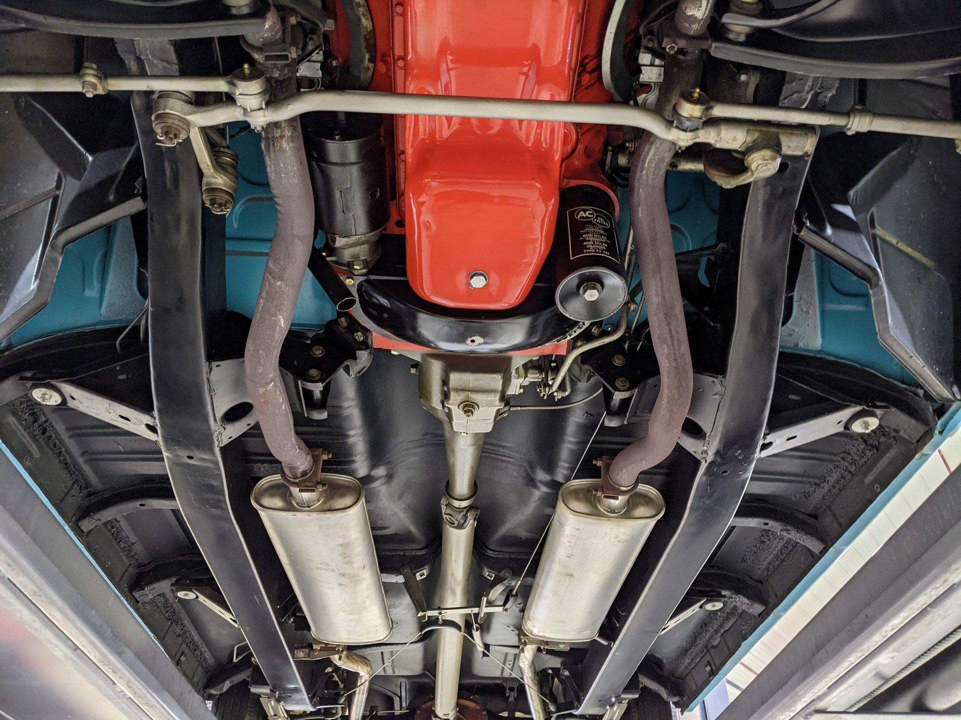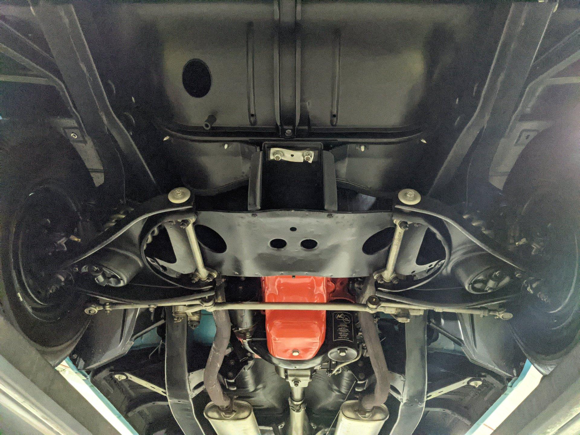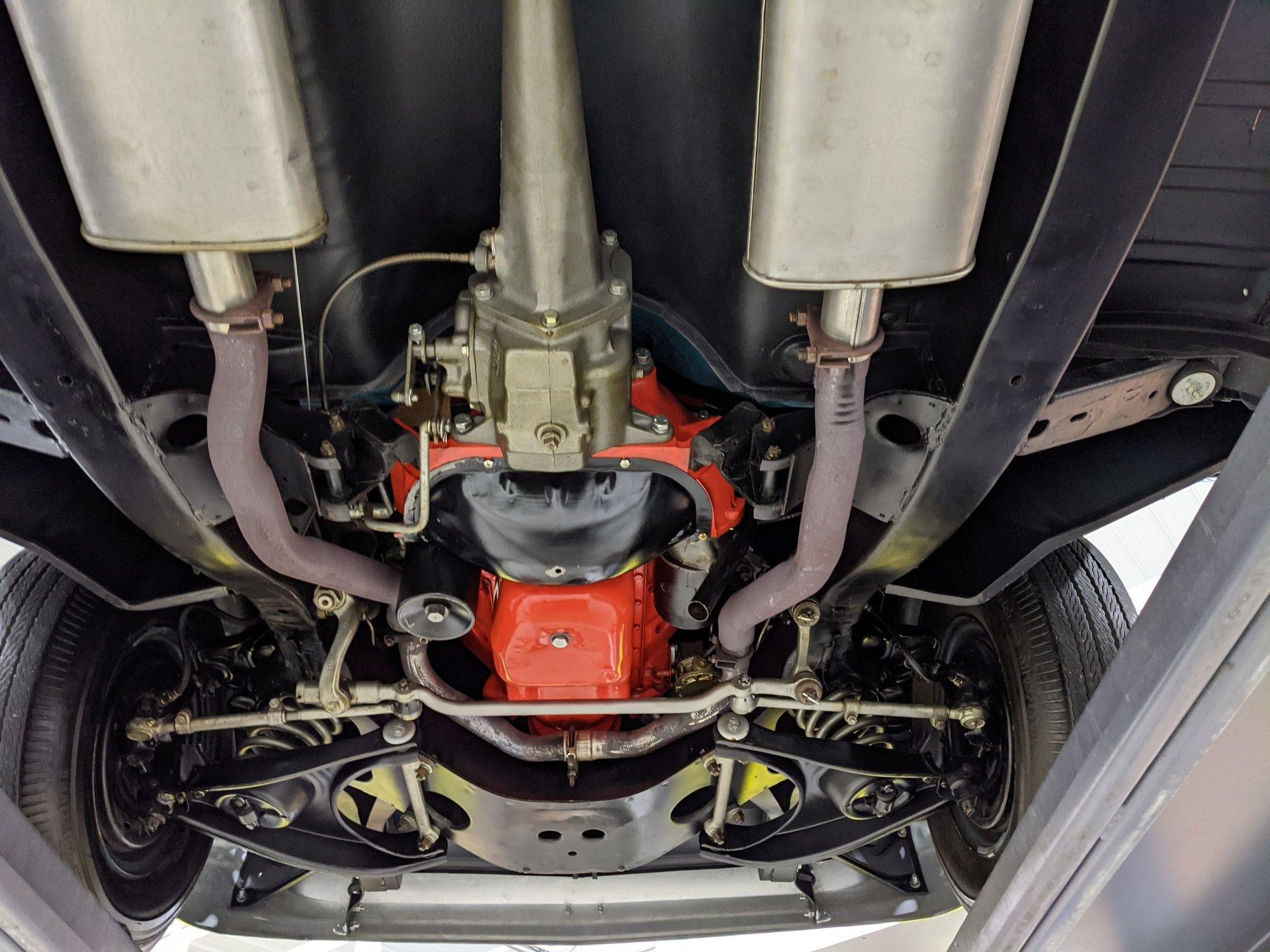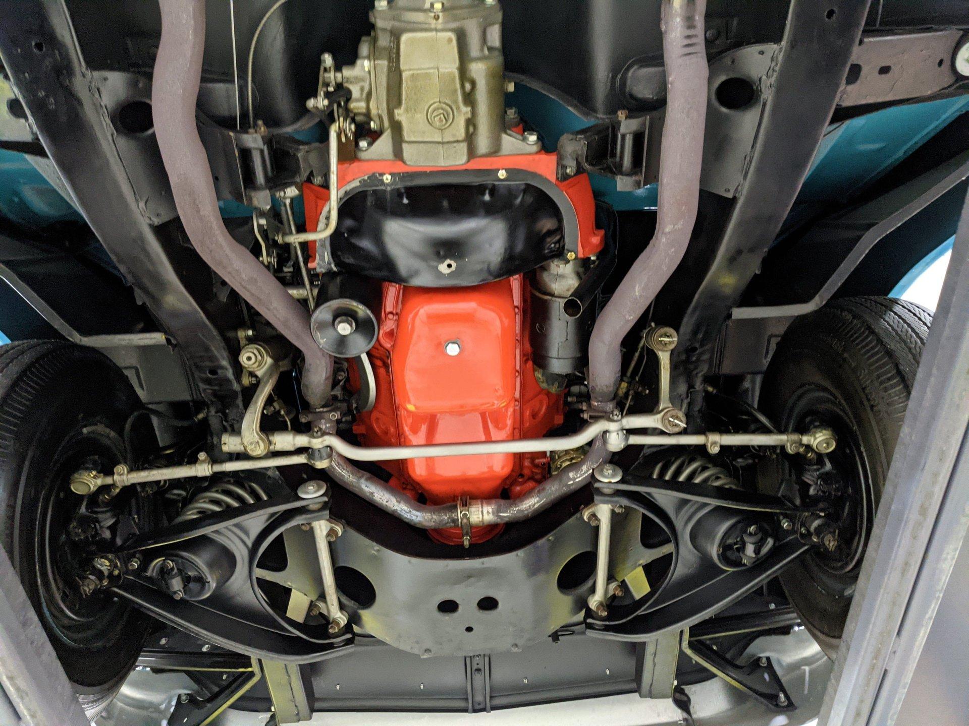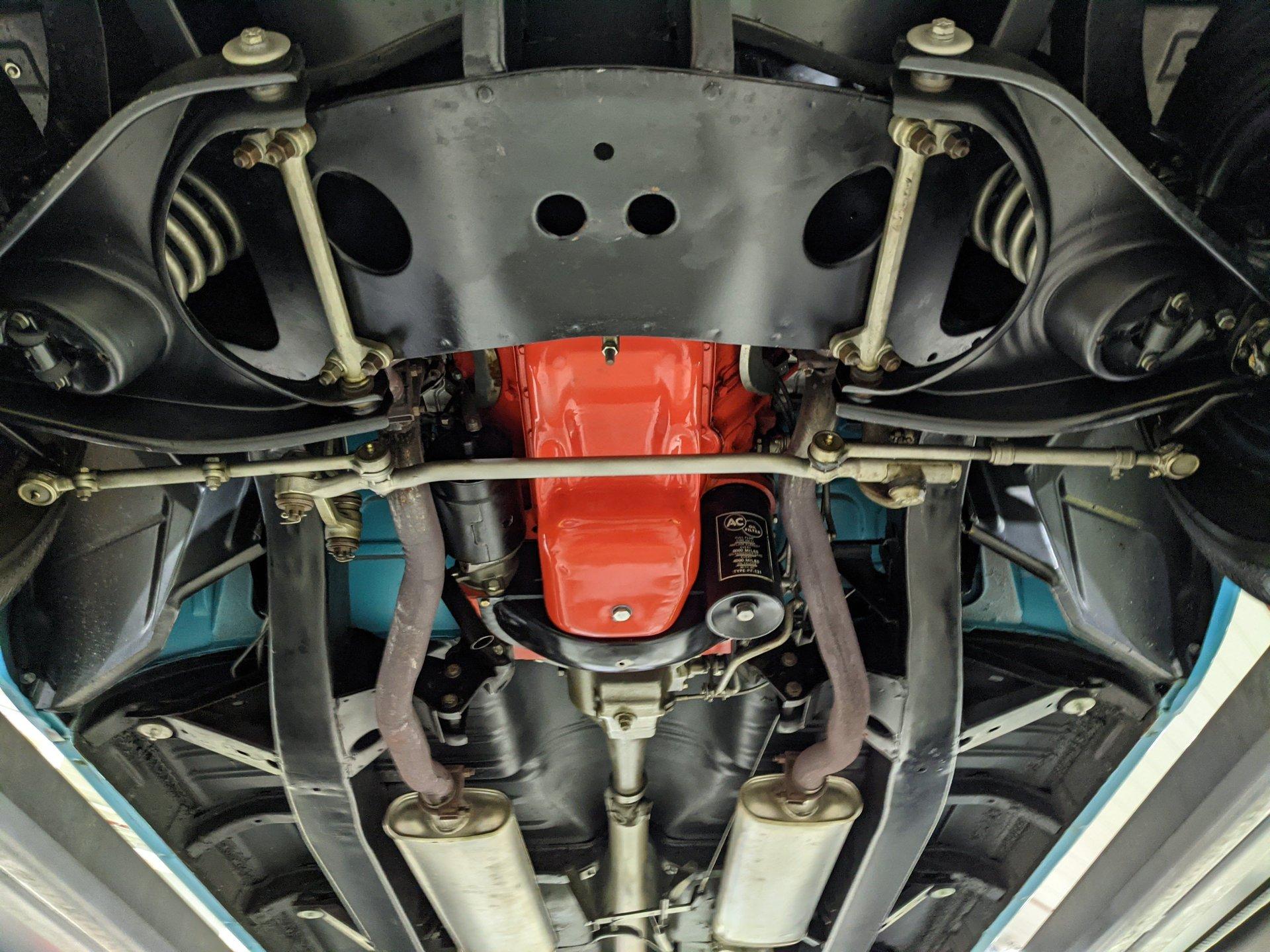 UNDERSIDE: Restored to new factory condition. Clean original rust free floors, rockers and braces painted smooth satin black. Every component was removed, rebuilt and detailed. The suspension and steering was all rebuilt. It has correct spiral shocks. Brakes were rebuilt, lines and e-brake assembly were replaced. The fuel system was replaced. Correct exhaust system was replaced. Looking up at the motor is looks new. Correct screw on oil canister, restored starter. Rebuilt close ratio manual 3-speed, correctly dated for this car. Restored 4.11 posi in back.