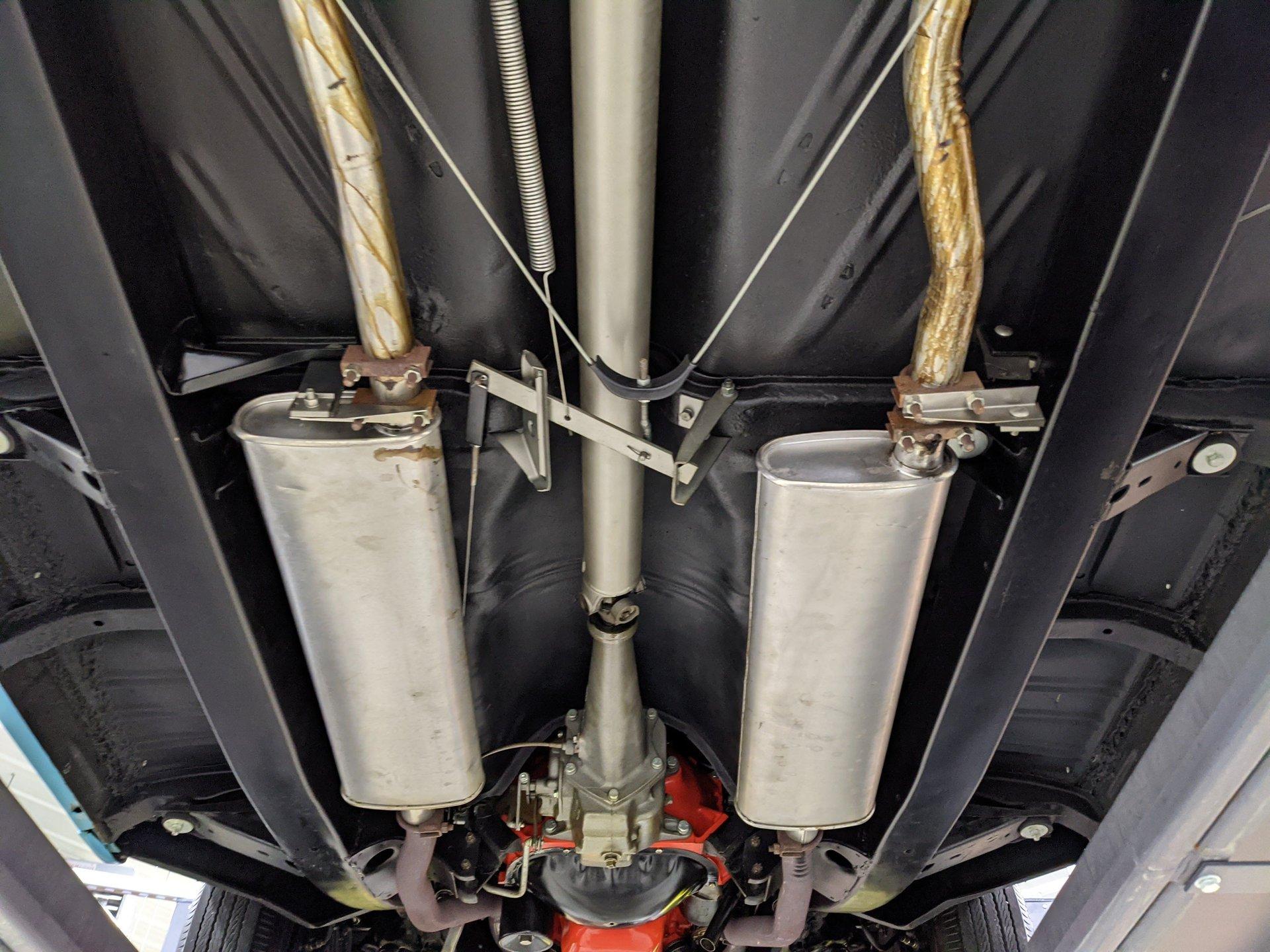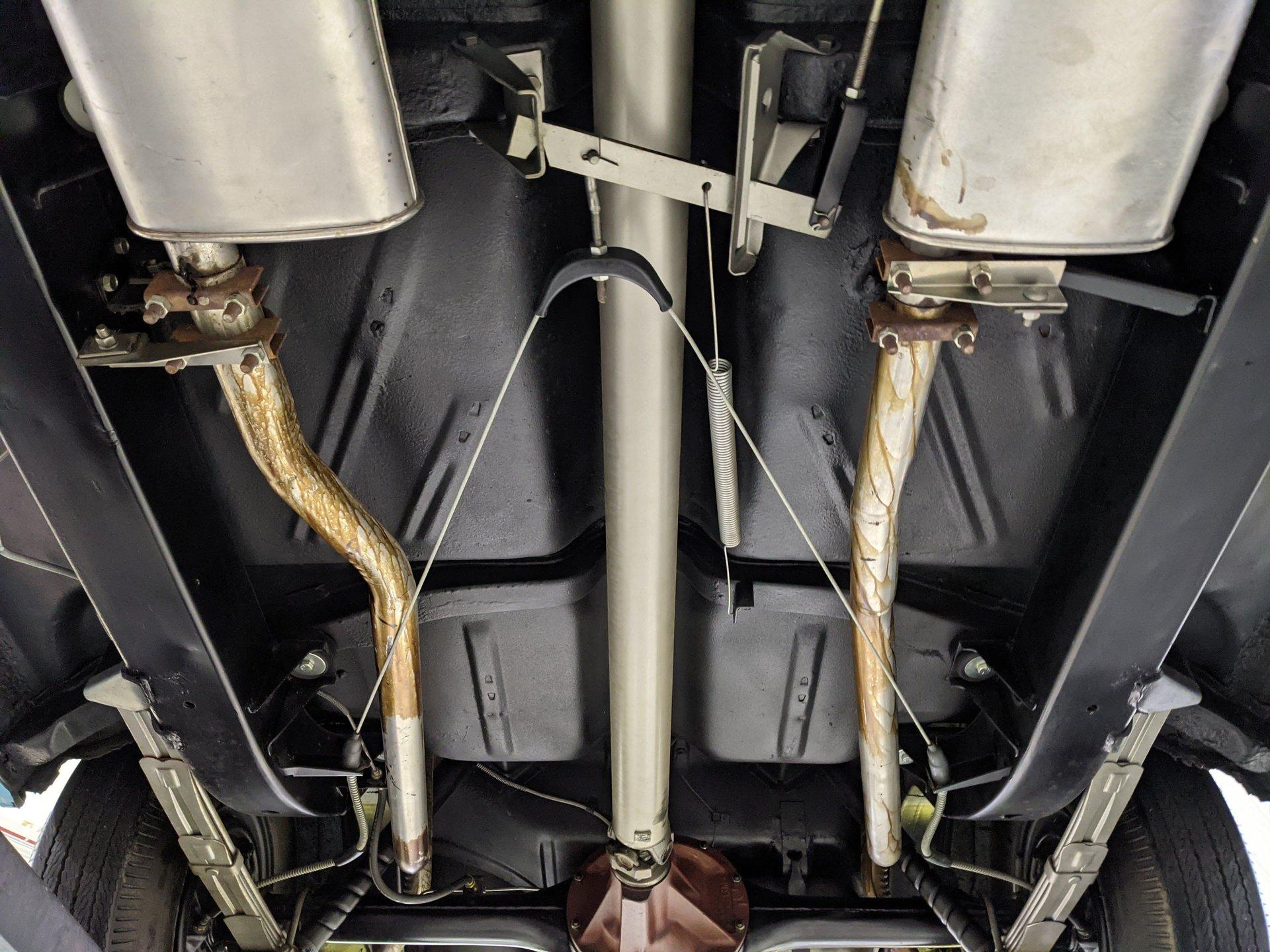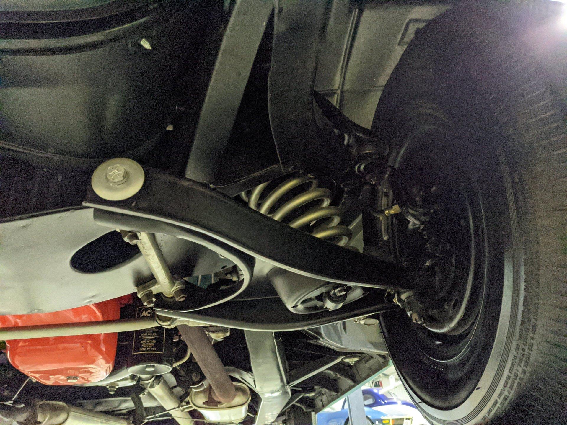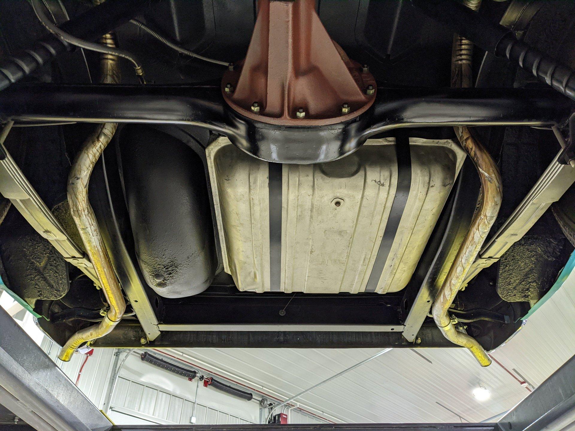 UNDERSIDE: Restored to new factory condition. Clean original rust free floors, rockers and braces painted smooth satin black. Every component was removed, rebuilt and detailed. The suspension and steering was all rebuilt. It has correct spiral shocks. Brakes were rebuilt, lines and e-brake assembly were replaced. The fuel system was replaced. Correct exhaust system was replaced. Looking up at the motor is looks new. Correct screw on oil canister, restored starter. Rebuilt close ratio manual 3-speed, correctly dated for this car. Restored 4.11 posi in back.