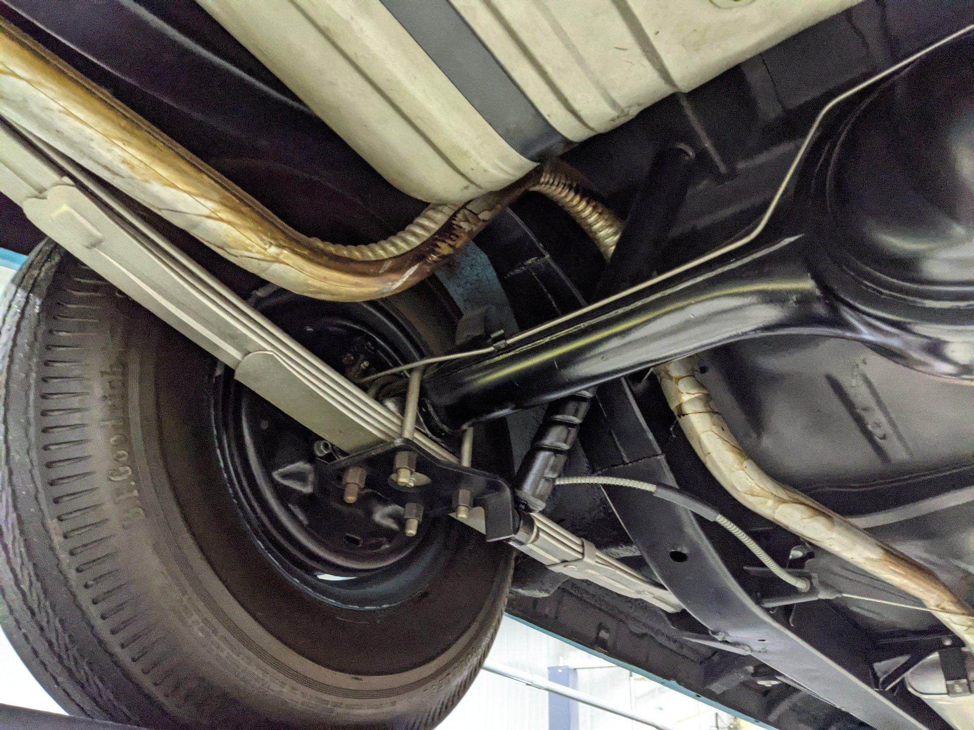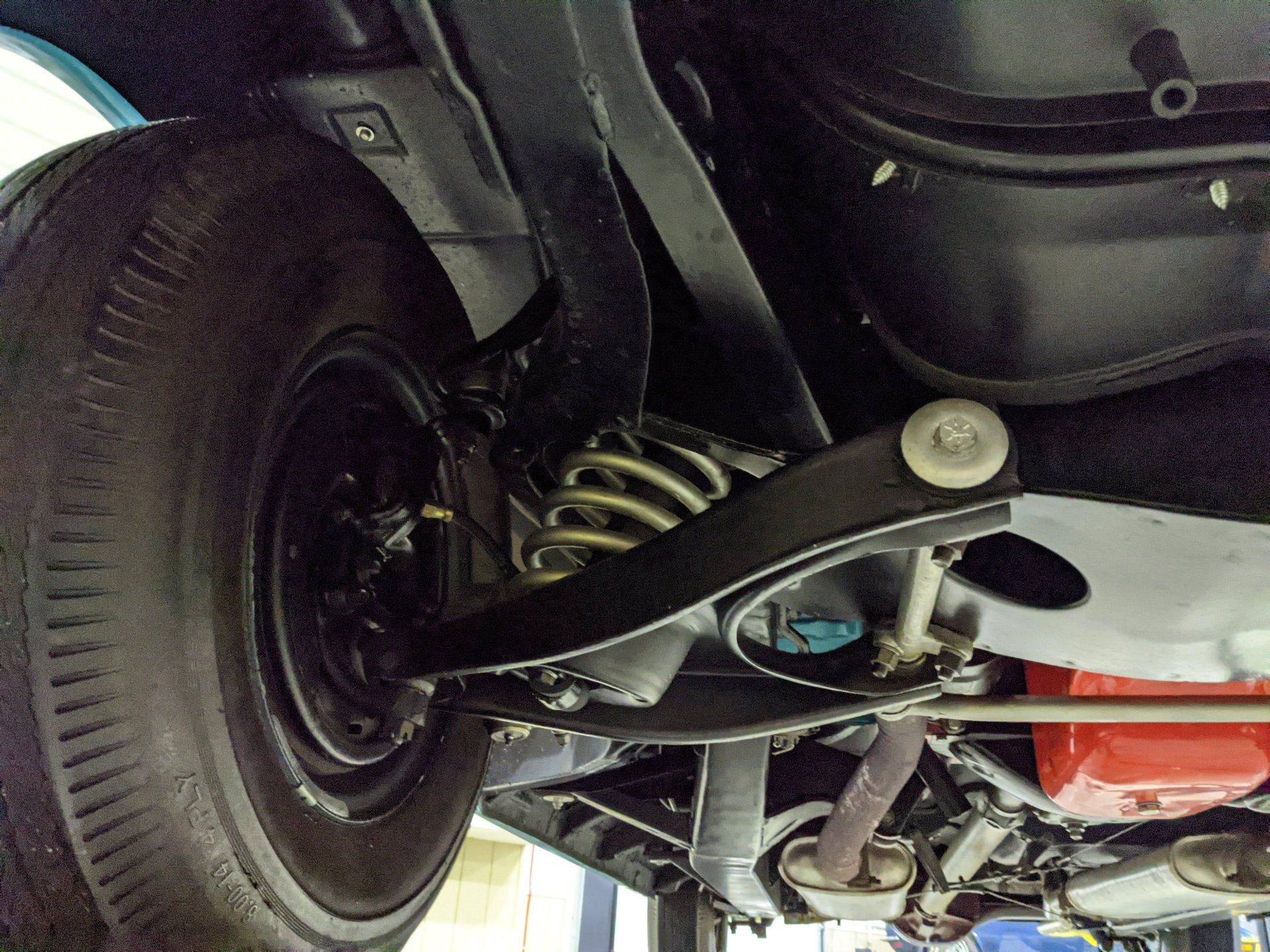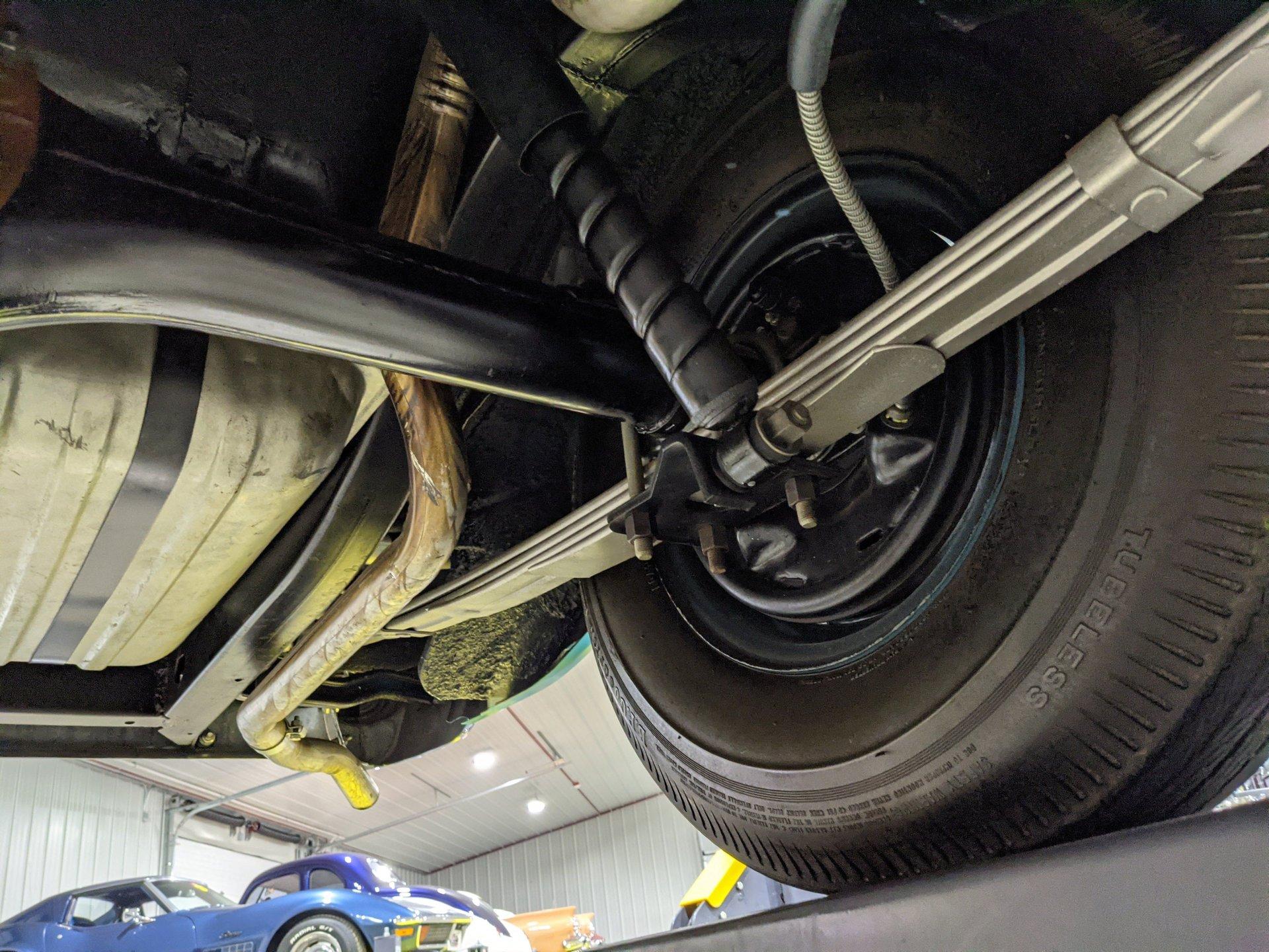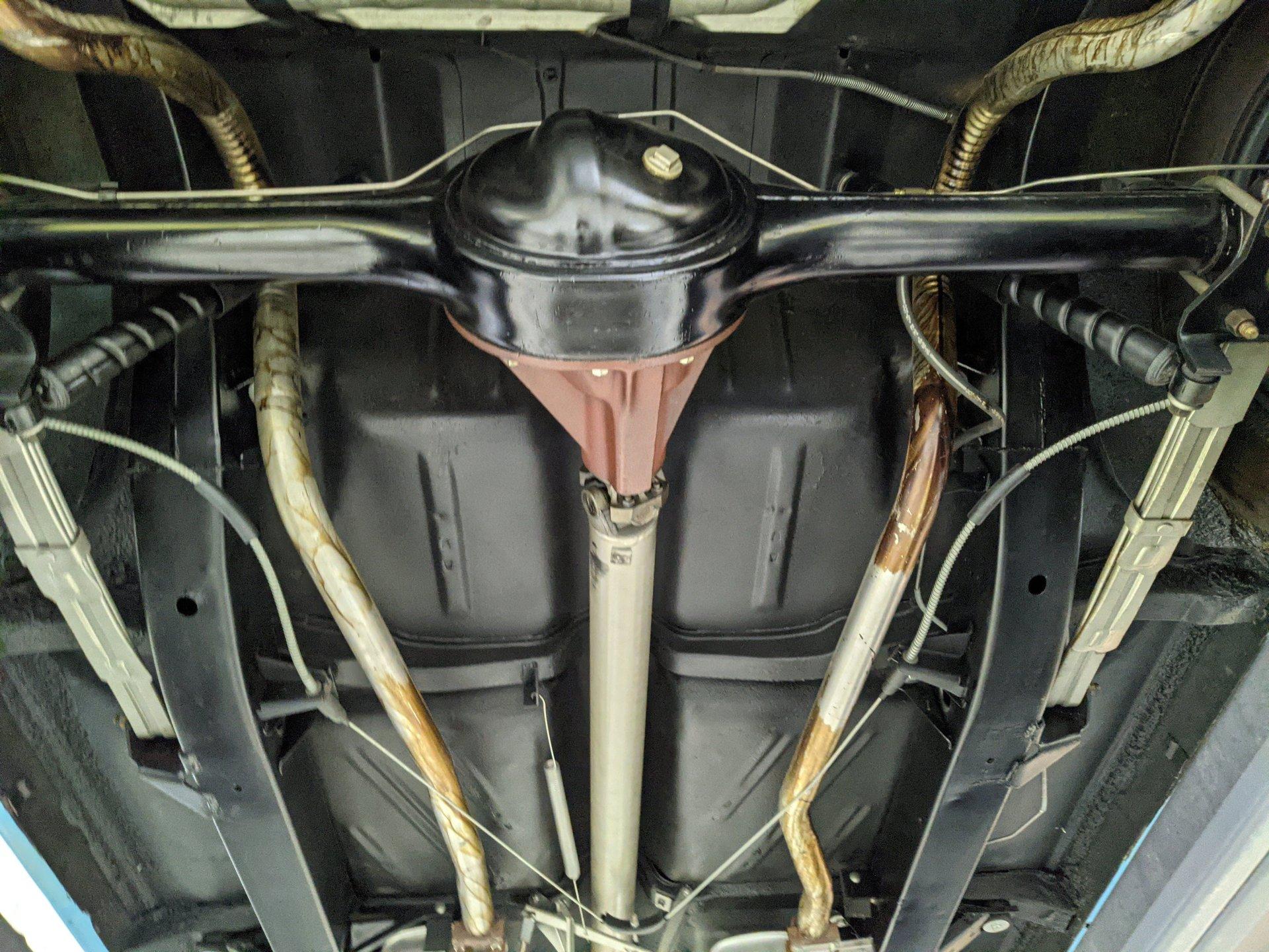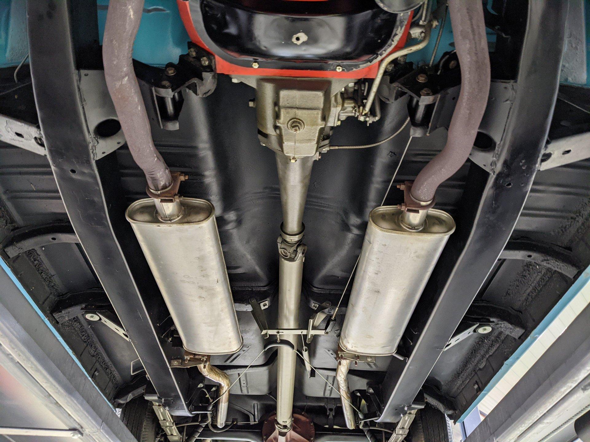 UNDERSIDE: Restored to new factory condition. Clean original rust free floors, rockers and braces painted smooth satin black. Every component was removed, rebuilt and detailed. The suspension and steering was all rebuilt. It has correct spiral shocks. Brakes were rebuilt, lines and e-brake assembly were replaced. The fuel system was replaced. Correct exhaust system was replaced. Looking up at the motor is looks new. Correct screw on oil canister, restored starter. Rebuilt close ratio manual 3-speed, correctly dated for this car. Restored 4.11 posi in back.