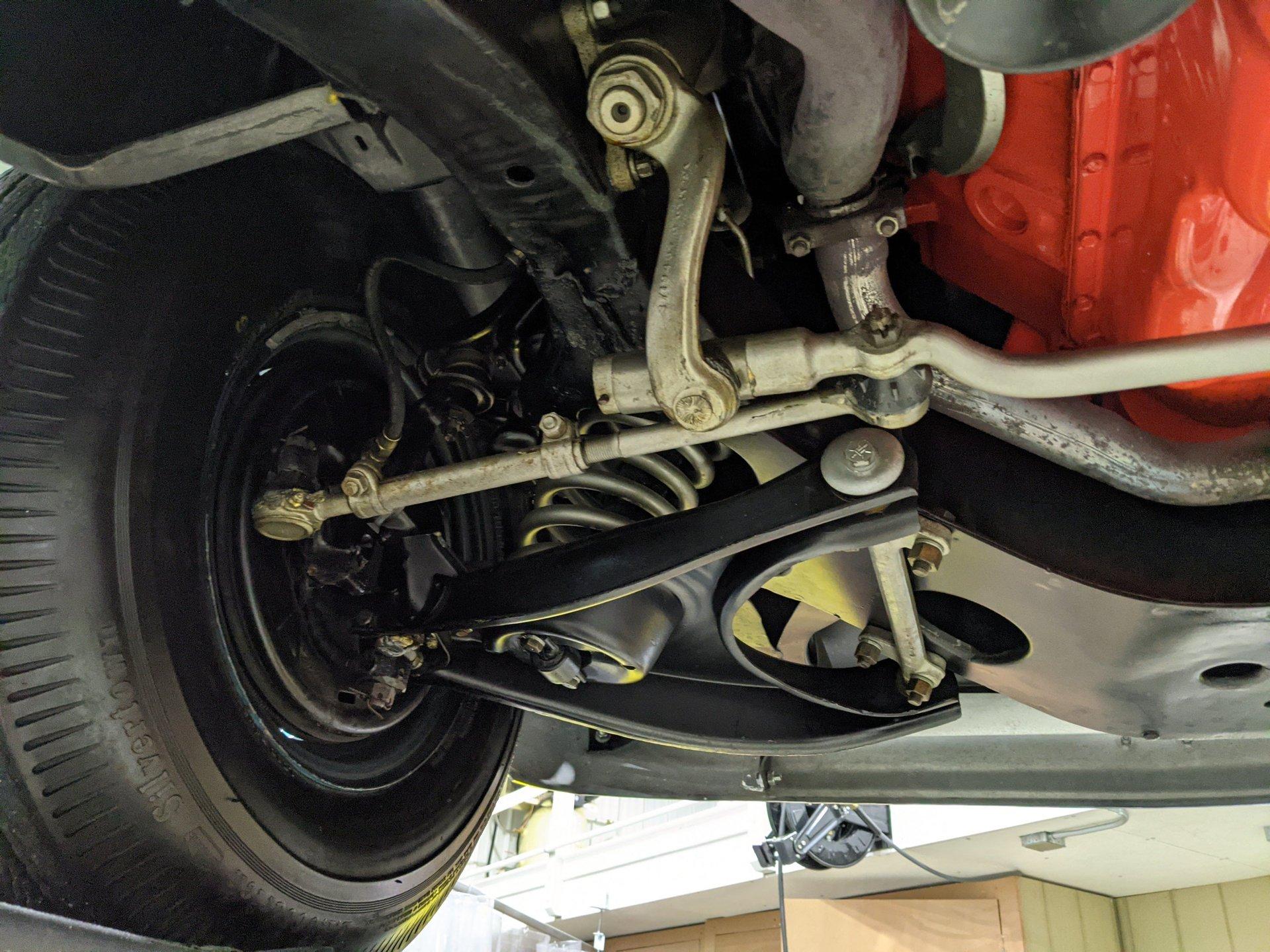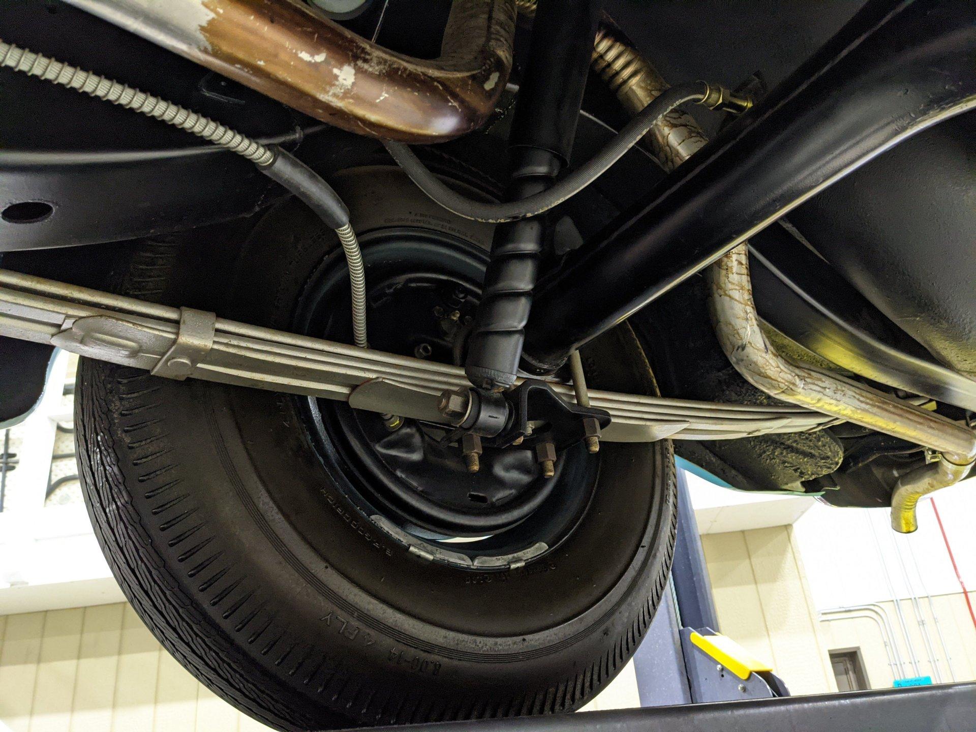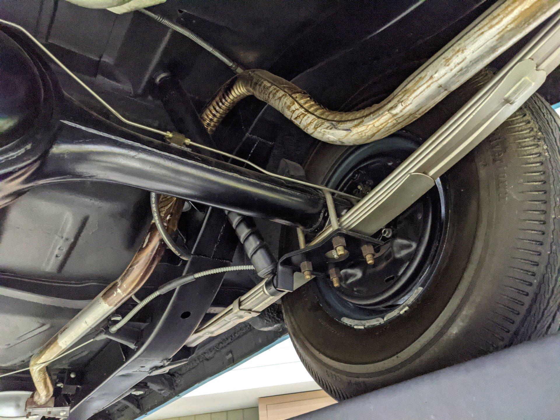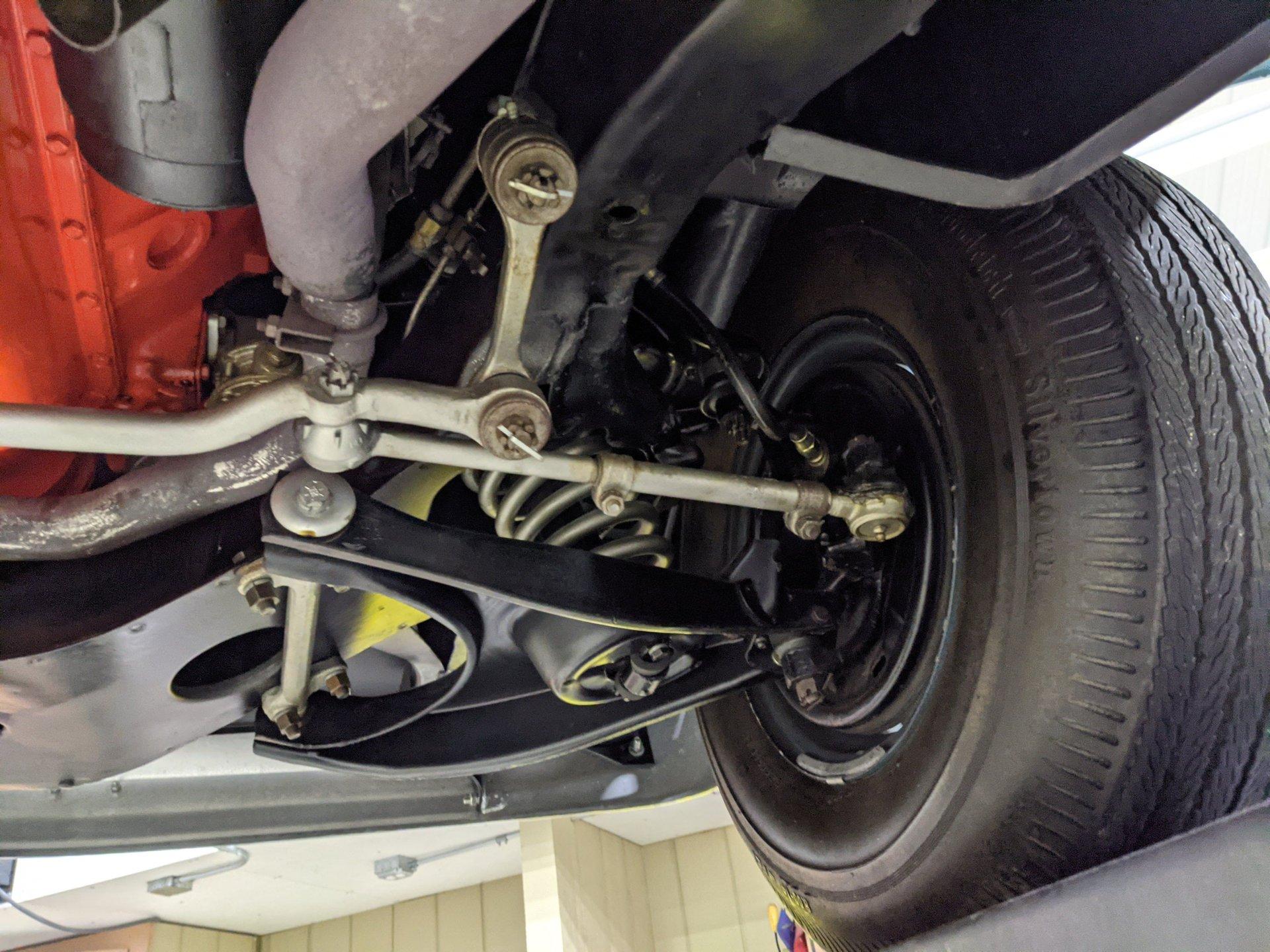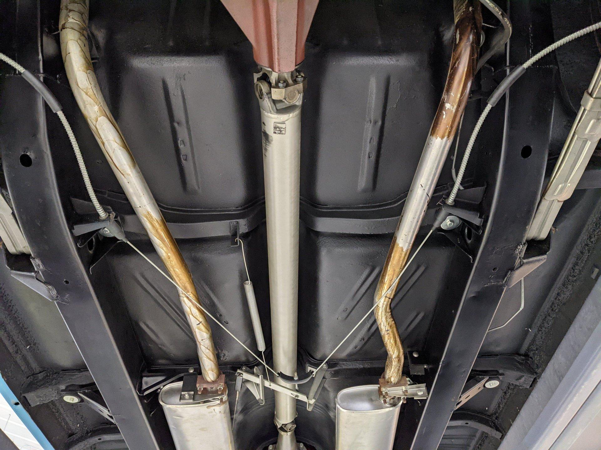 UNDERSIDE: Restored to new factory condition. Clean original rust free floors, rockers and braces painted smooth satin black. Every component was removed, rebuilt and detailed. The suspension and steering was all rebuilt. It has correct spiral shocks. Brakes were rebuilt, lines and e-brake assembly were replaced. The fuel system was replaced. Correct exhaust system was replaced. Looking up at the motor is looks new. Correct screw on oil canister, restored starter. Rebuilt close ratio manual 3-speed, correctly dated for this car. Restored 4.11 posi in back.