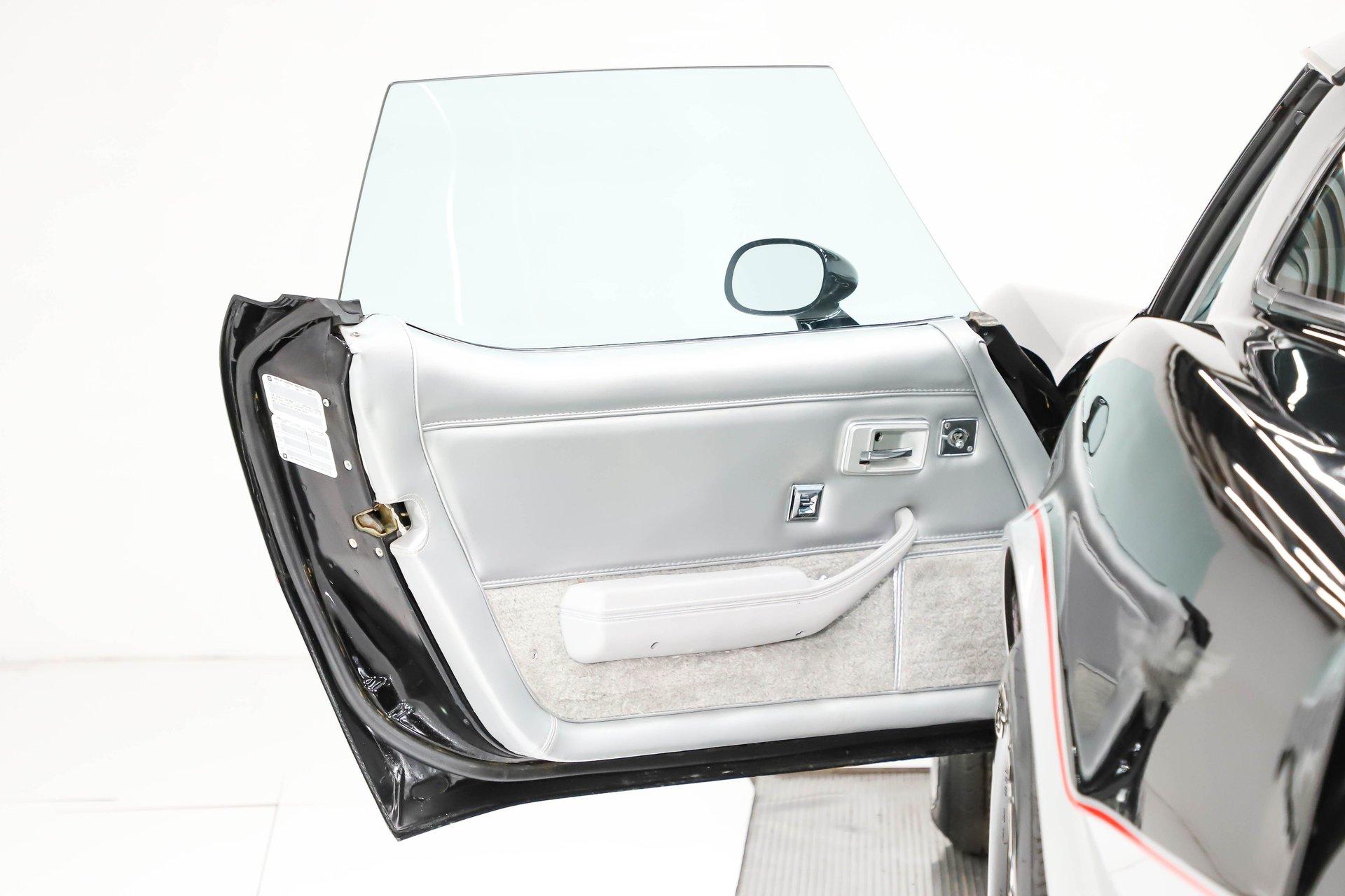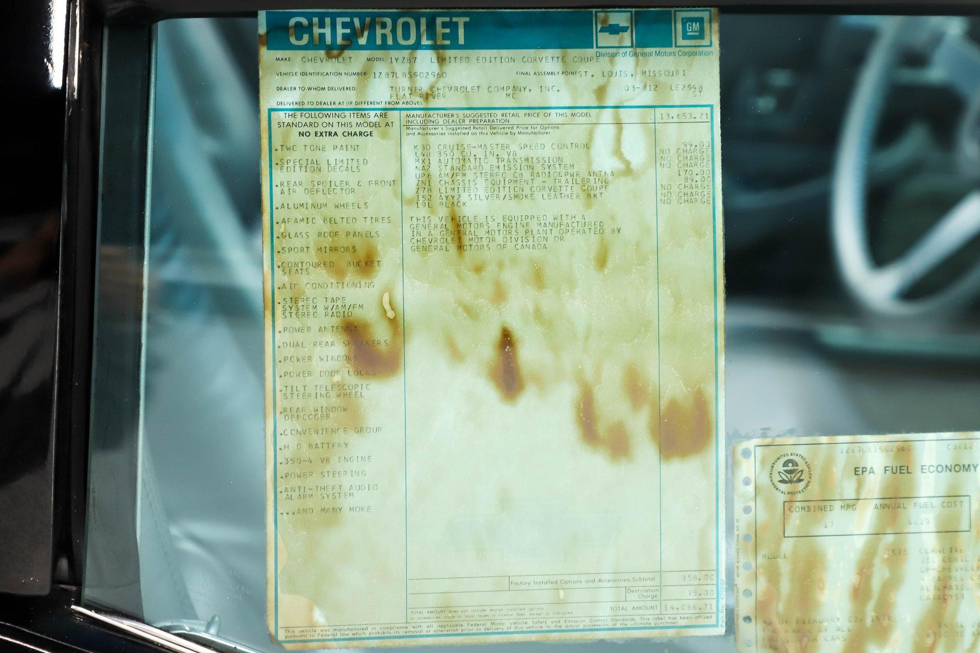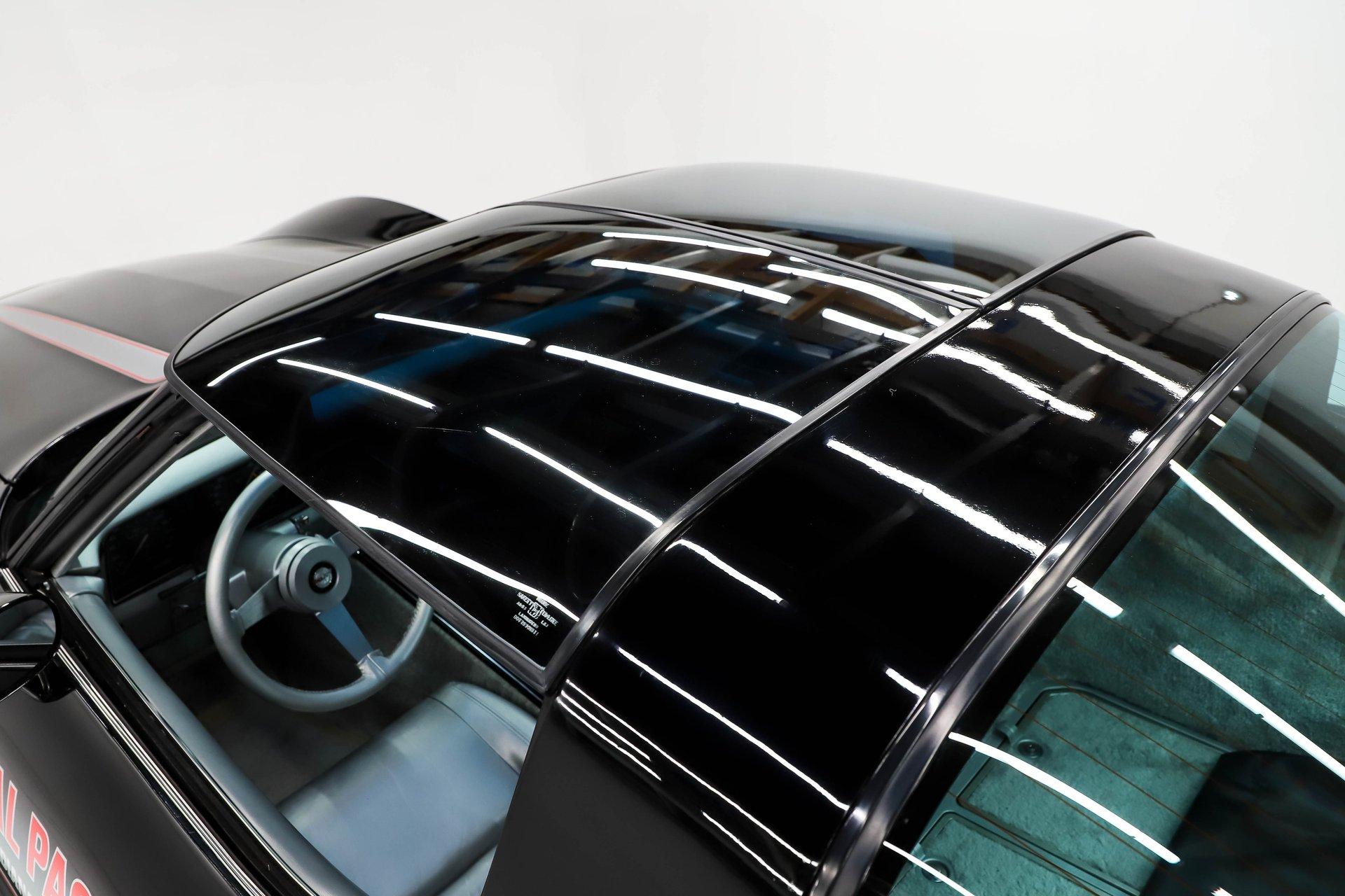 EXTERIOR: Really sharp colors, wheels and glass tops. All original condition, the original window sticker is still attached to the window!. No body damage at all, not even on the rubber bumpers. The original paint shows very well with some patina. It has the Pace Car decals on the doors. Weatherstrips are still soft. The mirrored tops are unique to the Pace Car and are mint. The aluminum wheels are still brightly polished.
