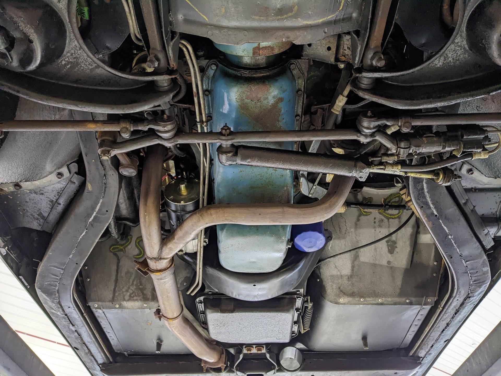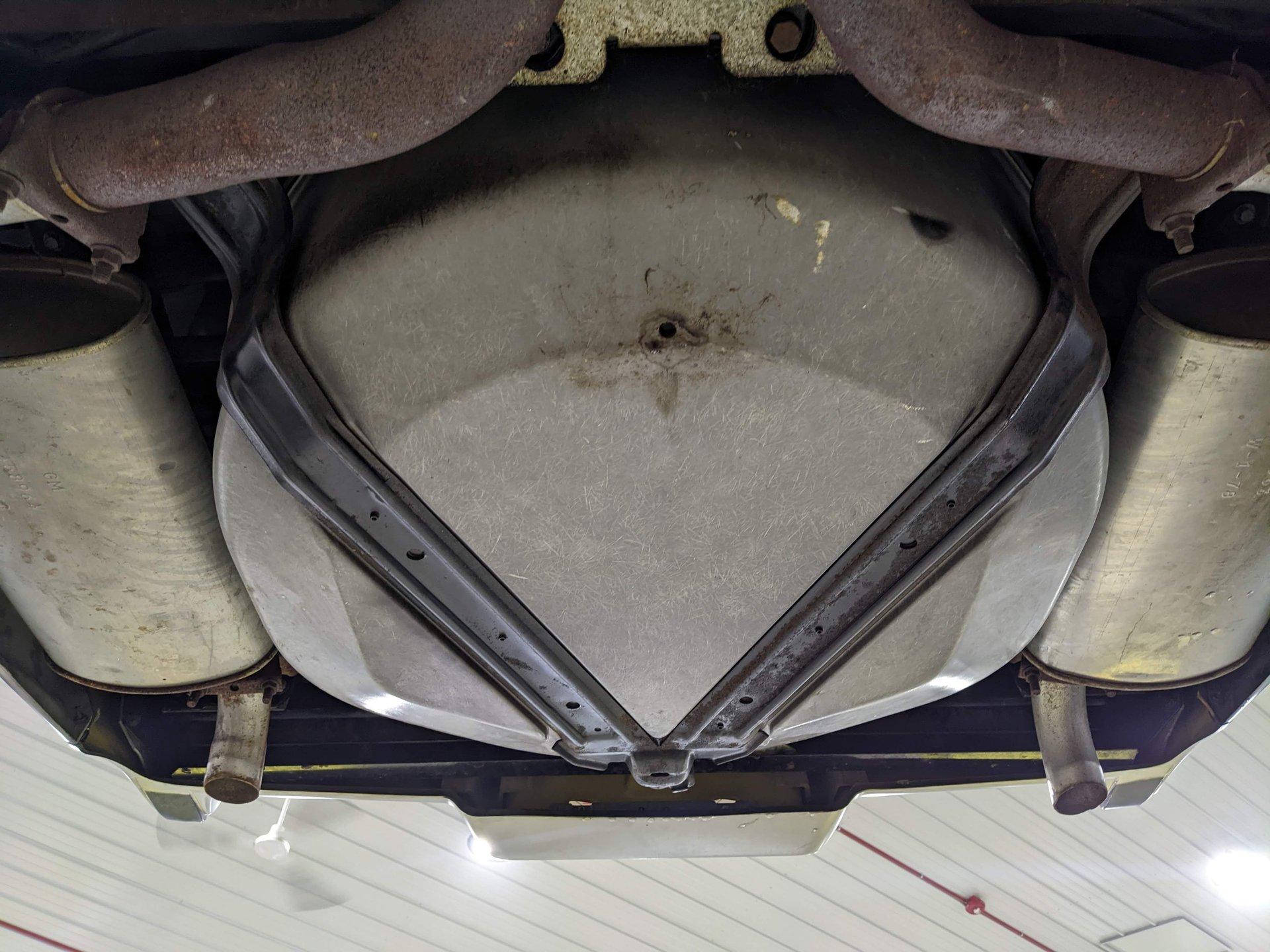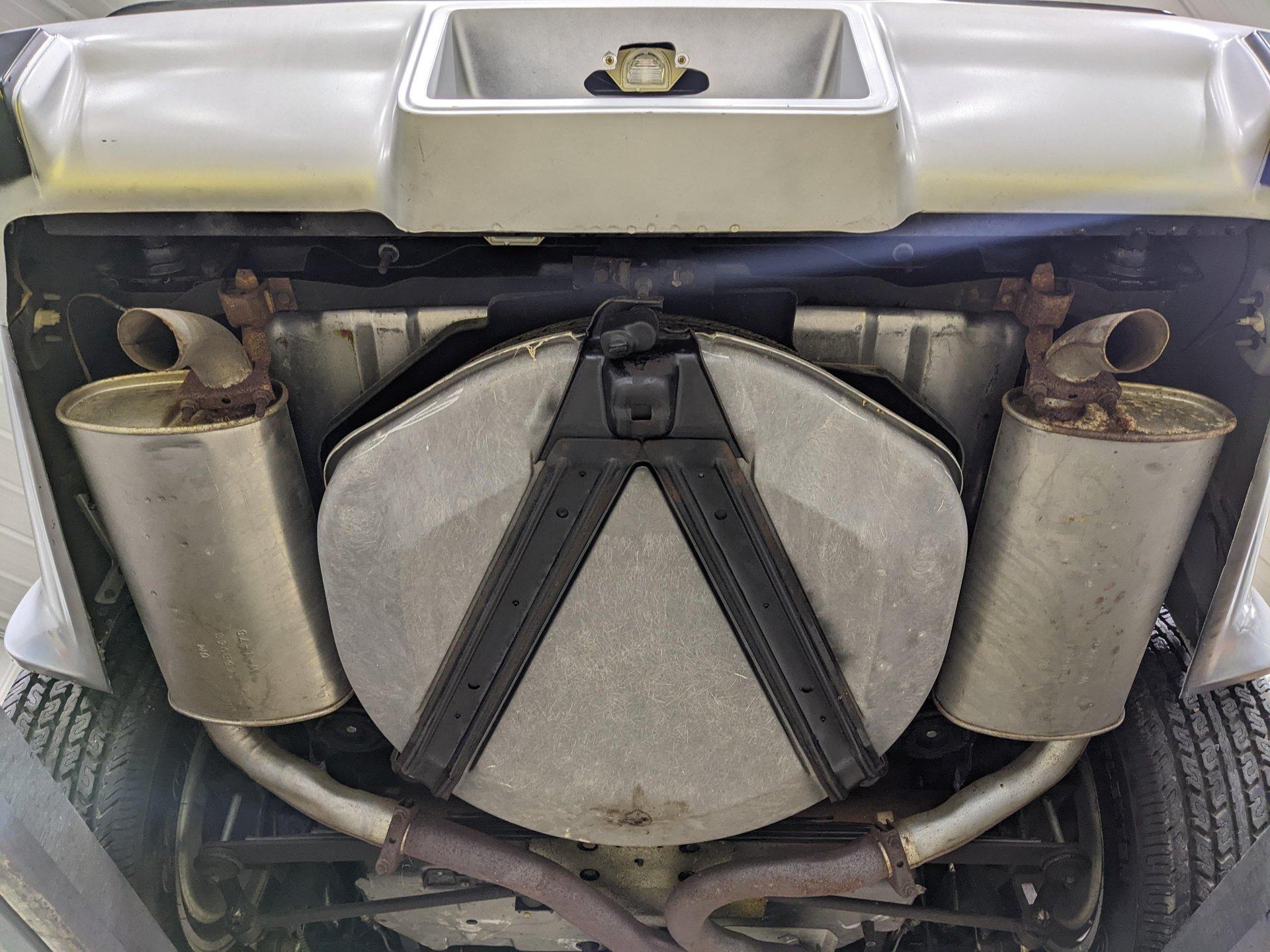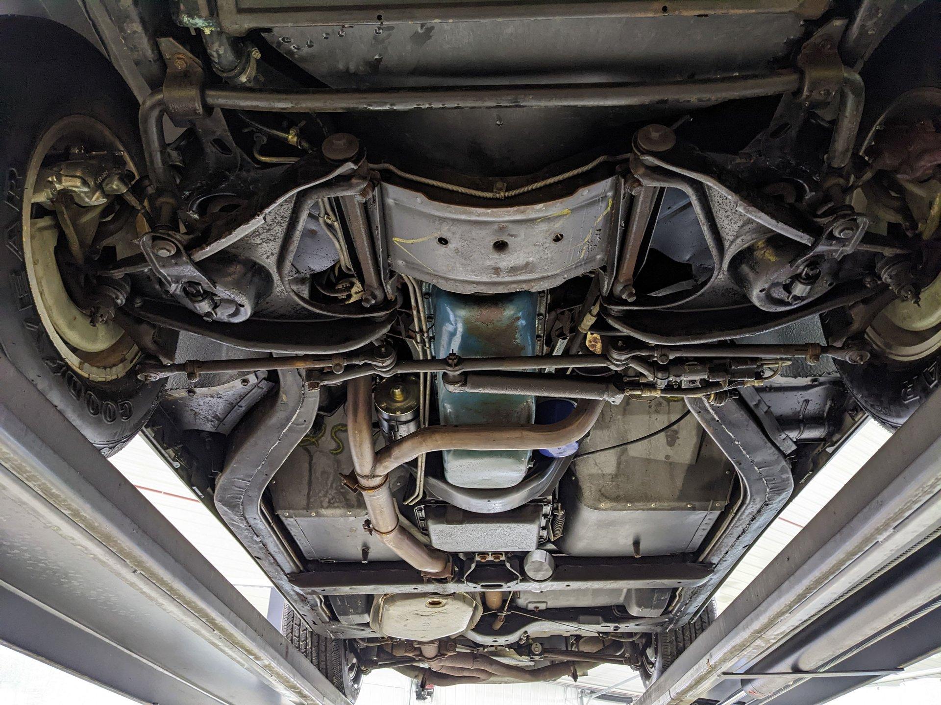 UNDERSIDE: Very well preserved all original condition. It still has assembly line markings. Never been spray canned over. Original shocks, exhaust, suspension etc. Spare tire carrier is complete.