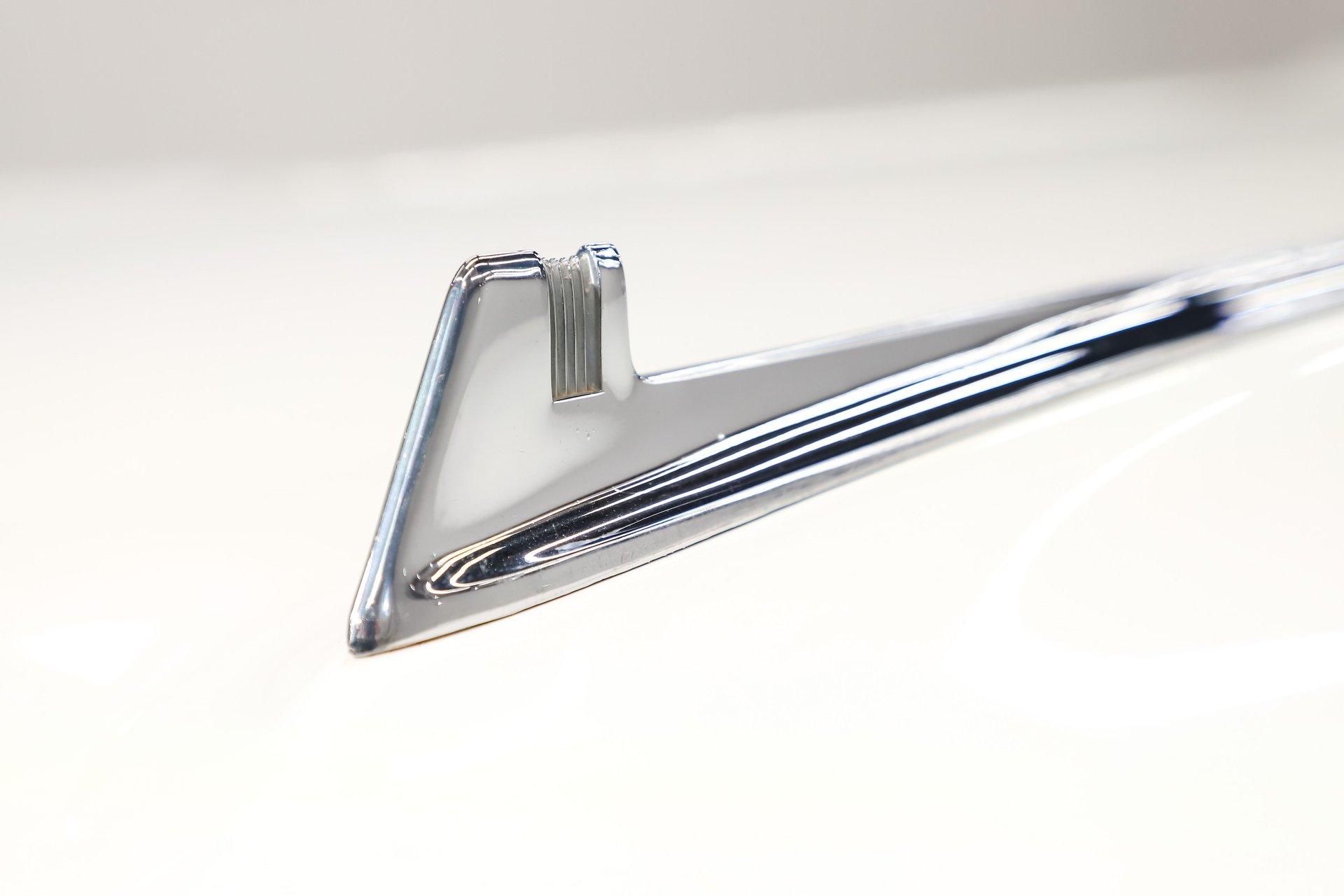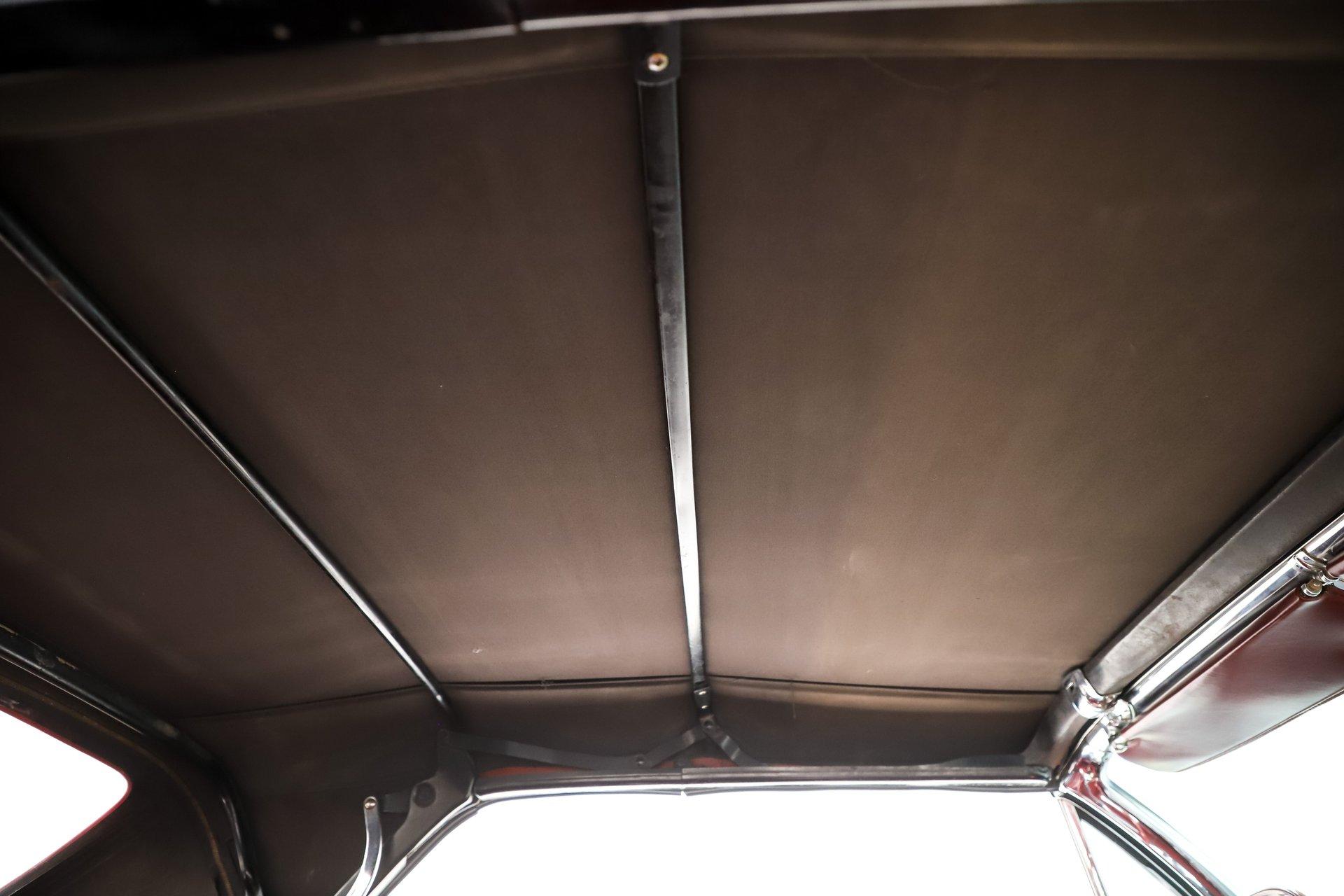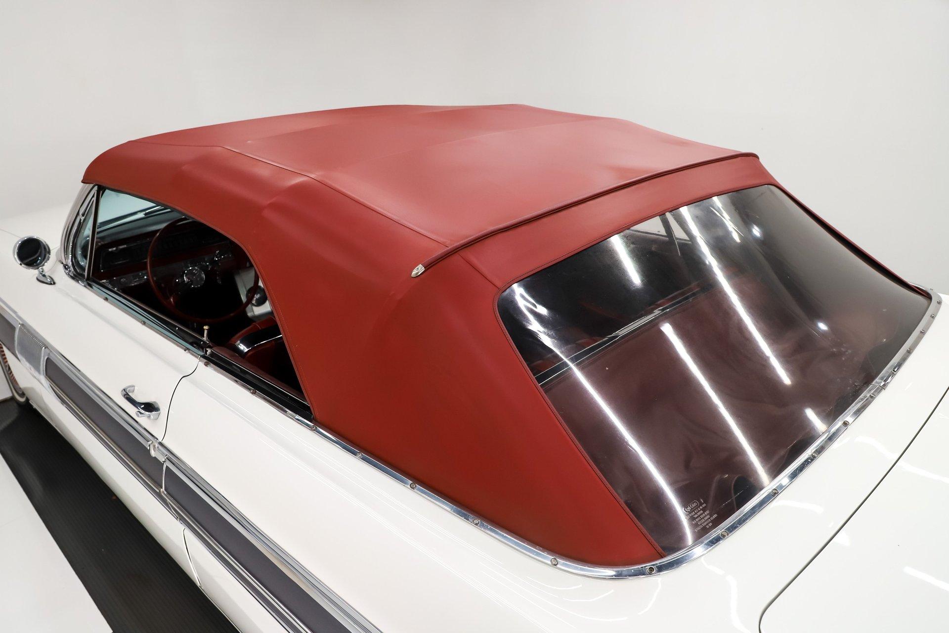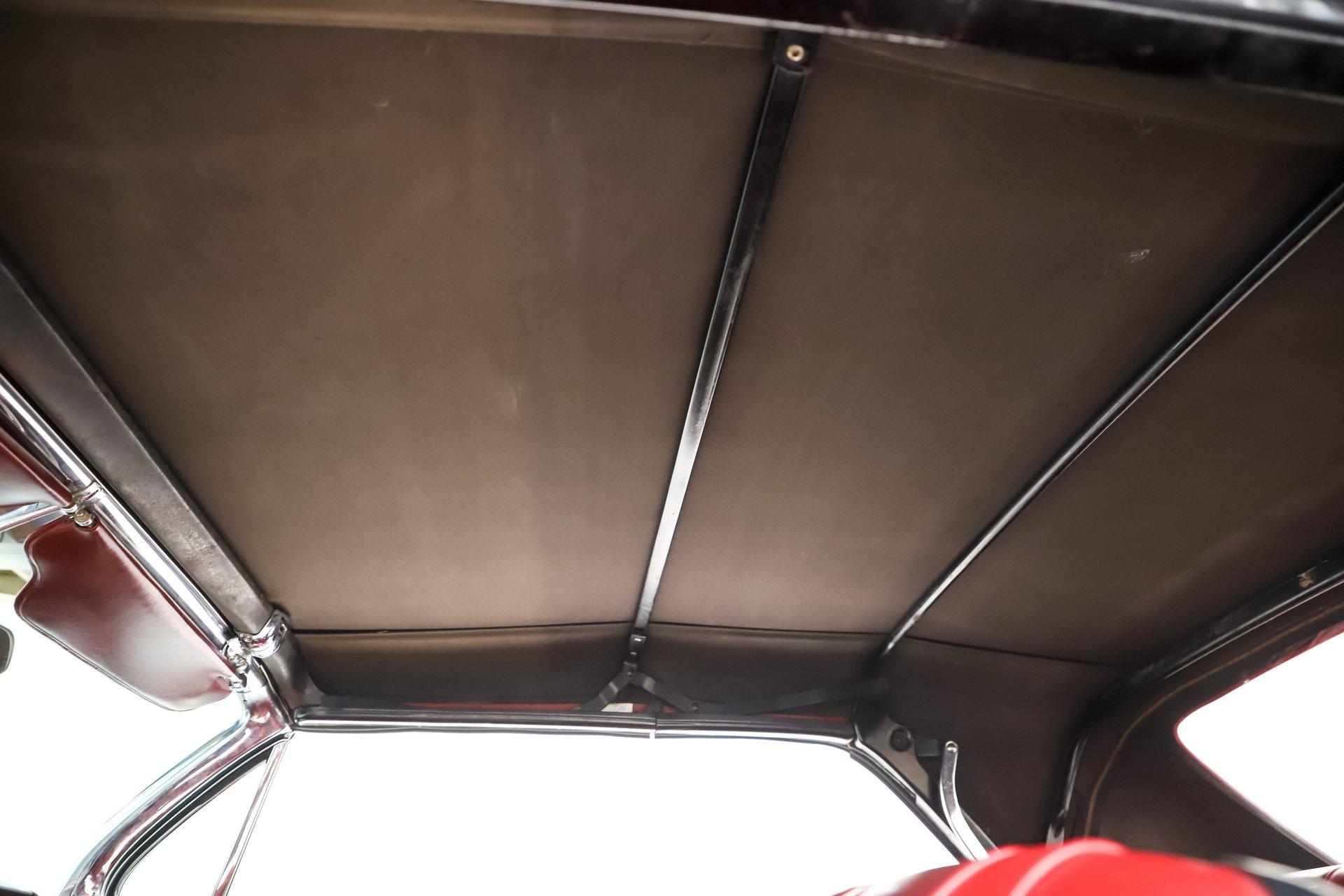 Overall, this is a great-looking car. I would be proud to take it to any cruise night or car show. The body appears very solid and straight with a good fit overall. The white metallic paint has a smooth, glossy finish. It is an older paint job, and if you look closely, you will find a few minor flaws. The chrome and trim appear to be original and present very nicely. The rear bumper does have a dent. It has its original glass, and the weatherstrips have been replaced. The dark red convertible top adds a sharp contrast and looks excellent on the car.