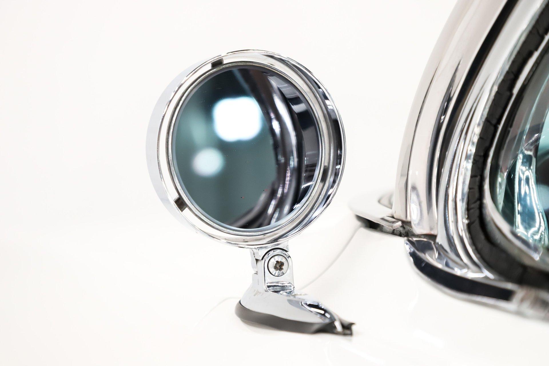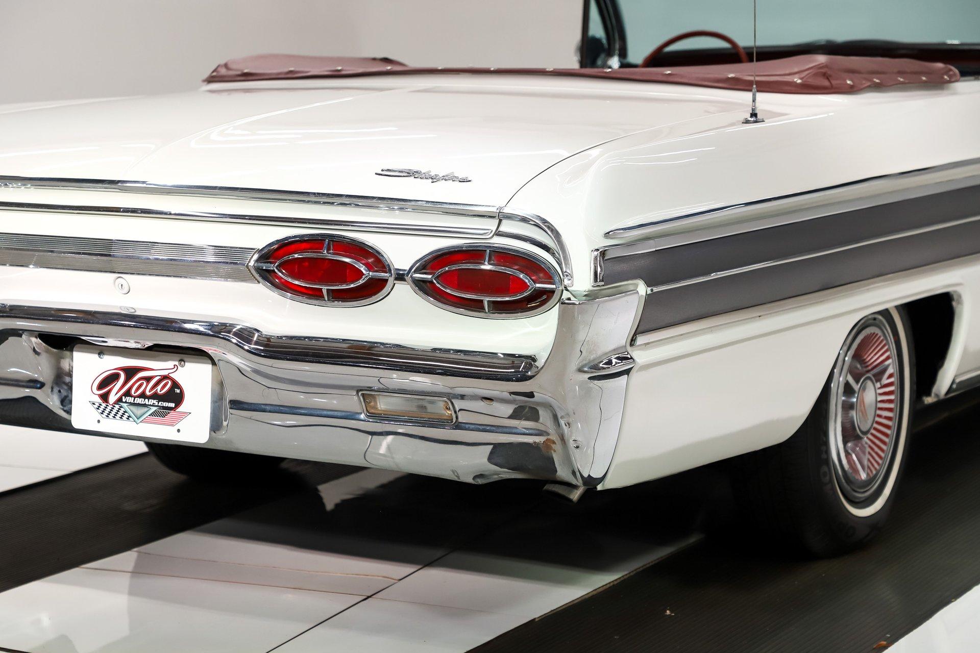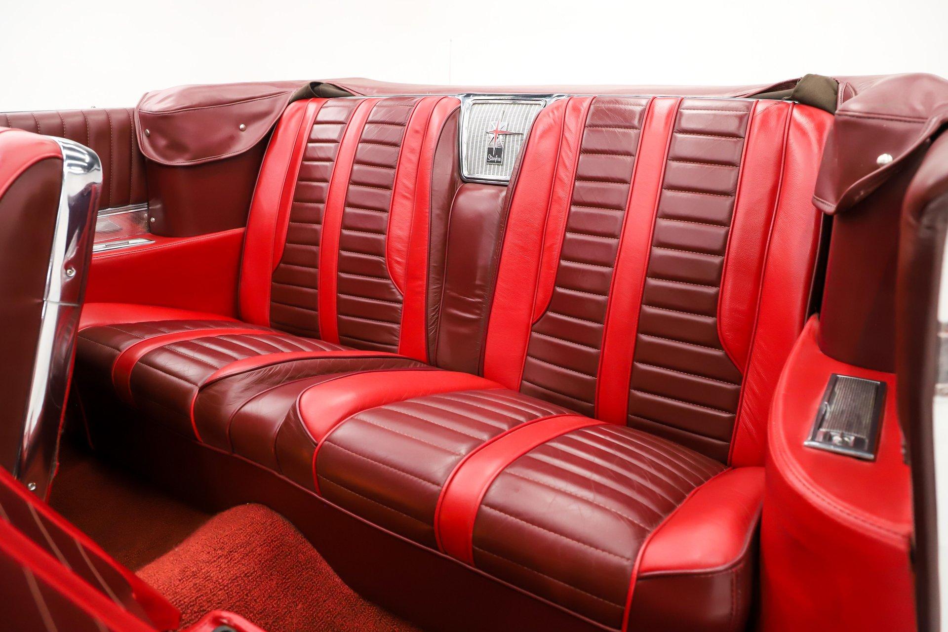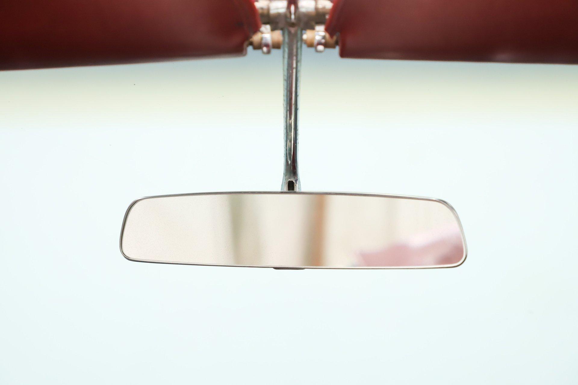 Overall, this is a great-looking car. I would be proud to take it to any cruise night or car show. The body appears very solid and straight with a good fit overall. The white metallic paint has a smooth, glossy finish. It is an older paint job, and if you look closely, you will find a few minor flaws. The chrome and trim appear to be original and present very nicely. The rear bumper does have a dent. It has its original glass, and the weatherstrips have been replaced. The dark red convertible top adds a sharp contrast and looks excellent on the car.
