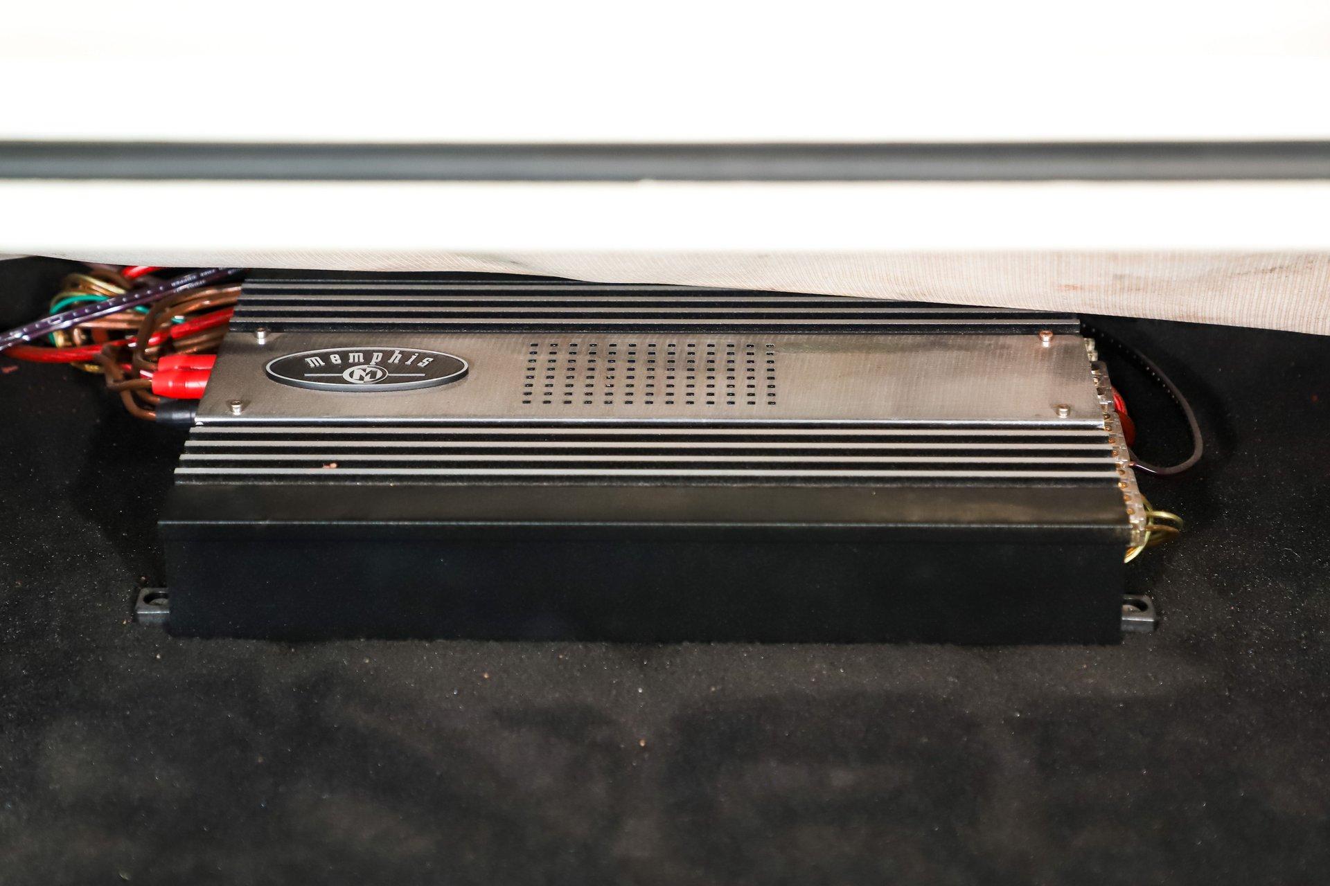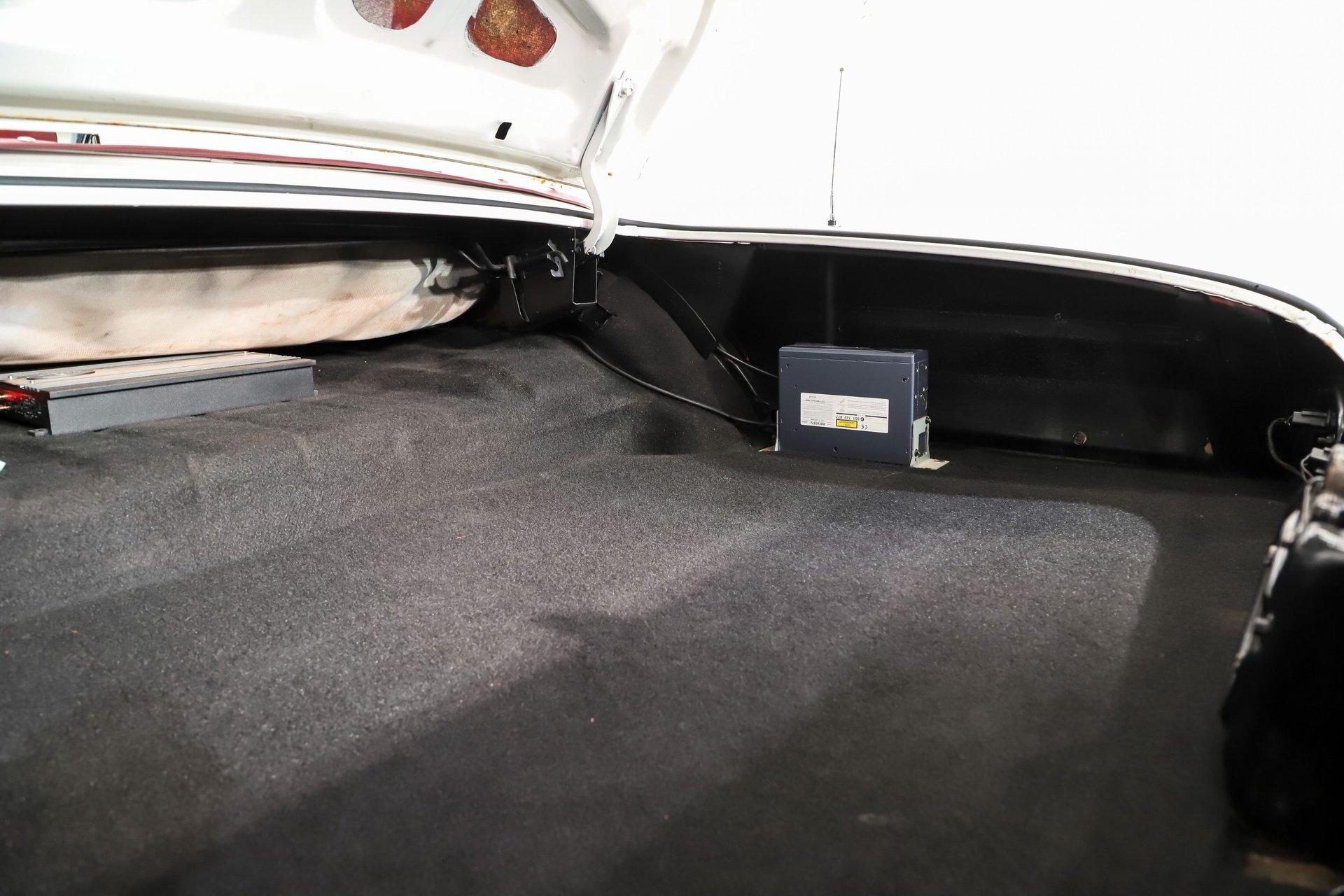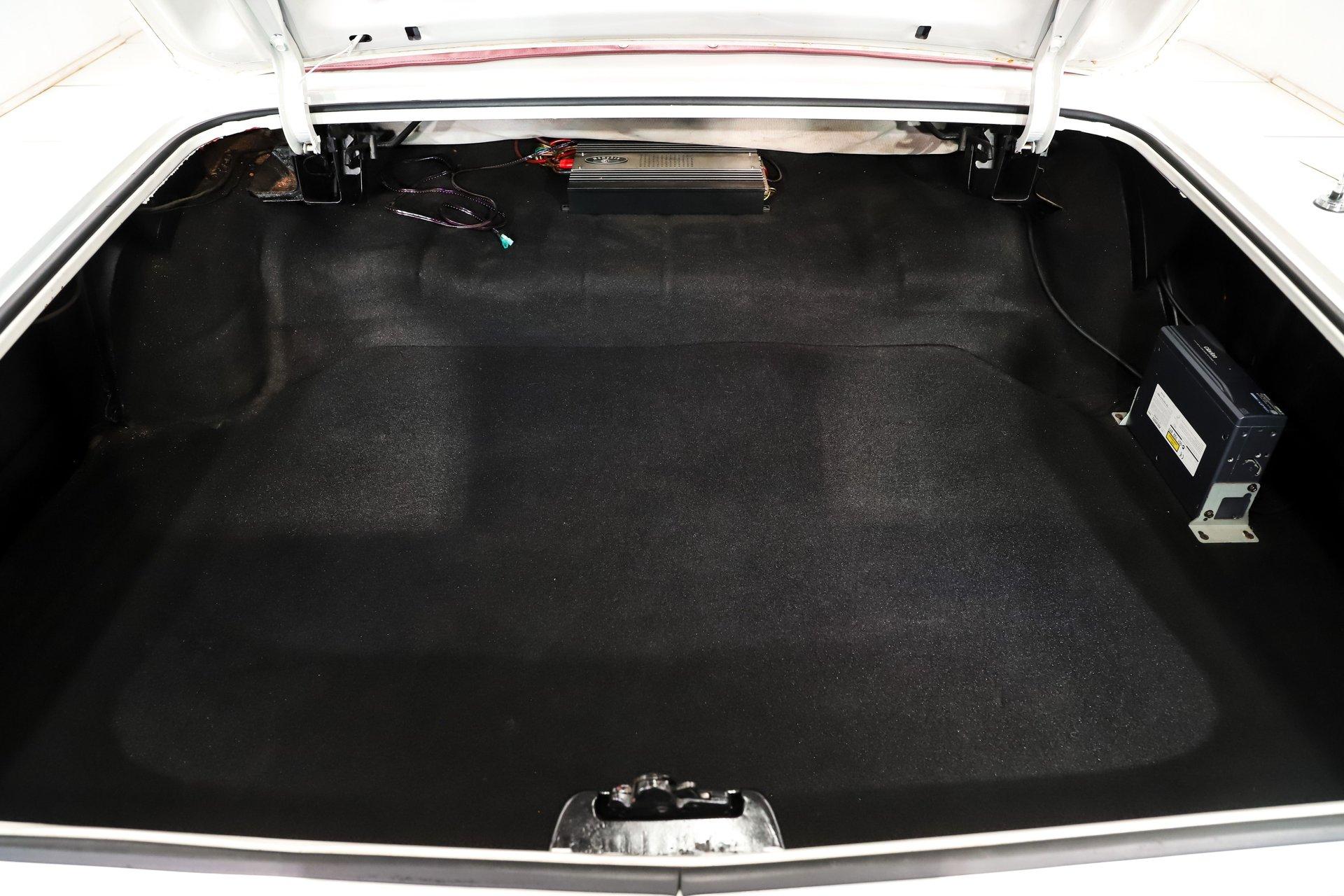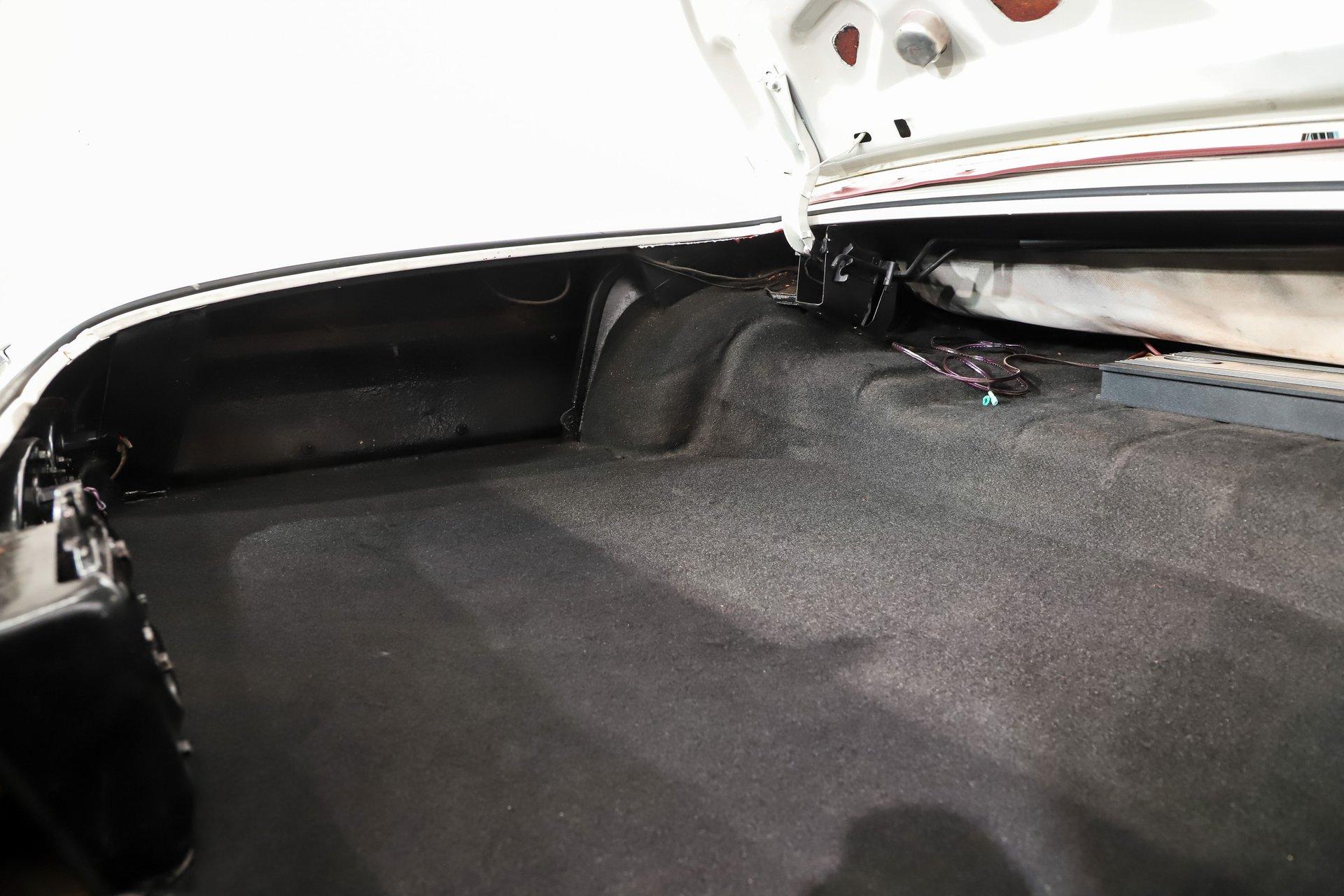 The trunk is huge! Under the trunk lid and in the jamb area it has been repainted. The compartment is lined in felt and features a custom floor panel. Underneath are the spare and jack. There is also a CD changer and amplifier installed.