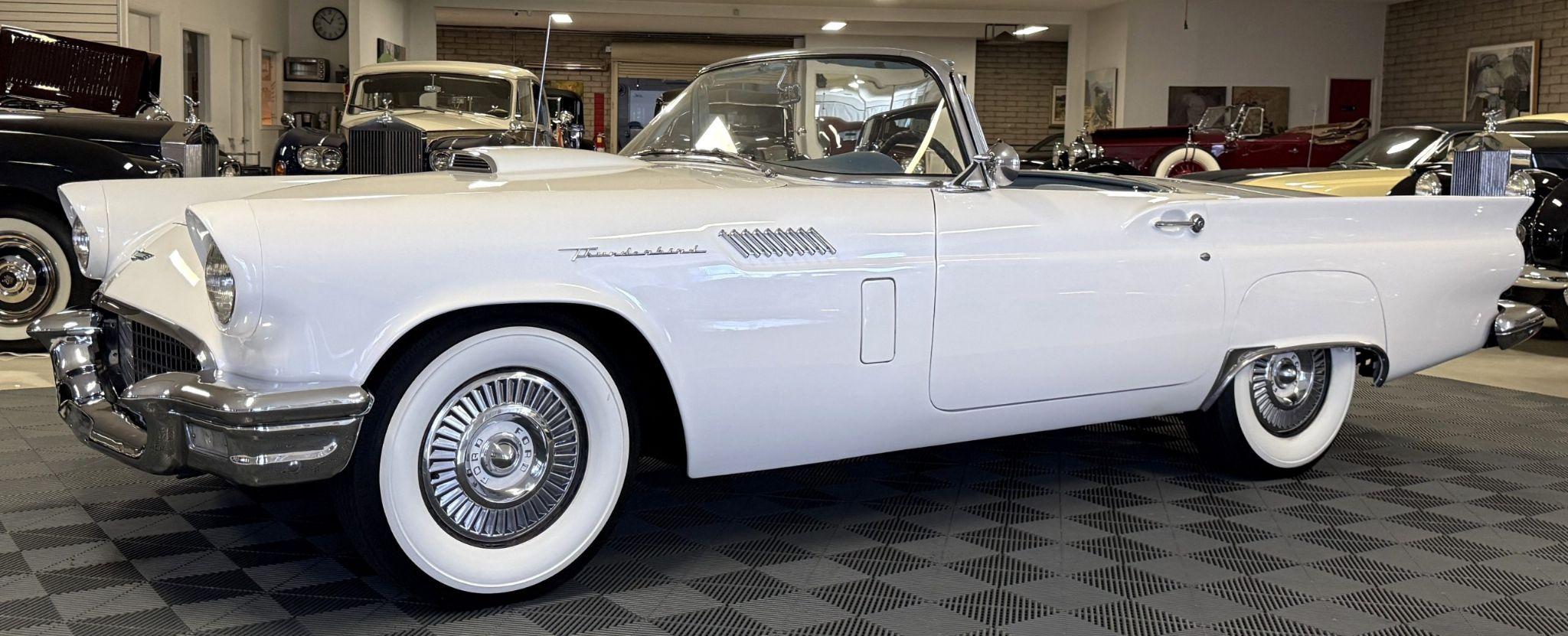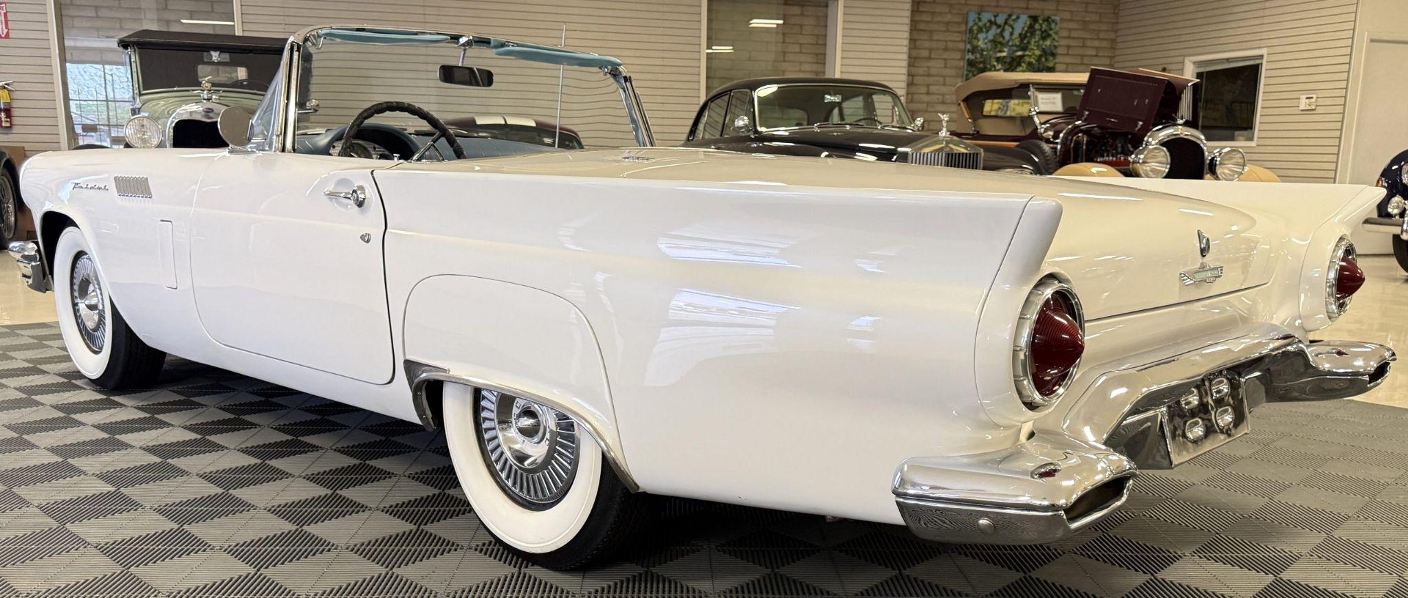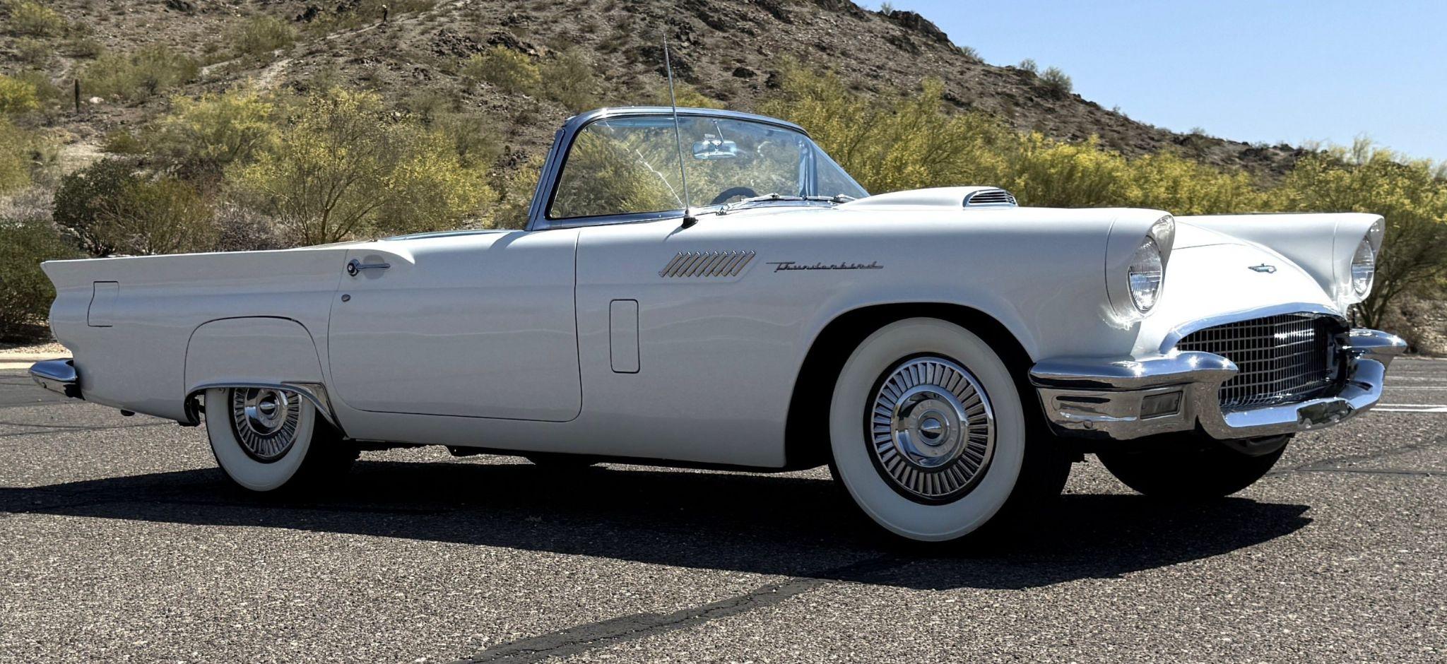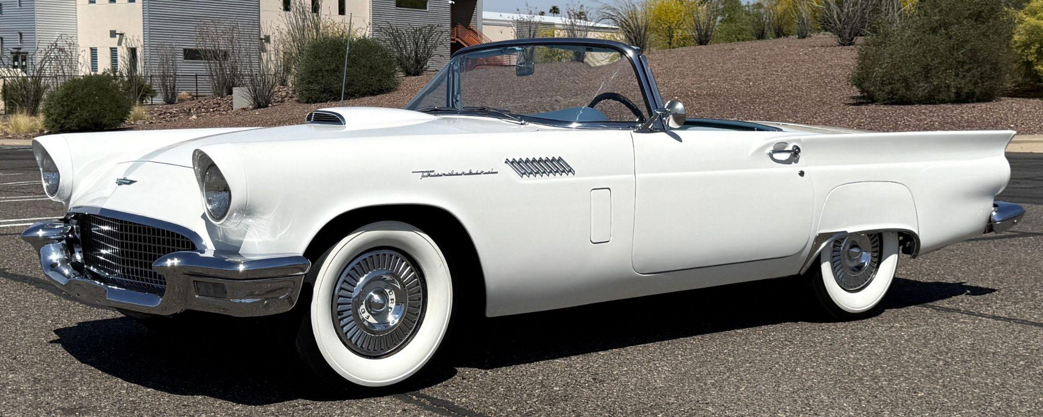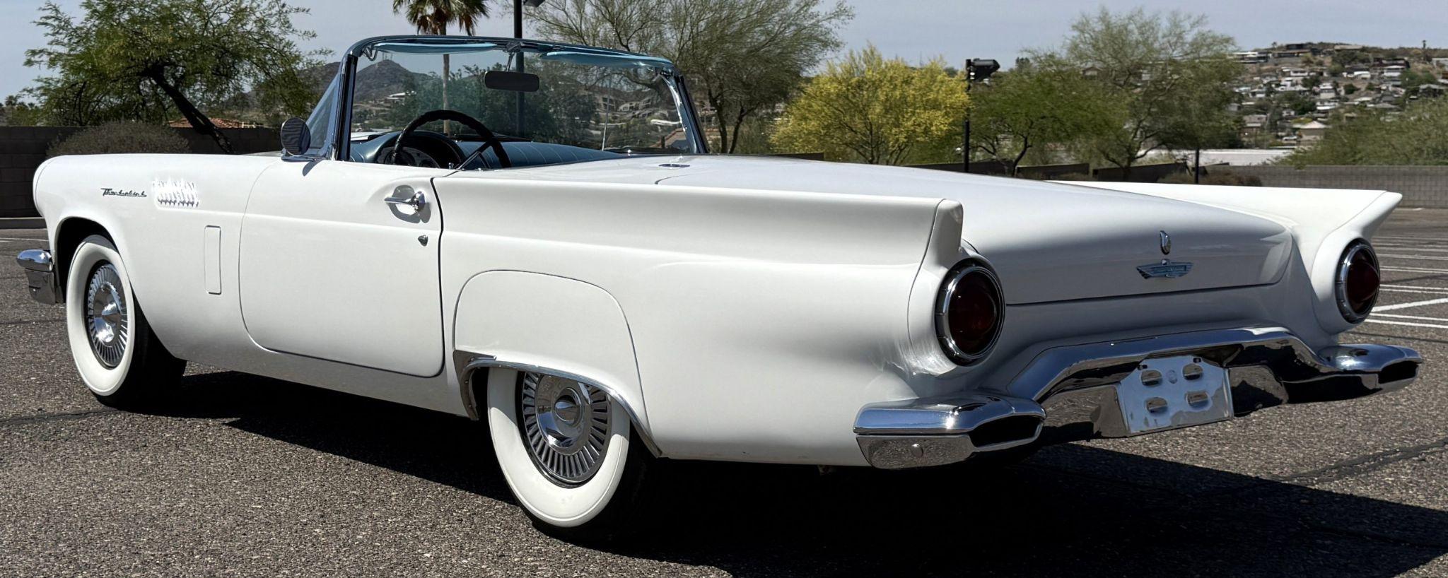 This 1957 Ford Thunderbird istheoriginalD code 312 V8 withtheoriginalthree-speedautomatictransmissionandis in overallgreat condition!The Thunderbird shows87,000 miles, has been an Arizona classic car for over 20yearsand the older restoration presents beautifully. The white exterior is overall excellentcondition,and the bluetwo-tonedinterior is in great overall condition. This Thunderbirdis a great driver and will be a blast to frequent car shows and enjoy weekend cruises. Built in Dearborn, Michigan, the 1957 Ford Thunderbird marked the end of the pure two-seat era before the model evolved into a four-place grand tourer.The Thunderbird waspurchasedin 2006 with84,000 milesand has beenstored in climate control while beingused for weekend enjoyment. Chesters Automative in Phoenixmaintainedthe Thunderbird during thattime period. This Thunderbird is striking in its presentation with white paint, beautiful chrome accents and white wall tires. Finished in Colonial White, the paint is in excellent condition overall with the only cosmetic imperfections showing some light yellowing behind the tailfins.The chrome bumpers, trim, rock guards and fender skirts are in great condition. The passenger fenderskirt has one area that looks to have chipped when the fender skirt was reinstalled and has since been touched up. Wide whitewall tires on 14inch Ford-logo steel wheels present beautifully but will need to be replaced for long driving durations. The Thunderbird has its matching white hard top that is in great condition! This Thunderbird is a bright, beautiful white example that is perfect for enjoying local shows, regional tours or just to enjoy taking out to dinner. The blue toned interior of this Thunderbird complements the white exterior and is in overallgreat condition! The interior features Dresden vinyl andStarmistvinyl upholstery, which presents in overallgreat conditionwith no major wear areas noted. The dashboard vinyl is in excellent condition, and the brushed metal interior trim is in good condition with some visible aging consistent with use. The original steering wheel has been wrapped, and the blue carpet is in overallgreat condition.Instrumentation includes a 140-mph speedometer,tachometer, clock, and auxiliary gauges.Dual cowl vents,a functional heater, and AM radio.The lens for the dashboard map light will be replaced once it arrives from being backordered. The interior is well sorted and ingreat conditionto be enjoyed! Under the hood, the Ford Thunderbird is powered by theD code312 CID V8 with a four-barrel carburetor, producing approximately 245 horsepower and delivering smoothyet powerfulperformance. Power is sent through a three-speed Ford-O-Matic automatic transmission. This Thunderbird hasits original rear differential,power steering, independent suspension, and four-wheel hydraulic drum brakes.The Thunderbird has been serviced in 2026, power steering hoses replaced and brake fully rebuilt. Included withthe Thunderbird is itsmatching hardtop, red vinyl tonneau cover, and spare tire. For more information and details, please call or text Kendi Brown at 1.623.404.9042 or email us at sales@classicpromenade.com . This 1957 Ford Thunderbird is available for inspection at our showroom in Phoenix. We are pleased to offer FaceTime or WhatsApp live video inspections, and we help coordinate shipping worldwide. We also have financing partners if you are interested in financing.