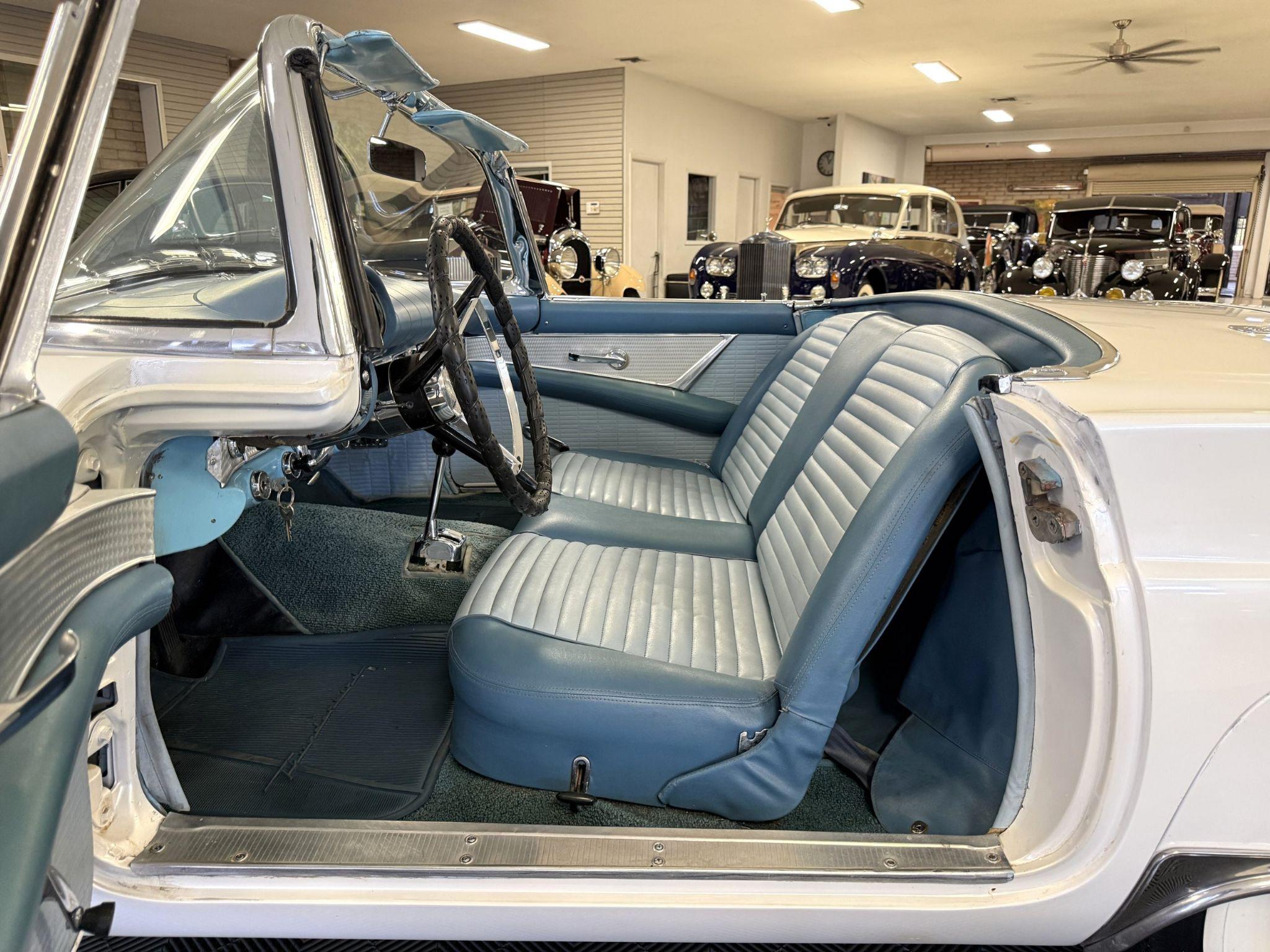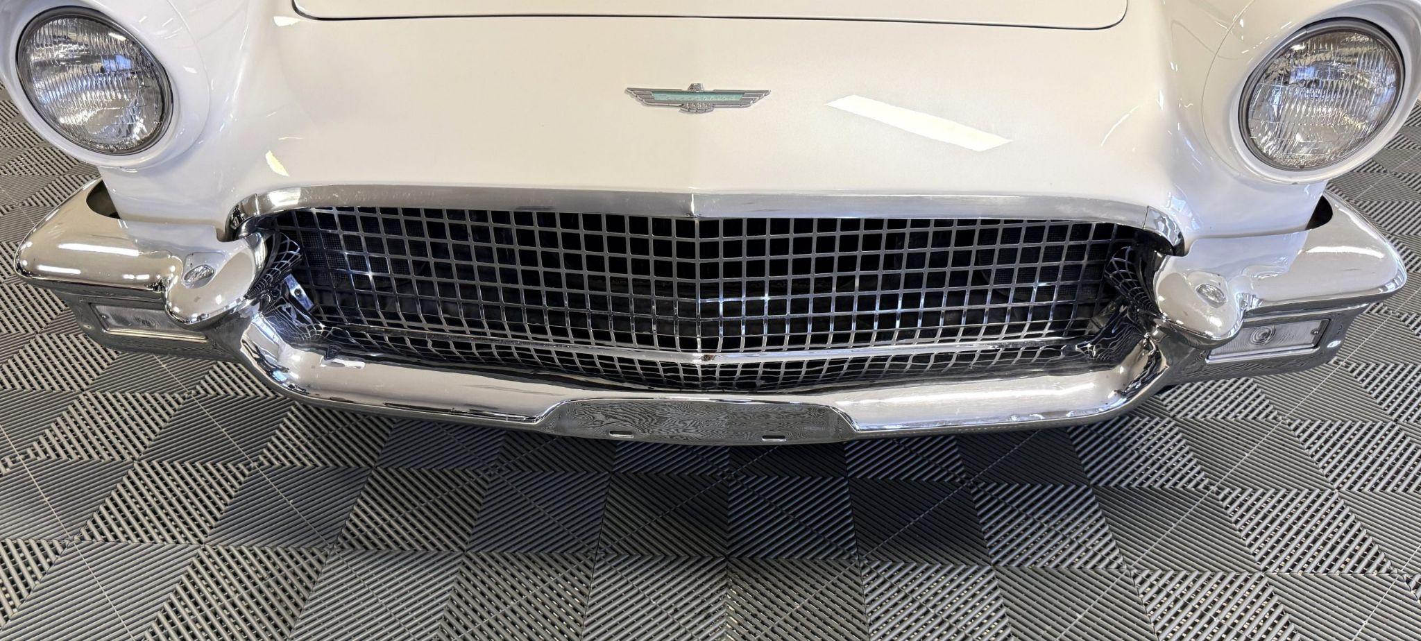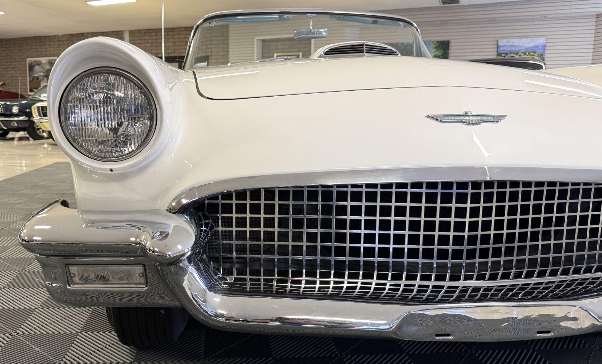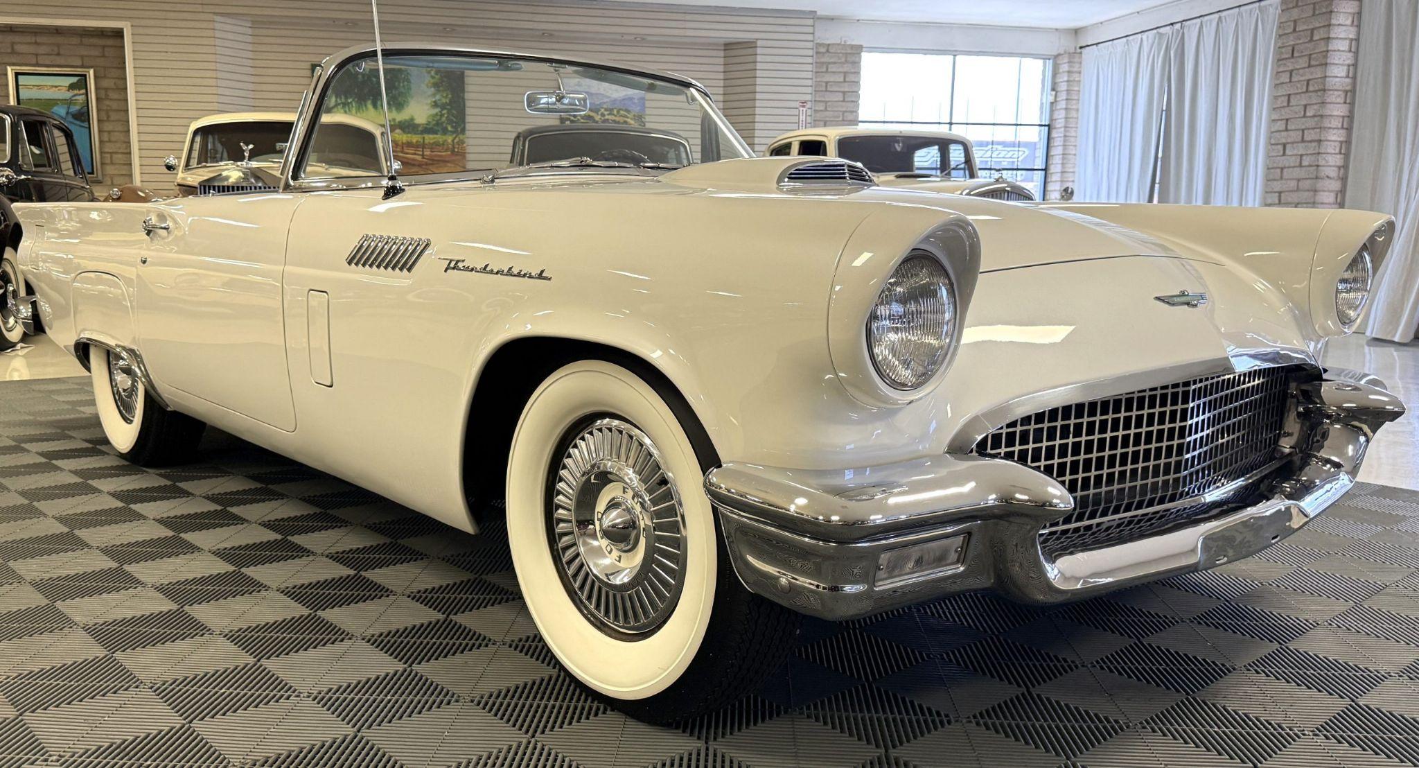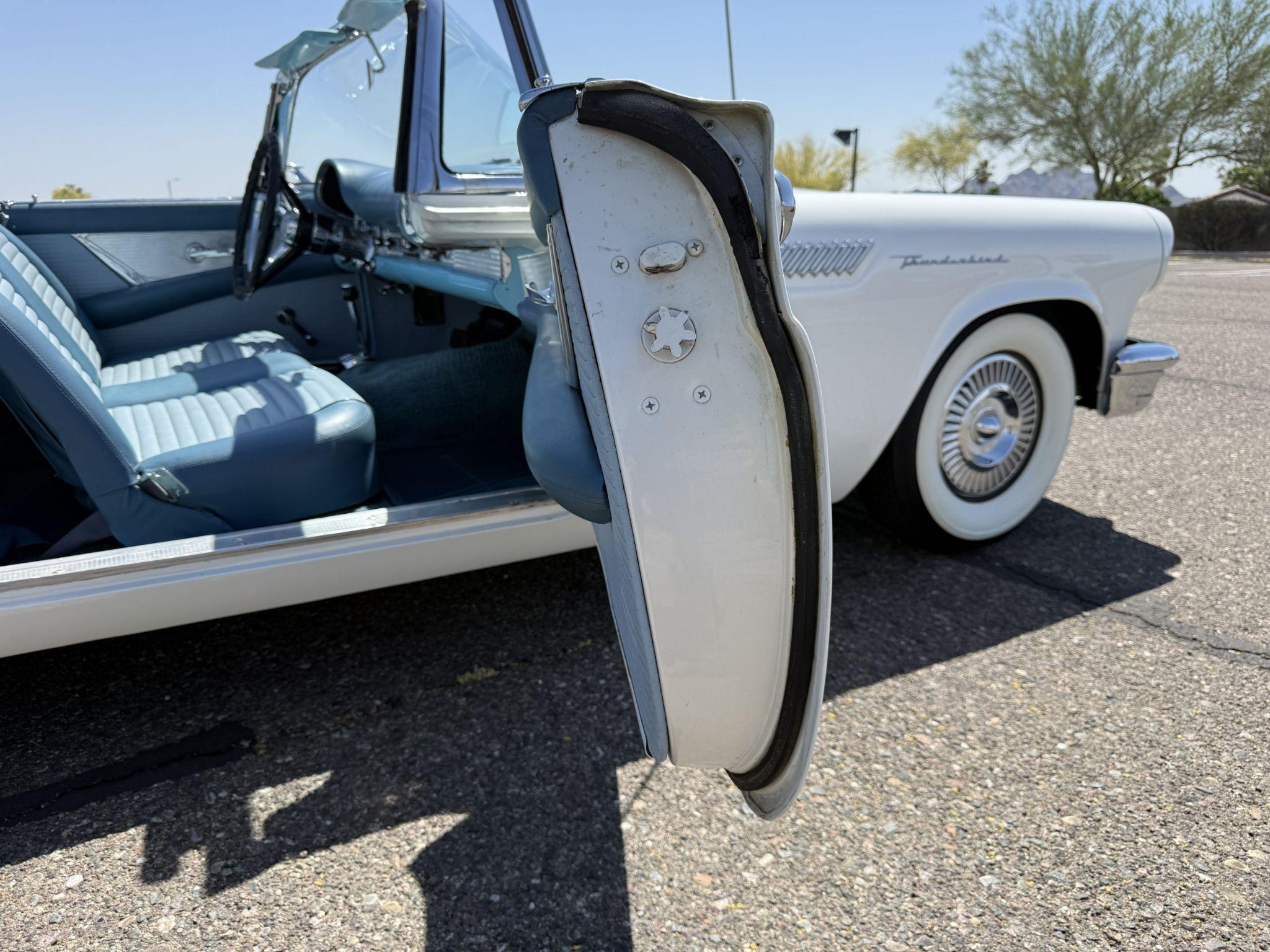 This 1957 Ford Thunderbird istheoriginalD code 312 V8 withtheoriginalthree-speedautomatictransmissionandis in overallgreat condition!The Thunderbird shows87,000 miles, has been an Arizona classic car for over 20yearsand the older restoration presents beautifully. The white exterior is overall excellentcondition,and the bluetwo-tonedinterior is in great overall condition. This Thunderbirdis a great driver and will be a blast to frequent car shows and enjoy weekend cruises. Built in Dearborn, Michigan, the 1957 Ford Thunderbird marked the end of the pure two-seat era before the model evolved into a four-place grand tourer.The Thunderbird waspurchasedin 2006 with84,000 milesand has beenstored in climate control while beingused for weekend enjoyment. Chesters Automative in Phoenixmaintainedthe Thunderbird during thattime period. This Thunderbird is striking in its presentation with white paint, beautiful chrome accents and white wall tires. Finished in Colonial White, the paint is in excellent condition overall with the only cosmetic imperfections showing some light yellowing behind the tailfins.The chrome bumpers, trim, rock guards and fender skirts are in great condition. The passenger fenderskirt has one area that looks to have chipped when the fender skirt was reinstalled and has since been touched up. Wide whitewall tires on 14inch Ford-logo steel wheels present beautifully but will need to be replaced for long driving durations. The Thunderbird has its matching white hard top that is in great condition! This Thunderbird is a bright, beautiful white example that is perfect for enjoying local shows, regional tours or just to enjoy taking out to dinner. The blue toned interior of this Thunderbird complements the white exterior and is in overallgreat condition! The interior features Dresden vinyl andStarmistvinyl upholstery, which presents in overallgreat conditionwith no major wear areas noted. The dashboard vinyl is in excellent condition, and the brushed metal interior trim is in good condition with some visible aging consistent with use. The original steering wheel has been wrapped, and the blue carpet is in overallgreat condition.Instrumentation includes a 140-mph speedometer,tachometer, clock, and auxiliary gauges.Dual cowl vents,a functional heater, and AM radio.The lens for the dashboard map light will be replaced once it arrives from being backordered. The interior is well sorted and ingreat conditionto be enjoyed! Under the hood, the Ford Thunderbird is powered by theD code312 CID V8 with a four-barrel carburetor, producing approximately 245 horsepower and delivering smoothyet powerfulperformance. Power is sent through a three-speed Ford-O-Matic automatic transmission. This Thunderbird hasits original rear differential,power steering, independent suspension, and four-wheel hydraulic drum brakes.The Thunderbird has been serviced in 2026, power steering hoses replaced and brake fully rebuilt. Included withthe Thunderbird is itsmatching hardtop, red vinyl tonneau cover, and spare tire. For more information and details, please call or text Kendi Brown at 1.623.404.9042 or email us at sales@classicpromenade.com . This 1957 Ford Thunderbird is available for inspection at our showroom in Phoenix. We are pleased to offer FaceTime or WhatsApp live video inspections, and we help coordinate shipping worldwide. We also have financing partners if you are interested in financing.