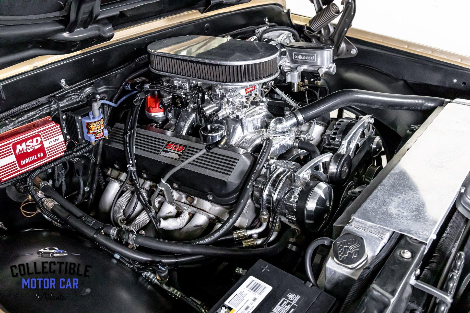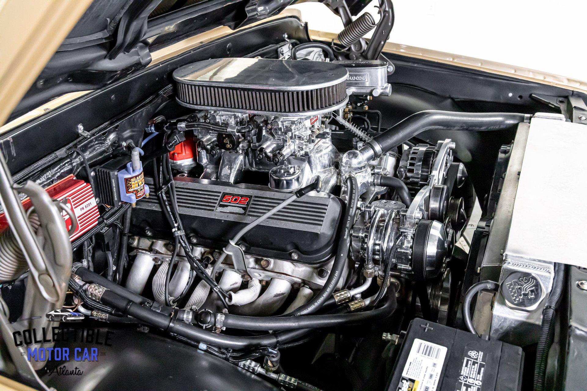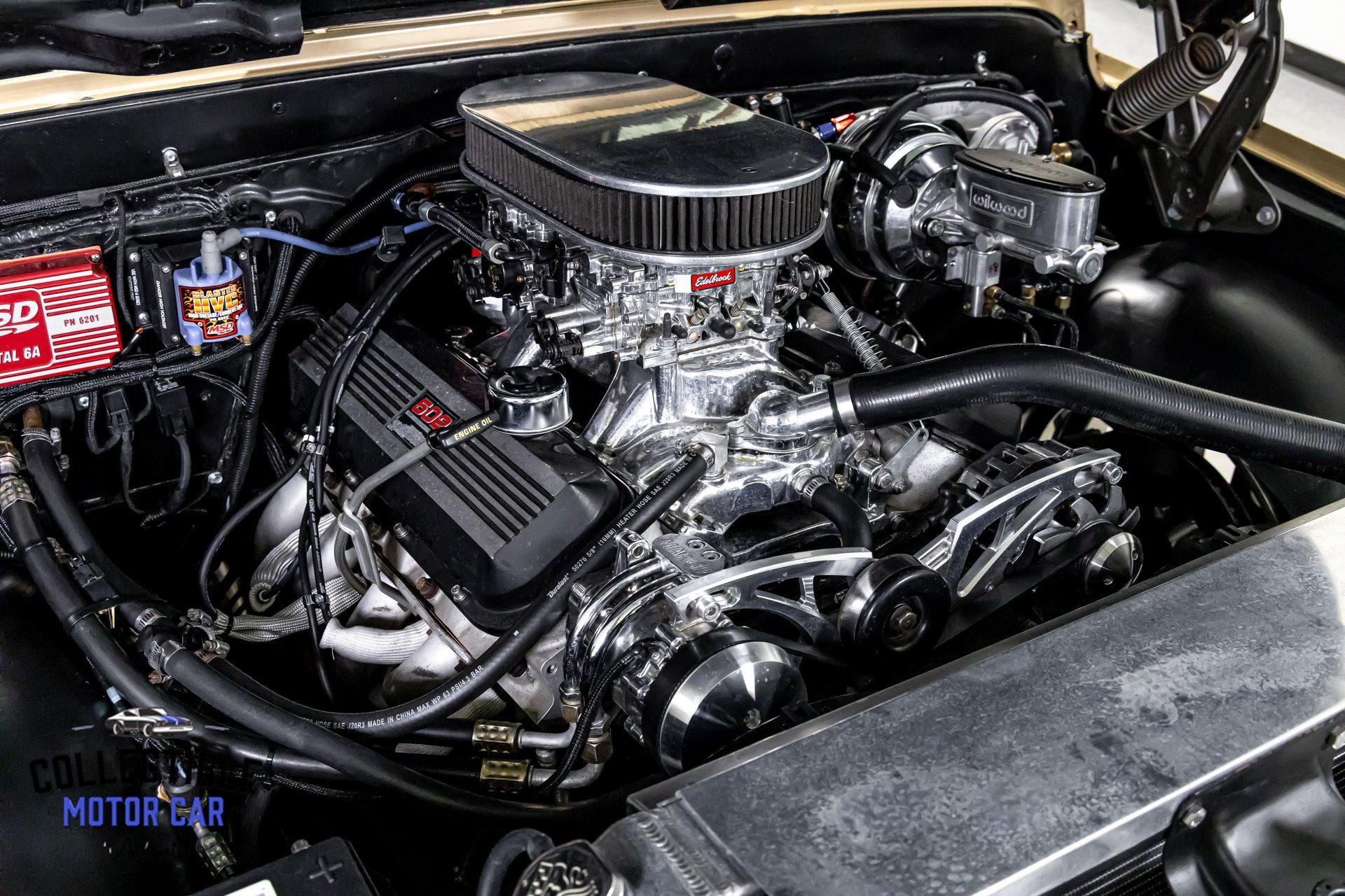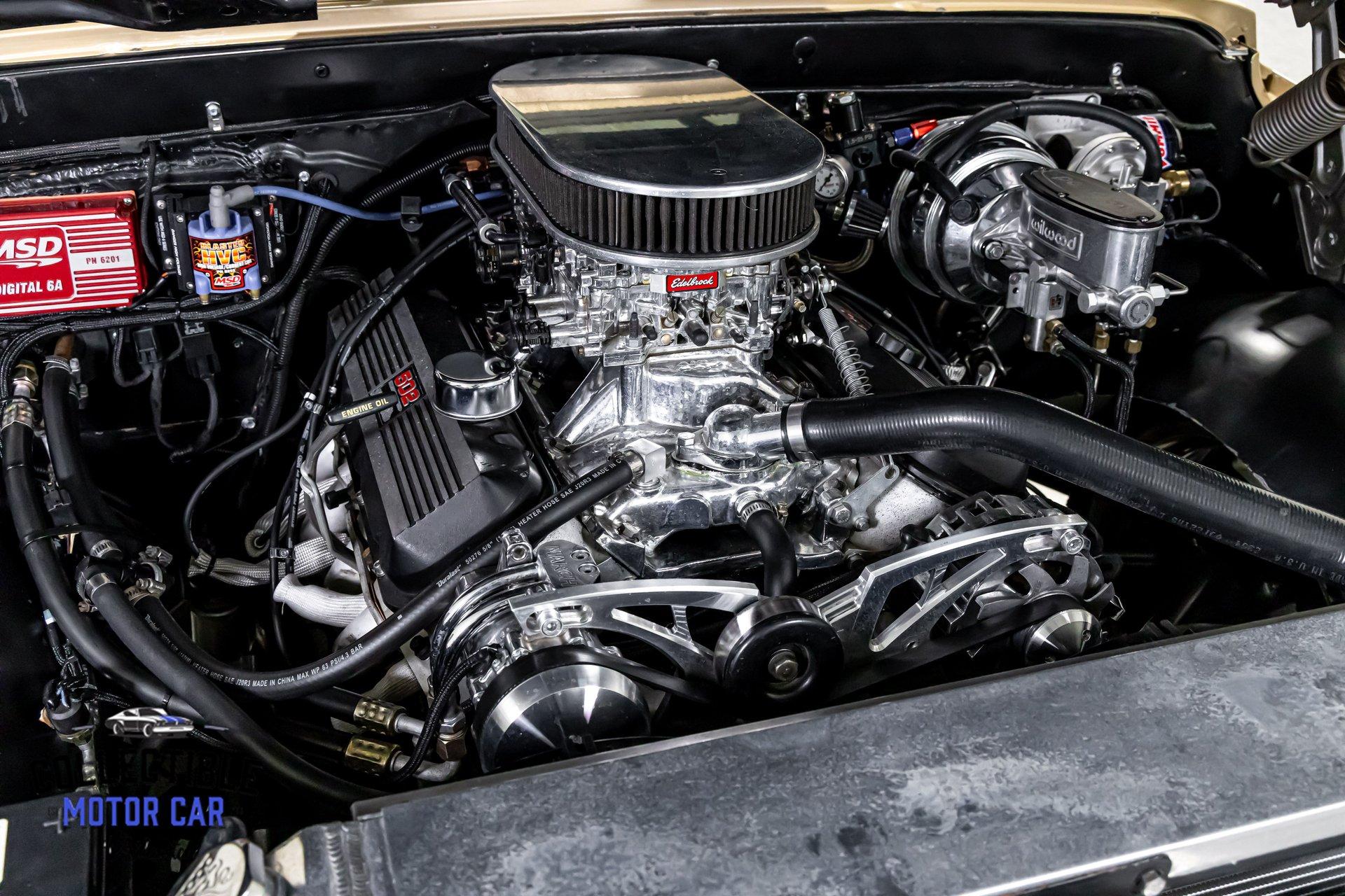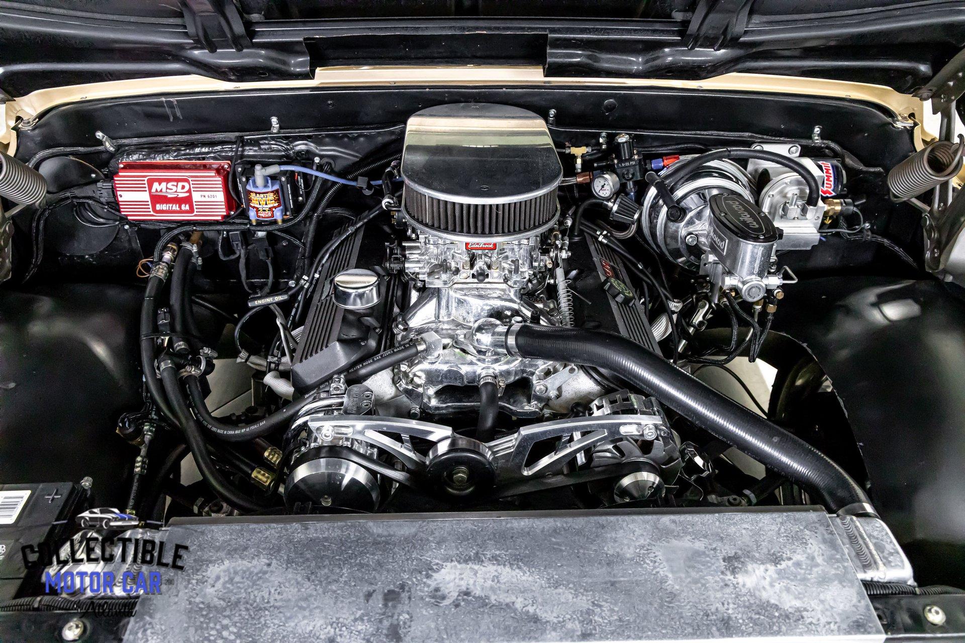 Under the hood is where this truck really separates itself. Power comes from a GM 502 cubic-inch V8, backed by a 700R4 automatic transmission. The engine bay has strong curb appeal with Edelbrock aluminum heads, an Edelbrock chrome intake, and Edelbrock 2x4 carburetors. It also features a March front runner system and a cooling package that does its job exactly the way you want it to. Big Griffin radiator, 3700 CFM dual fans, and real-world proof that it stays cool in traffic with the air conditioning running.