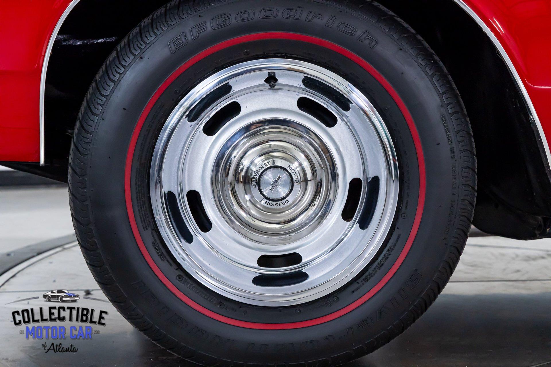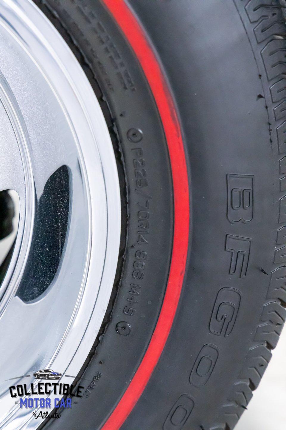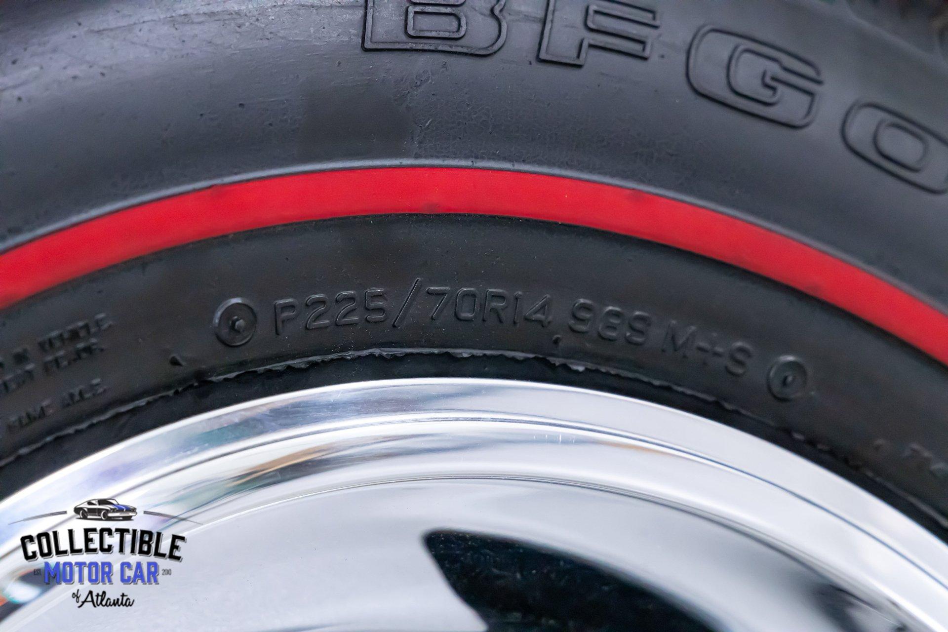 This car wears a set of classic Chevrolet rally-style wheels wrapped in BFGoodrich redline tires, a perfect choice for the overall look and era-correct muscle-car vibe. You specifically noted these are high-dollar BFG redlines, and they absolutely suit the car.