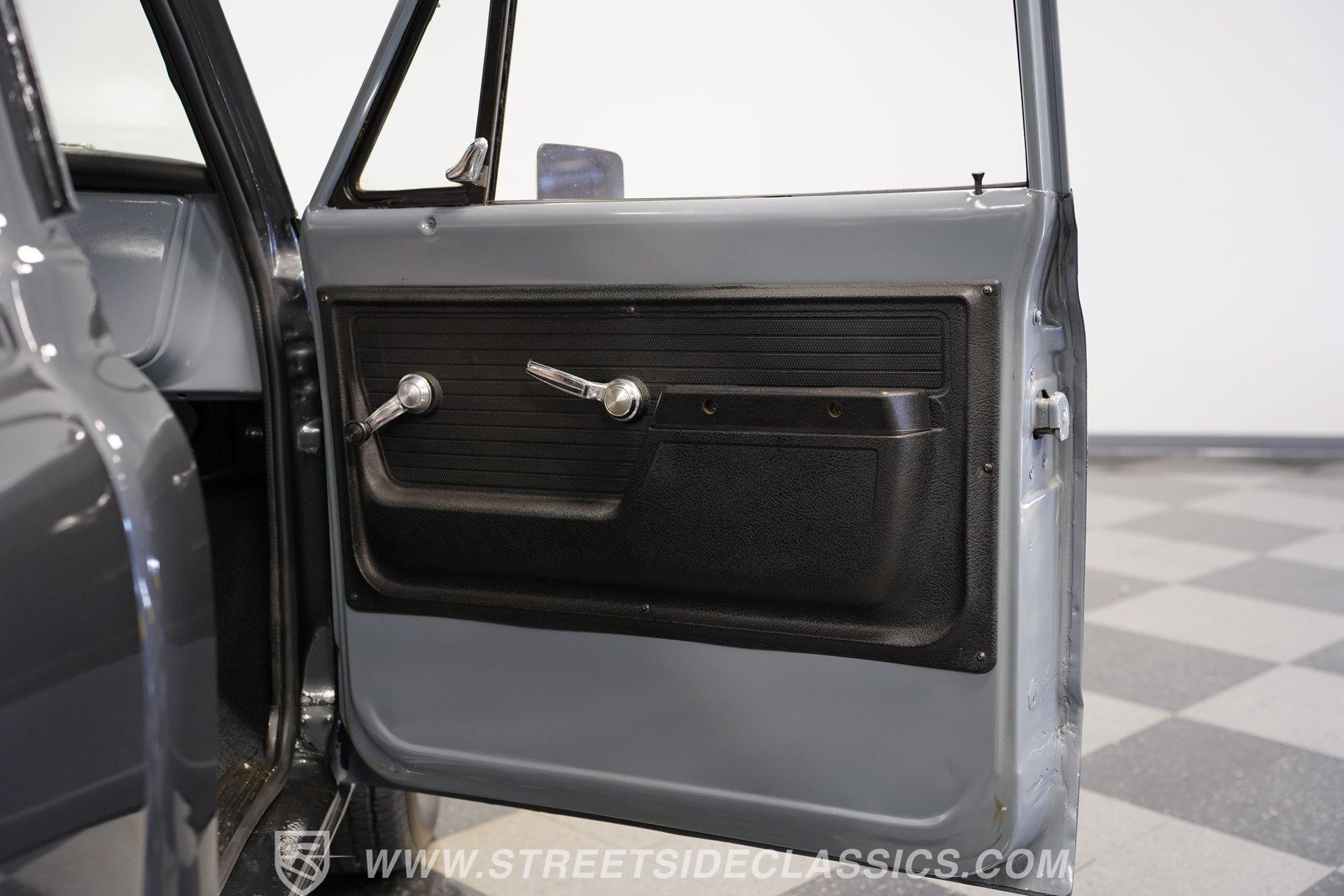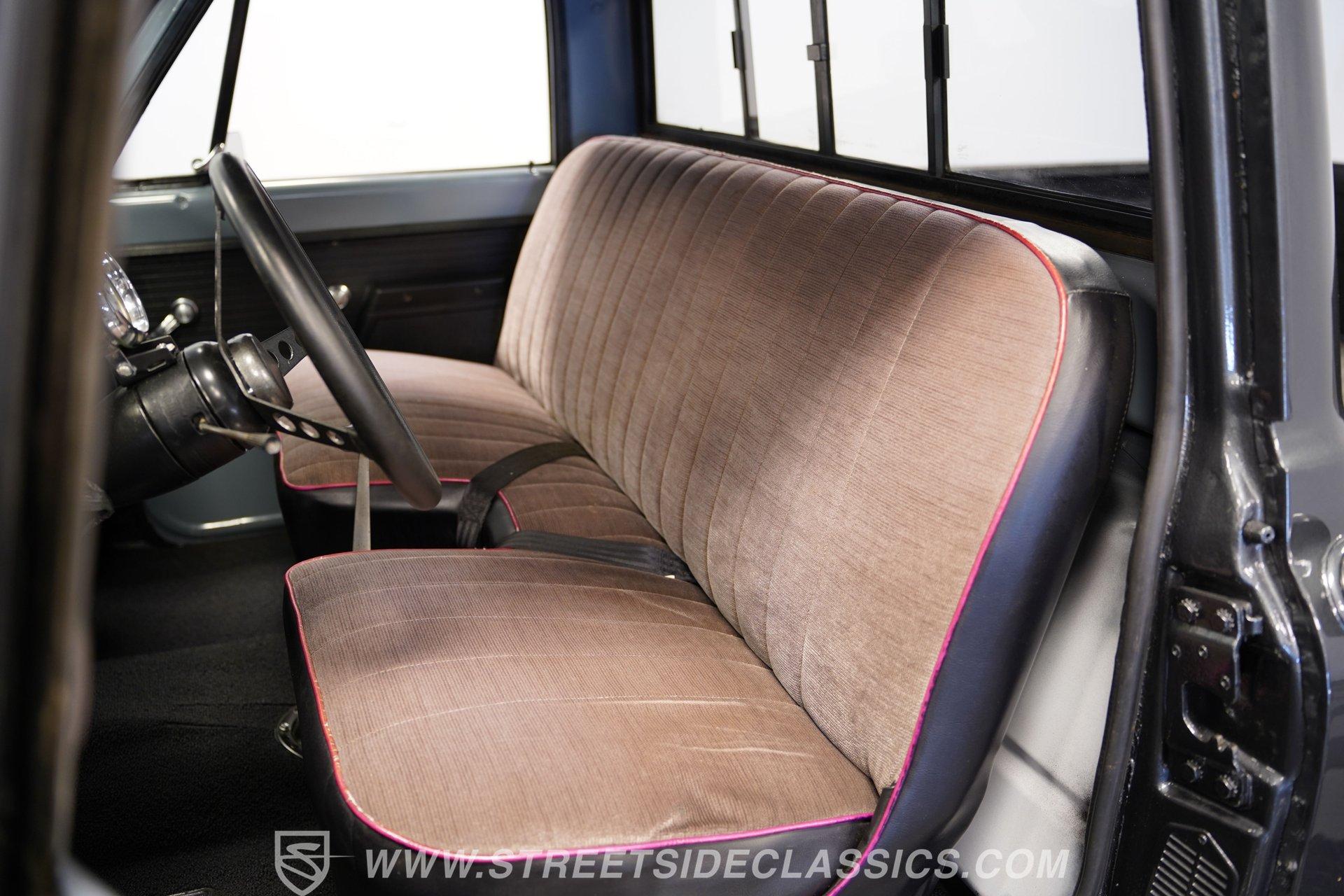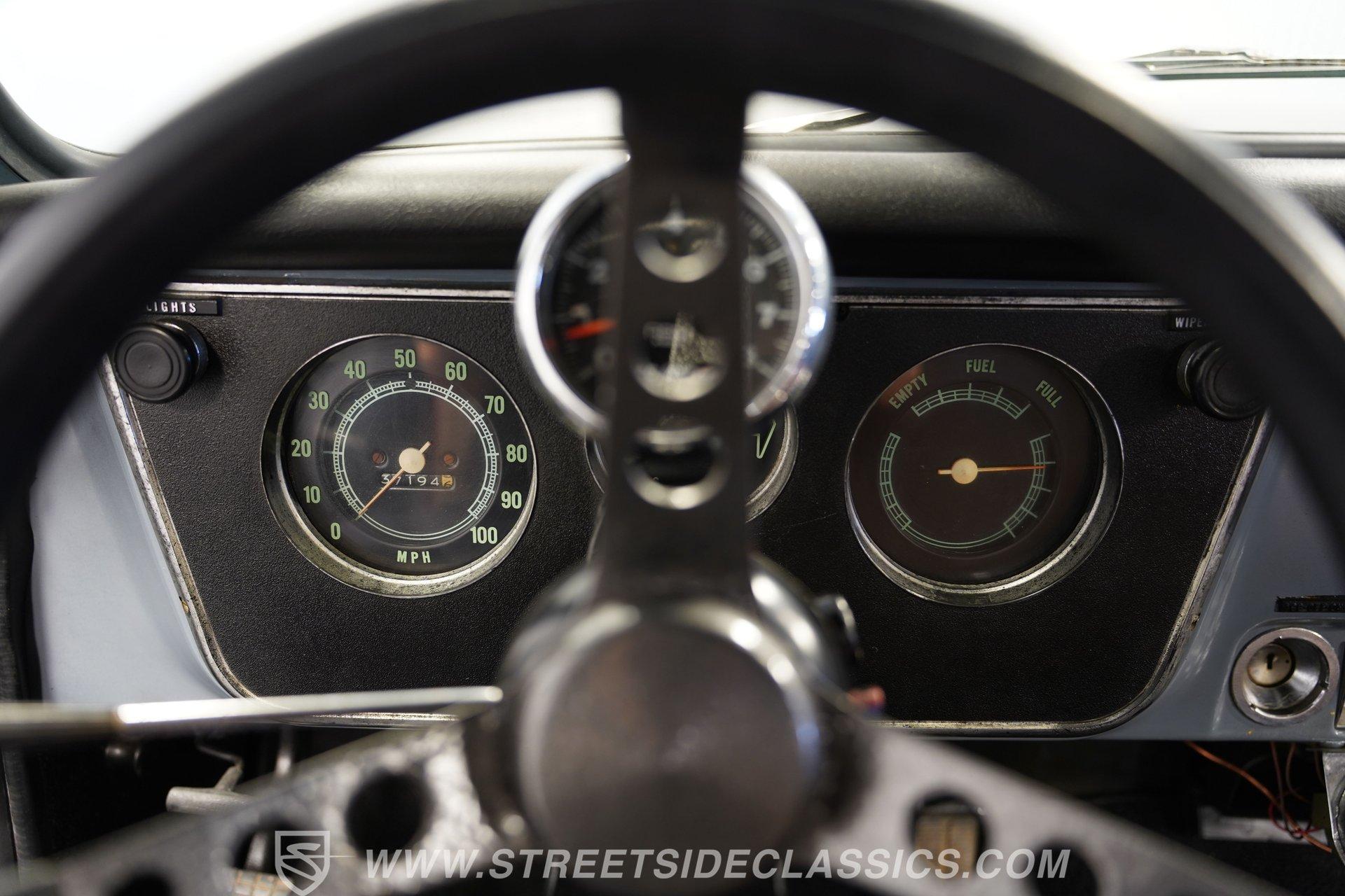 Slide into the gray cloth bench seat that invites you to relax and enjoy the ride. The cabin blends vintage charm with practical features like an under-dash mounted aftermarket gauge cluster and a column-mounted AutoMeter RPM gauge, giving you full command of this classic's heart. The carpet is clean, and the dash remains in solid condition, preserving the authentic feel of this weekend cruiser.