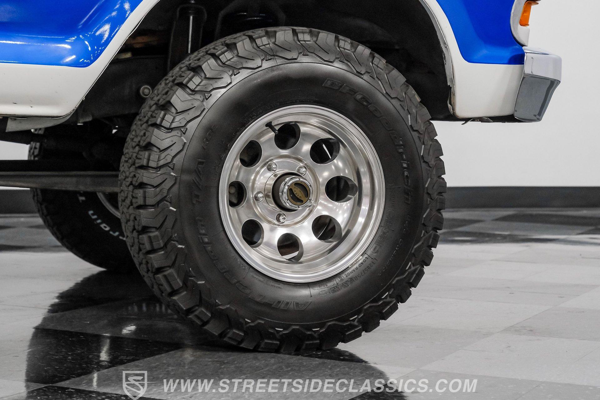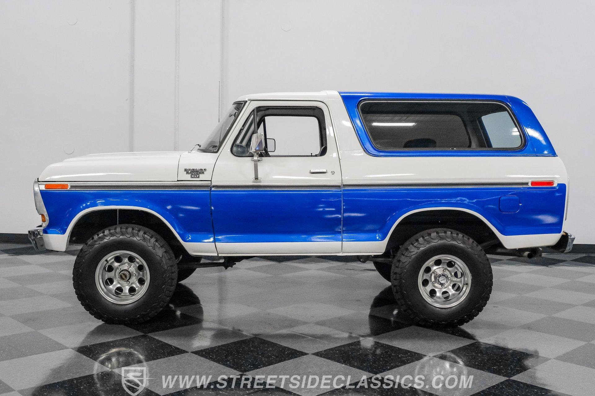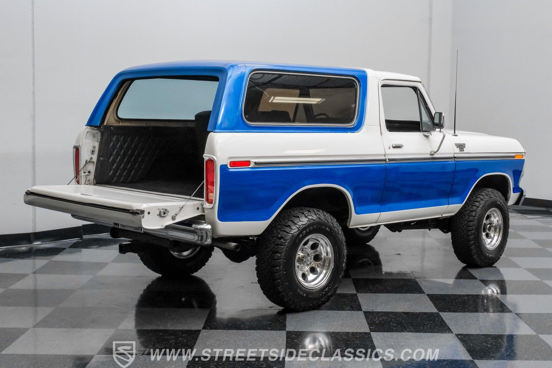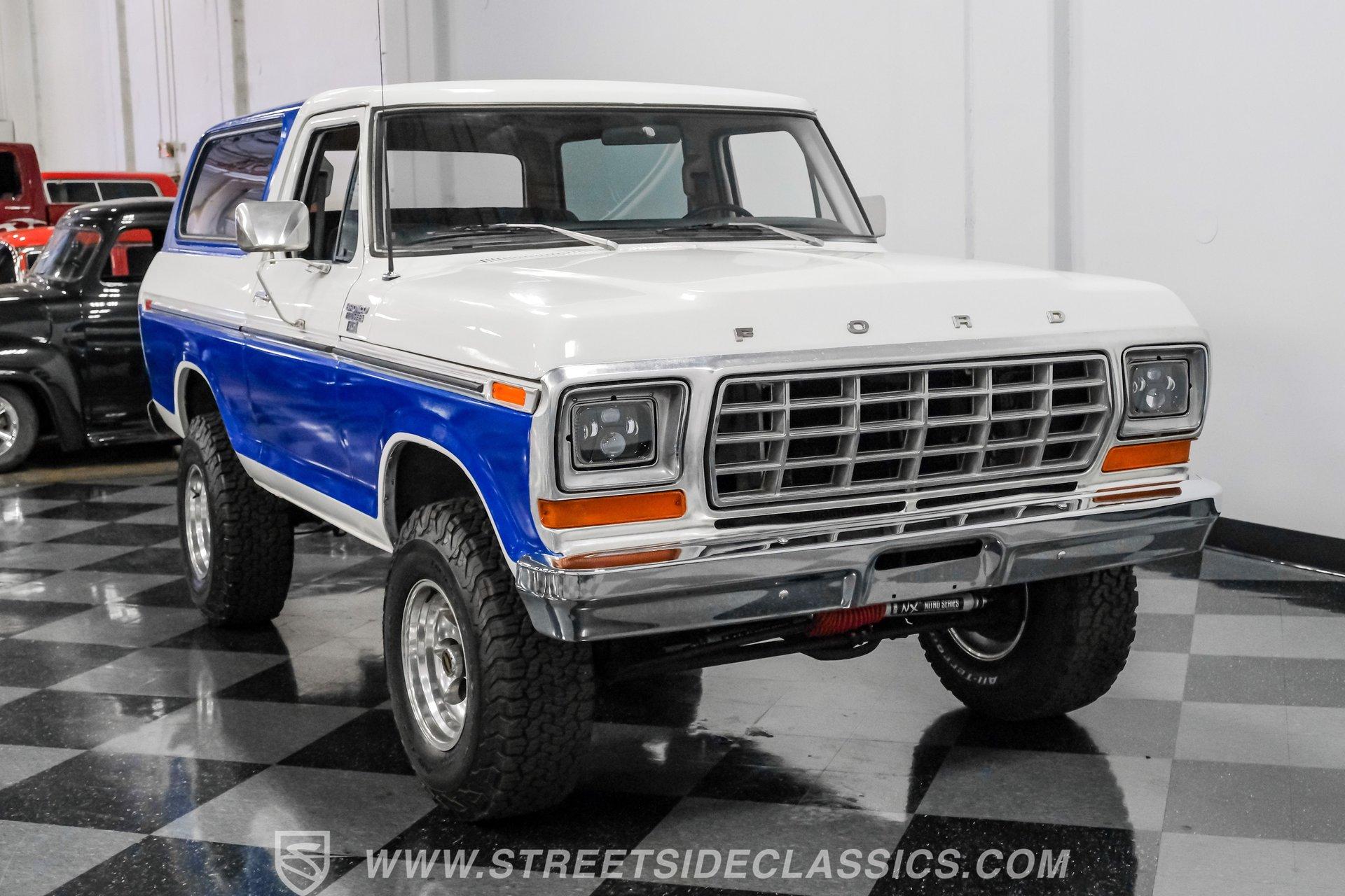 Few vehicles capture classic off-road appeal like this 1979 Ford Bronco, a driver-quality SUV that blends vintage character with standout presence. Repainted in timeless Wimbledon White with blue accents, this Bronco presents a tough attitude while still retaining the character that makes these trucks so desirable. The removable hardtop delivers true open-air cruising when the mood strikes, while factory chrome bumpers add just the right amount of vintage flash. Sitting confidently on 16-inch Pro Comp polished aluminum wheels wrapped in BFGoodrich tires, this Bronco has the stance and presence to match its legendary reputation. It's a driver-quality classic that blends old-school style with the upgrades enthusiasts want for real-world enjoyment.