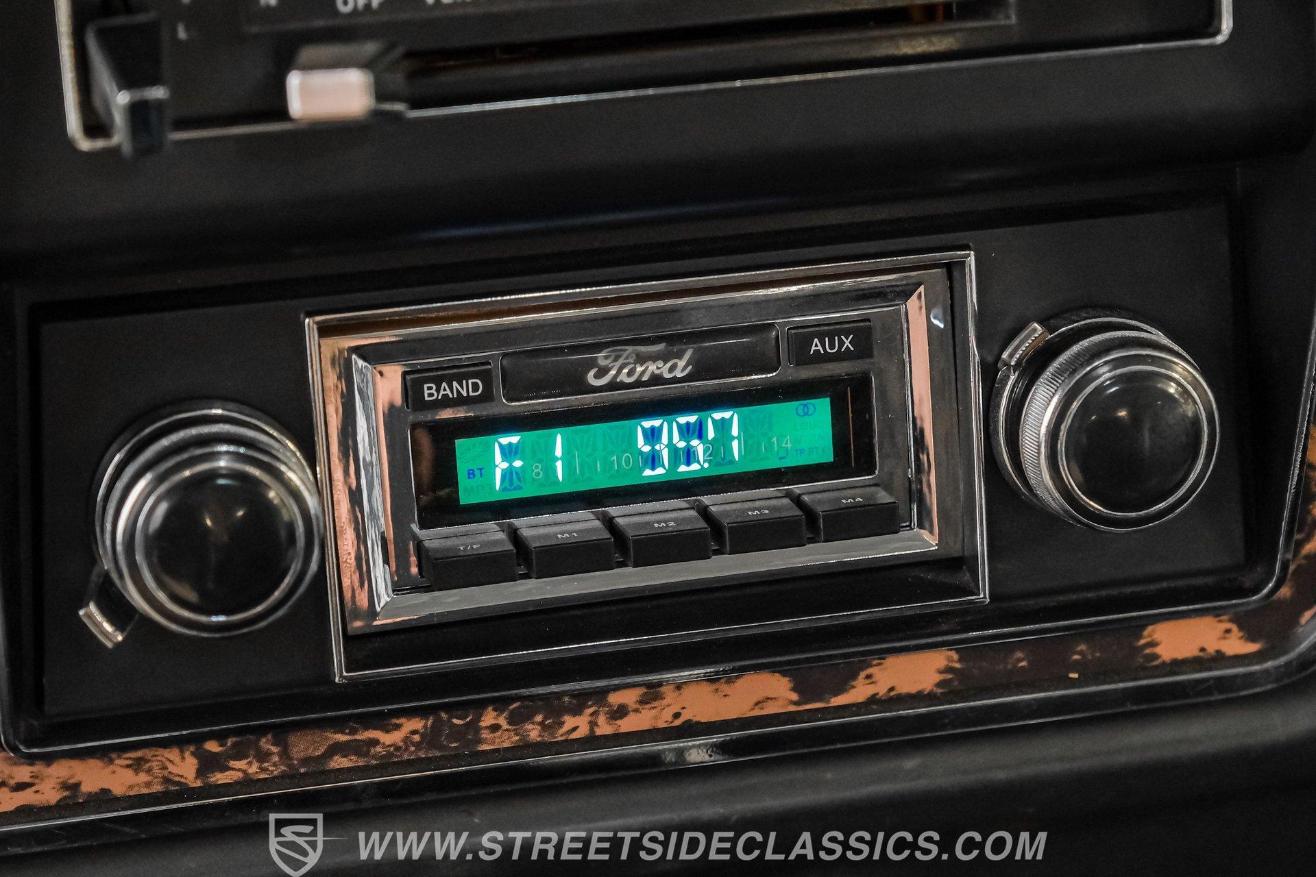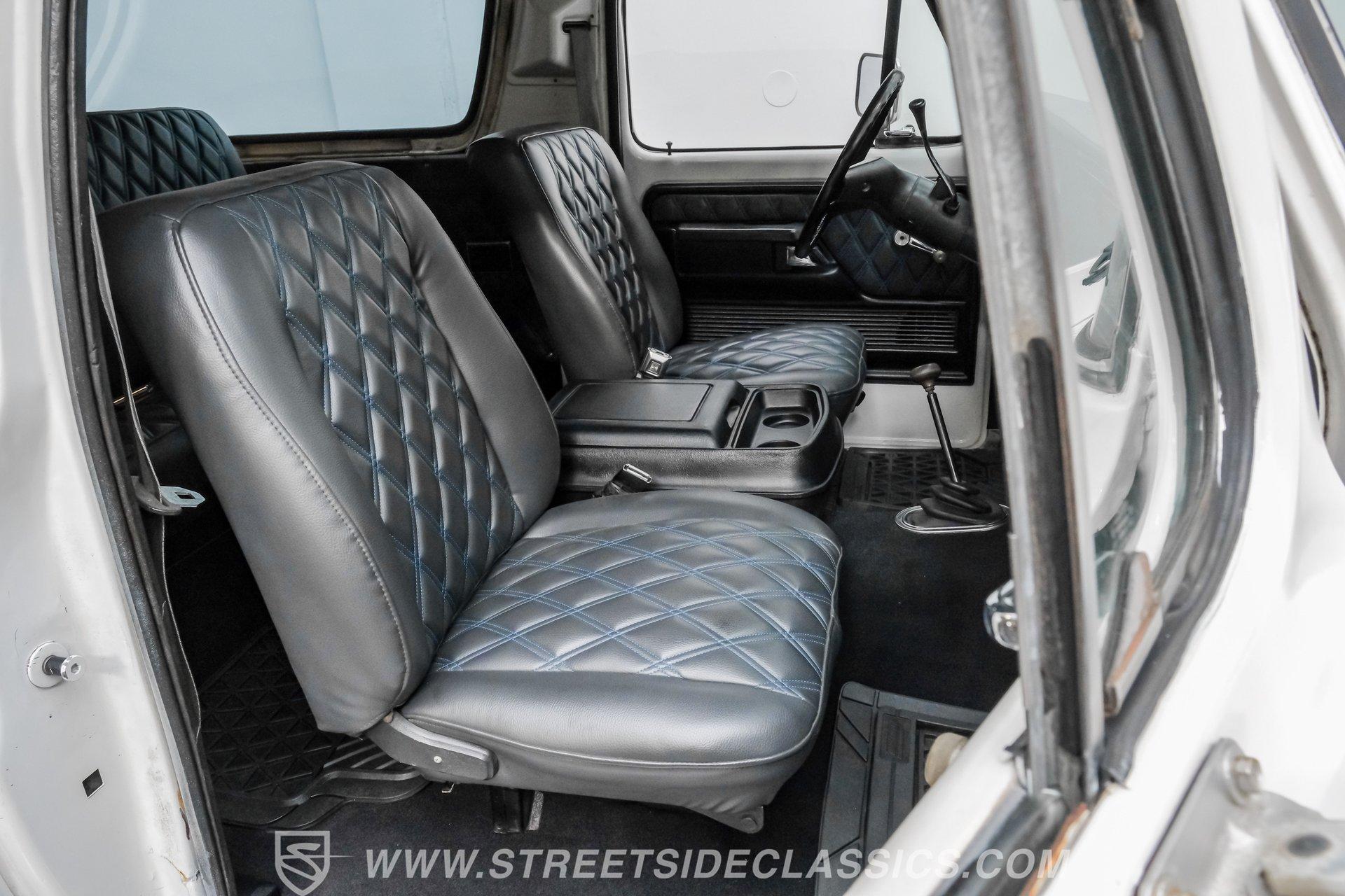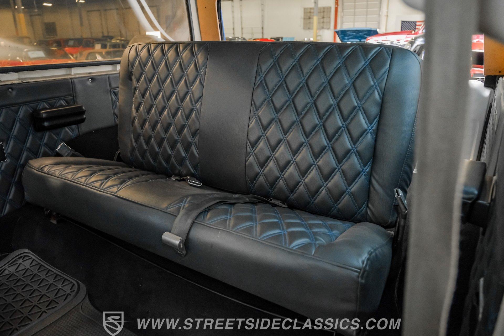 The cabin invites you to sink into custom diamond-stitched blue vinyl bucket seats, perfectly paired with matching door panels and a headliner that refreshes the classic vibe. The black carpet feels fresh underfoot, while the factory dash and gauges maintain that authentic Bronco experience. A modern vintage AM/FM/Aux radio adds convenience without sacrificing style, and the center console with cupholders keeps essentials within easy reach during every journey.