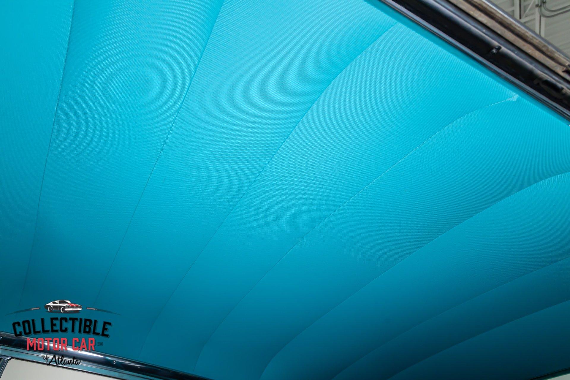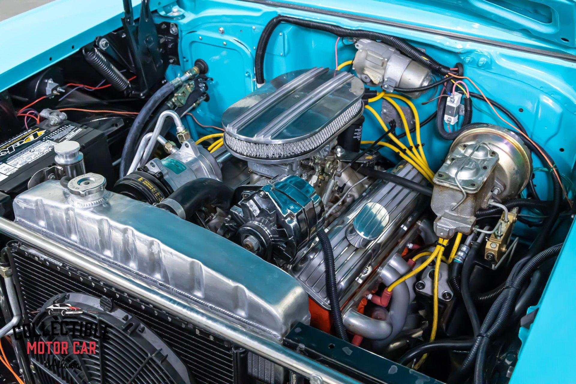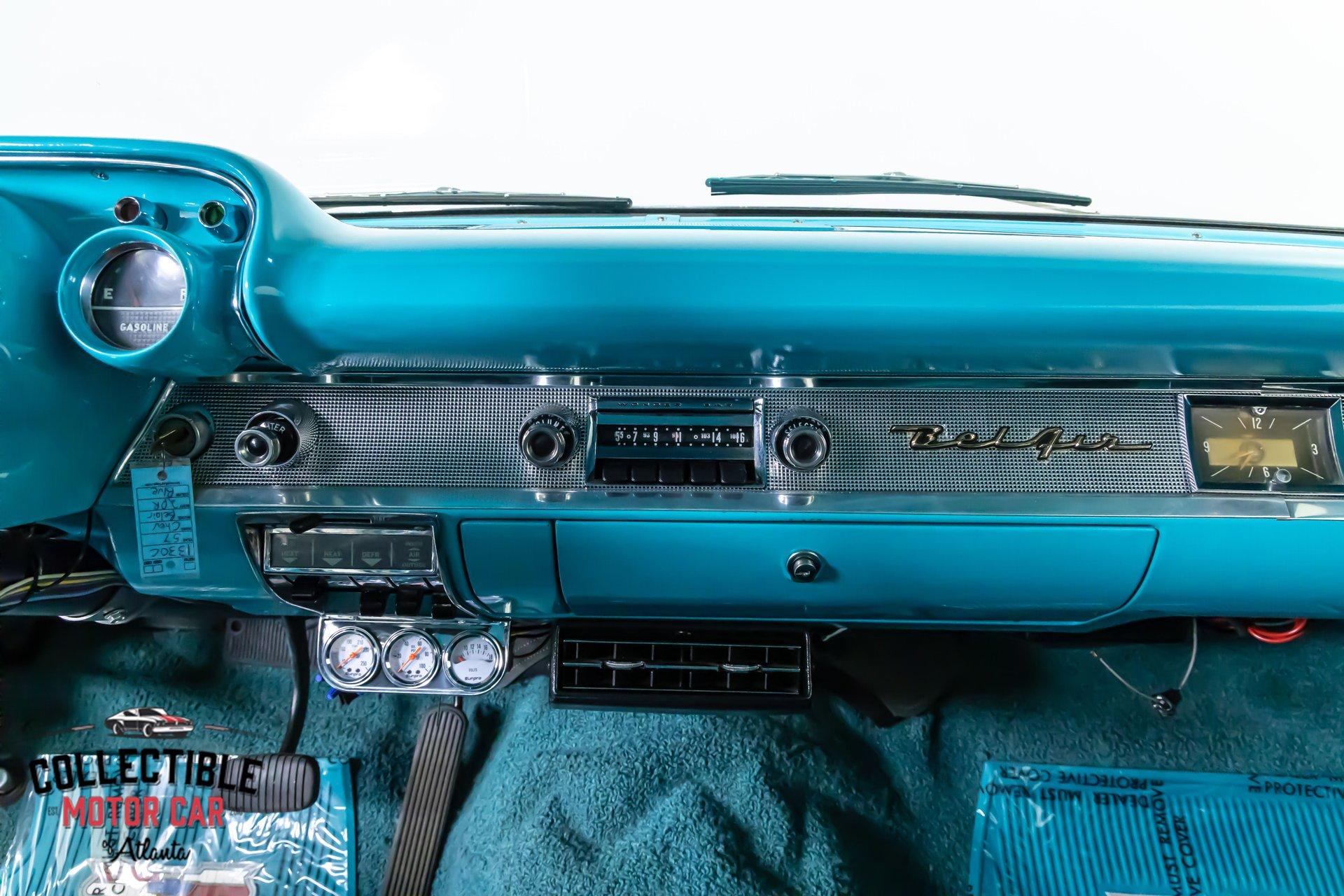 Inside, the turquoise and black interior is exactly what you want to see in a Bel Air. It is bright, period-correct in feel, and full of character. The cabin has been updated with a custom steering wheel and tilt column for a more comfortable driving position, while auxiliary under-dash gauges help keep an eye on vital engine functions. The bench seats, door panels, dash layout, and color combination all work together to deliver that unmistakable mid-century Chevrolet vibe, but with a few upgrades that make it easier to live with.