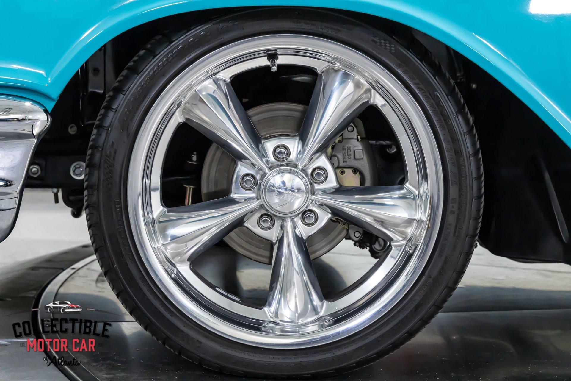 The body presents with a clean, straight look that really lets the color combination shine. The Larkspur Blue paint pops from every angle, and the white roof gives it that classic 1950s contrast that never goes out of style. Gold Chevrolet badging, bright side trim, hood rockets, and the signature Bel Air quarter inserts all help this car keep its factory-inspired identity, while the modern alloy wheels and lowered stance give it a more aggressive, street-ready presence. It has the kind of curb appeal that immediately grabs attention whether it is parked at a show or rolling down the road.