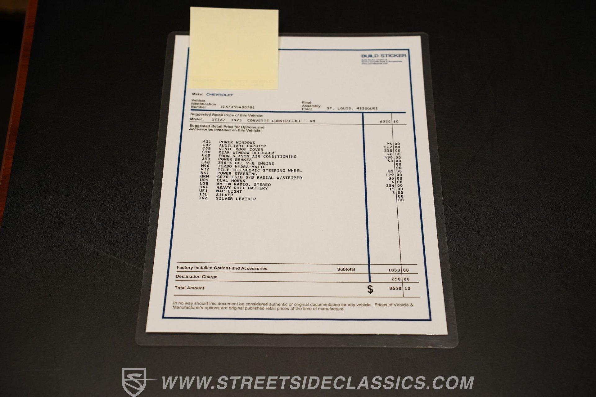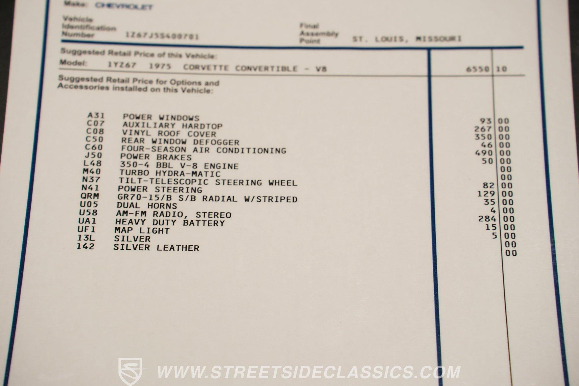 Step back into a time where style met performance with the soulful 1975 Chevrolet Corvette Convertible. This iconic American sports car is more than just a vehicle; it's a rolling piece of history that commands attention on every street. Its sleek silver metallic paint and classic lines evoke the thrill of open-air cruising, embodying freedom and prestige. Whether parked at a classic car show or roaring down the highway, this Corvette makes a statement that resonates with both nostalgia and timeless cool. The unbeatable combination of its numbers-matching 350 V8 and restored elegance ensures this is the Corvette you've been searching for.