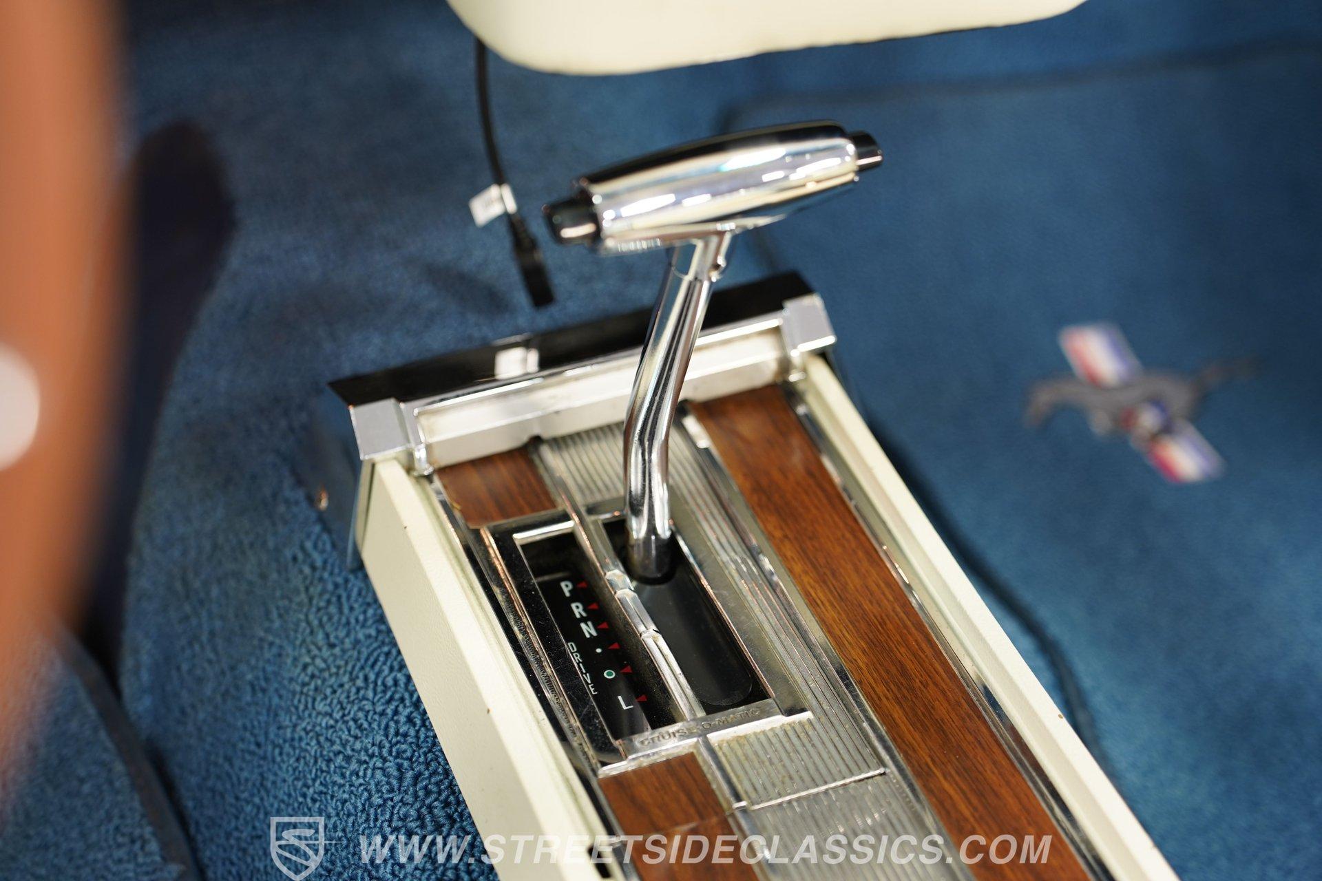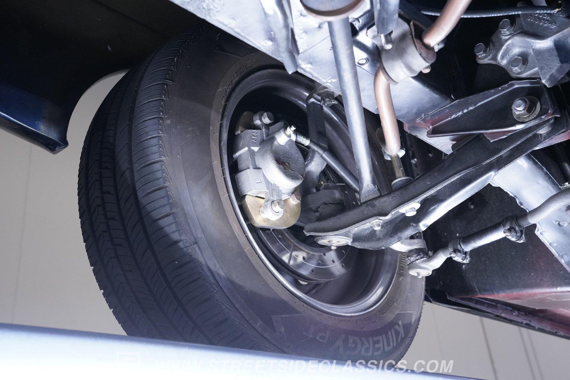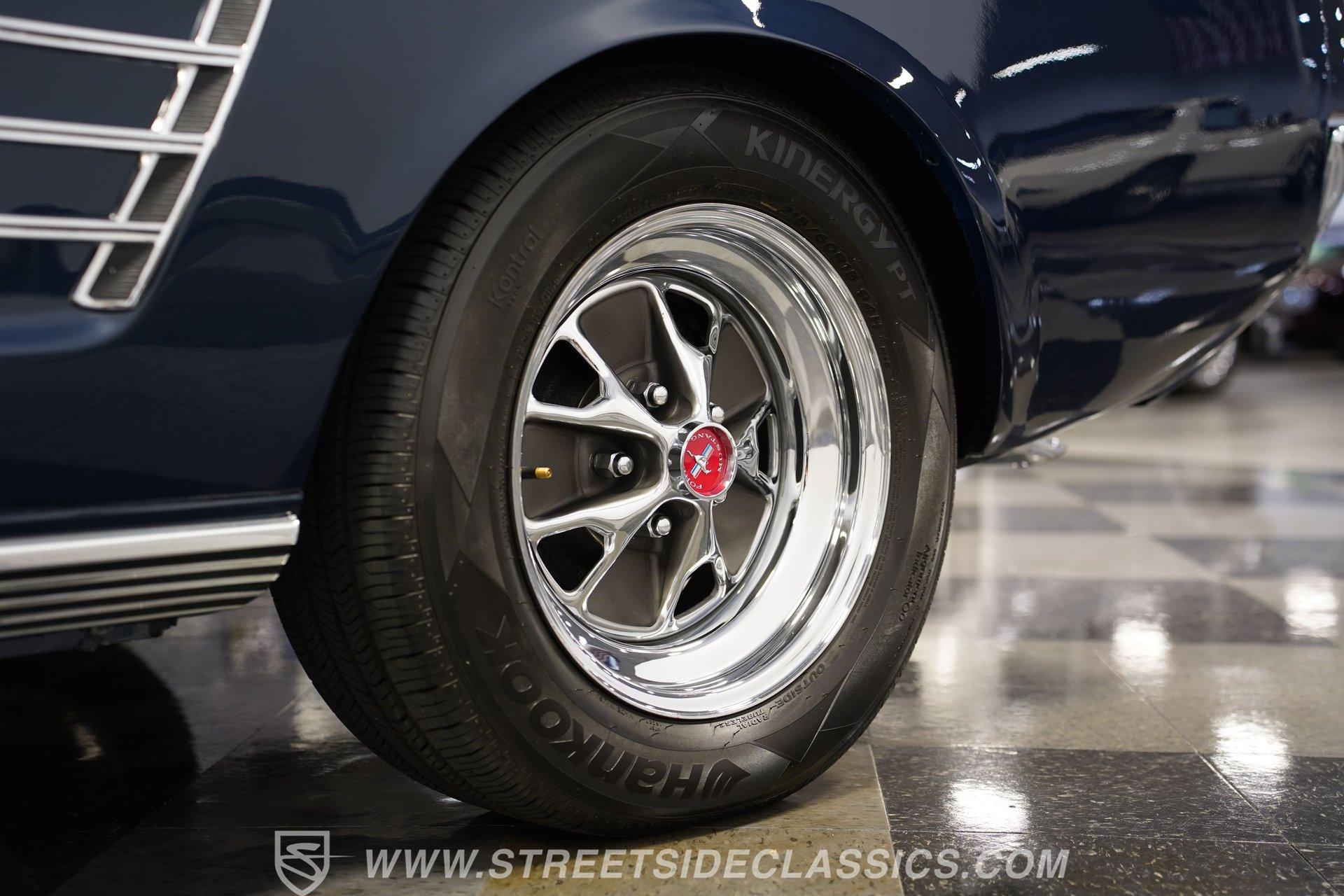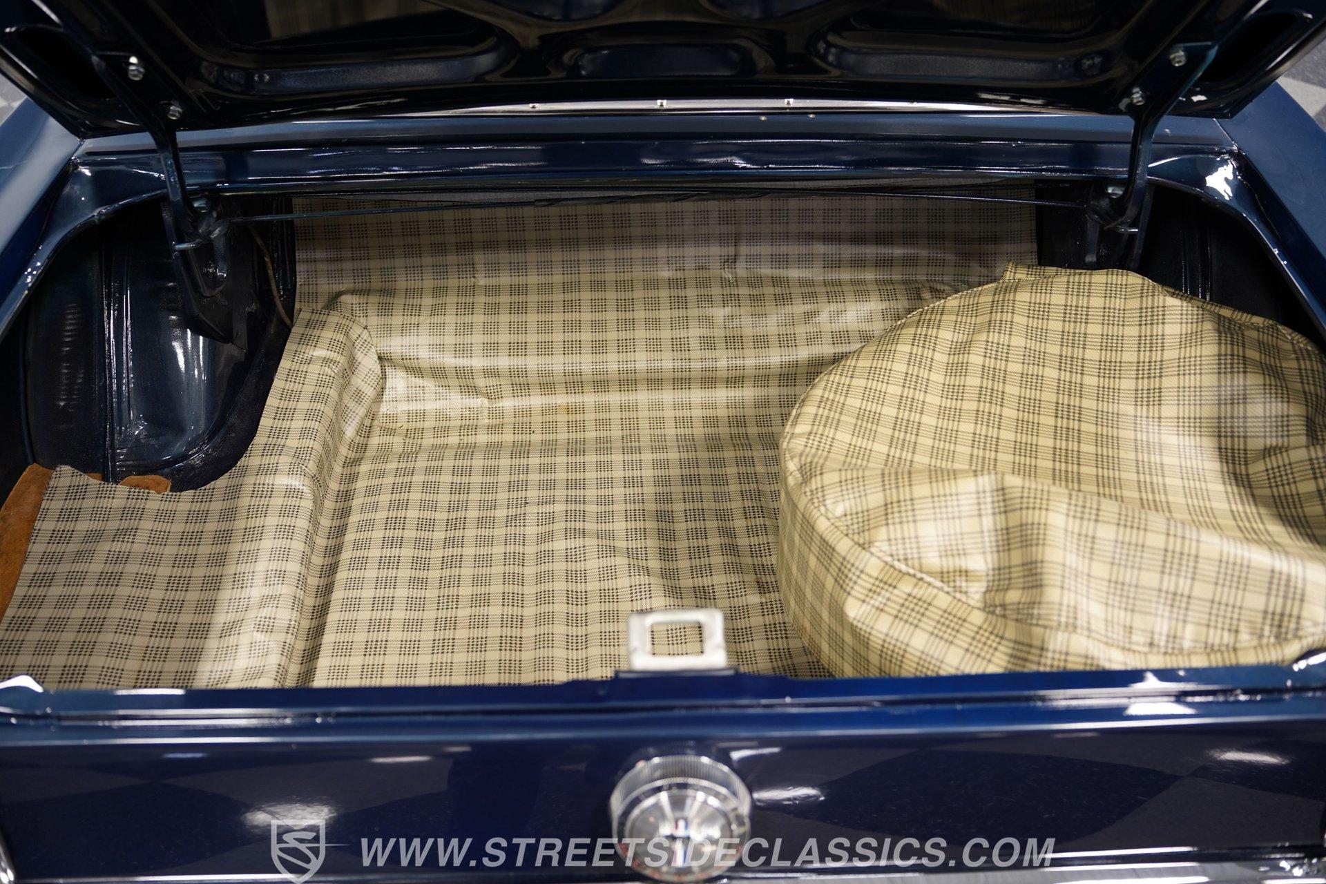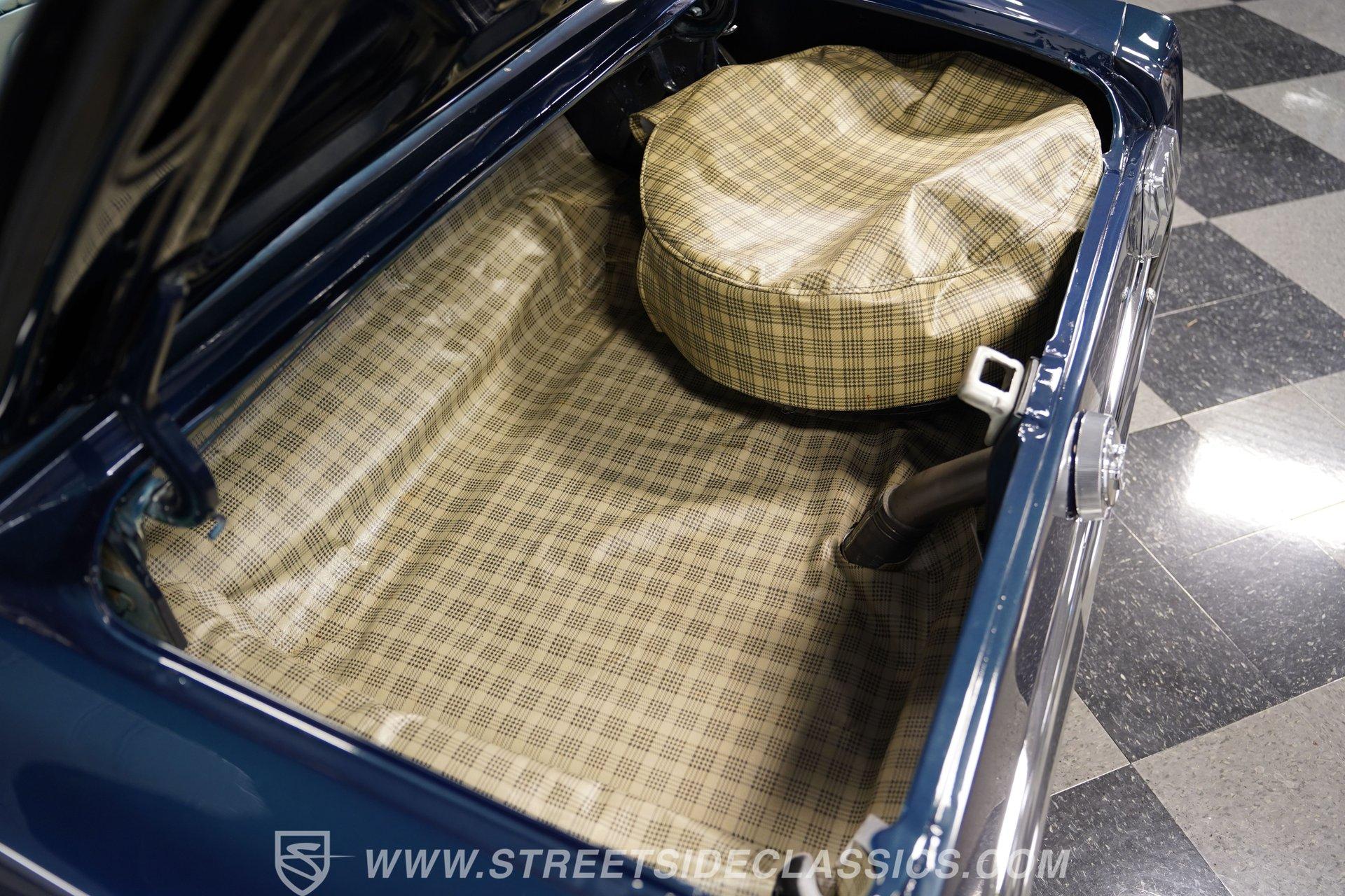 Step inside the cabin and be enveloped by a beautifully maintained two-tone pony interior in blue and white vinyl that exudes vintage charm. The dash pad fits seamlessly, complemented by crisp cluster gauges and factory-style radio, offering an authentic feel. Front bucket seats and a well-kept center console provide comfort and style. The power convertible top lets you enjoy open-air freedom with ease.