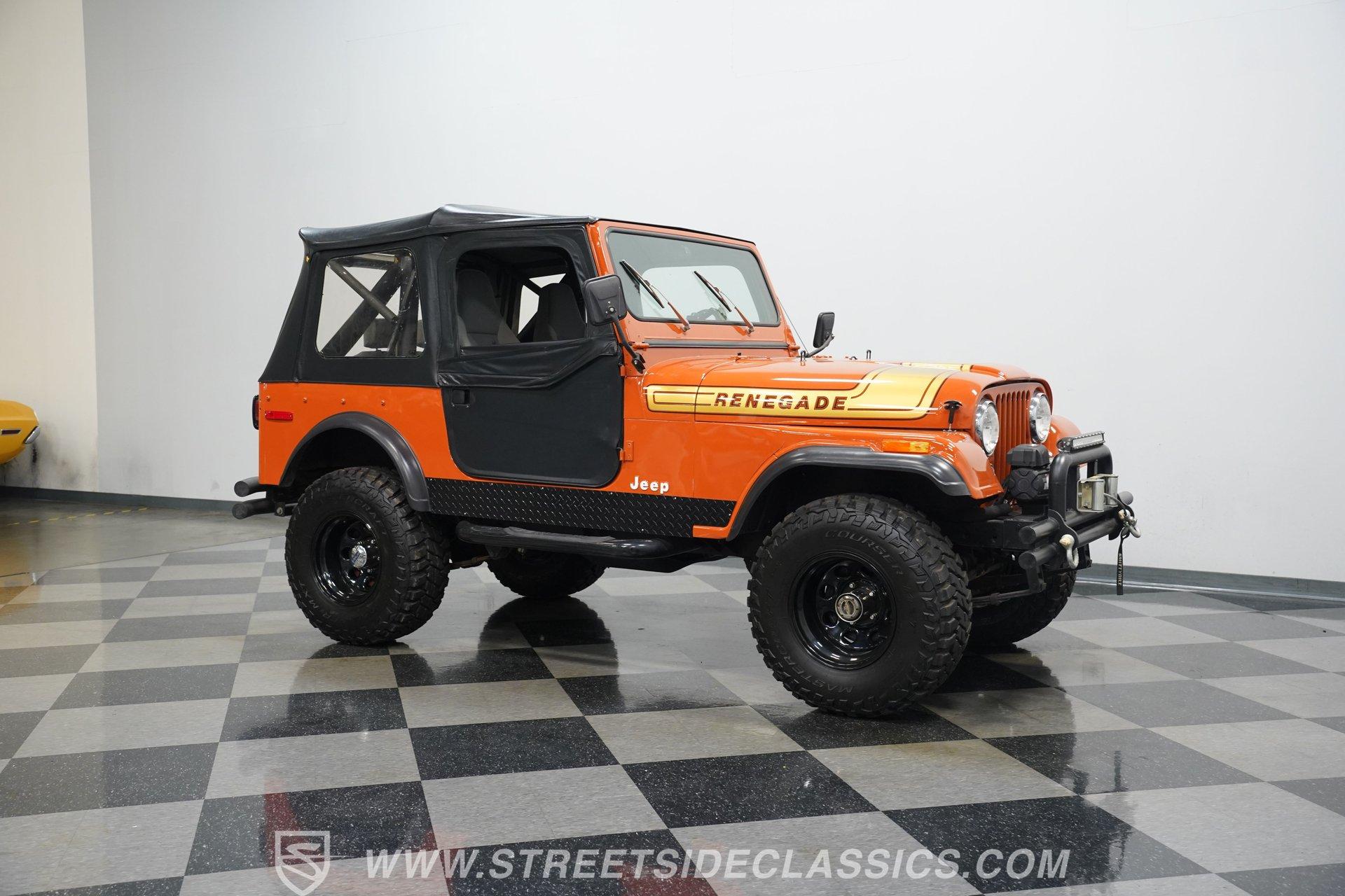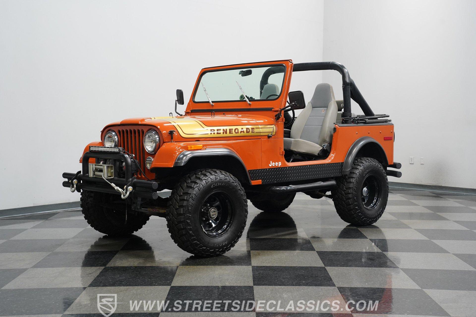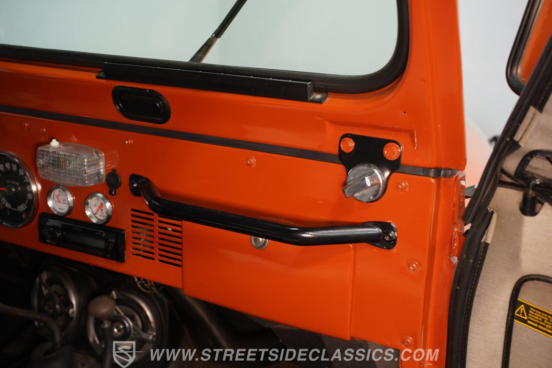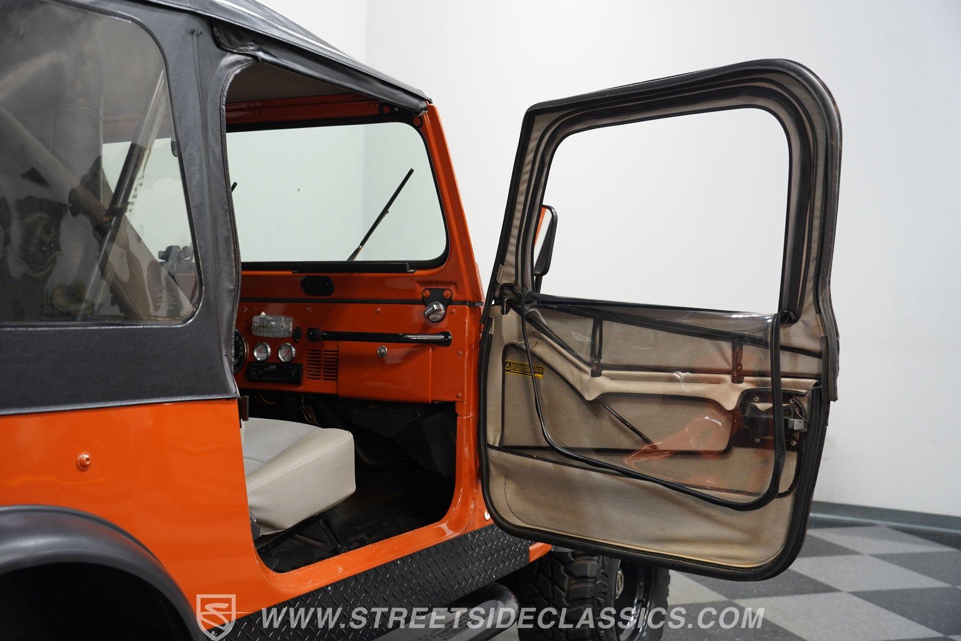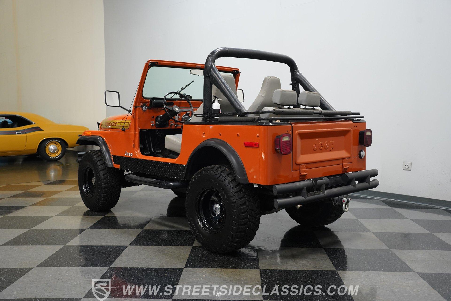 Step back into the rugged charm of the 1976 Jeep CJ7, a true icon of off-road freedom and vintage style. This classic is not just a vehicle, it's a statement. A symbol of adventure and raw capability that echoes through every mile. Cloaked in striking Renegade Orange with matching decals, this Jeep commands attention whether you're blazing trails or cruising town streets. With a fresh paint job, aggressive off-road tires, and a bold deer slayer bumper equipped with a 10,000-pound winch, the 1976 Jeep CJ7 is ready to conquer any terrain and turn heads wherever it goes.
