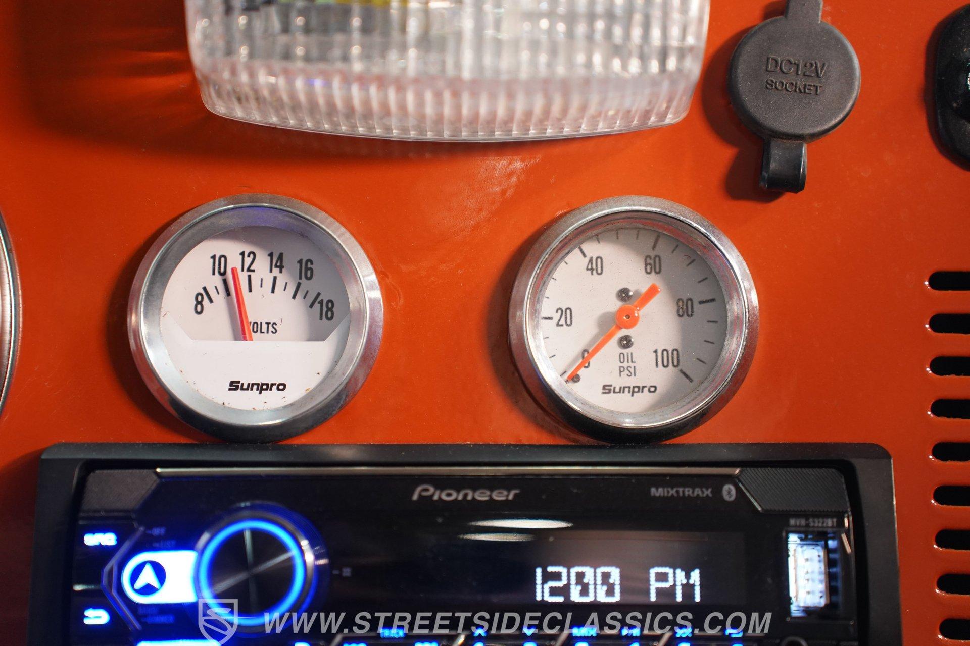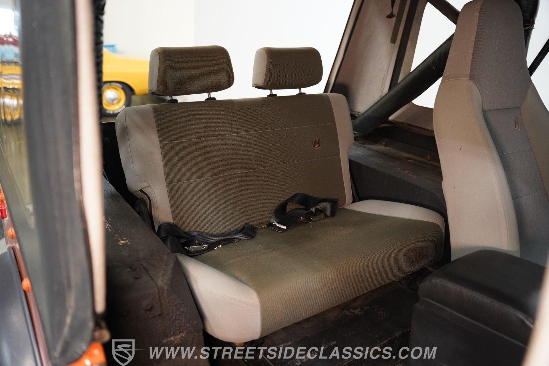 Inside, the cabin blends utilitarian function with sporty comfort. Two sport bucket seats, upholstered in durable gray cloth from Best Top, offer firm support while the rear bench adds practicality. The floor shifter puts you in full command of the four-speed manual transmission, while the upgraded AM/FM CD player and aftermarket gauges for oil pressure and volts keep you connected and informed. This Jeep's interior invites you to embrace the open road with tactile controls and a clean, purposeful layout.