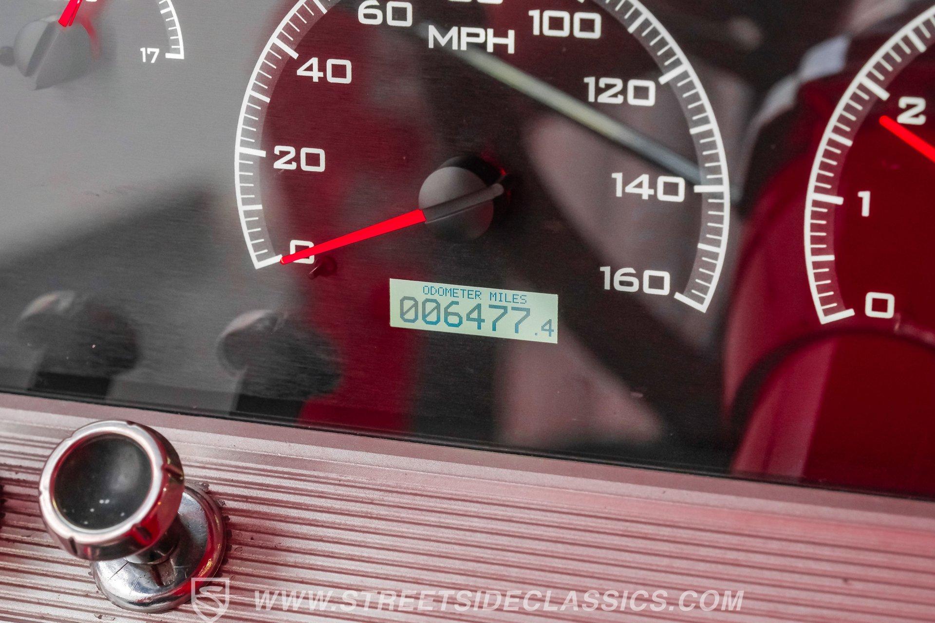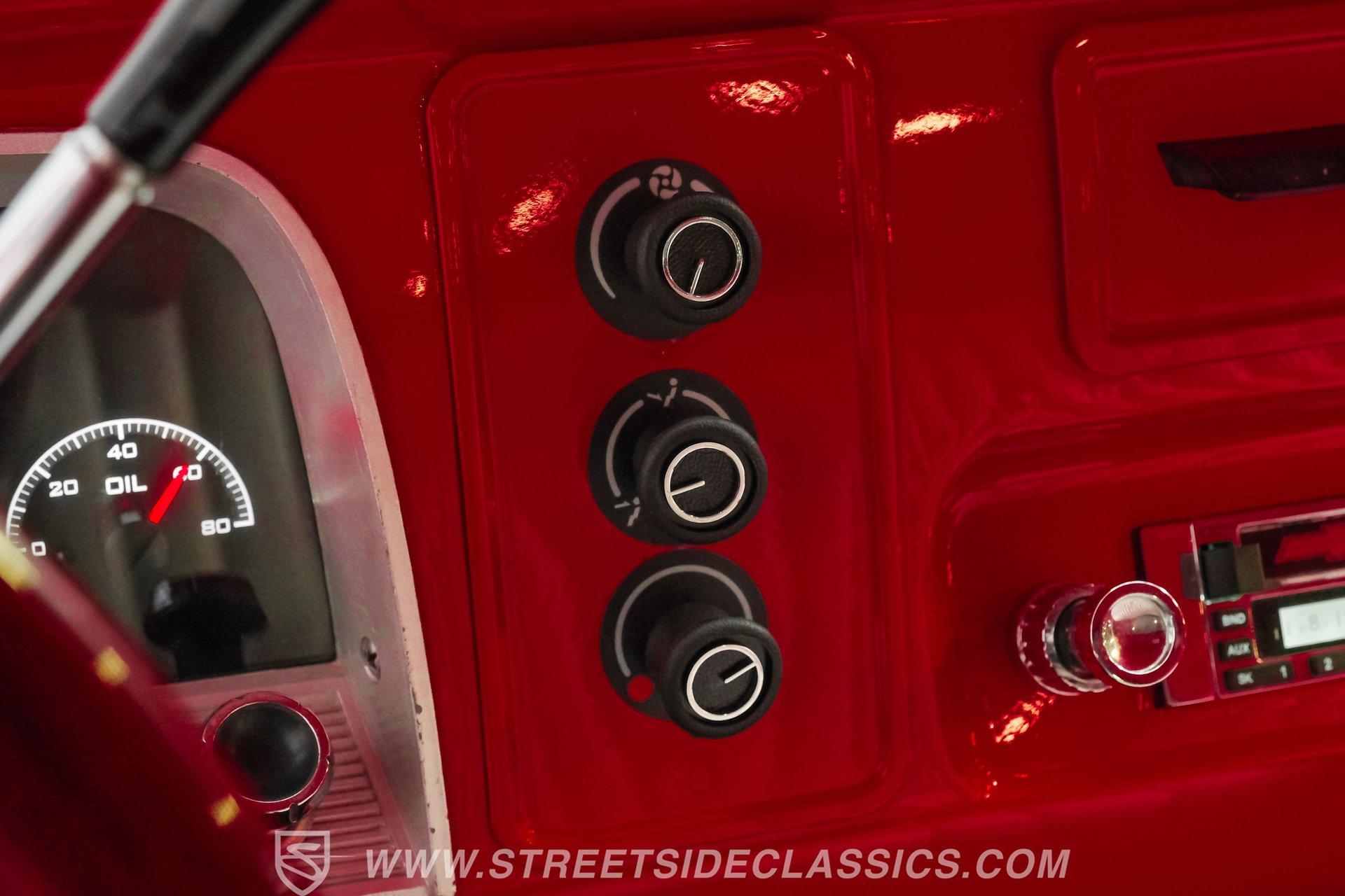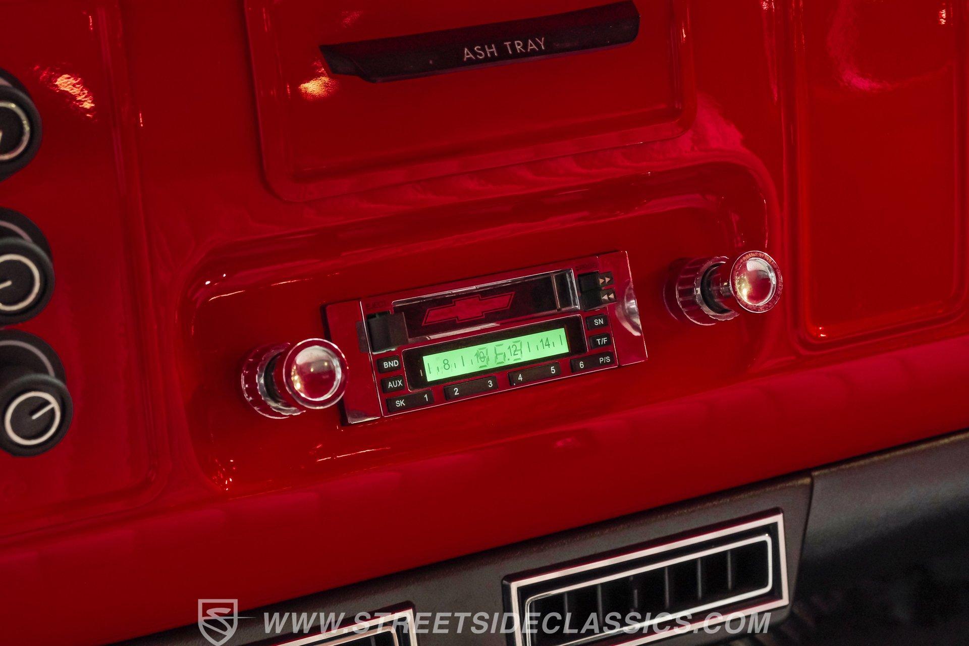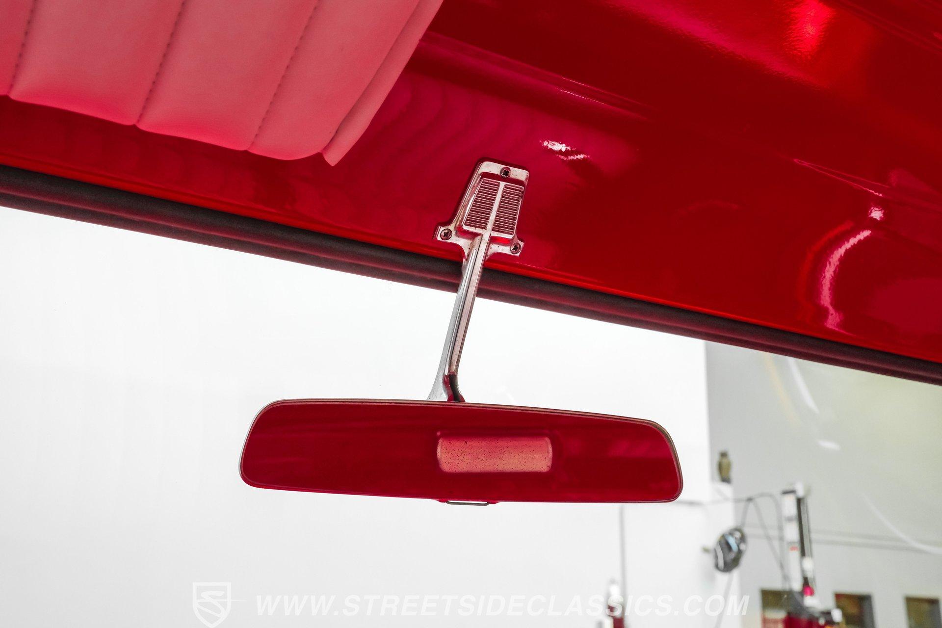 Inside, the white vinyl bench seat invites you to relax while the red factory dashboard, enhanced with Dakota Digital gauges, provides clear, precise information at a glance. The Grant wood rim steering wheel on the factory column adds a touch of classic craftsmanship, while the cold-blowing under-dash air conditioning and RetroSound AM/FM cassette radio keep you comfortable and entertained on every journey.