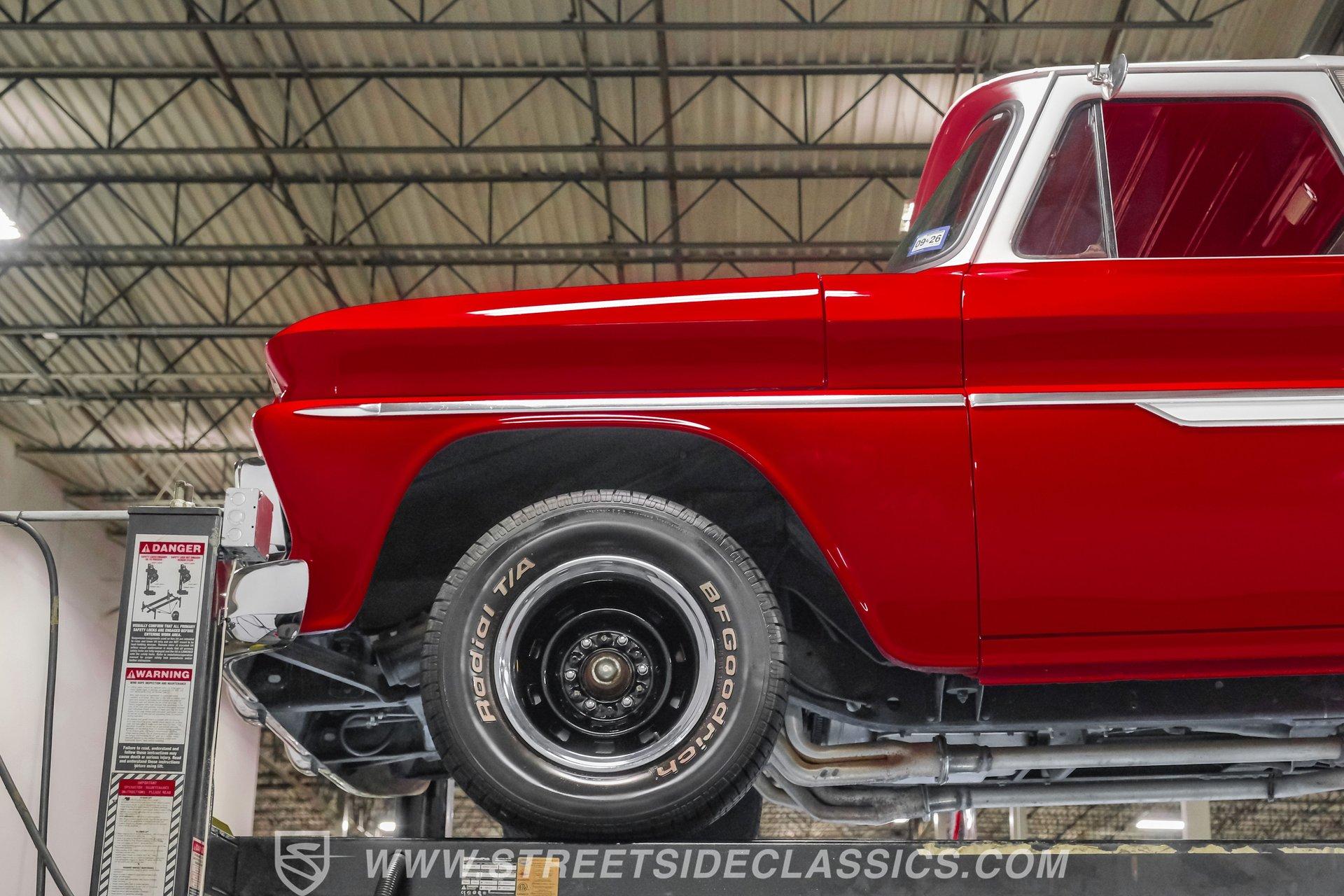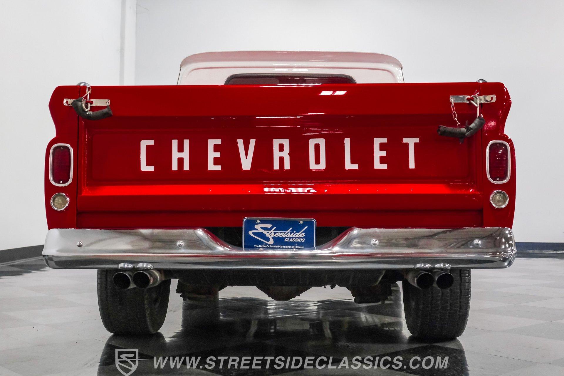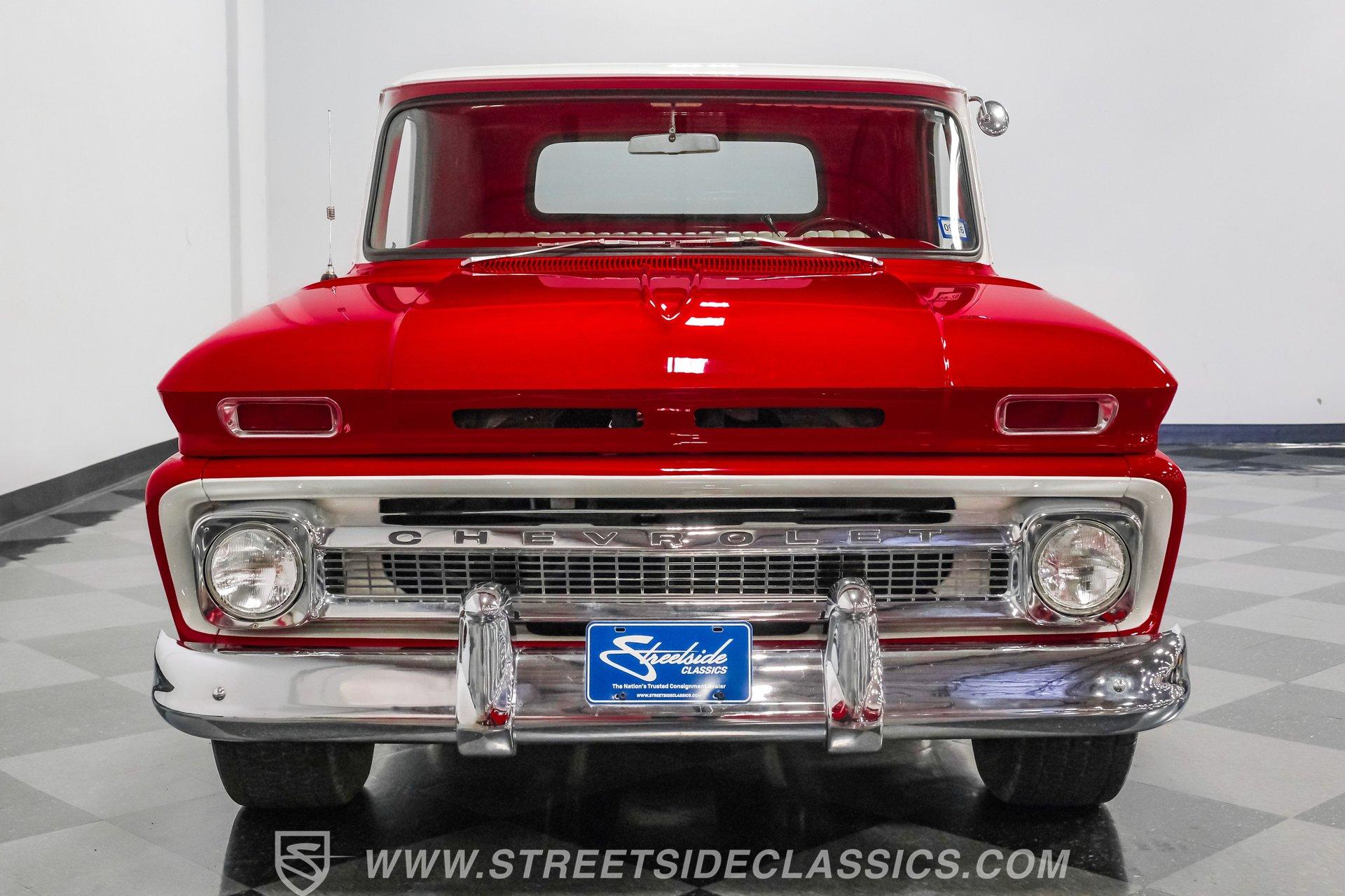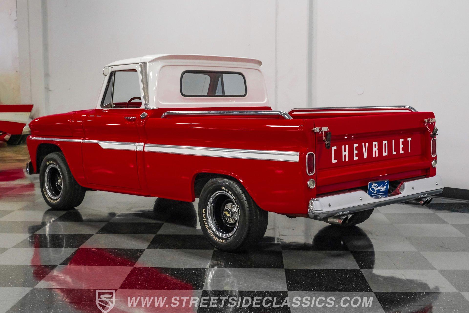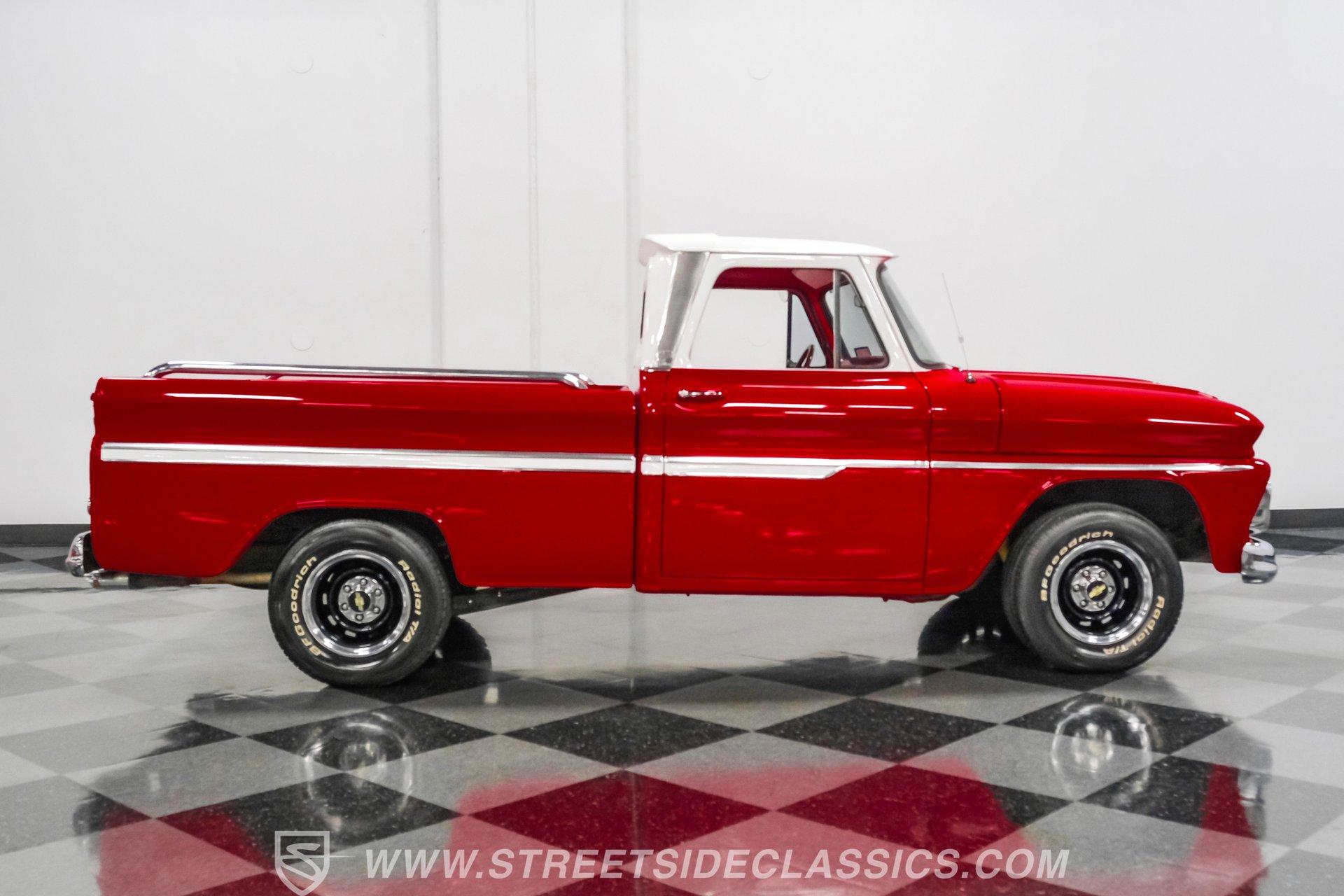 This 1966 Chevrolet C10 is a standout blend of classic style and honest muscle, restored to be driven and enjoyed. Refinished in 2014 in factory-correct Medium Red and White, the two-tone paint highlights the truck's iconic lines, accented by chrome bumpers, grille, and subtle side stripes. It sits just right with a slightly lowered factory stance, rolling on 15-inch steel wheels with hubcaps and BFGoodrich white-letter tires. Details like the wood plank bed and relocated under-bed fuel tank add both functionality and visual appeal, making this C10 as purposeful as it is eye-catching-whether it's cruising Main Street or heading out for a weekend escape.