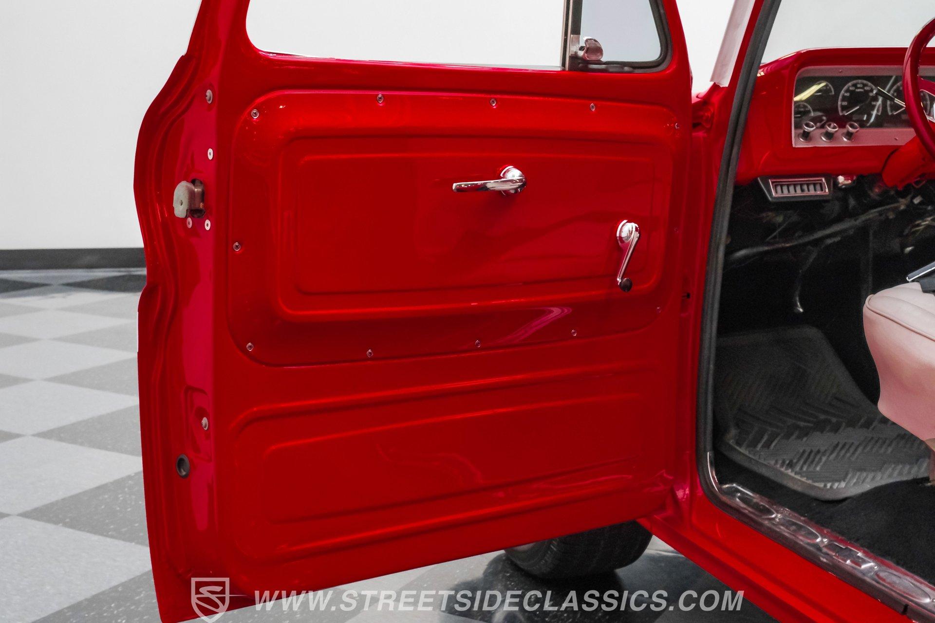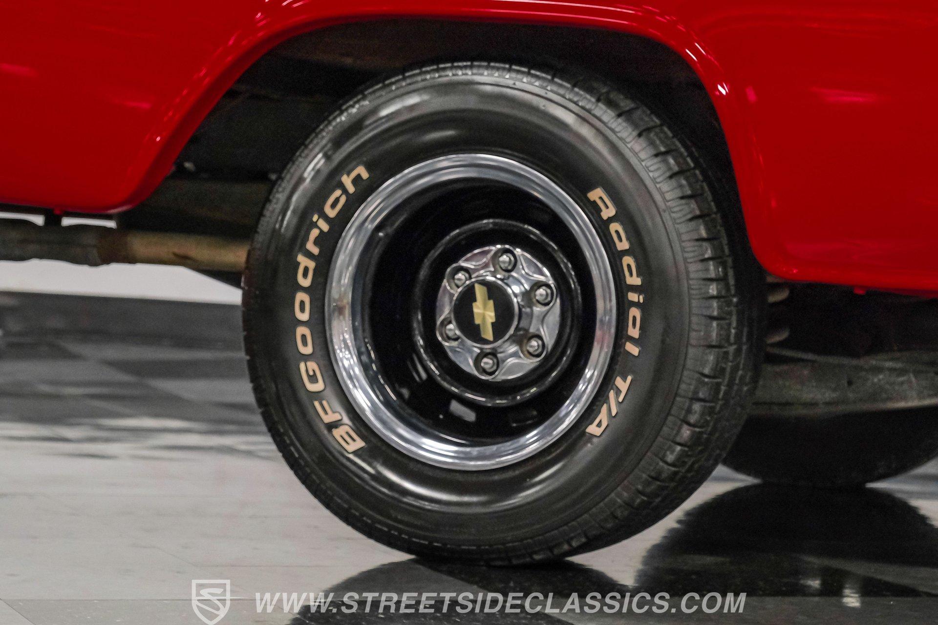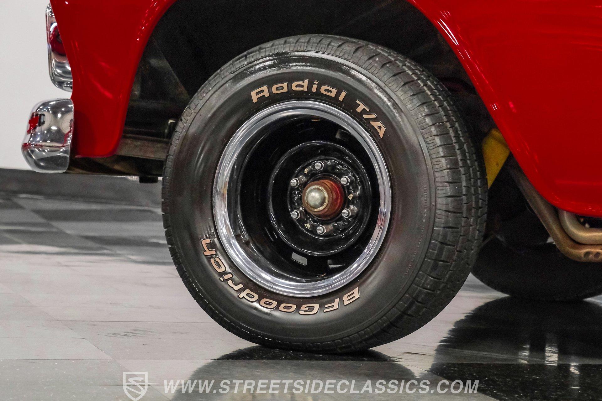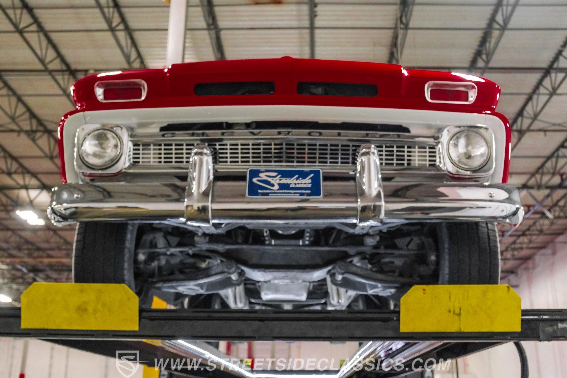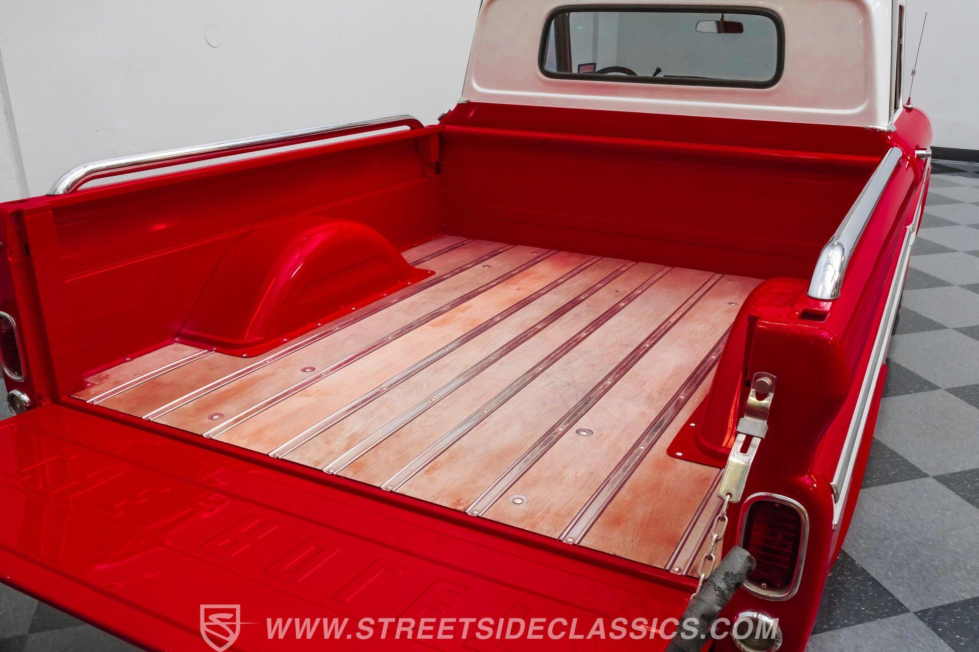 This 1966 Chevrolet C10 is a standout blend of classic style and honest muscle, restored to be driven and enjoyed. Refinished in 2014 in factory-correct Medium Red and White, the two-tone paint highlights the truck's iconic lines, accented by chrome bumpers, grille, and subtle side stripes. It sits just right with a slightly lowered factory stance, rolling on 15-inch steel wheels with hubcaps and BFGoodrich white-letter tires. Details like the wood plank bed and relocated under-bed fuel tank add both functionality and visual appeal, making this C10 as purposeful as it is eye-catching-whether it's cruising Main Street or heading out for a weekend escape.