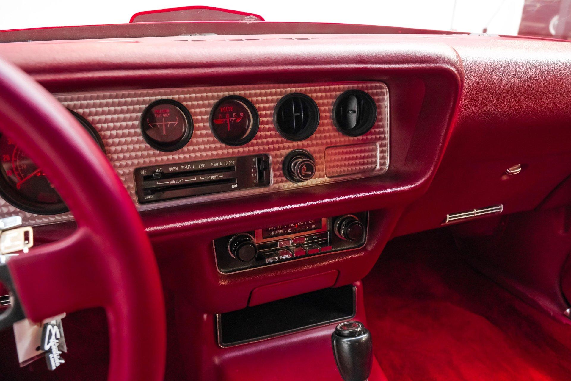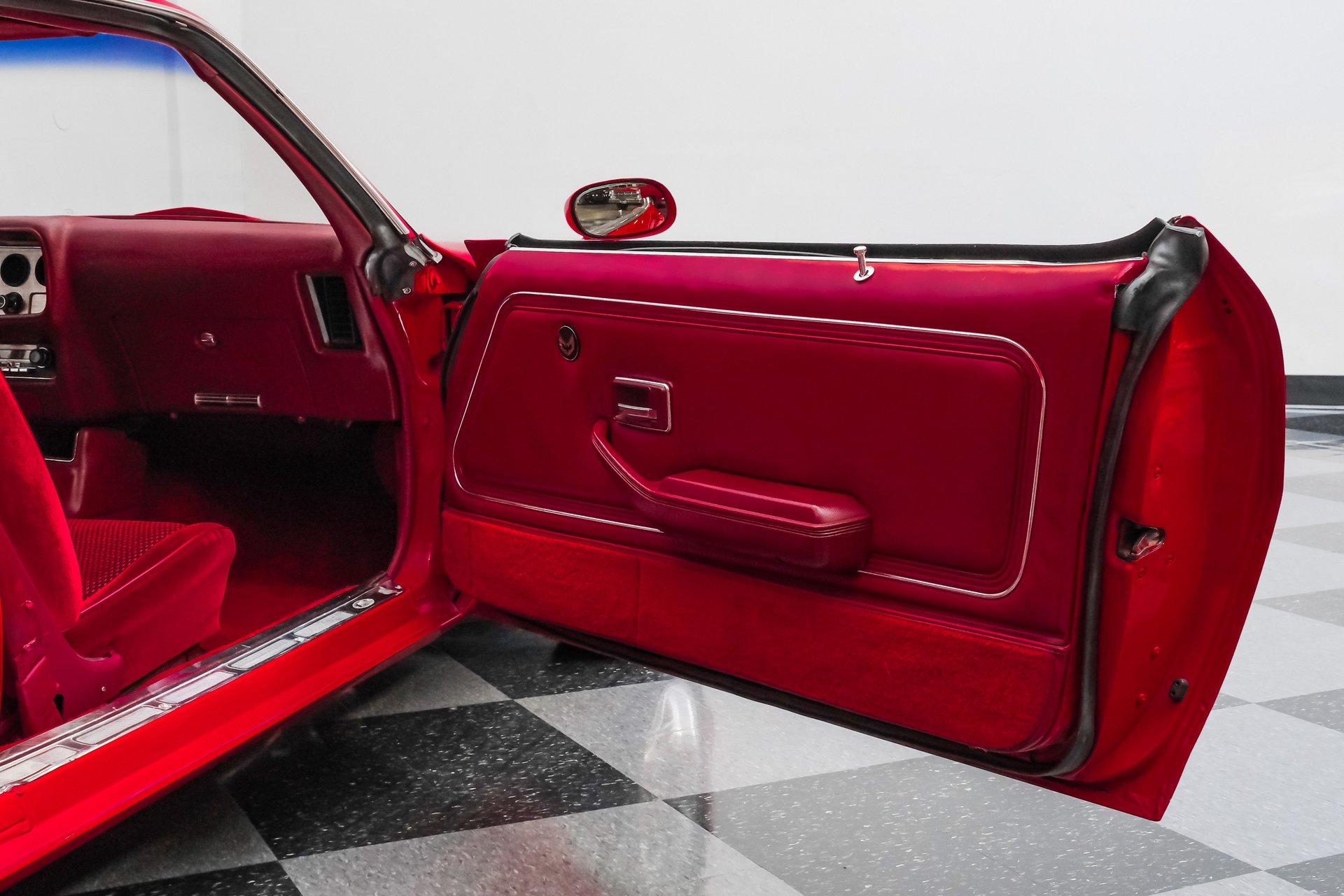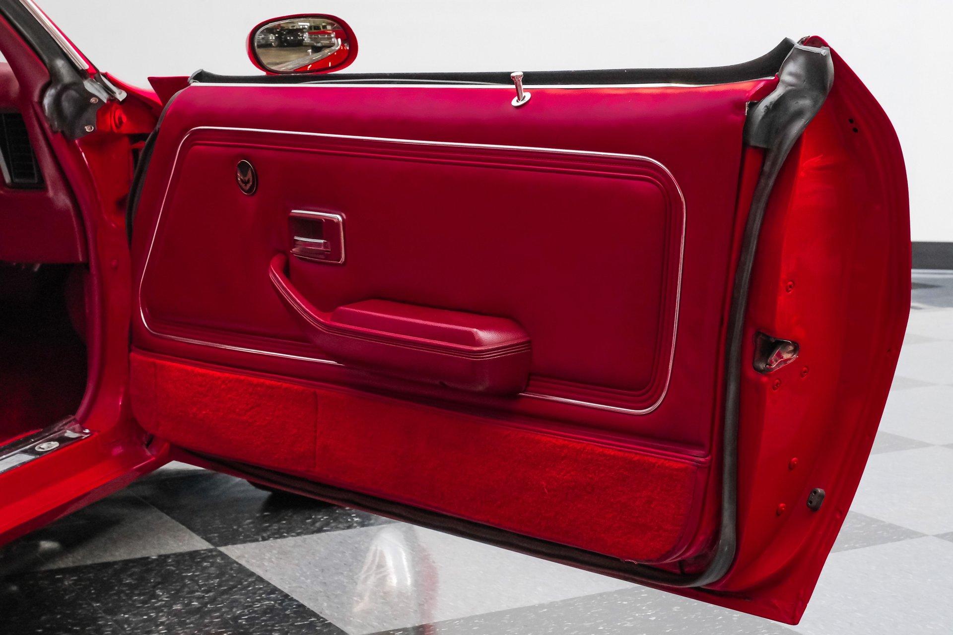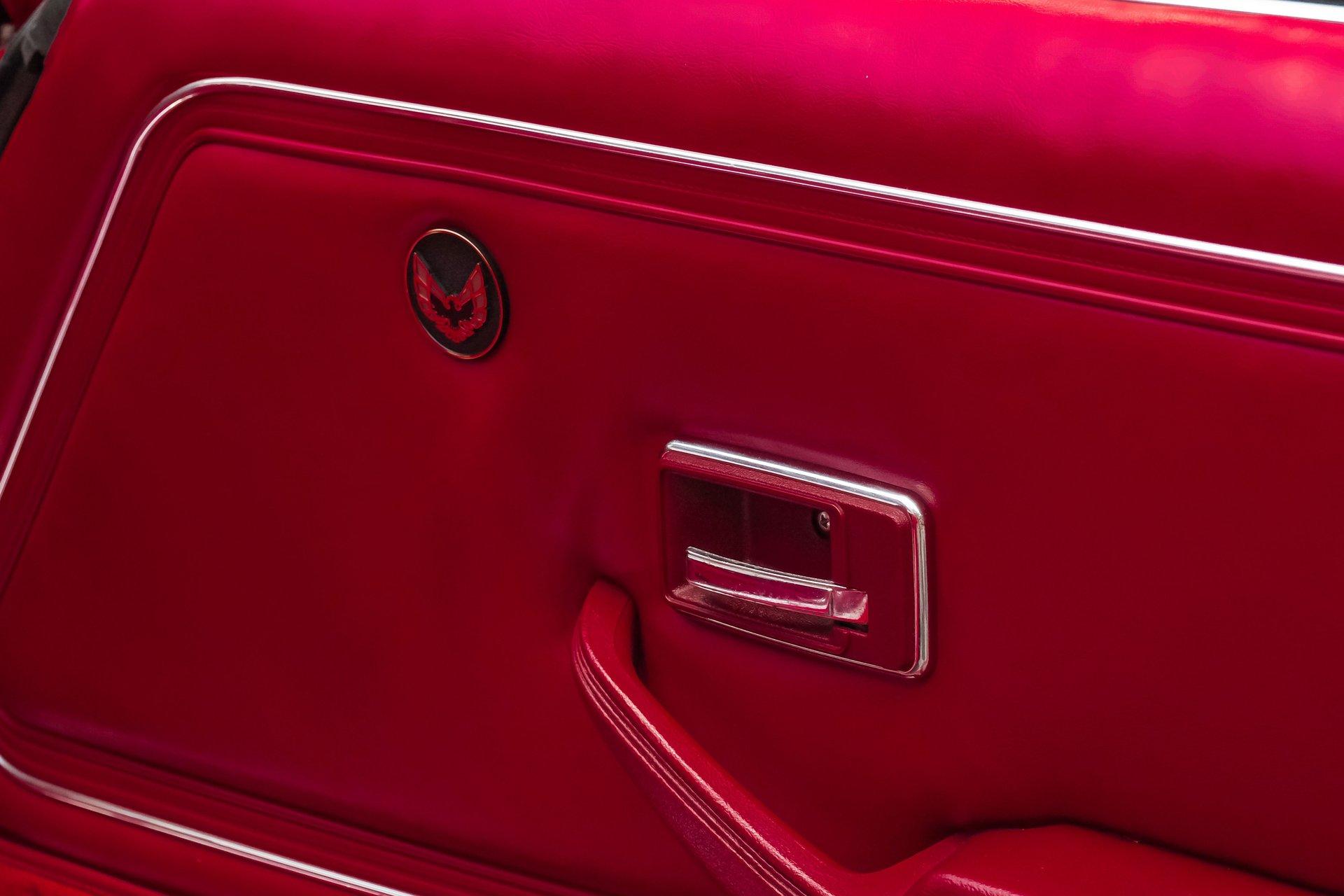 This 1979 Pontiac Firebird delivers classic American muscle with an unmistakable presence. Finished in factory correct Mayan Red and wearing proper Trans Am decals, its aggressive stance is matched by upgraded 17 inch Snowflake alloy wheels accented with chrome TA center caps and wrapped in Nitto tires. Every angle reflects the Firebird's performance driven heritage, blending vintage style with modern upgrades for a car that sounds right, looks right, and drives with the confidence of a true muscle car icon.