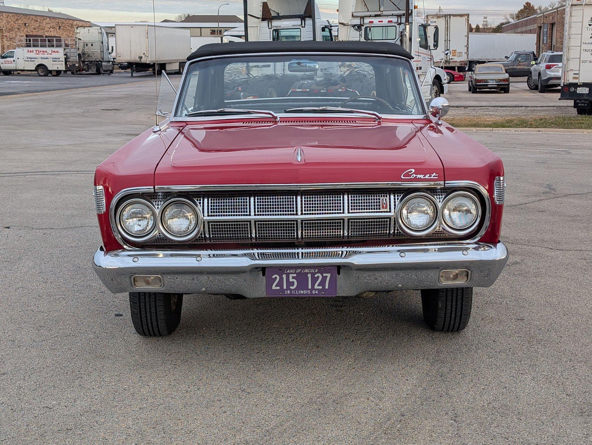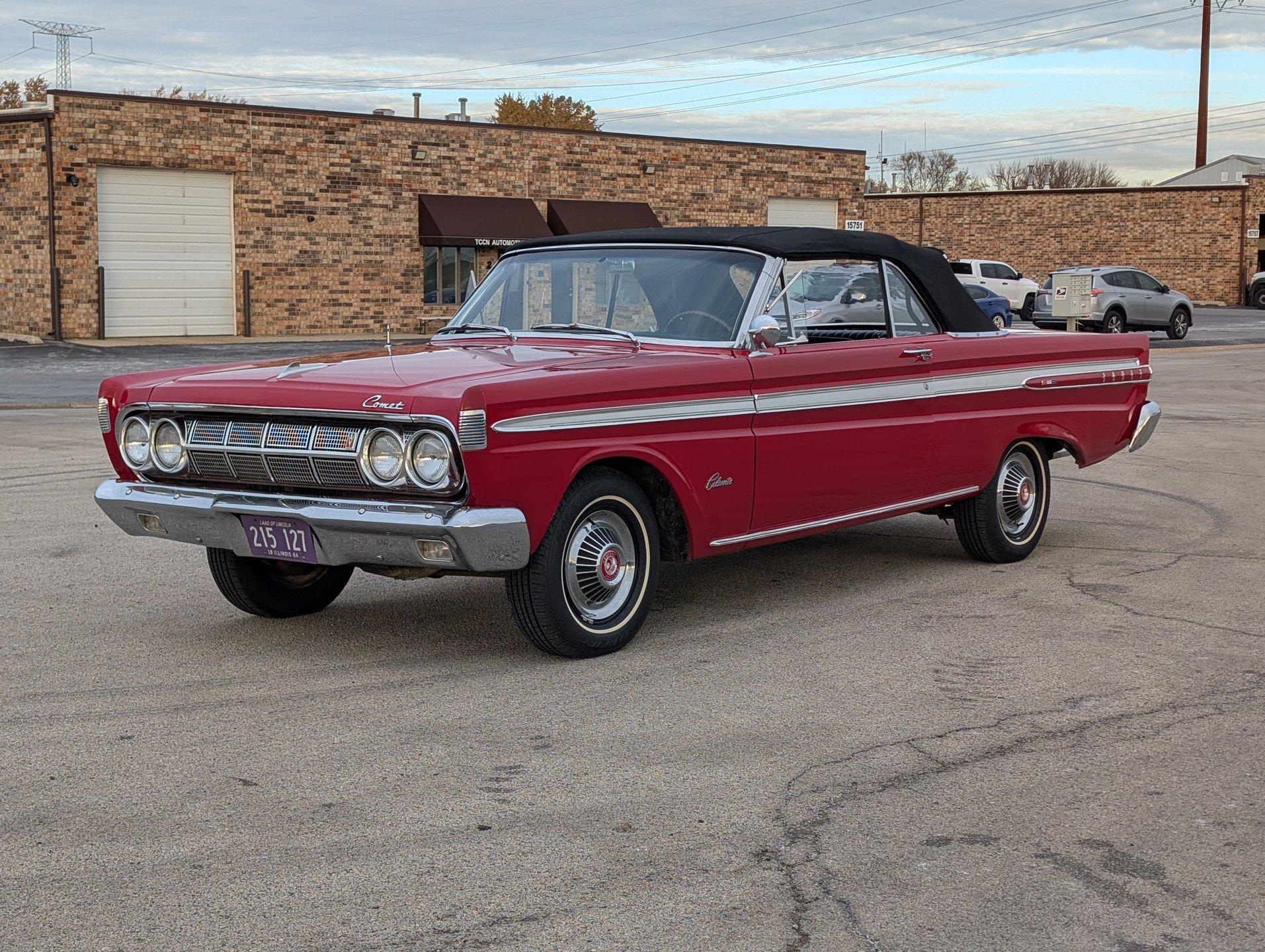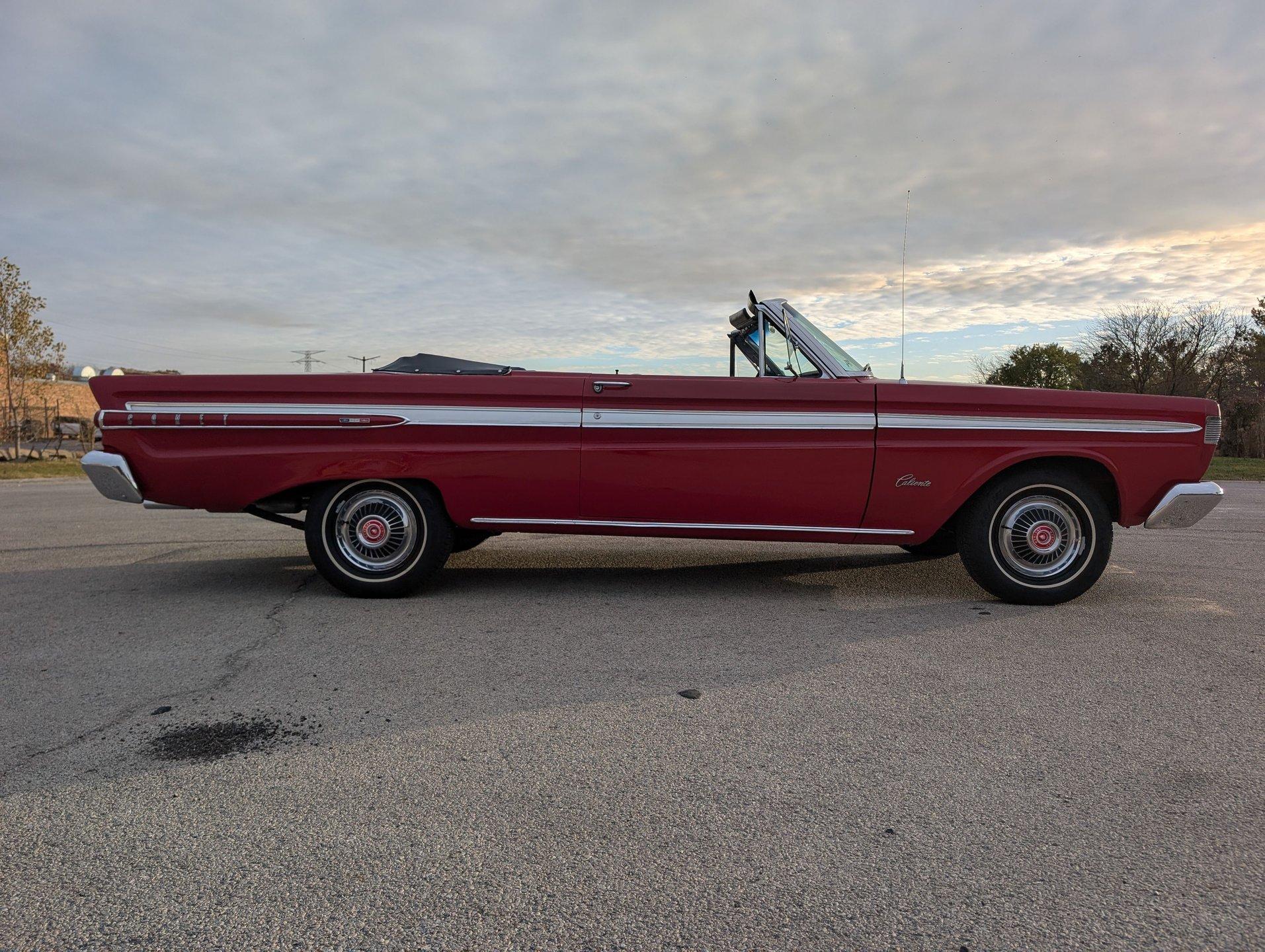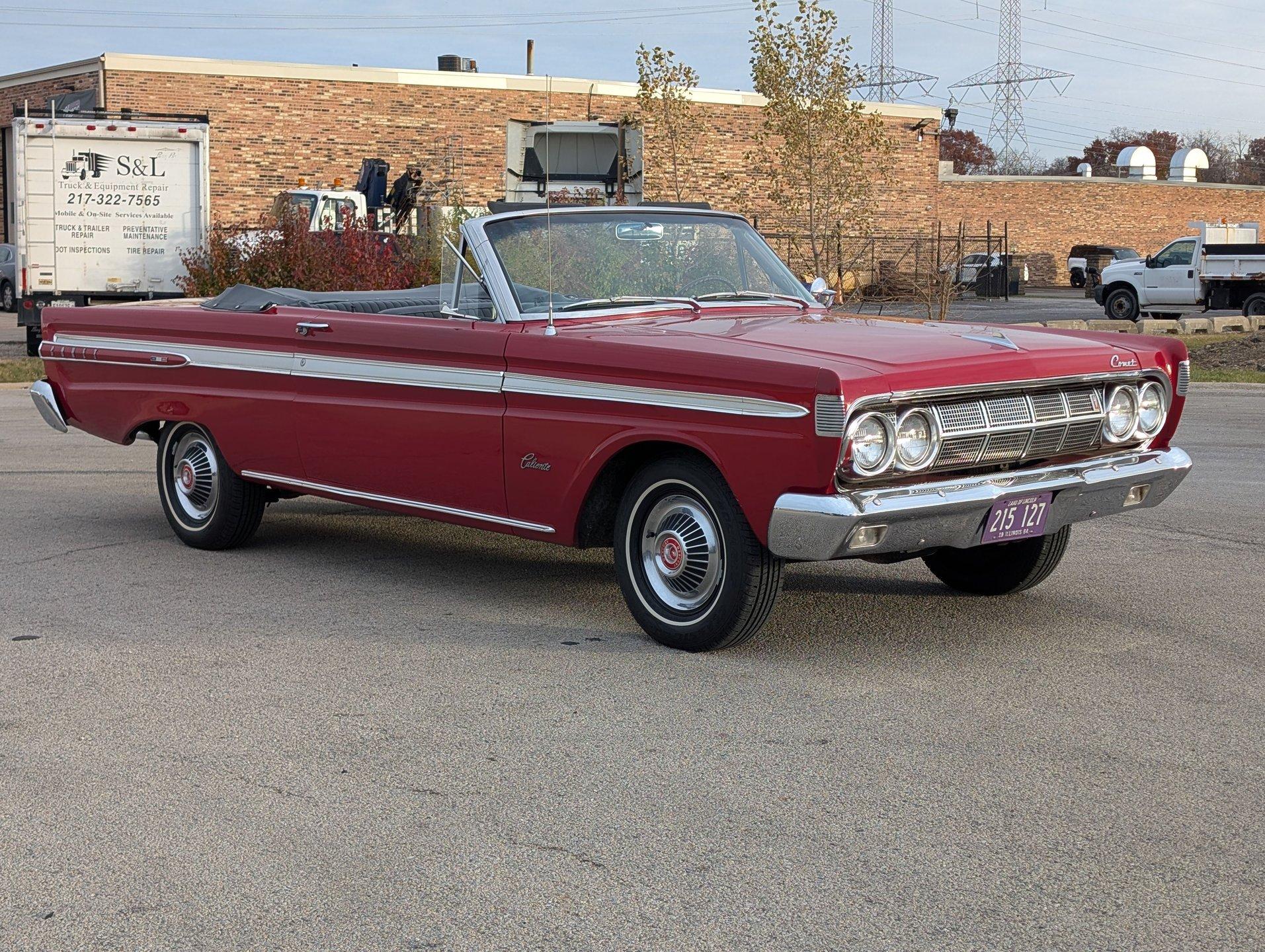 Survivor Classic Car Services Chicago is very proud to present this clean '64 Mercury Comet Caliente convertible! Under the hood sits a 260 cubic inch V8 partnered with a 3-speed automatic transmission. The bright red paint is laid down clean and even, and the convertible top looks brand new! Slide into the bench seat and feel the comfort of the new foam padding giving plenty of support! The door panels have been replaced with beautiful two-tone pieces in black and red that really make the interior pop! Recent mechanical work included a new oil pan gasket and transmission pan gasket to eliminate leaks. The engine fires up easily and is ready for a long haul at a moments notice! A new windshield was fitted to make sure that the view ahead is always crystal clear!
