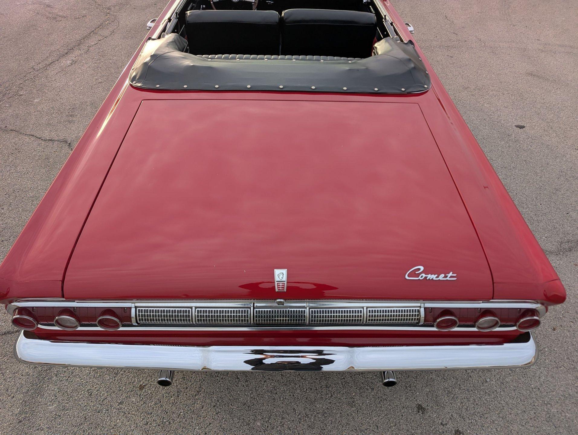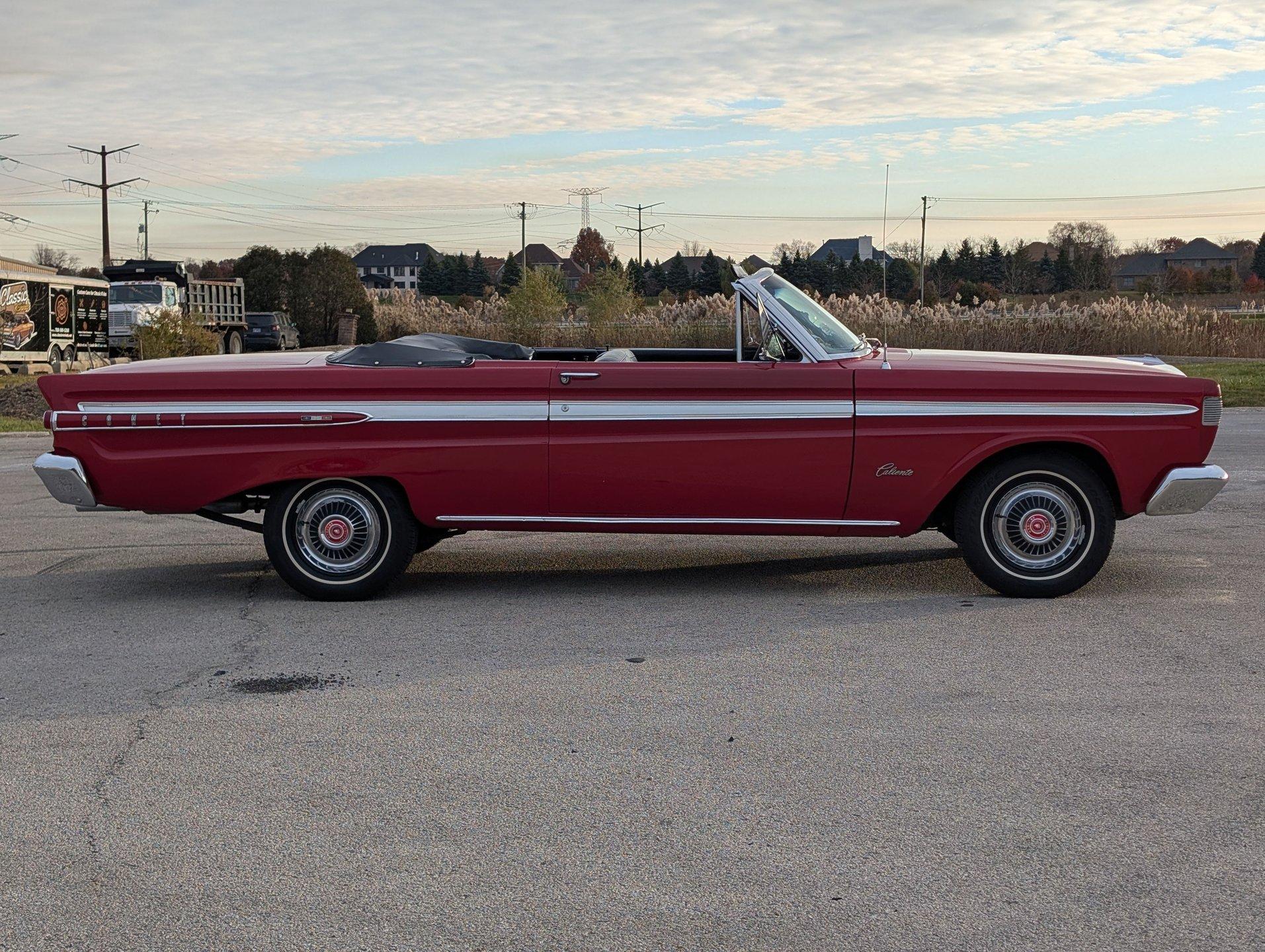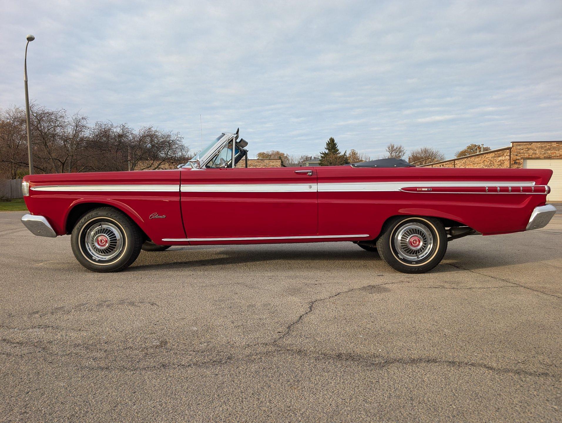 Survivor Classic Car Services Chicago is very proud to present this clean '64 Mercury Comet Caliente convertible! Under the hood sits a 260 cubic inch V8 partnered with a 3-speed automatic transmission. The bright red paint is laid down clean and even, and the convertible top looks brand new! Slide into the bench seat and feel the comfort of the new foam padding giving plenty of support! The door panels have been replaced with beautiful two-tone pieces in black and red that really make the interior pop! Recent mechanical work included a new oil pan gasket and transmission pan gasket to eliminate leaks. The engine fires up easily and is ready for a long haul at a moments notice! A new windshield was fitted to make sure that the view ahead is always crystal clear!