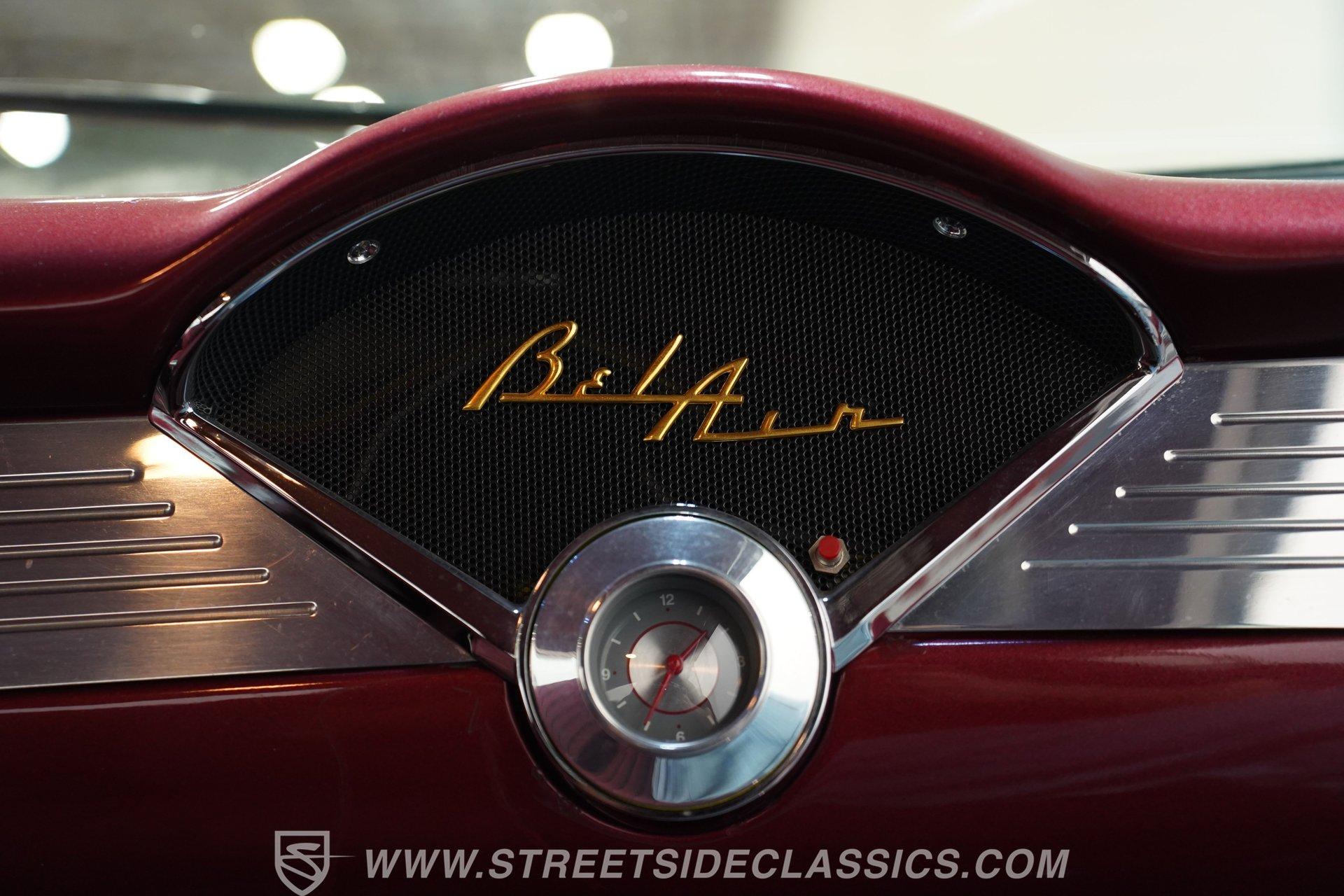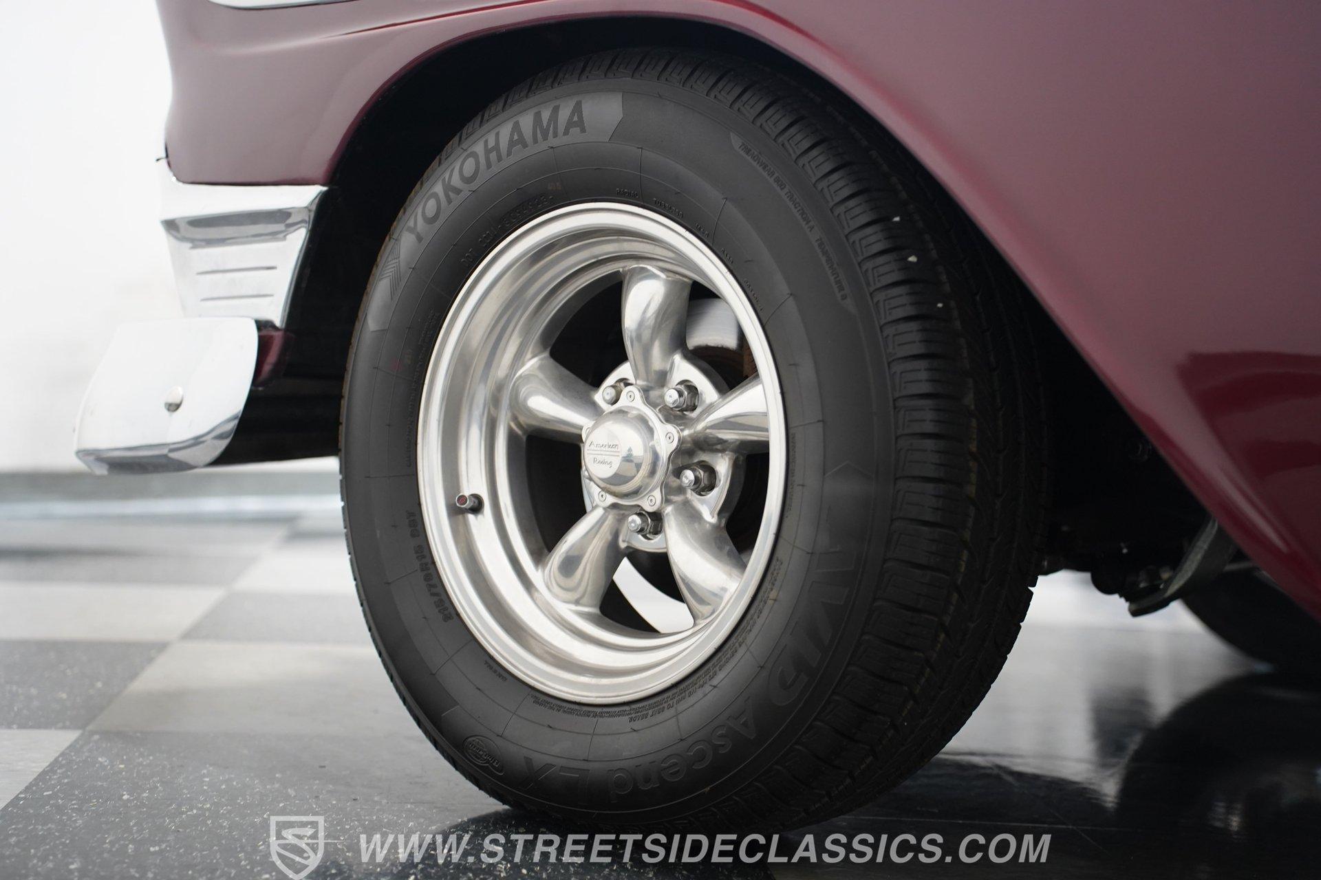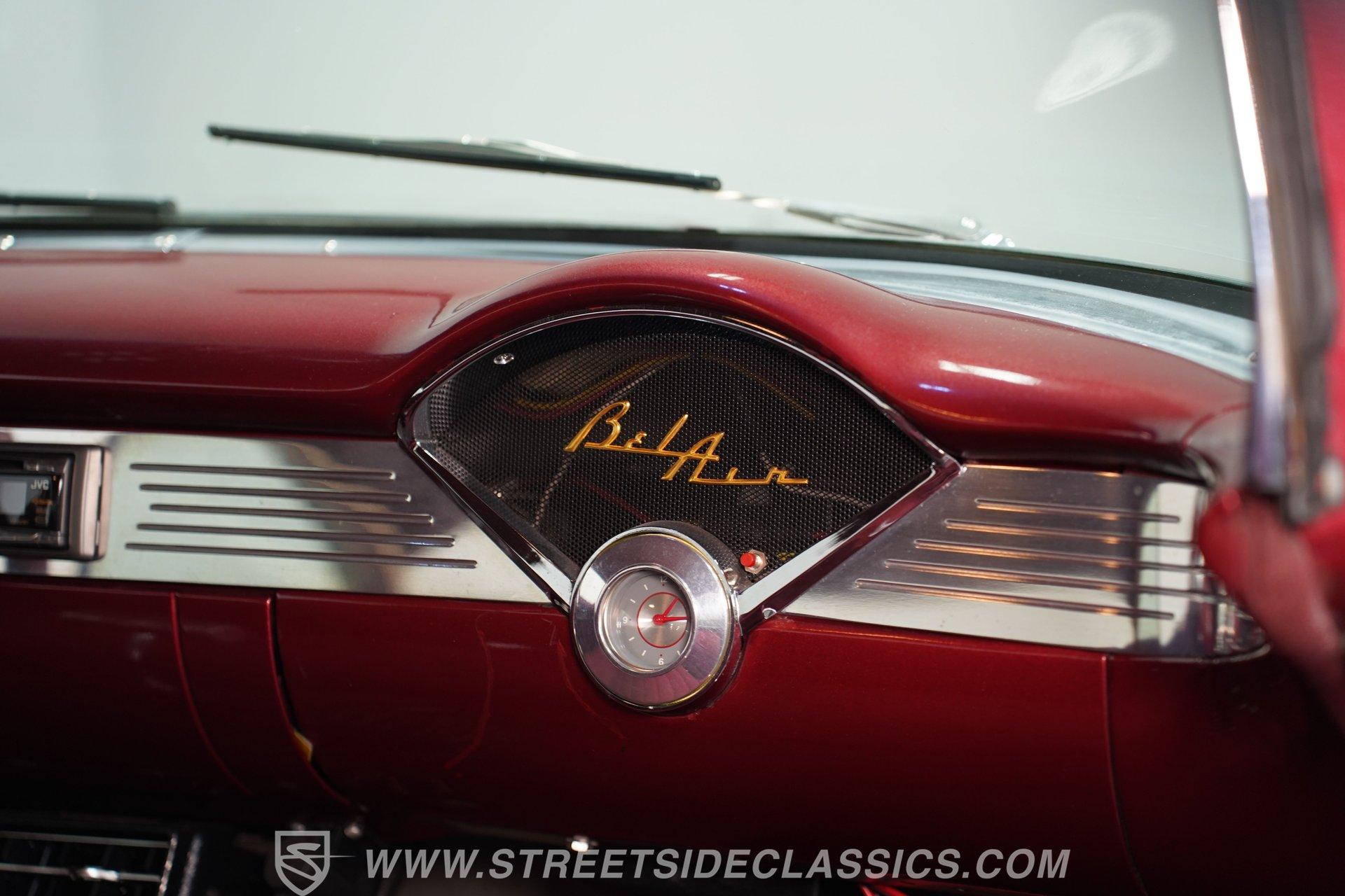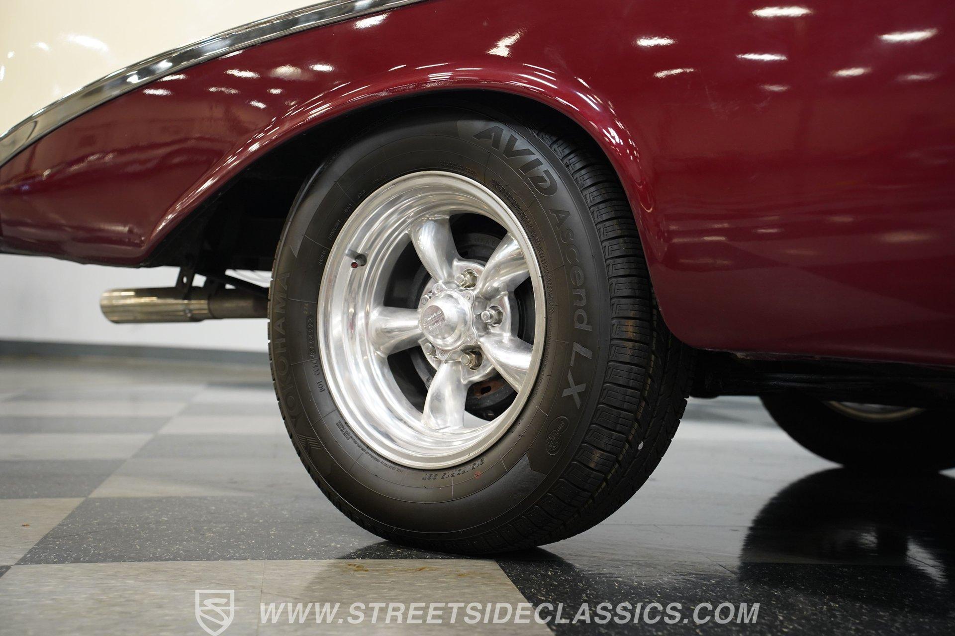 Under the hood, you'll find a robust 327 V8 engine, featuring an Edelbrock 4-barrel carburetor and an Edelbrock intake for enhanced performance. The engine bay sports plenty of chrome accessories, an aluminum radiator and electric fans, complemented by an upgraded ignition system and aftermarket air conditioning. This Bel Air is paired with a 5-speed manual transmission delivering smooth shifts and a confident drive. Headers flow back through rumbling Flowmaster mufflers to create a muscular exhaust note. Power front disc brakes and rear drums provide reliable stopping power, while the suspension with tubular front control arms maintains a raked and slightly lowered stance on polished American Racing Torq Thrust wheels wrapped in performance tires.