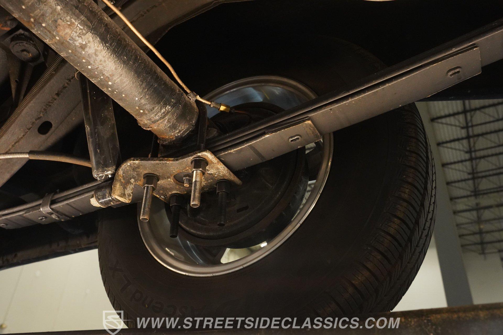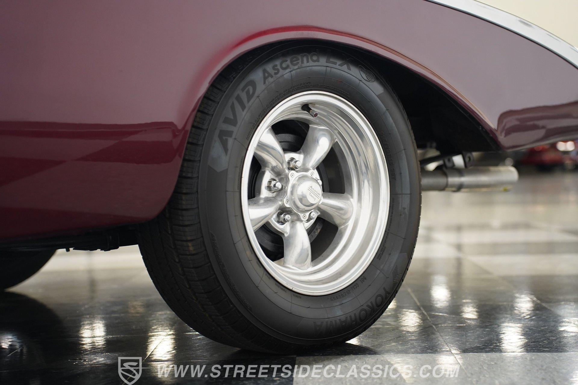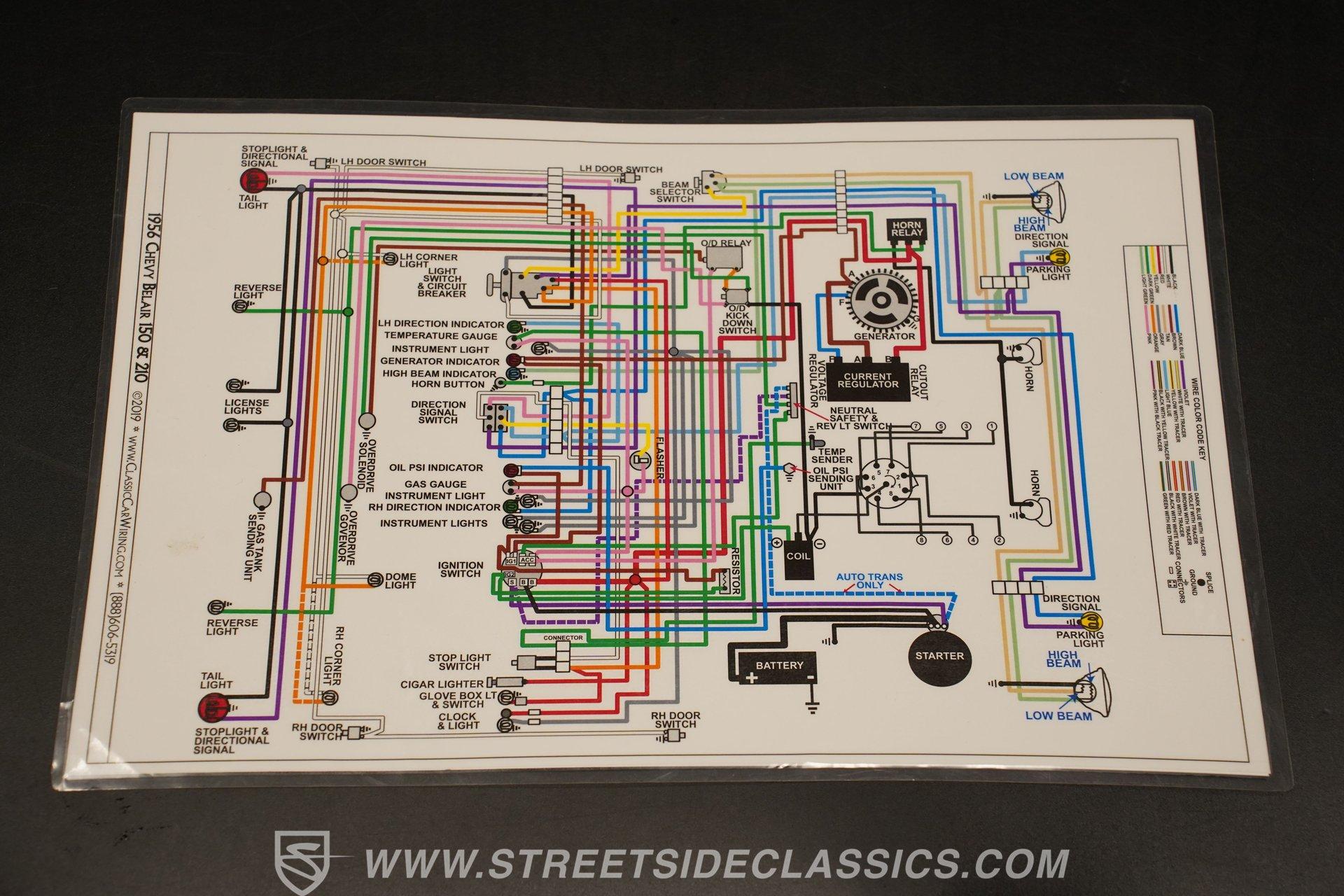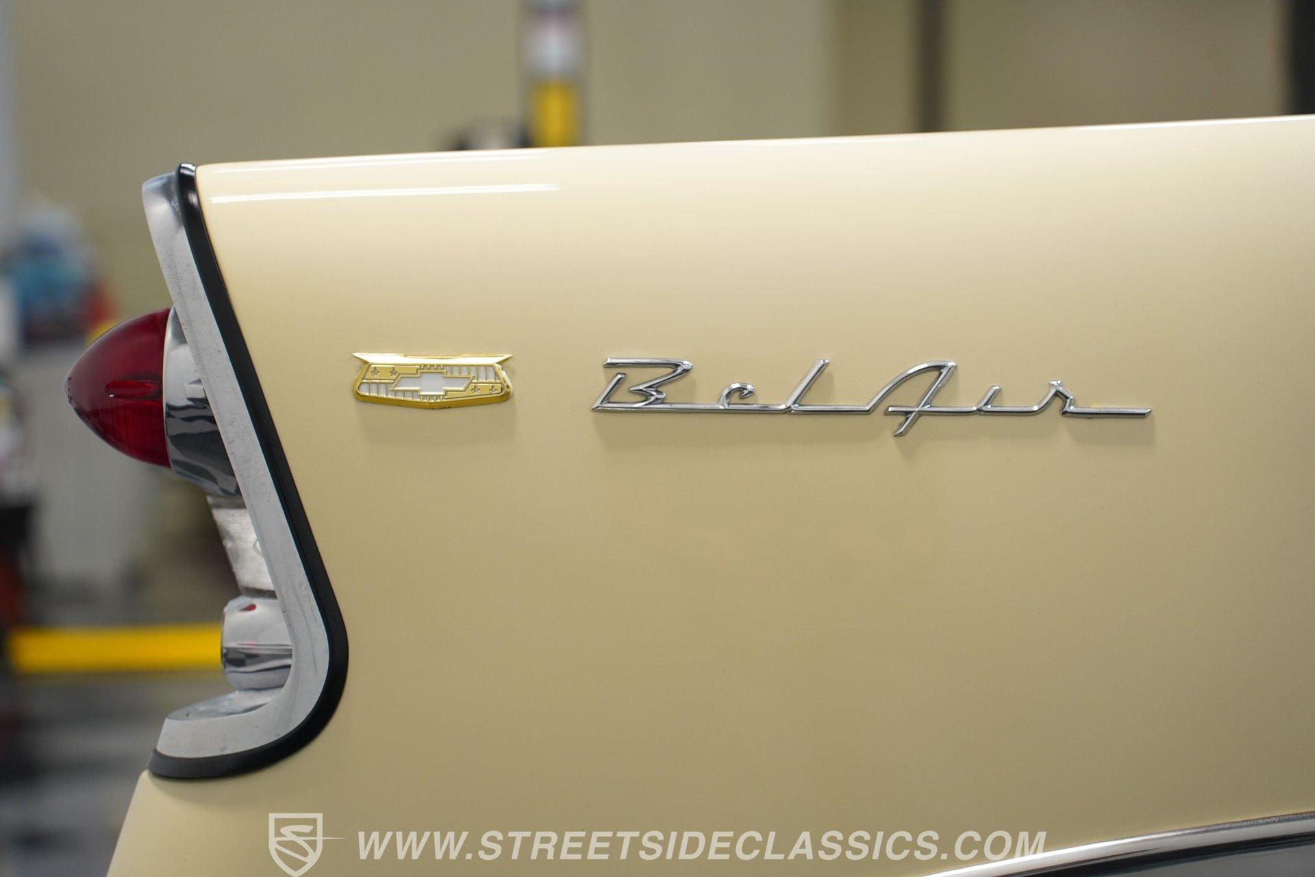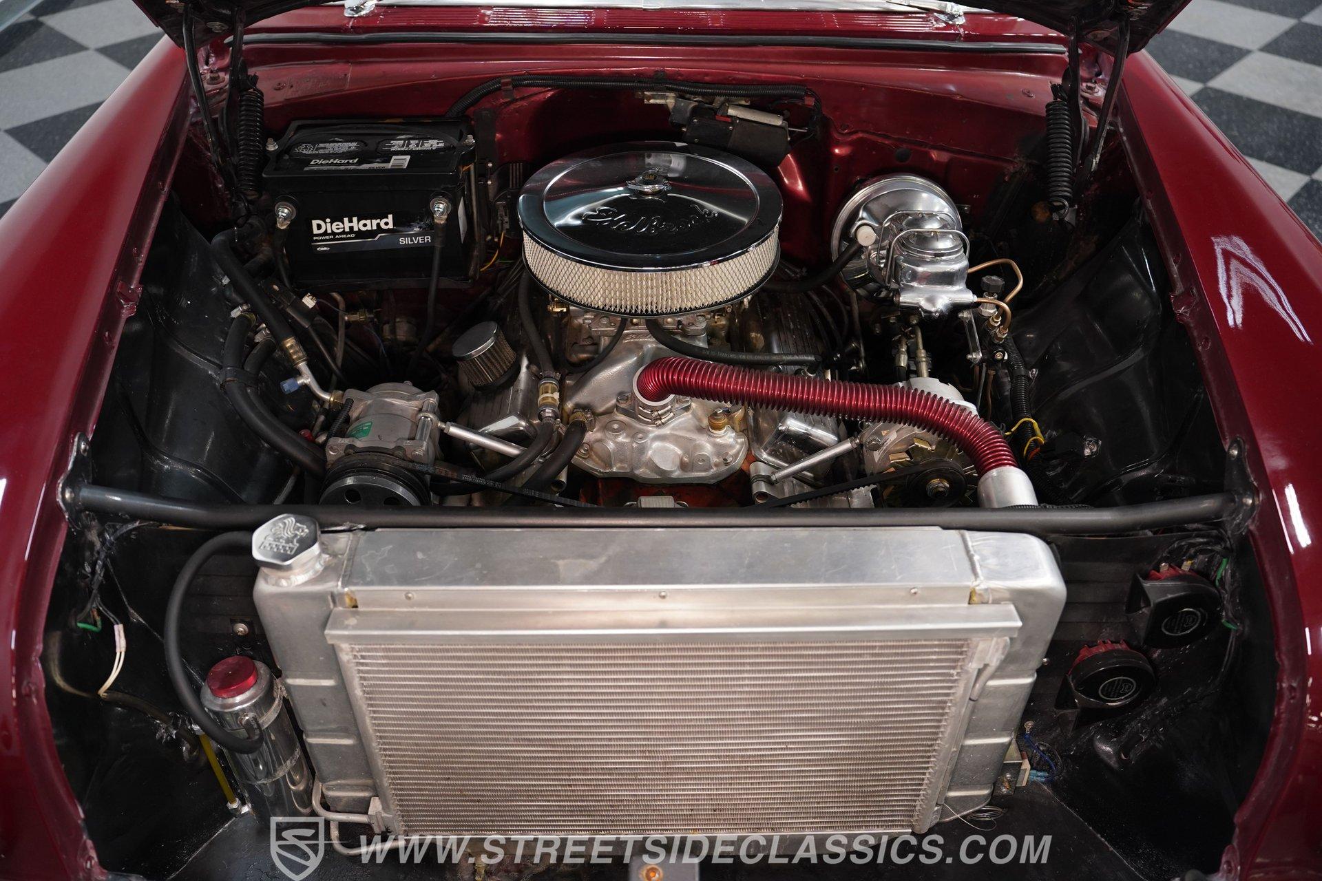 Under the hood, you'll find a robust 327 V8 engine, featuring an Edelbrock 4-barrel carburetor and an Edelbrock intake for enhanced performance. The engine bay sports plenty of chrome accessories, an aluminum radiator and electric fans, complemented by an upgraded ignition system and aftermarket air conditioning. This Bel Air is paired with a 5-speed manual transmission delivering smooth shifts and a confident drive. Headers flow back through rumbling Flowmaster mufflers to create a muscular exhaust note. Power front disc brakes and rear drums provide reliable stopping power, while the suspension with tubular front control arms maintains a raked and slightly lowered stance on polished American Racing Torq Thrust wheels wrapped in performance tires.