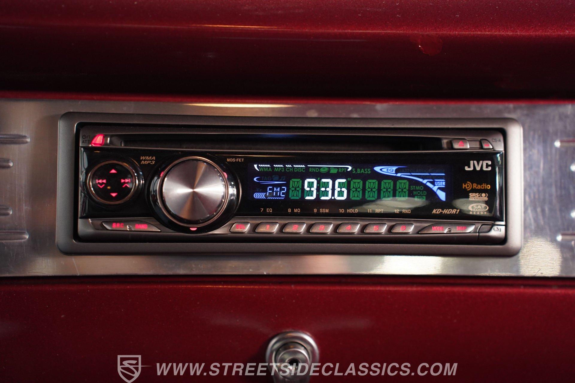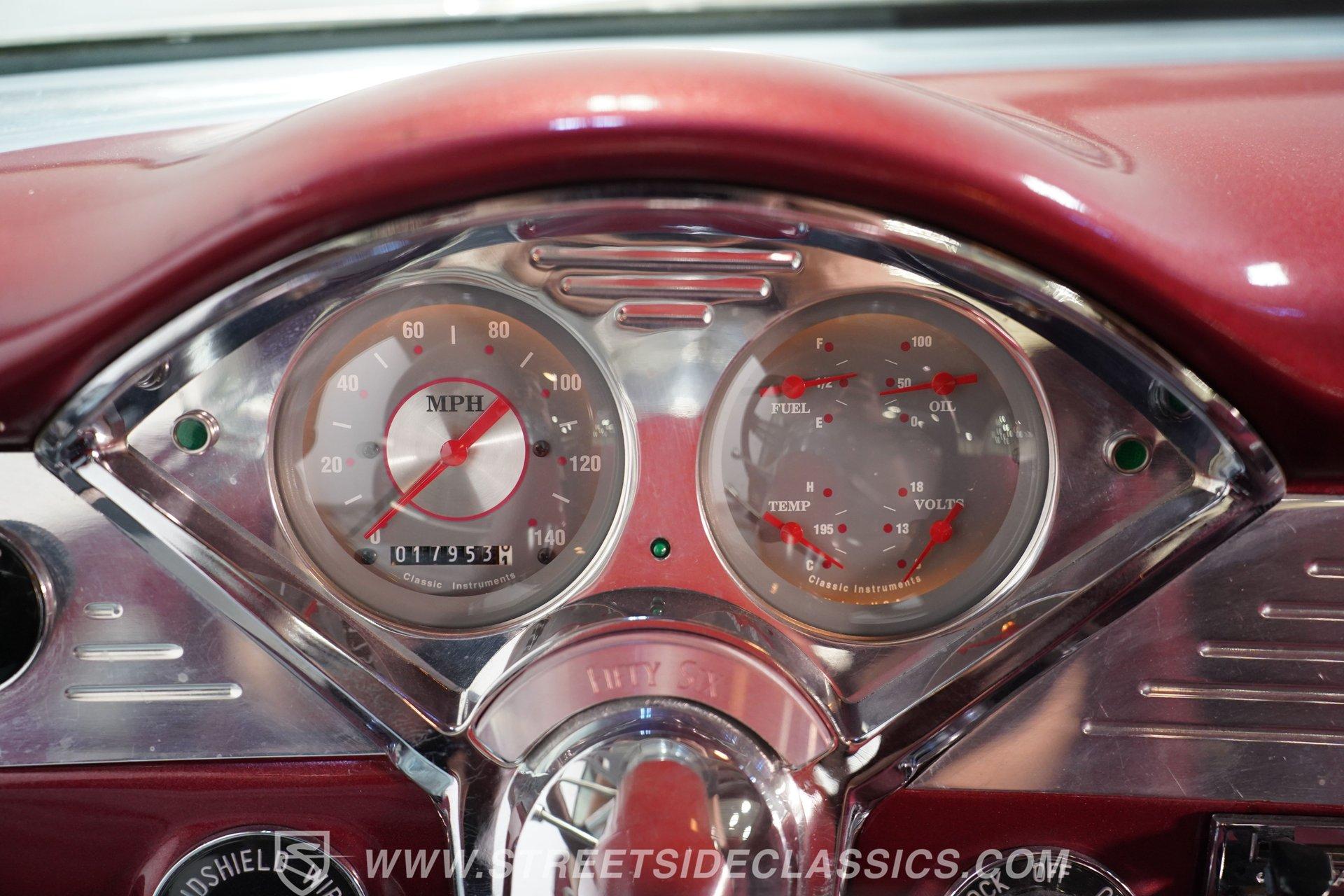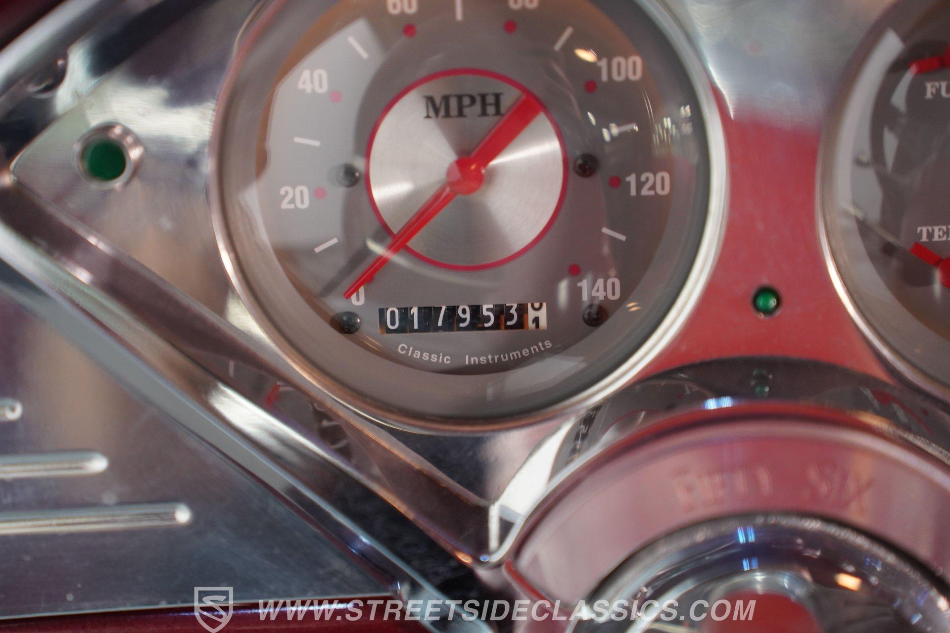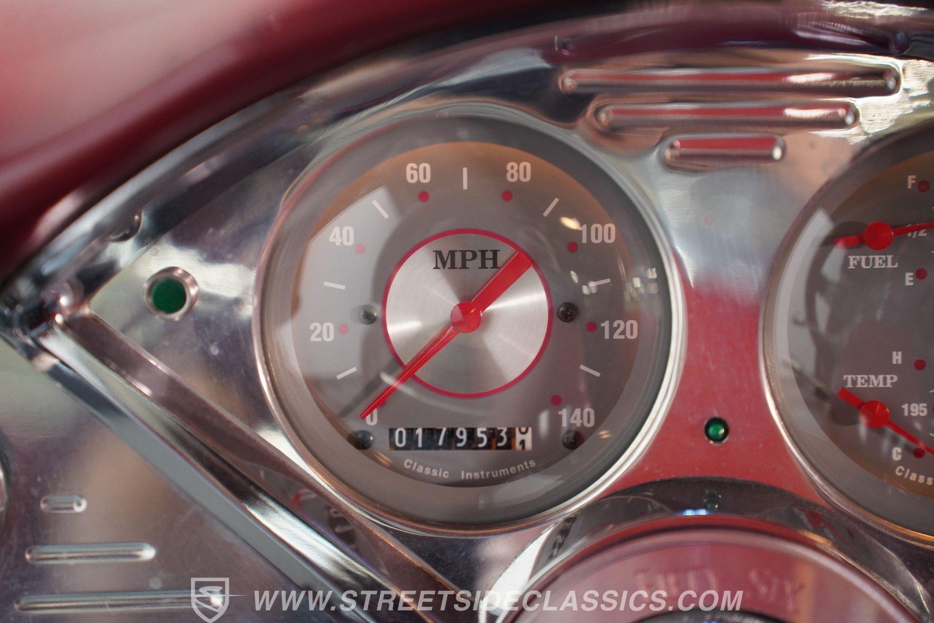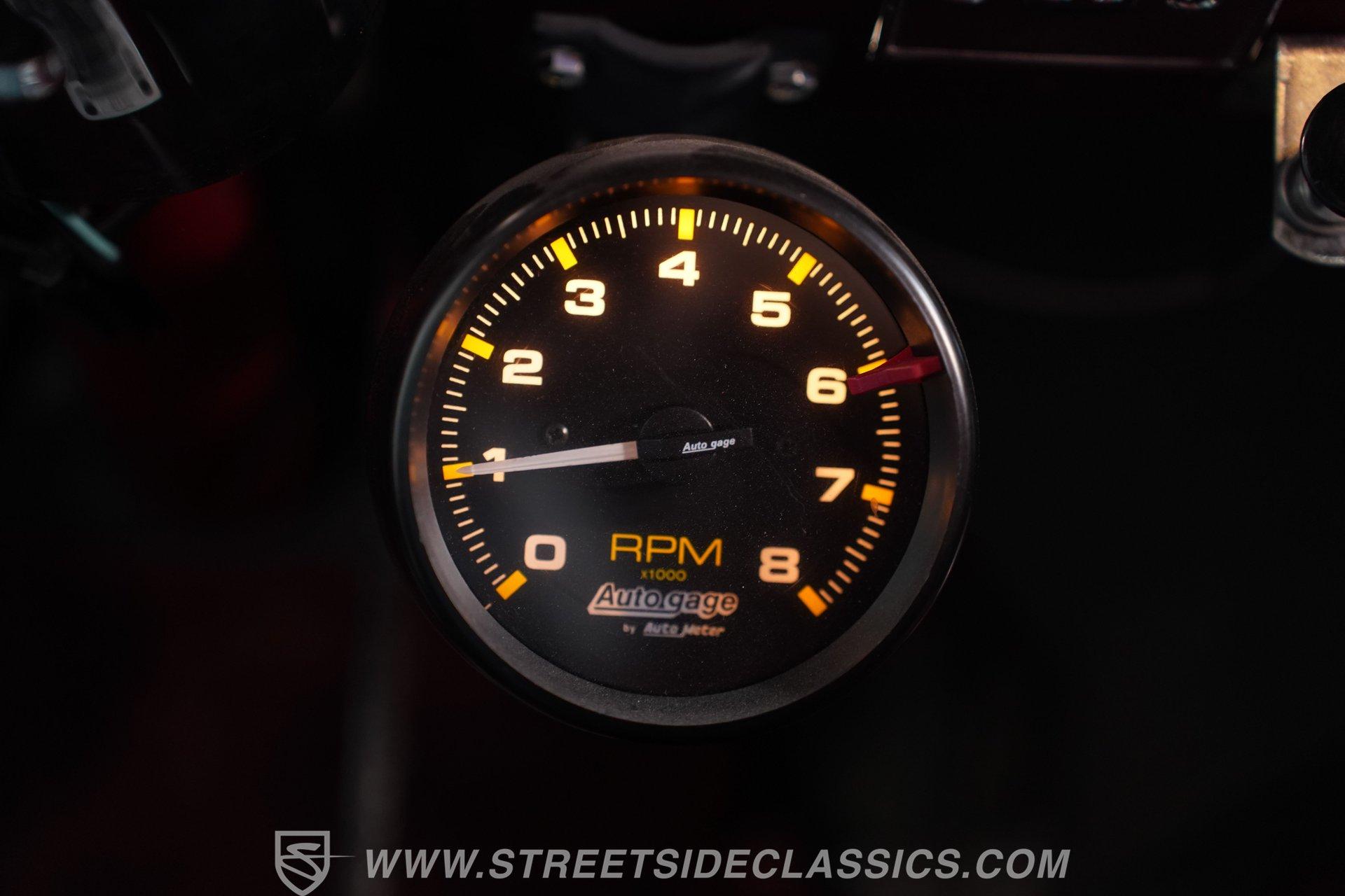 Inside, the comfortable cloth interior continues the rich maroon of the exterior, offering a retro yet comfortable driving experience. The cabin is equipped with an Ididit tilt steering column, custom 4-spoke billet steering wheel, front seatbelts, Classic Instruments gauges, Autogauge tachometer, cold air conditioning, and a Hurst floor shifter for the 5-speed transmission. Chrome accents, billet dash trim and a JVC AM/FM/CD radio with quality speakers complete the vintage yet functional interior, making every ride enjoyable.