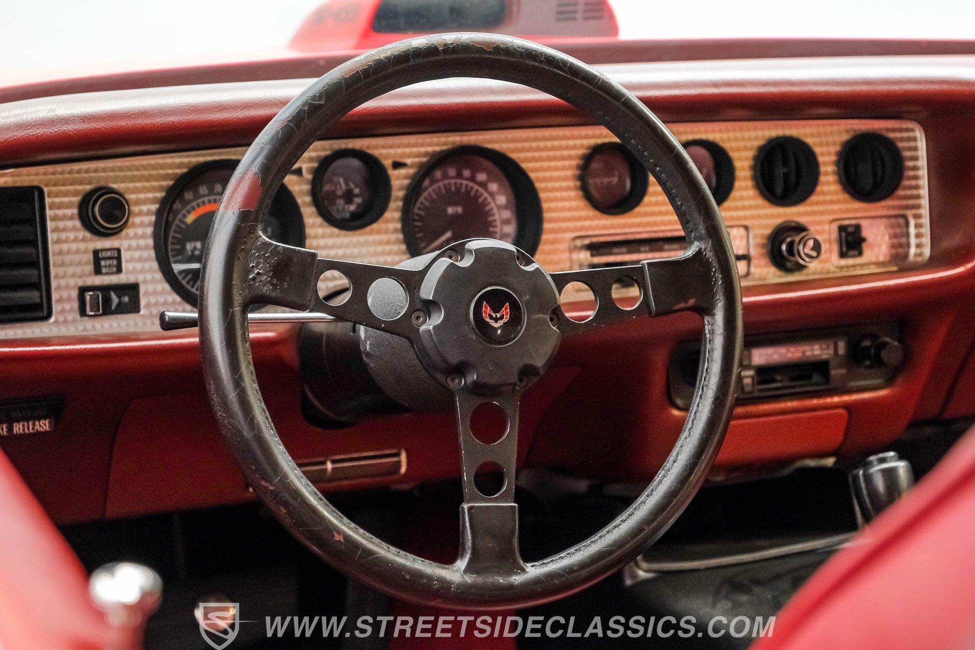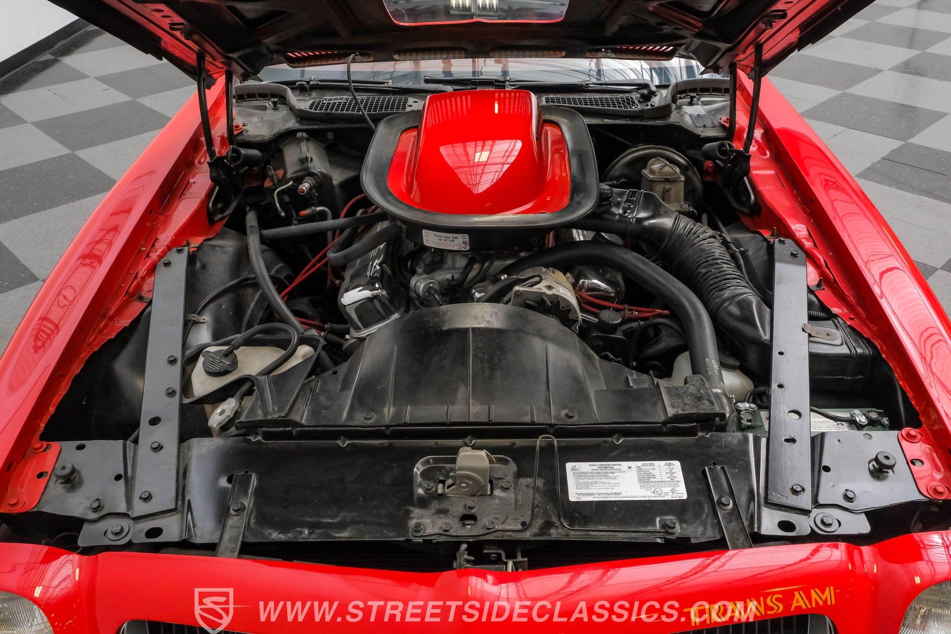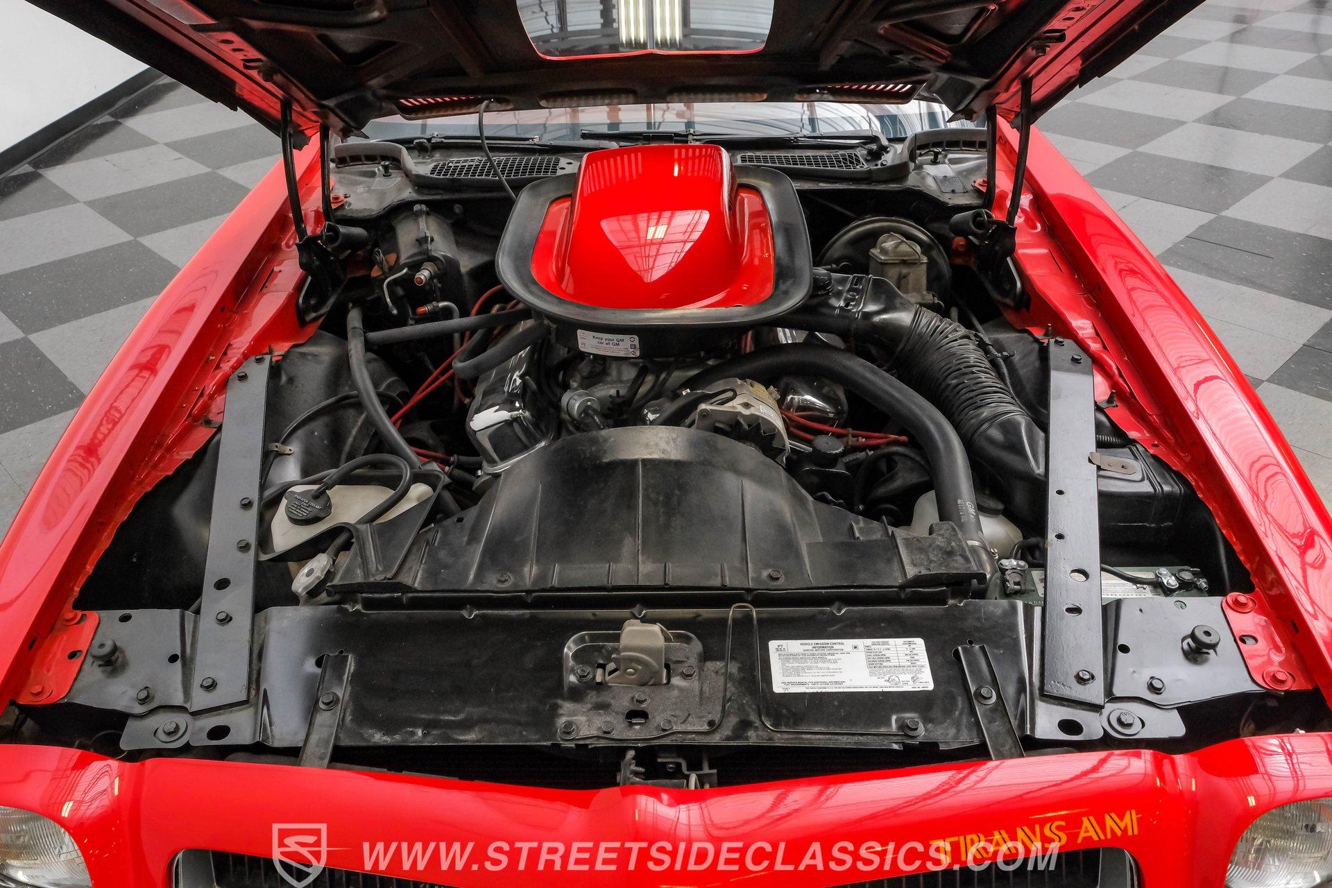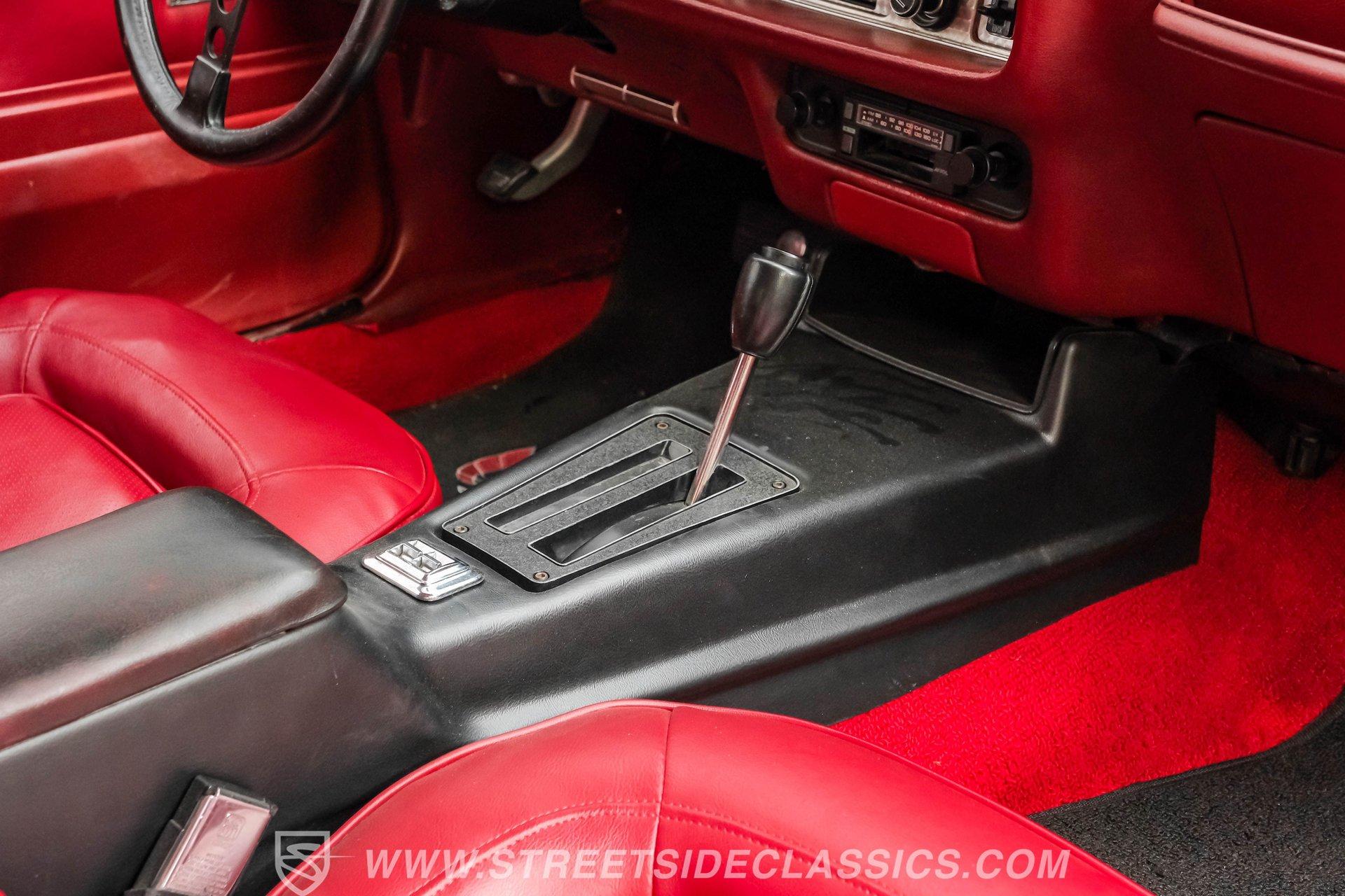 What hustles this classic sports car down the road is a 455 cubic-inch V8. To add extra power, Edelbrock aluminum heads, an Edelbrock intake manifold, and a 4-barrel carburetor have been installed. To handle that horsepower and torque, the Trans Am is equipped with a TH400 3-speed automatic transmission. The front suspension does its job with coil springs, shocks, and a sway bar, while the rear uses leaf springs with shocks and a sway bar. The 15-inch honeycomb-style wheels are wrapped in 245/60R14 front tires and 275/60R15 tires at the rear. These bolt up to power front disc brakes and rear power drum brakes. And for that signature Trans Am sports car sound, dual exhaust with an X-pipe and aftermarket mufflers are installed.