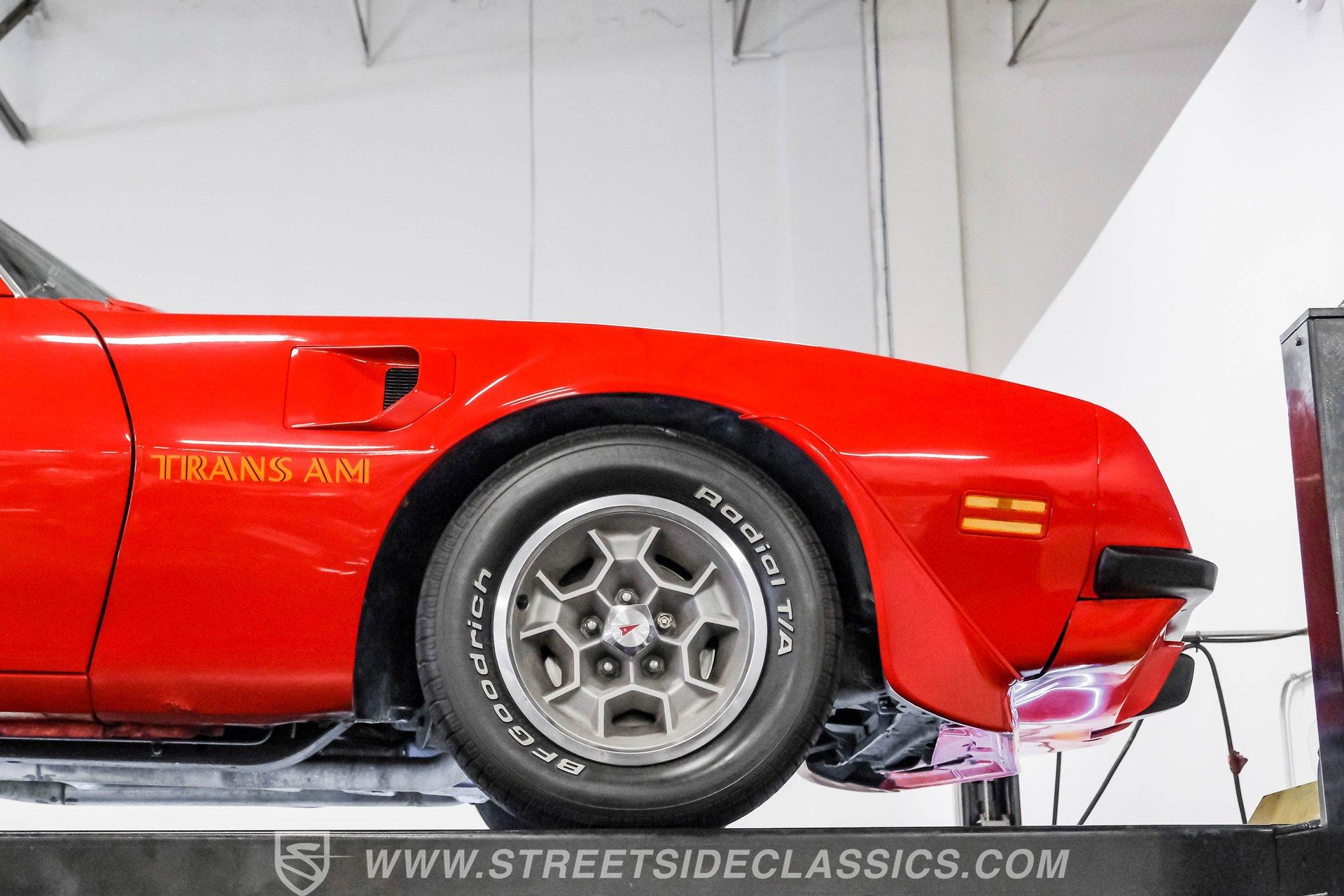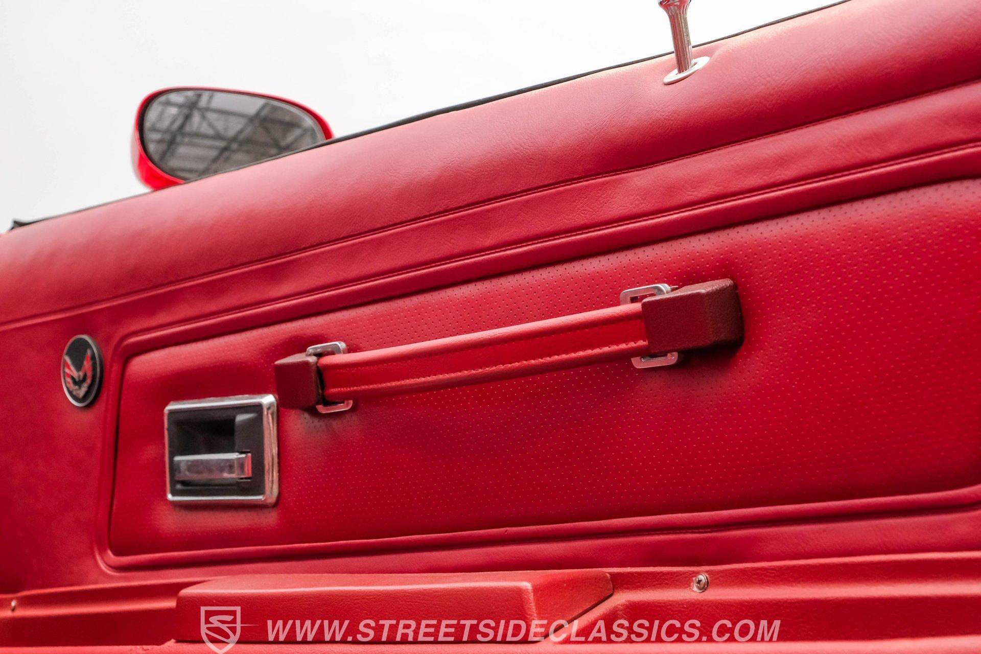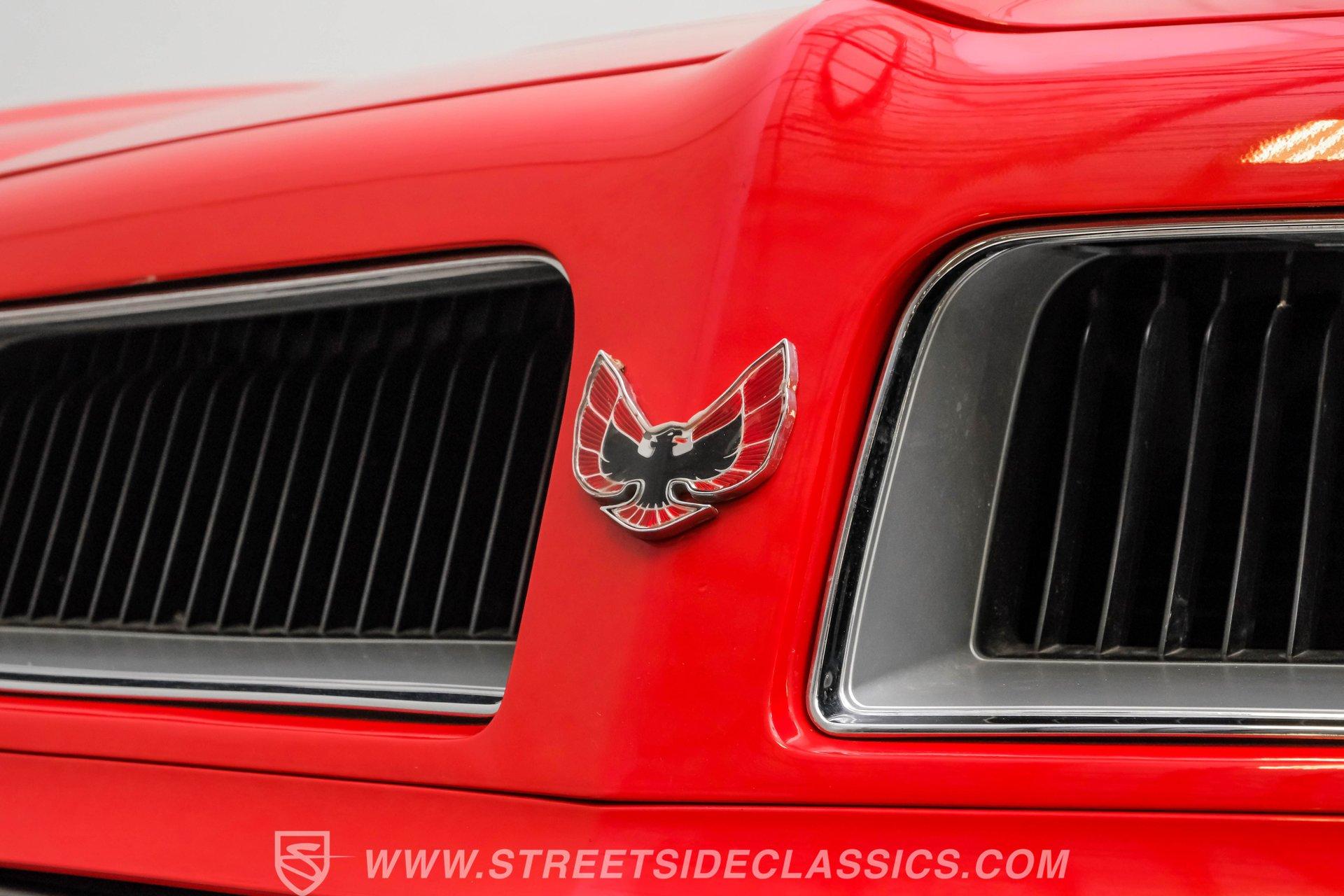 What hustles this classic sports car down the road is a 455 cubic-inch V8. To add extra power, Edelbrock aluminum heads, an Edelbrock intake manifold, and a 4-barrel carburetor have been installed. To handle that horsepower and torque, the Trans Am is equipped with a TH400 3-speed automatic transmission. The front suspension does its job with coil springs, shocks, and a sway bar, while the rear uses leaf springs with shocks and a sway bar. The 15-inch honeycomb-style wheels are wrapped in 245/60R14 front tires and 275/60R15 tires at the rear. These bolt up to power front disc brakes and rear power drum brakes. And for that signature Trans Am sports car sound, dual exhaust with an X-pipe and aftermarket mufflers are installed.