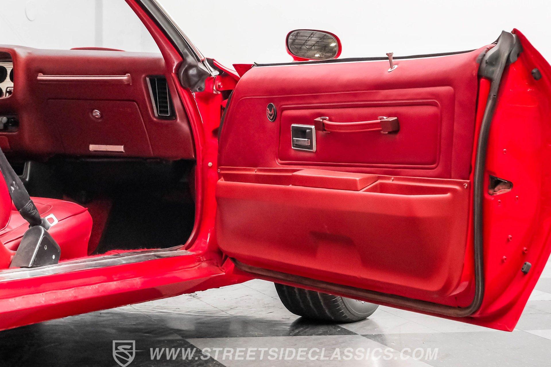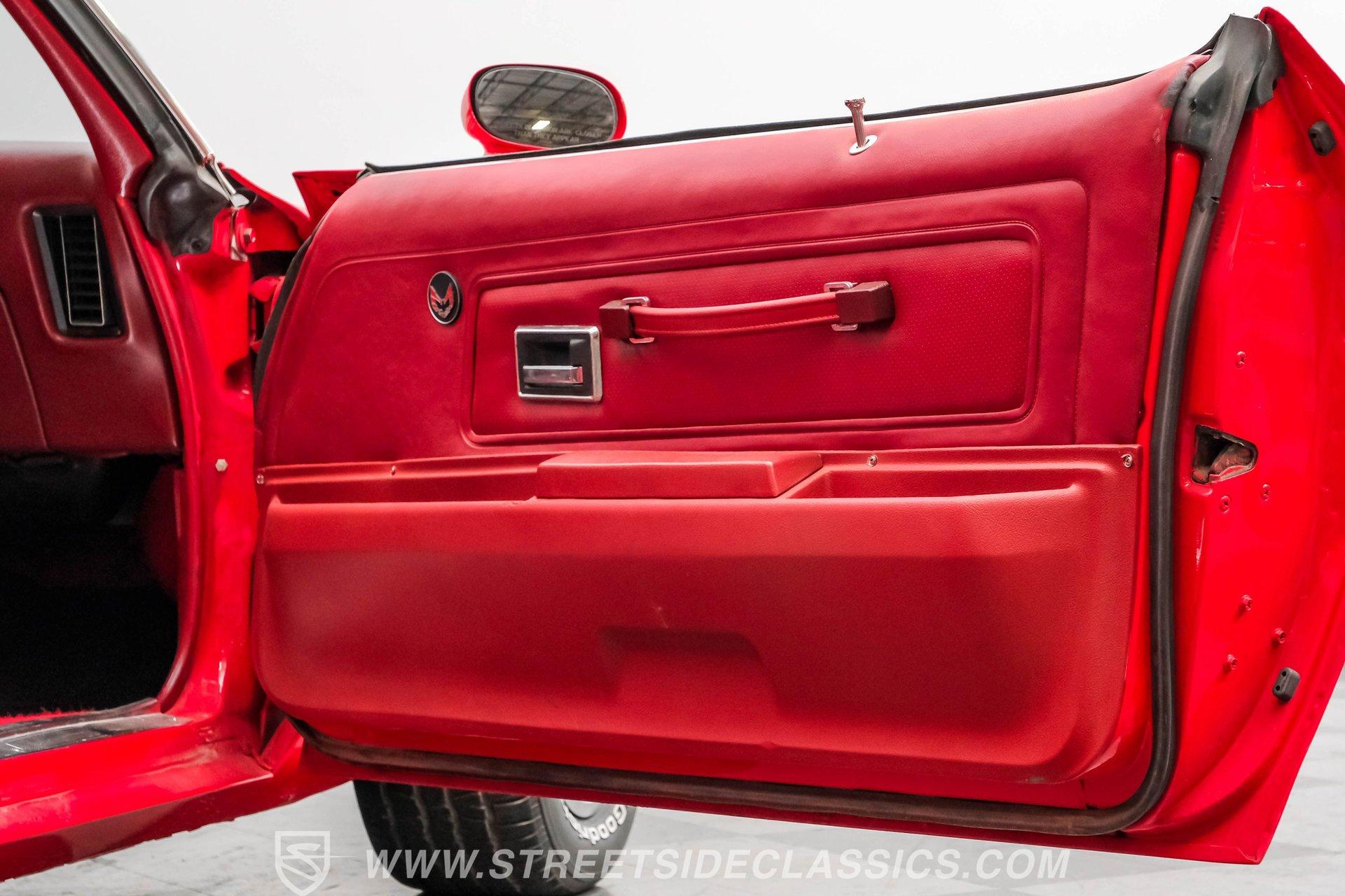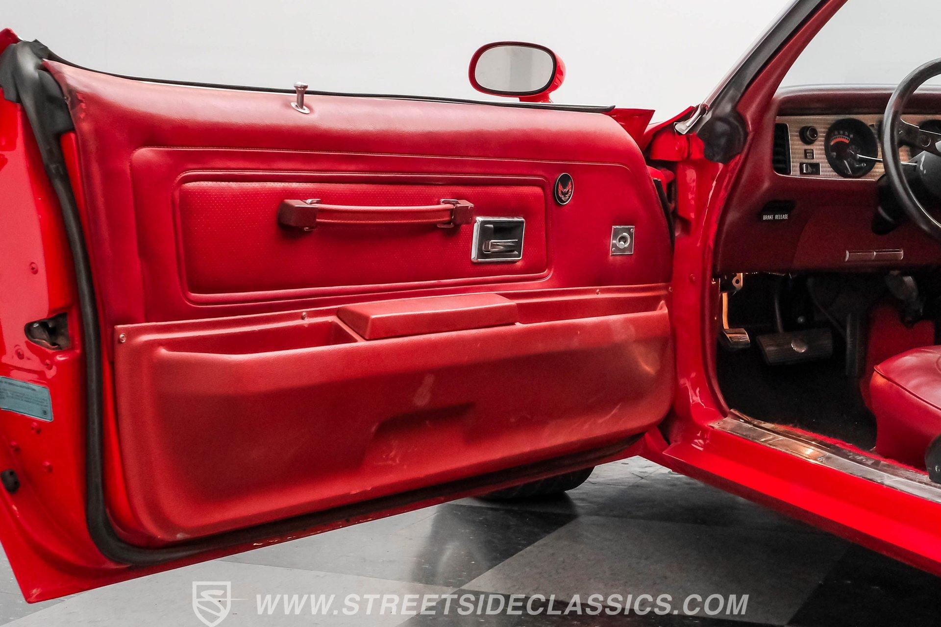 What we have here is a 1974 Pontiac Firebird Trans Am in the often sought-after Buccaneer Red color. This muscle car is complete with the big Firebird decal on the hood, the shaker hood scoop, and the desirable big block engine. The unique honeycomb wheels are also highly desirable, and the lower front spoiler, rear spoiler, fender vents, and quarter-panel ground-effects are what make people fall in love with these Trans Ams. Door jambs, weather stripping, and windows all appear to be in good shape, and the trunk and deck lid look clean, giving you a nice place for cargo in this small car.