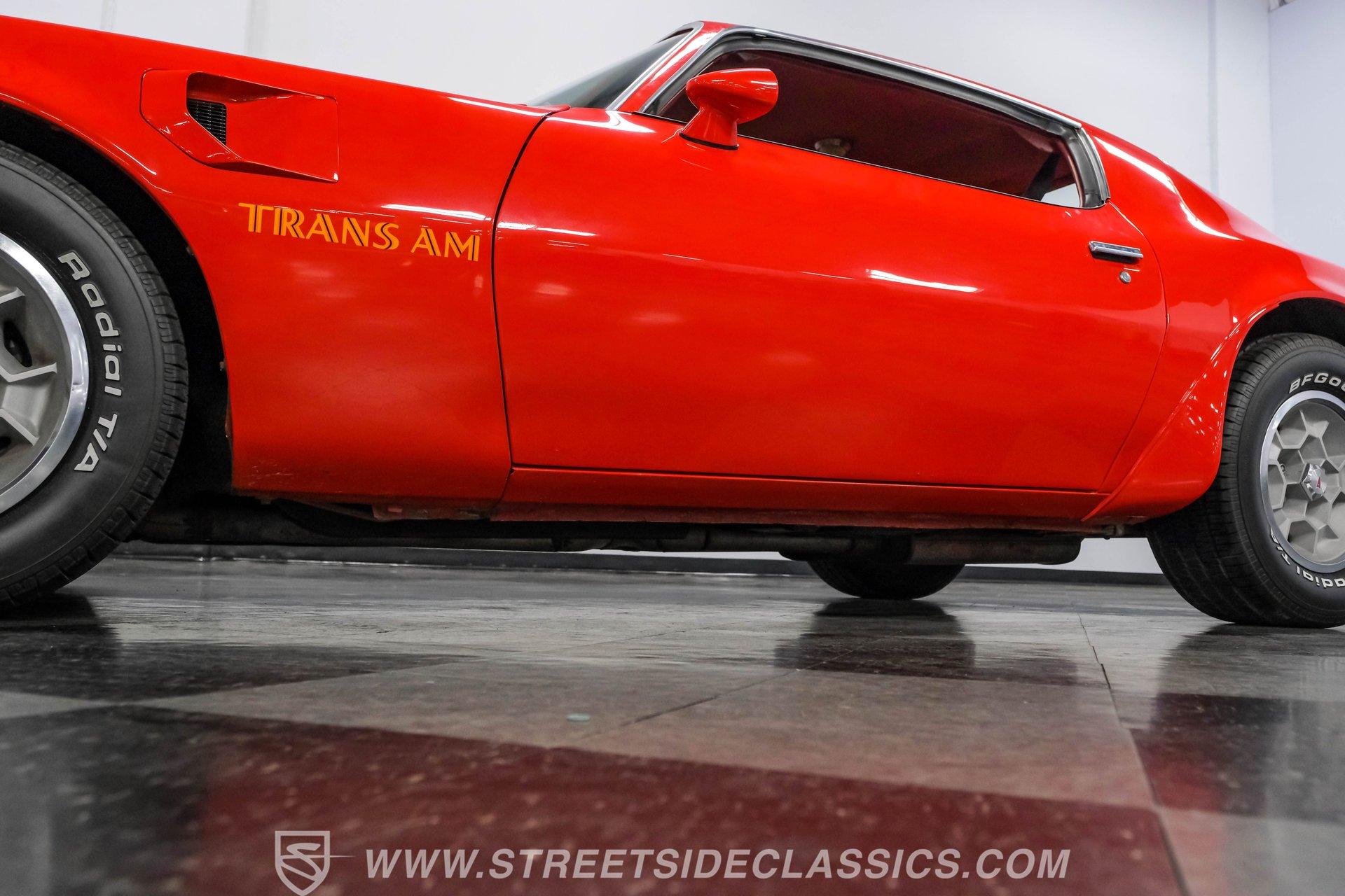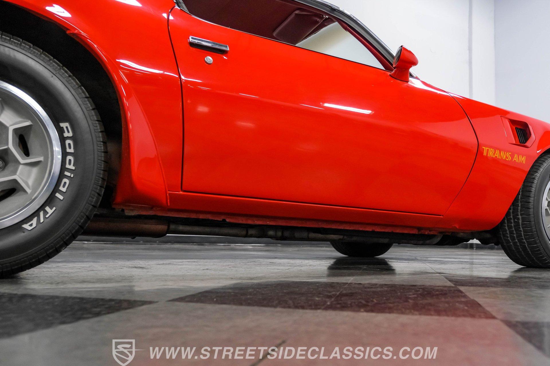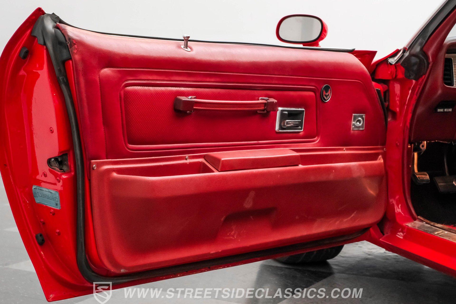What we have here is a 1974 Pontiac Firebird Trans Am in the often sought-after Buccaneer Red color. This muscle car is complete with the big Firebird decal on the hood, the shaker hood scoop, and the desirable big block engine. The unique honeycomb wheels are also highly desirable, and the lower front spoiler, rear spoiler, fender vents, and quarter-panel ground-effects are what make people fall in love with these Trans Ams. Door jambs, weather stripping, and windows all appear to be in good shape, and the trunk and deck lid look clean, giving you a nice place for cargo in this small car.
